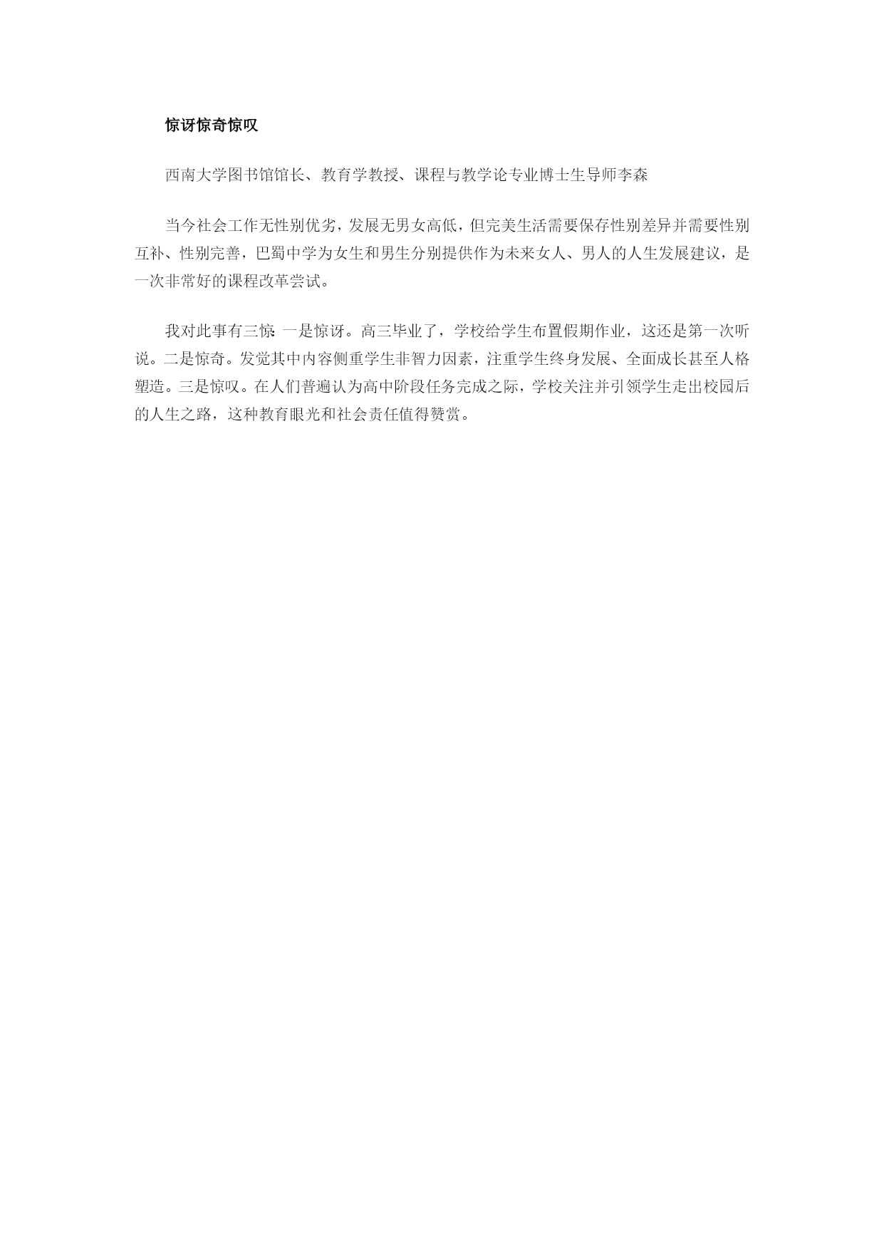 最后的作业--高中毕业生暑假看10本书10部电影2013年06月14日08:50重庆晚报[HYPERLINK"http://t.qq.com/cqwb?pref=qqcom.dp.titleinfo"微博]汤寒锋HYPERLINK"http://comment5.cq.qq.com/comment.htm?site=cq&id=41239770"我要评论(0)字号:T|T老师布置最后作业你们做吗高考结束那一天,把课本、参考书、练习题抛向空中或付之一炬,发泄十二年寒窗积下的压力,相信不少学生都做过。此后三个月漫长假期,不再有学习压力,不再有考试紧逼,你会干些什么?昨天,巴蜀中学为全校2000多名高三毕业生开出特别的毕业作业单———推荐他们看10部电影、10本好书并做10件小事。这份作业单中,最特别的是校方根据男生和女生不同的性格特点和人生规划,分别做了不同的指导,让女生向优雅少女靠近,让男生努力成为一名俊朗少年。推荐给女生电影:感受友情和自立校方给女生们推荐的第一部电影,是美国电影《牛仔裤的夏天》,它也是刚毕业的学生陈文最想看的电影之一。“听说过很多次,但一直没机会看,这个长长的假期终于可以满足我的愿望了。”陈文说,死党告诉她,这部片子讲的是4个十几岁女孩子的故事,“我们女生之间的友情完全不同于男性两肋插刀式或狐朋狗党型,而是真正彼此体谅、互相感怀的女子情怀。”《千与千寻》是学生钟徽言在高二时看过的一部动画电影。“当发现自己的父母亲忽然变成猪的时候,我感到特别恐惧,真有种万念俱灰的感觉。”钟徽言说,直到电影中白龙的出现让人一下子感到安全了,当时自己把这理解为“朋友的力量”。钟徽言告诉记者:“经历高考后,感觉自己长大了不少,对电影中的这一幕又有了更多的感受。我想电影是想告诉我们,你获得社会认可并交到合适的朋友,这在你的一生中起到的作用,可能要比父母对你的帮助来得更实际。一步步走出父母的怀抱,勇敢地面对现实,任何困难面前都不轻言放弃,这就是成长,这就是自立。”钟徽言说,这就是她还想再看一次这部电影的原因。据了解,校方为女生推荐的每一部电影都有不同的主题:看《天使爱美丽》体味孤独,看《隐形的翅膀》学会坚强,从《千与千寻》里找到成长,在《穿普拉达的女王》中寻找自我,看《黑暗中的舞者》感受母爱,看《律政俏佳人》增进智慧。名著:读书女人才美丽“世界有十分美丽,但如果没有女人,将失掉七分色彩;女人有十分美丽,但如果远离书籍,将失掉七分内蕴。什么样的女人才美丽呢?读书的女人才是美丽的女人!”这是巴蜀中学作业单上致女生的一段话。校方给女生们推荐的第一本书,就是西蒙娜·德·波伏娃的《第二性》,这本书被认为是有史以来讨论女性最健全、最理智、最充满智慧的一本书,被《时代》周刊评为20世纪改变人类思想和生活的10本书之一。校方为女生推荐的书目还有:《飘》,学习女主人公永不绝望、永远与命运抗争的风范;《简·爱》,感受一个平凡女人不平凡的生活经历,一段曲折离奇又缠绵动人的爱情。不只是文学作品,校方还给女生们推荐了傳雷的《世界美术名作二十讲》,指点艺术迷津的经典之作;黄橙的《私奔万水千山》,这部以介绍山水和人文景观为主的自助游游记,开启了和平年代城市青年渐次形成的一种个性时尚。1、《牛仔裤的夏天》推荐理由:体会友情2、《情书》推荐理由:体会初恋3、《天使爱美丽》推荐理由:感受孤独4、《隐形的翅膀》推荐理由:学会坚强5、《千与千寻》推荐理由:学会成长6、《穿普拉达的女王》推荐理由:感受自我7、《成为简·奥斯汀》推荐理由:学会尊严8、《黑暗中的舞者》推荐理由:体会母爱9、《蓝》推荐理由:理解自由10、《律政俏佳人》推荐理由:感受智慧1、《第二性》推荐理由:讨论女性最健全、最理智、最充满智慧的书。2、《写给女人》推荐理由:女性缔造成熟之爱、获取人生幸福的经典之作。3、《红楼梦》推荐理由:中国古典小说的巅峰之作。4、《谁是最美的女人》推荐理由:你会发现原来美丽并不遥远。5、《简·爱》推荐理由:曲折离奇又缠绵动人的爱情故事。6、《居里夫人传》推荐理由:一位为子女树立光辉榜样的伟大母亲的精神世界。7、《飘》推荐理由:女主人公永不绝望,与命运抗争。8、《世界美术名作二十讲》推荐理由:为女性读者指点艺术迷津。9、《金锁记》推荐理由:中国自古以来最伟大的中篇小说。10、《私奔万水千山》推荐理由:一部以介绍山水和人文景观为主的自助游游记。推荐给男生电影:看重责任和勇敢校方给男生们推荐的10部影片,跟女生的每一部都不同。学校课改处主任张学忠说,学生在青春期过程中男女有别,男生要吸取跟女生不同的营养。在学校推荐的片中,责任、勇气和信念最被看重。如《阿甘