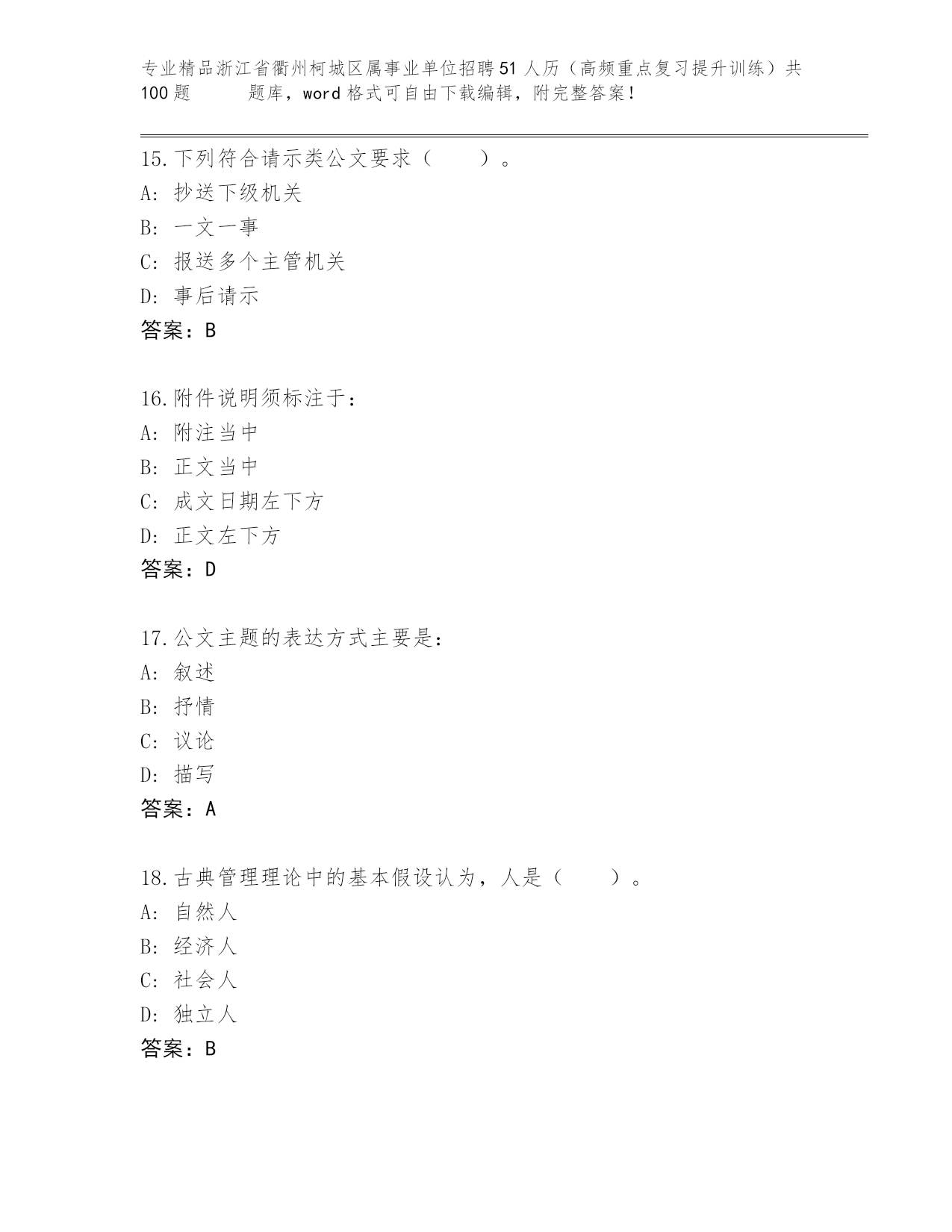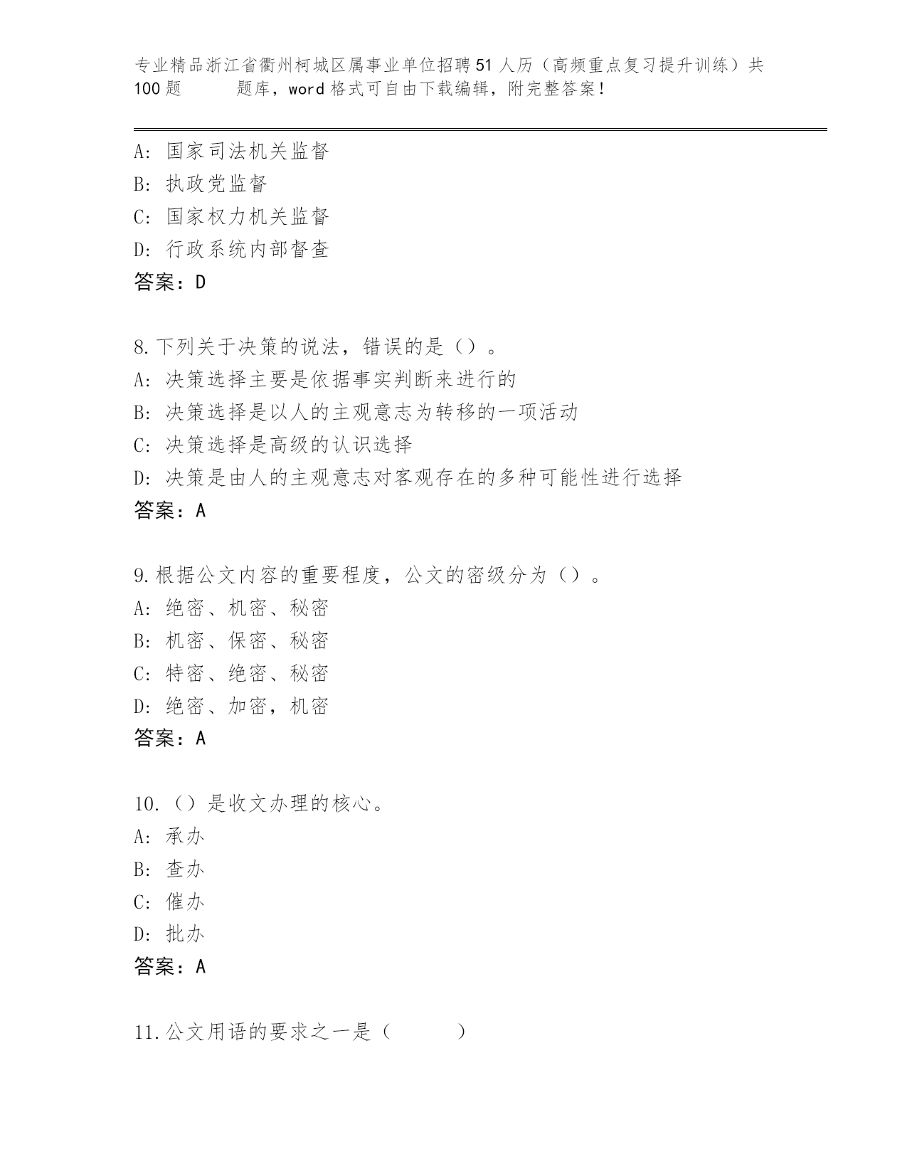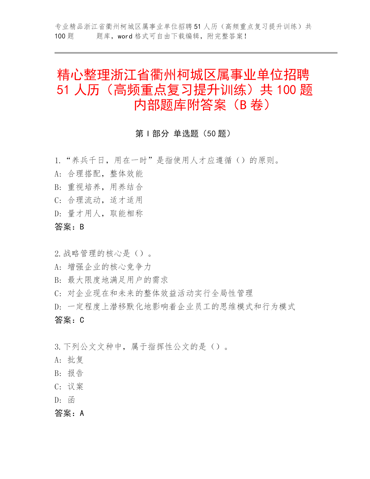 优选浙江省衢州柯城区属事业单位招聘51人历(高频重点复习提升训练)共100题 通用题库(名校卷)