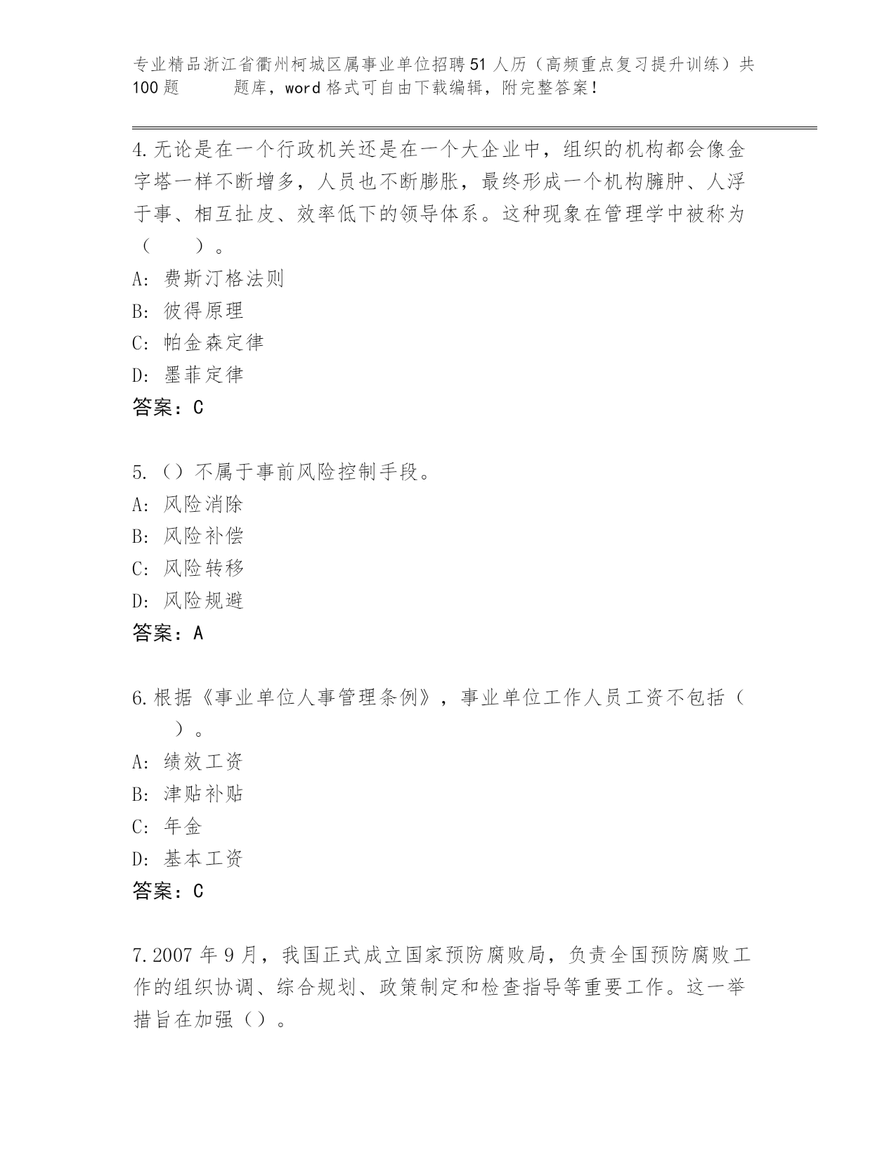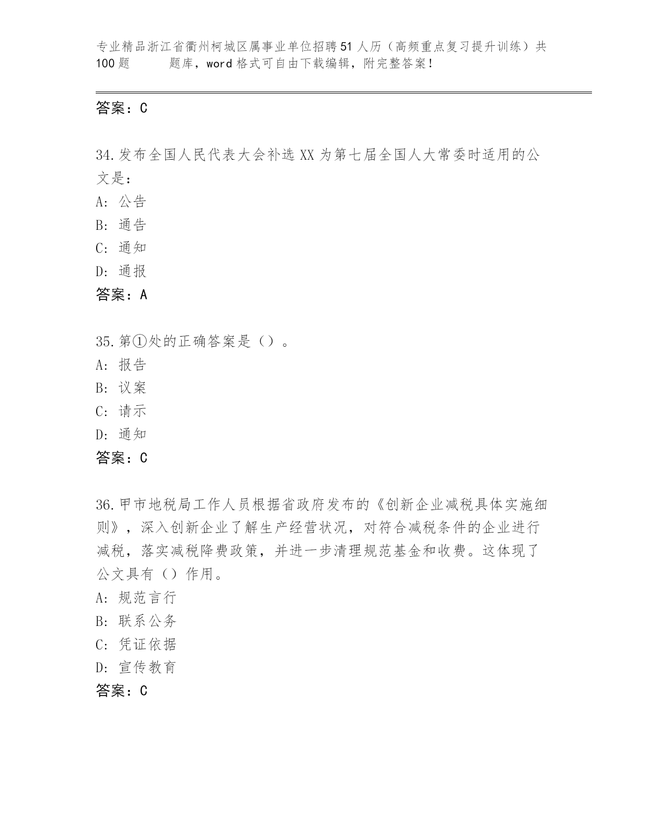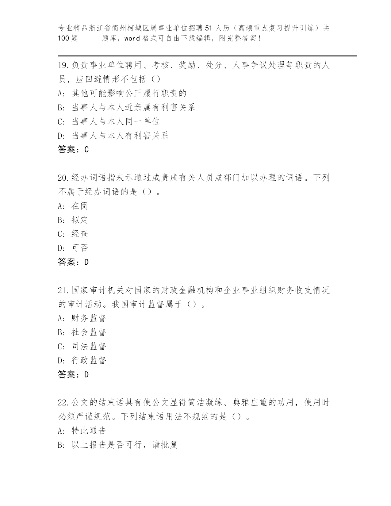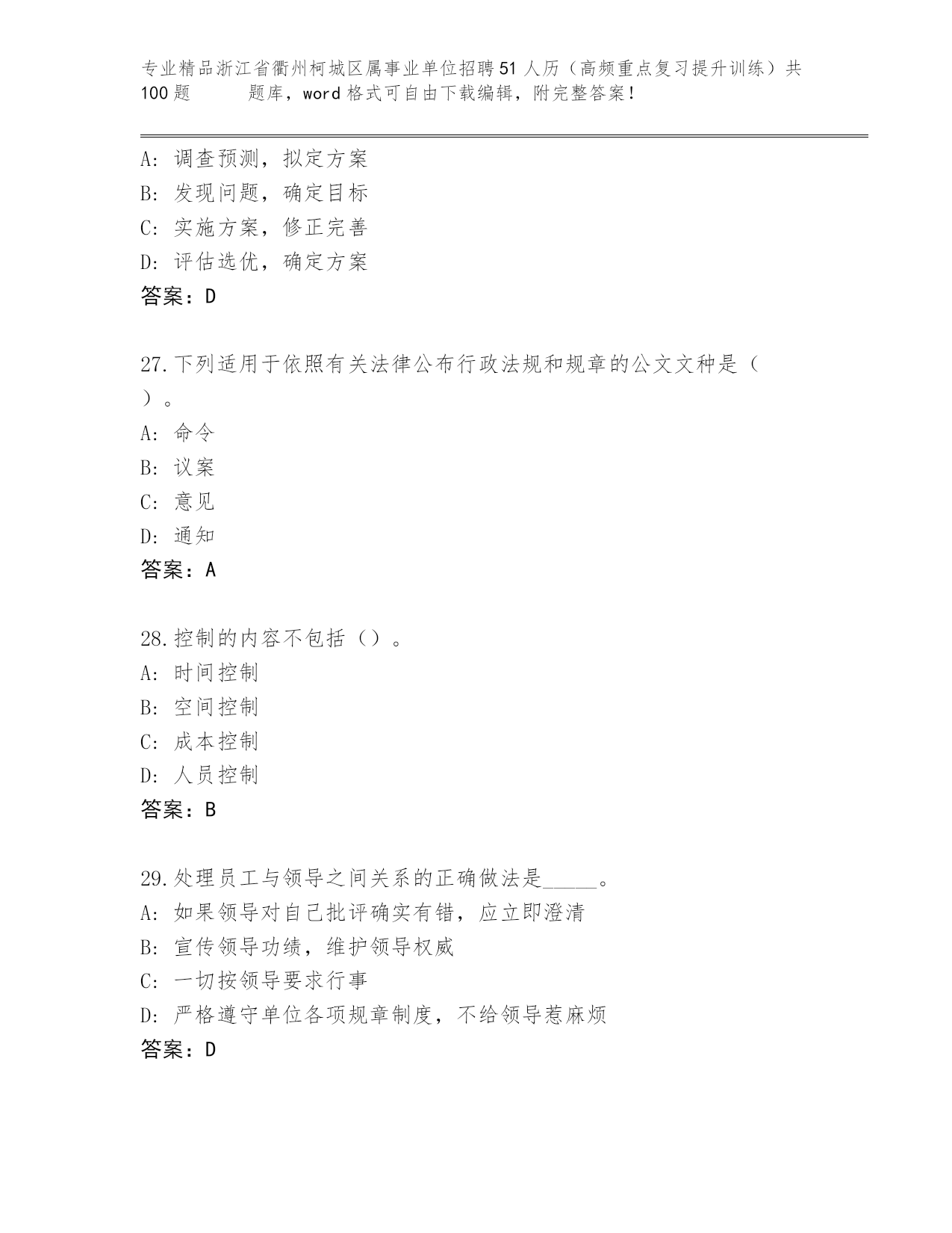内部培训浙江省衢州柯城区属事业单位招聘51人历(高频重点复习提升训练)共100题 题库大全精品(A卷)
