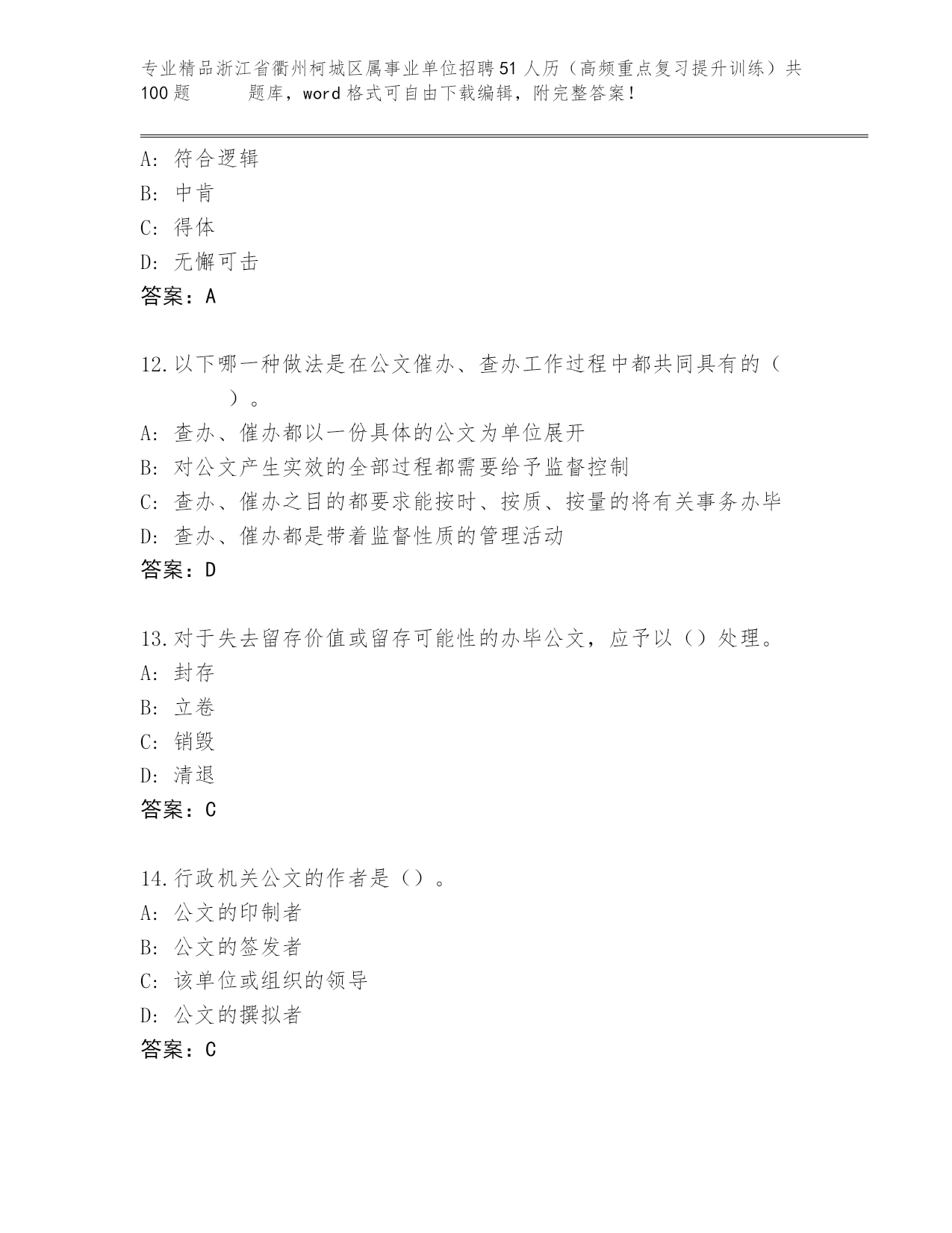 历年浙江省衢州柯城区属事业单位招聘51人历(高频重点复习提升训练)共100题 题库附答案(综合卷)