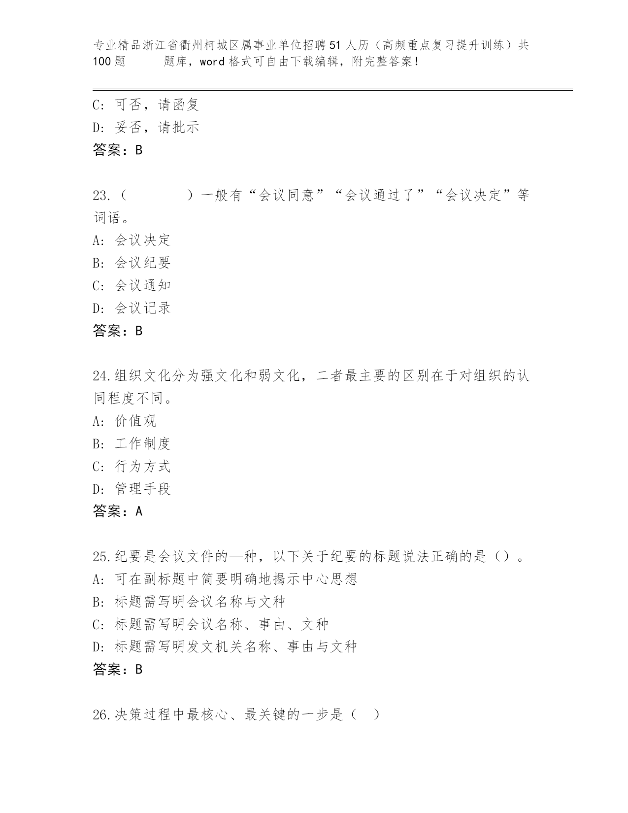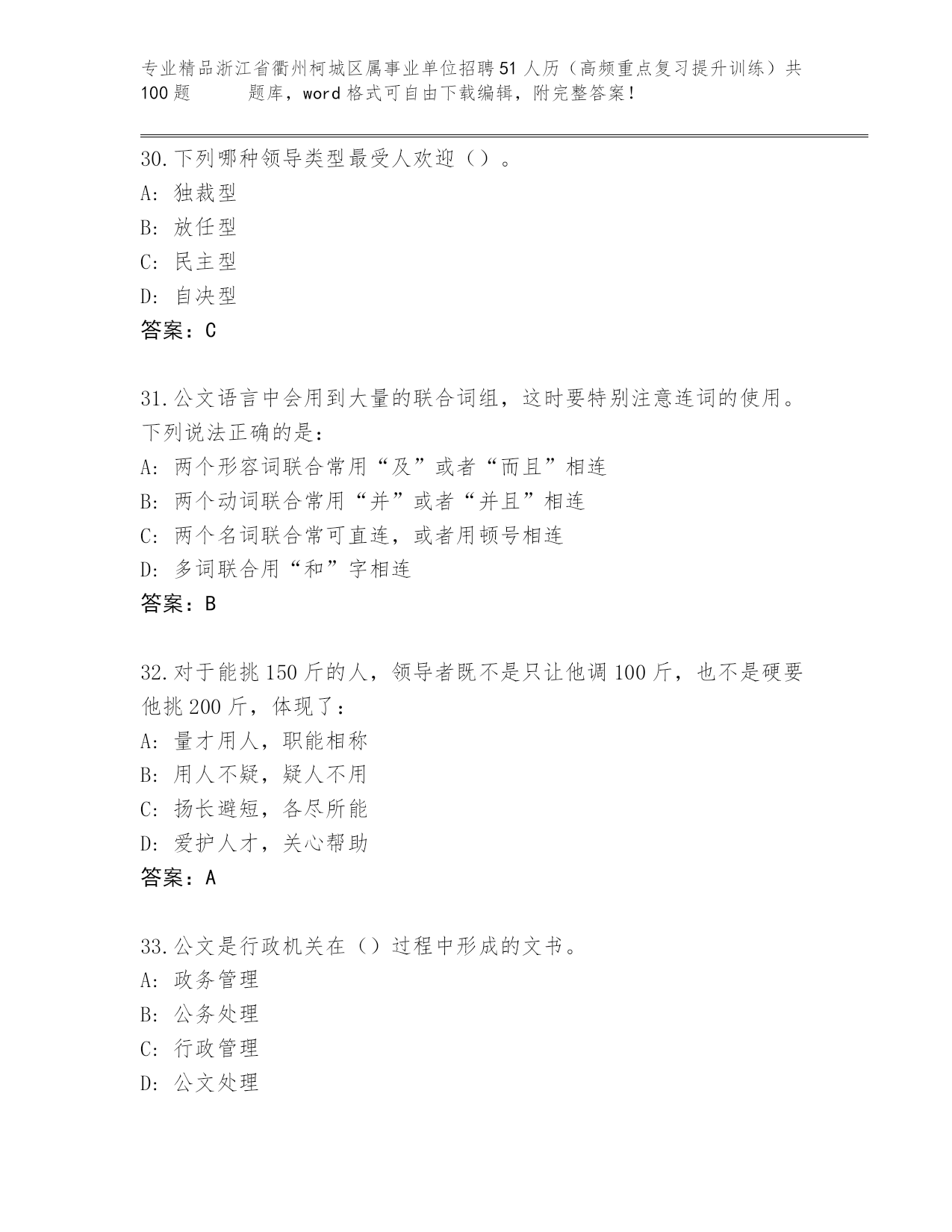 内部培训浙江省衢州柯城区属事业单位招聘51人历(高频重点复习提升训练)共100题 真题题库及答案(夺冠系列)
