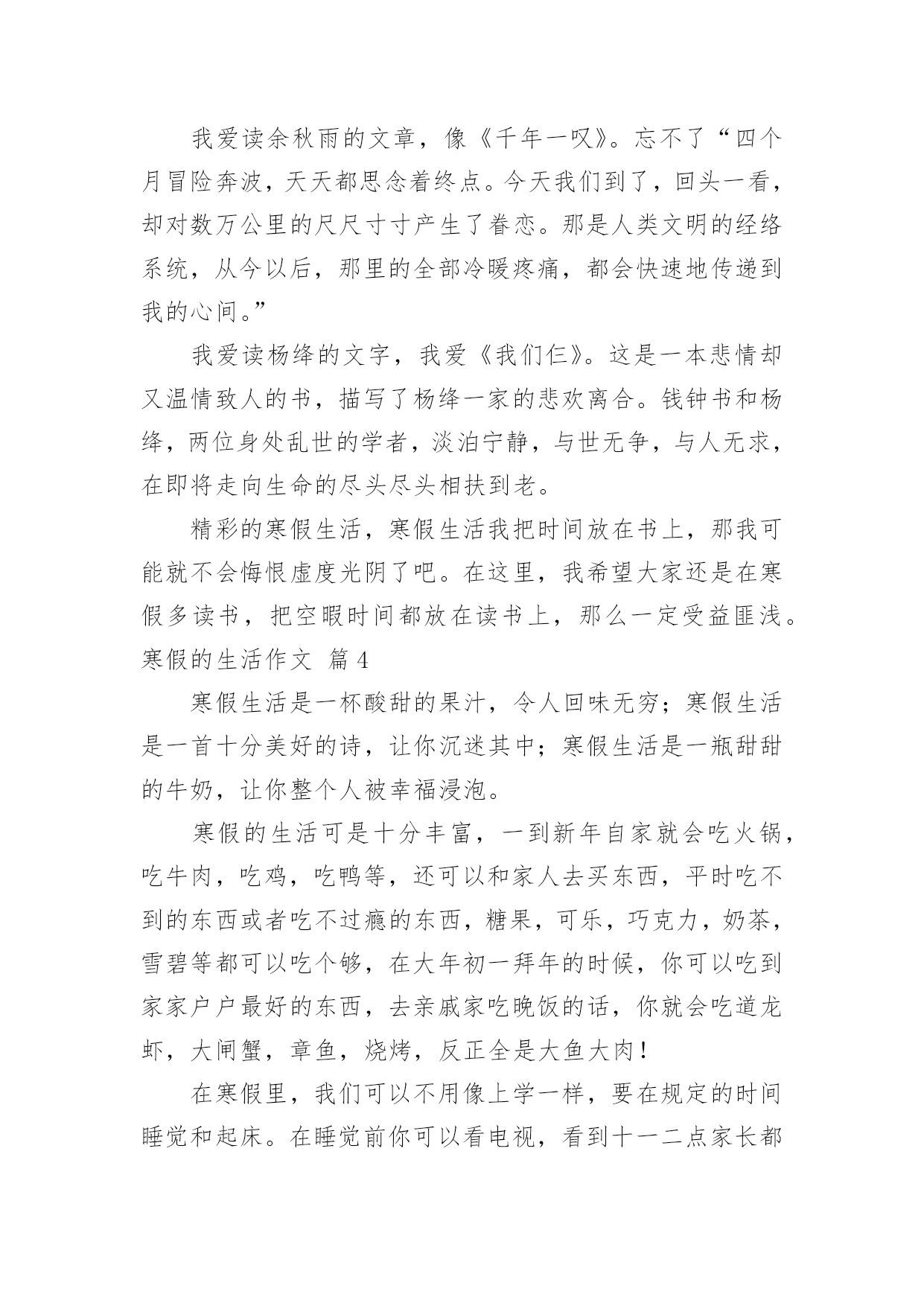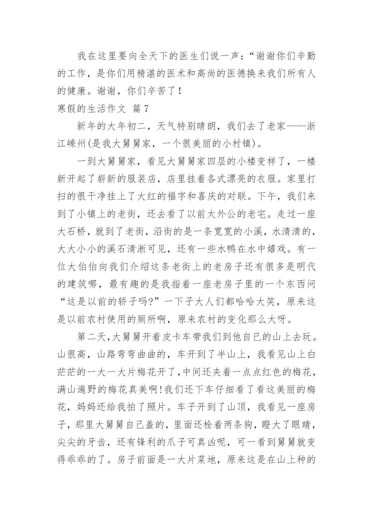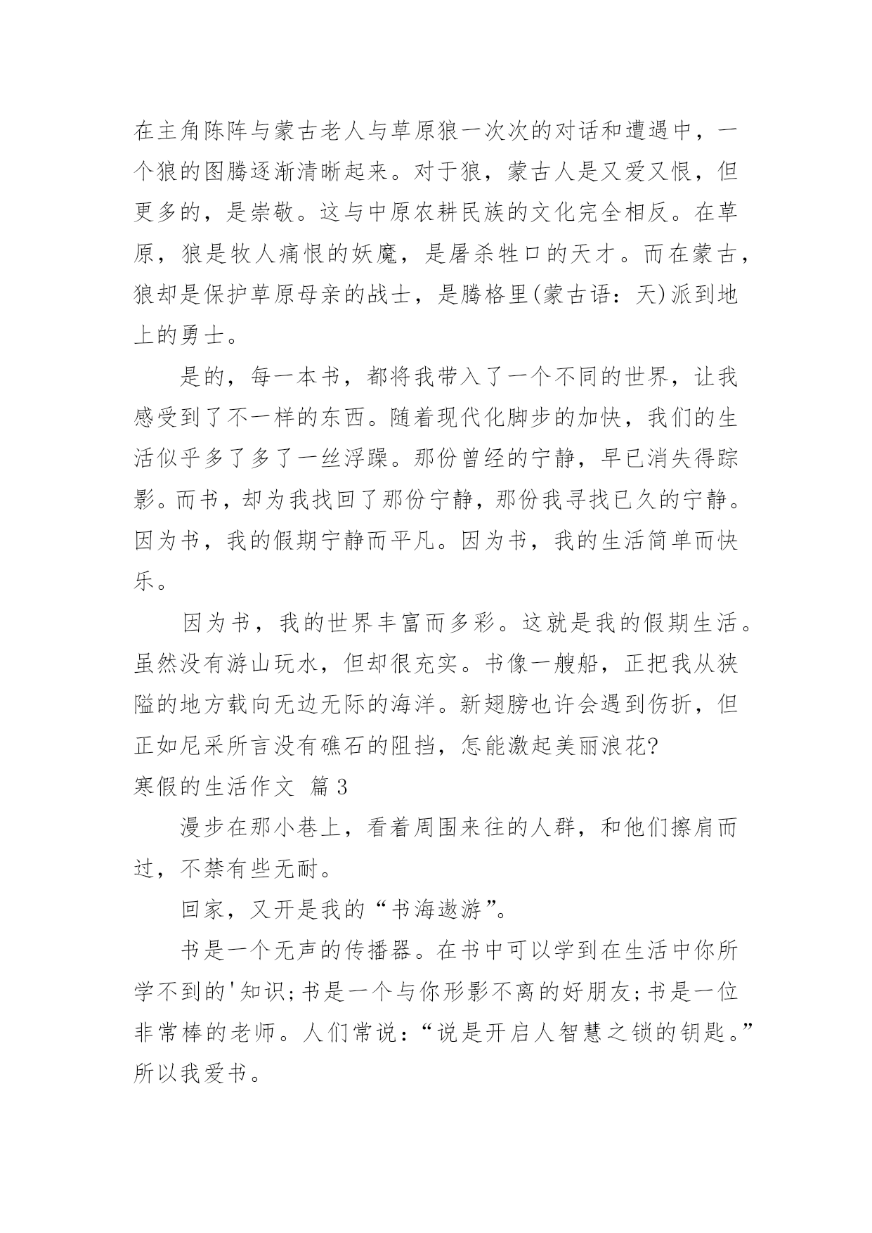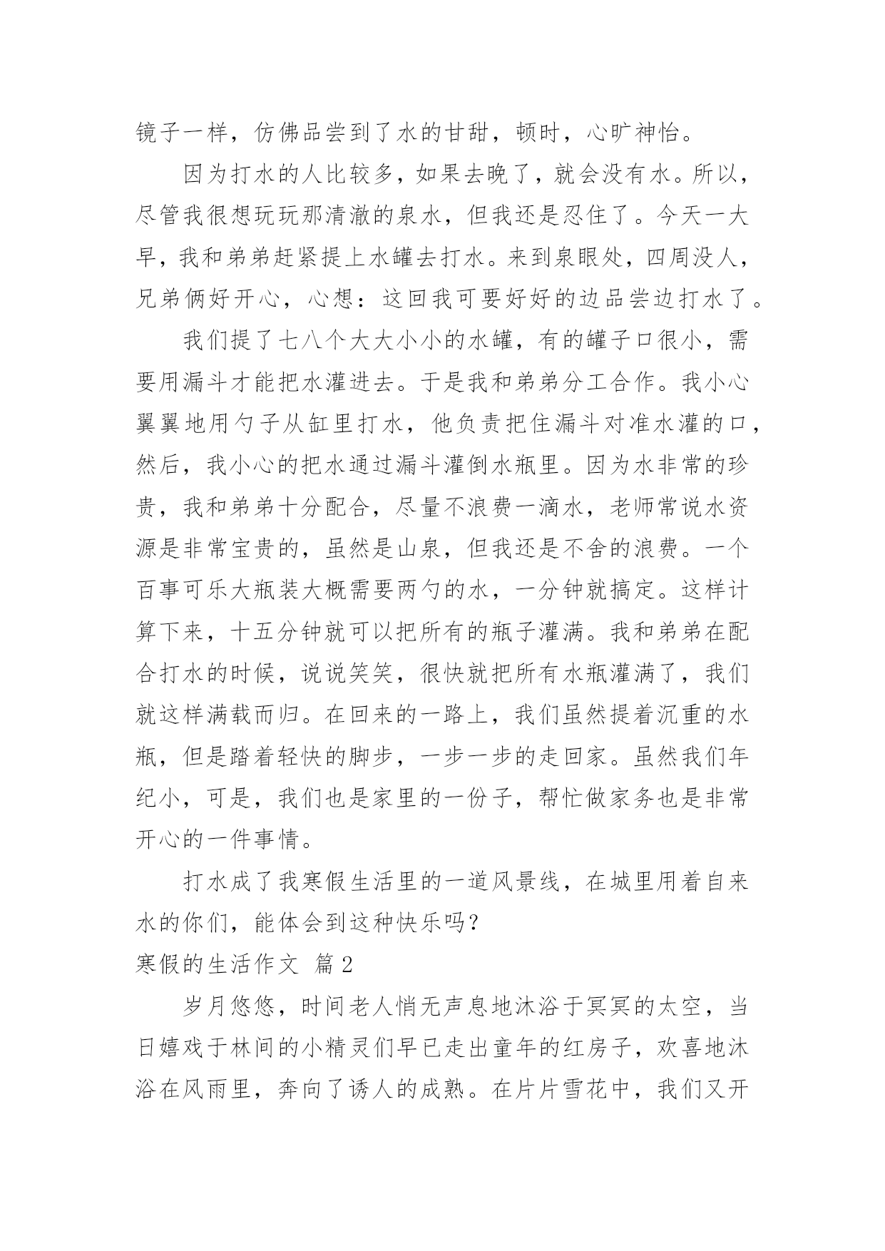 寒假的生活作文【精选】寒假的生活作文10篇在平平淡淡的学习、工作、生活中,大家都经常看到作文的身影吧,写作文是培养人们的观察力、联想力、想象力、思考力和记忆力的重要手段。你写作文时总是无从下笔?下面是小编收集整理的寒假的生活作文10篇,仅供参考,希望能够帮助到大家。寒假的生活作文篇1泉水是清澈,甘甜的,而在我老家的泉水更是如此。所以,许多村民,包括城里居住的人,宁愿辛苦一点,都要到我们村山脚下的泉眼里打水。我和弟弟接受了“打水”这项艰巨的任务。每天,只要家人把水用完,我和弟弟不管在做什么,都先放下,提着水罐去装水。我们绕过家家户户、走田埂、一路小跑着来到山脚下的一个储泉眼的池时,已是气喘吁吁,上气不接下气。泉眼已经给村民围了起来,看着清澈的泉水,顿时有一种想捧起来一掬开一饮而尽的感觉。泉水是从山上的泉眼冒出来的,被人们发现以后,用管子接下来,然后用一个非常大的缸安地面上来接水,避免泉水浪费,上面还盖了盖,防止赃物掉进泉缸,污染了泉水的清澈。山泉就是这样一滴一滴地储存下来。由于泉眼很小,所以它滴下来的时候是一滴一滴非常慢。真所谓“水滴石穿、物稀为贵”。当滴满一大缸时,打开盖,你可以看到清澈无比的水就像一面镜子一样,仿佛品尝到了水的甘甜,顿时,心旷神怡。因为打水的人比较多,如果去晚了,就会没有水。所以,尽管我很想玩玩那清澈的泉水,但我还是忍住了。今天一大早,我和弟弟赶紧提上水罐去打水。来到泉眼处,四周没人,兄弟俩好开心,心想:这回我可要好好的边品尝边打水了。我们提了七八个大大小小的水罐,有的罐子口很小,需要用漏斗才能把水灌进去。于是我和弟弟分工合作。我小心翼翼地用勺子从缸里打水,他负责把住漏斗对准水灌的口,然后,我小心的把水通过漏斗灌倒水瓶里。因为水非常的珍贵,我和弟弟十分配合,尽量不浪费一滴水,老师常说水资源是非常宝贵的,虽然是山泉,但我还是不舍的浪费。一个百事可乐大瓶装大概需要两勺的水,一分钟就搞定。这样计算下来,十五分钟就可以把所有的瓶子灌满。我和弟弟在配合打水的时候,说说笑笑,很快就把所有水瓶灌满了,我们就这样满载而归。在回来的一路上,我们虽然提着沉重的水瓶,但是踏着轻快的脚步,一步一步的走回家。虽然我们年纪小,可是,我们也是家里的一份子,帮忙做家务也是非常开心的一件事情。打水成了我寒假生活里的一道风景线,在城里用着自来水的你们,能体会到这种快乐吗?寒假的生活作文篇2岁月悠悠,时间老人悄无声息地沐浴于冥冥的太空,当日嬉戏于林间的小精灵们早已走出童年的红房子,欢喜地沐浴在风雨里,奔向了诱人的成熟。在片片雪花中,我们又开始了自己一年一度的寒假生活。有人说,欢快的日子,总感觉过的很快;而无聊的日子,却仿佛度日如年。我想,刚开始的寒假对我而言就是日日难耐吧!毕竟,突然卸下了所有的学习任务与工作,从整天忙碌转到了整日无所事事。也想过去找兼职,可是由于今年学校放假太晚,兼职已无空缺。而几天的寒假生活已让我开始觉得乏味了,我又开始想念我的学校生活了。难道,我真的要这样当一个寒假的撞钟和尚吗?我能经历的寒假,又还有几个呢?不行,来之不易的假期,来之不易的暇余时间,我应该要学会珍惜!是的,我要让自己的假期过得充满意义!于是,我为自己定下了一个假期目标看书。是的,自己是一个很喜欢与文学打交道的人,一直都很喜欢看书。只是进入大学后,因为自己的学习与工作,能够投入到书的海洋中的时间,真是少之又少。而这个寒假,正好给了我一个很好的机会,让我可以重温过去徜徉于文字世界的美好时光。执一卷书,呷一口香茶,低声吟诵,心静如水,音乐袅袅,无考试之负担,无作业之干扰,尽情地读,随意地遐想……徜徉于文字里,我仿佛来到了一个偌大的岔路口,每一个方向,都是一条路,都藏匿着一个不同的世界。《狼图腾》,把我带进了一个震撼的世界。一个去内蒙插队的知青,彪悍智慧的蒙古人,桀骜勇猛的草原狼,宽广辽阔的大草原,丰富有趣的草原生物、狼群和人群的一场场惊心动魄的遭遇战,无一不让我唏嘘神往蒙古那辽阔的草原。在主角陈阵与蒙古老人与草原狼一次次的对话和遭遇中,一个狼的图腾逐渐清晰起来。对于狼,蒙古人是又爱又恨,但更多的,是崇敬。这与中原农耕民族的文化完全相反。在草原,狼是牧人痛恨的妖魔,是屠杀牲口的天才。而在蒙古,狼却是保护草原母亲的战士,是腾格里(蒙古语:天)派到地上的勇士。是的,每一本书,都将我带入了一个不同的世界,让我感受到了不一样的东西。随着现代化脚步的加快,我们的生活似乎多了多了一丝浮躁。那份曾经的宁静,早已消失得踪影。而书,却为我找回了那份宁静,那份我寻找已久的宁静。因为书,我的假期宁静而平凡。因为书,我的生活简单而快乐。因为书,我的世界丰富而多彩。这就是我的假期生活。虽然没有游山玩水,但却很充实。书像一艘船,正把我从狭隘的地方载向无边无际的海洋。新翅膀也许会遇到伤折,但