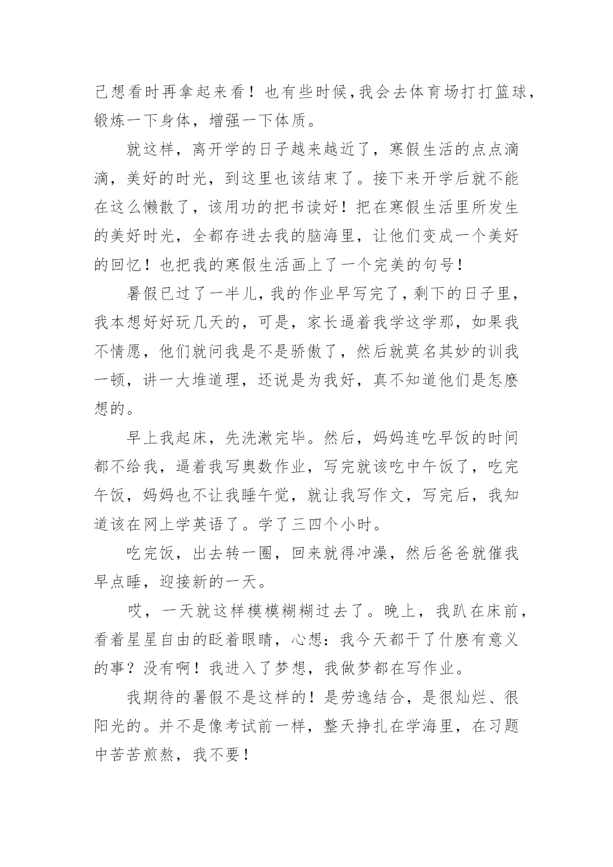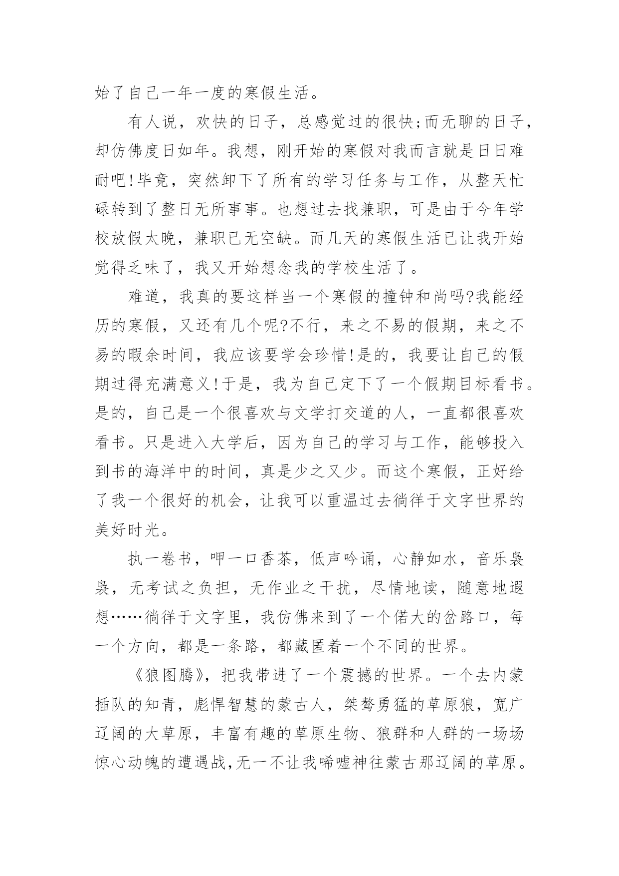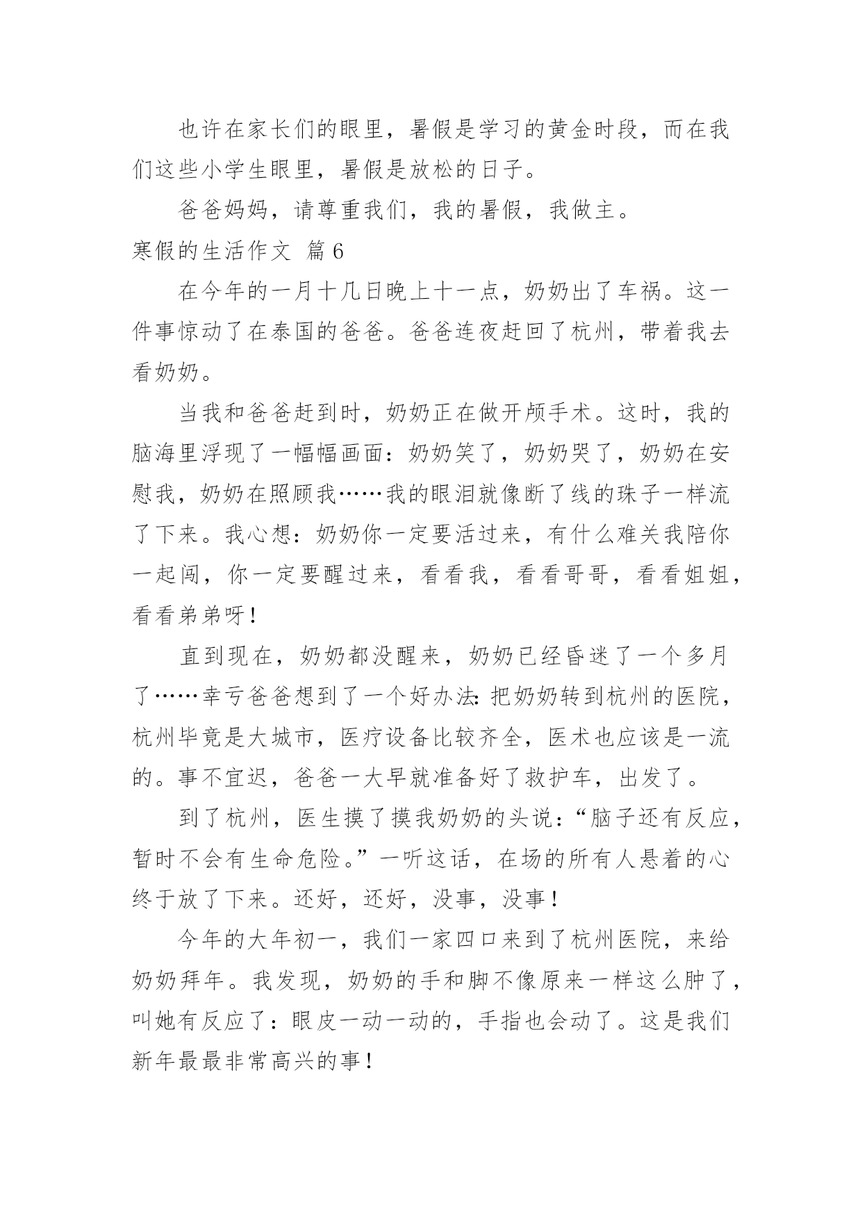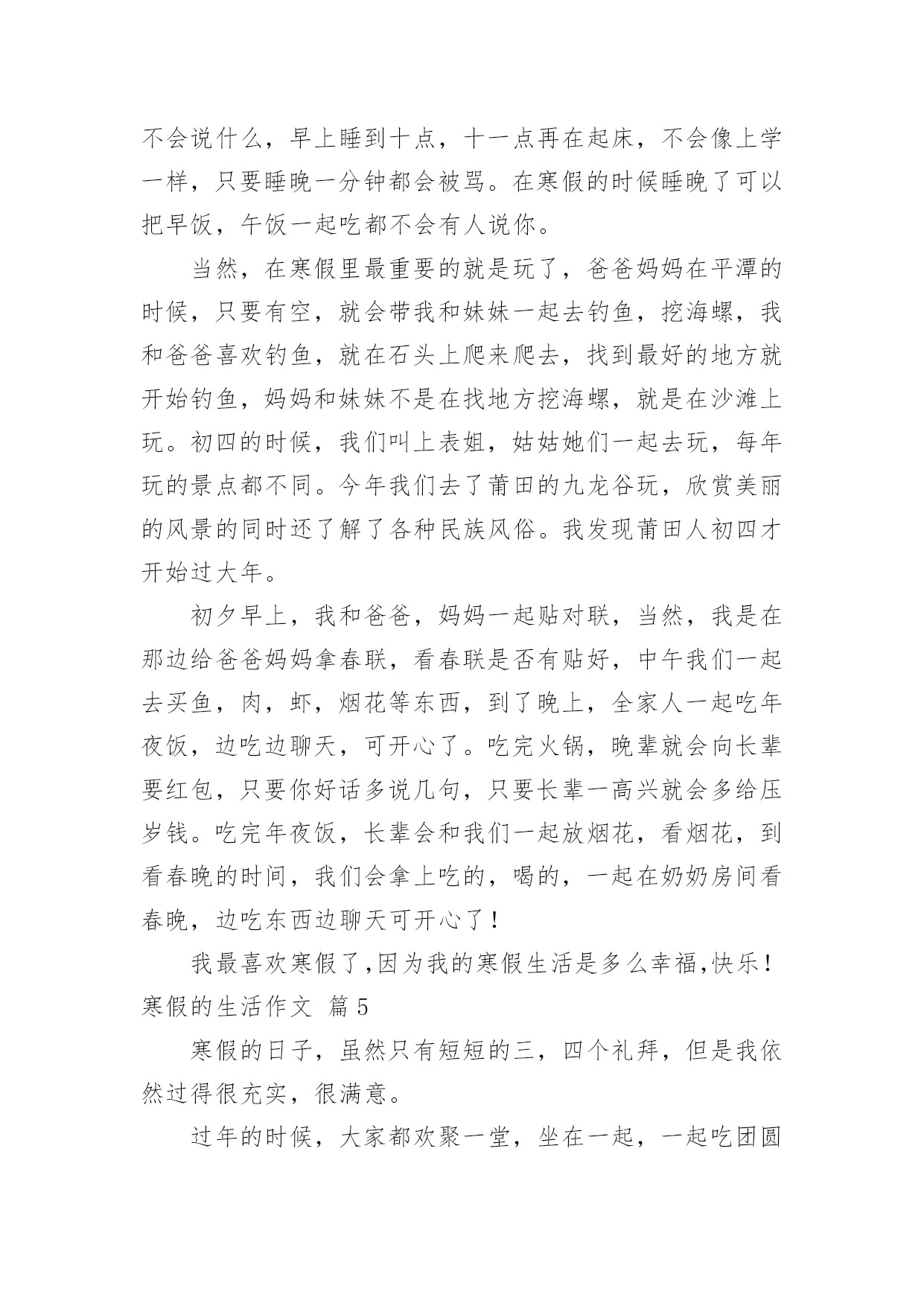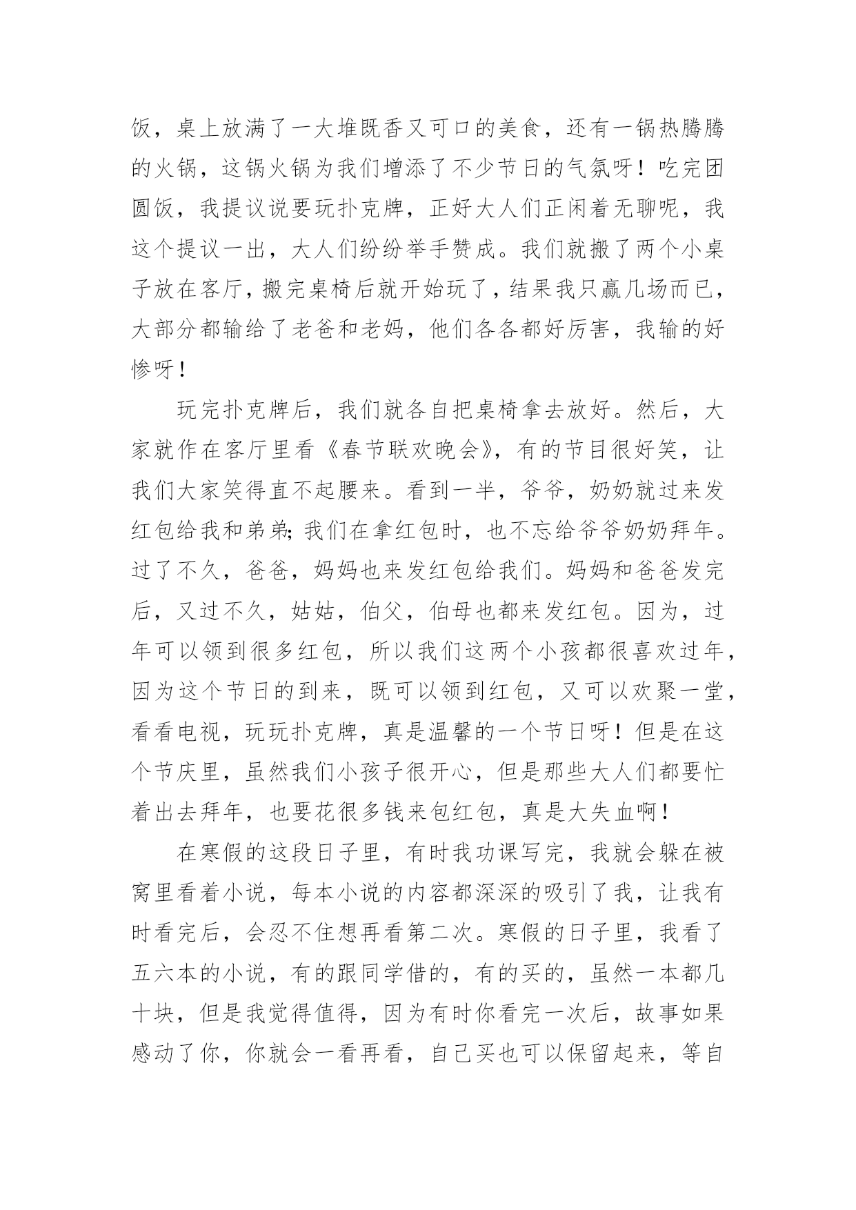 寒假的生活作文【精选】寒假的生活作文10篇在平平淡淡的学习、工作、生活中,大家都经常看到作文的身影吧,写作文是培养人们的观察力、联想力、想象力、思考力和记忆力的重要手段。你写作文时总是无从下笔?下面是小编收集整理的寒假的生活作文10篇,仅供参考,希望能够帮助到大家。寒假的生活作文篇1泉水是清澈,甘甜的,而在我老家的泉水更是如此。所以,许多村民,包括城里居住的人,宁愿辛苦一点,都要到我们村山脚下的泉眼里打水。我和弟弟接受了“打水”这项艰巨的任务。每天,只要家人把水用完,我和弟弟不管在做什么,都先放下,提着水罐去装水。我们绕过家家户户、走田埂、一路小跑着来到山脚下的一个储泉眼的池时,已是气喘吁吁,上气不接下气。泉眼已经给村民围了起来,看着清澈的泉水,顿时有一种想捧起来一掬开一饮而尽的感觉。泉水是从山上的泉眼冒出来的,被人们发现以后,用管子接下来,然后用一个非常大的缸安地面上来接水,避免泉水浪费,上面还盖了盖,防止赃物掉进泉缸,污染了泉水的清澈。山泉就是这样一滴一滴地储存下来。由于泉眼很小,所以它滴下来的时候是一滴一滴非常慢。真所谓“水滴石穿、物稀为贵”。当滴满一大缸时,打开盖,你可以看到清澈无比的水就像一面镜子一样,仿佛品尝到了水的甘甜,顿时,心旷神怡。因为打水的人比较多,如果去晚了,就会没有水。所以,尽管我很想玩玩那清澈的泉水,但我还是忍住了。今天一大早,我和弟弟赶紧提上水罐去打水。来到泉眼处,四周没人,兄弟俩好开心,心想:这回我可要好好的边品尝边打水了。我们提了七八个大大小小的水罐,有的罐子口很小,需要用漏斗才能把水灌进去。于是我和弟弟分工合作。我小心翼翼地用勺子从缸里打水,他负责把住漏斗对准水灌的口,然后,我小心的把水通过漏斗灌倒水瓶里。因为水非常的珍贵,我和弟弟十分配合,尽量不浪费一滴水,老师常说水资源是非常宝贵的,虽然是山泉,但我还是不舍的浪费。一个百事可乐大瓶装大概需要两勺的水,一分钟就搞定。这样计算下来,十五分钟就可以把所有的瓶子灌满。我和弟弟在配合打水的时候,说说笑笑,很快就把所有水瓶灌满了,我们就这样满载而归。在回来的一路上,我们虽然提着沉重的水瓶,但是踏着轻快的脚步,一步一步的走回家。虽然我们年纪小,可是,我们也是家里的一份子,帮忙做家务也是非常开心的一件事情。打水成了我寒假生活里的一道风景线,在城里用着自来水的你们,能体会到这种快乐吗?寒假的生活作文篇2岁月悠悠,时间老人悄无声息地沐浴于冥冥的太空,当日嬉戏于林间的小精灵们早已走出童年的红房子,欢喜地沐浴在风雨里,奔向了诱人的成熟。在片片雪花中,我们又开始了自己一年一度的寒假生活。有人说,欢快的日子,总感觉过的很快;而无聊的日子,却仿佛度日如年。我想,刚开始的寒假对我而言就是日日难耐吧!毕竟,突然卸下了所有的学习任务与工作,从整天忙碌转到了整日无所事事。也想过去找兼职,可是由于今年学校放假太晚,兼职已无空缺。而几天的寒假生活已让我开始觉得乏味了,我又开始想念我的学校生活了。难道,我真的要这样当一个寒假的撞钟和尚吗?我能经历的寒假,又还有几个呢?不行,来之不易的假期,来之不易的暇余时间,我应该要学会珍惜!是的,我要让自己的假期过得充满意义!于是,我为自己定下了一个假期目标看书。是的,自己是一个很喜欢与文学打交道的人,一直都很喜欢看书。只是进入大学后,因为自己的学习与工作,能够投入到书的海洋中的时间,真是少之又少。而这个寒假,正好给了我一个很好的机会,让我可以重温过去徜徉于文字世界的美好时光。执一卷书,呷一口香茶,低声吟诵,心静如水,音乐袅袅,无考试之负担,无作业之干扰,尽情地读,随意地遐想……徜徉于文字里,我仿佛来到了一个偌大的岔路口,每一个方向,都是一条路,都藏匿着一个不同的世界。《狼图腾》,把我带进了一个震撼的世界。一个去内蒙插队的知青,彪悍智慧的蒙古人,桀骜勇猛的草原狼,宽广辽阔的大草原,丰富有趣的草原生物、狼群和人群的一场场惊心动魄的遭遇战,无一不让我唏嘘神往蒙古那辽阔的草原。在主角陈阵与蒙古老人与草原狼一次次的对话和遭遇中,一个狼的图腾逐渐清晰起来。对于狼,蒙古人是又爱又恨,但更多的,是崇敬。这与中原农耕民族的文化完全相反。在草原,狼是牧人痛恨的妖魔,是屠杀牲口的天才。而在蒙古,狼却是保护草原母亲的战士,是腾格里(蒙古语:天)派到地上的勇士。是的,每一本书,都将我带入了一个不同的世界,让我感受到了不一样的东西。随着现代化脚步的加快,我们的生活似乎多了多了一丝浮躁。那份曾经的宁静,早已消失得踪影。而书,却为我找回了那份宁静,那份我寻找已久的宁静。因为书,我的假期宁静而平凡。因为书,我的生活简单而快乐。因为书,我的世界丰富而多彩。这就是我的假期生活。虽然没有游山玩水,但却很充实。书像一艘船,正把我从狭隘的地方载向无边无际的海洋。新翅膀也许会遇到伤折,但