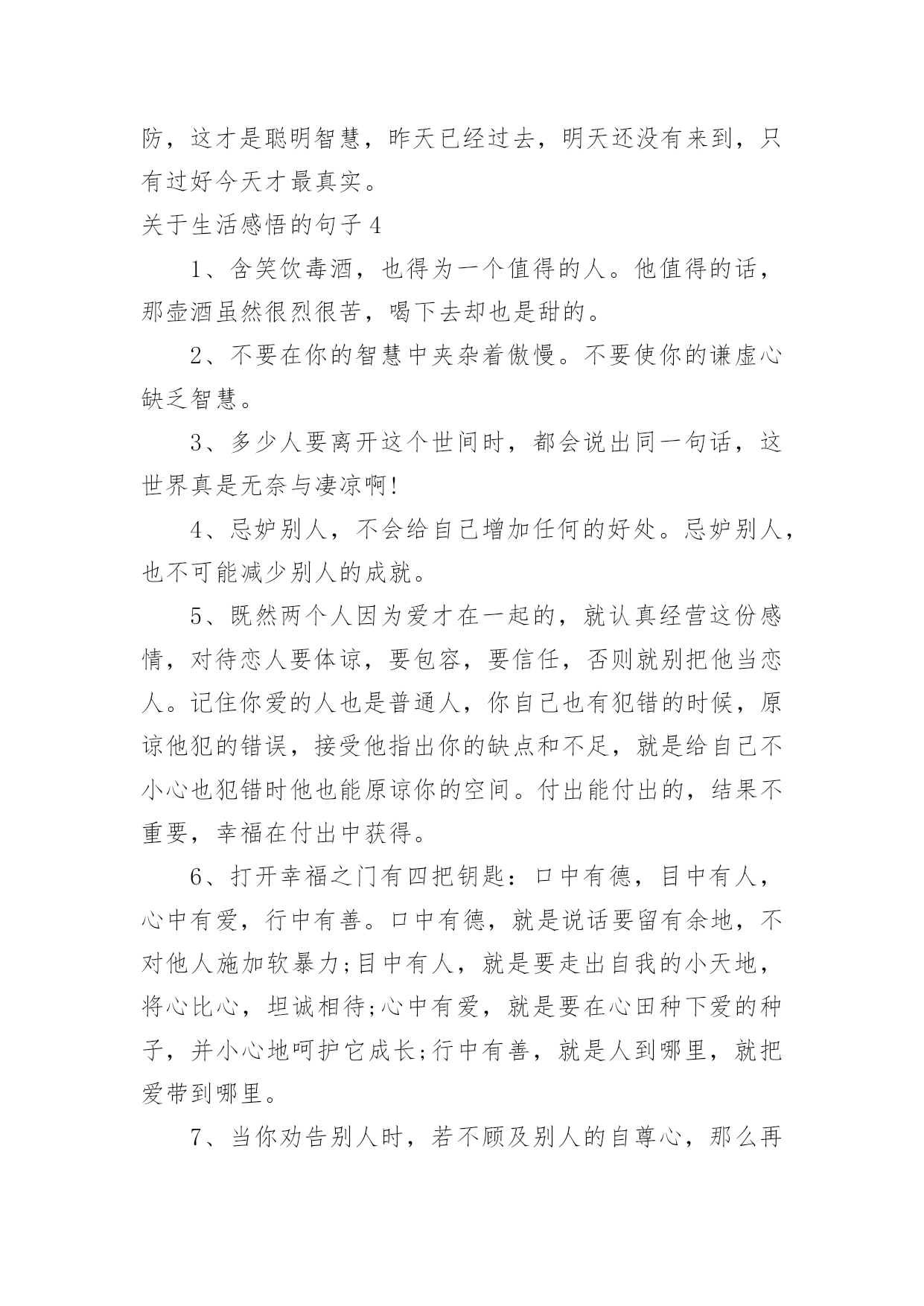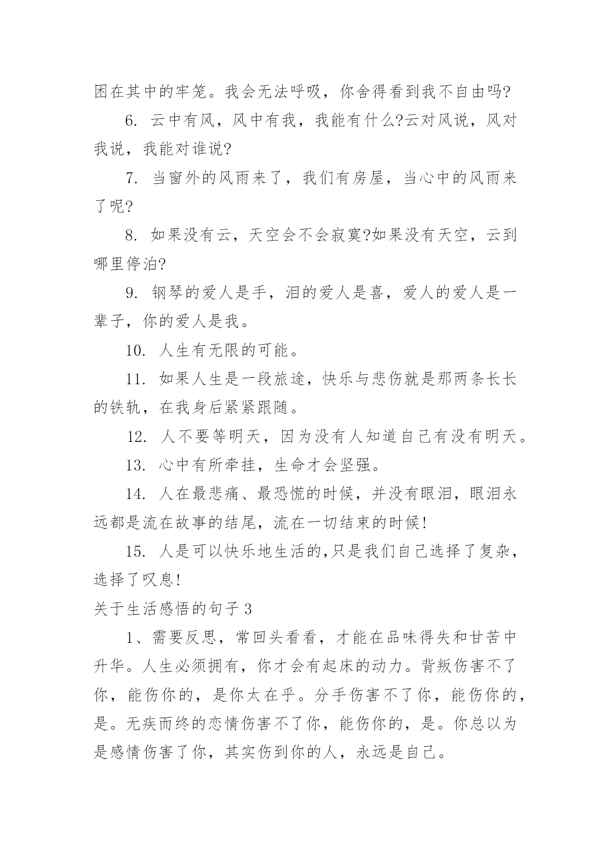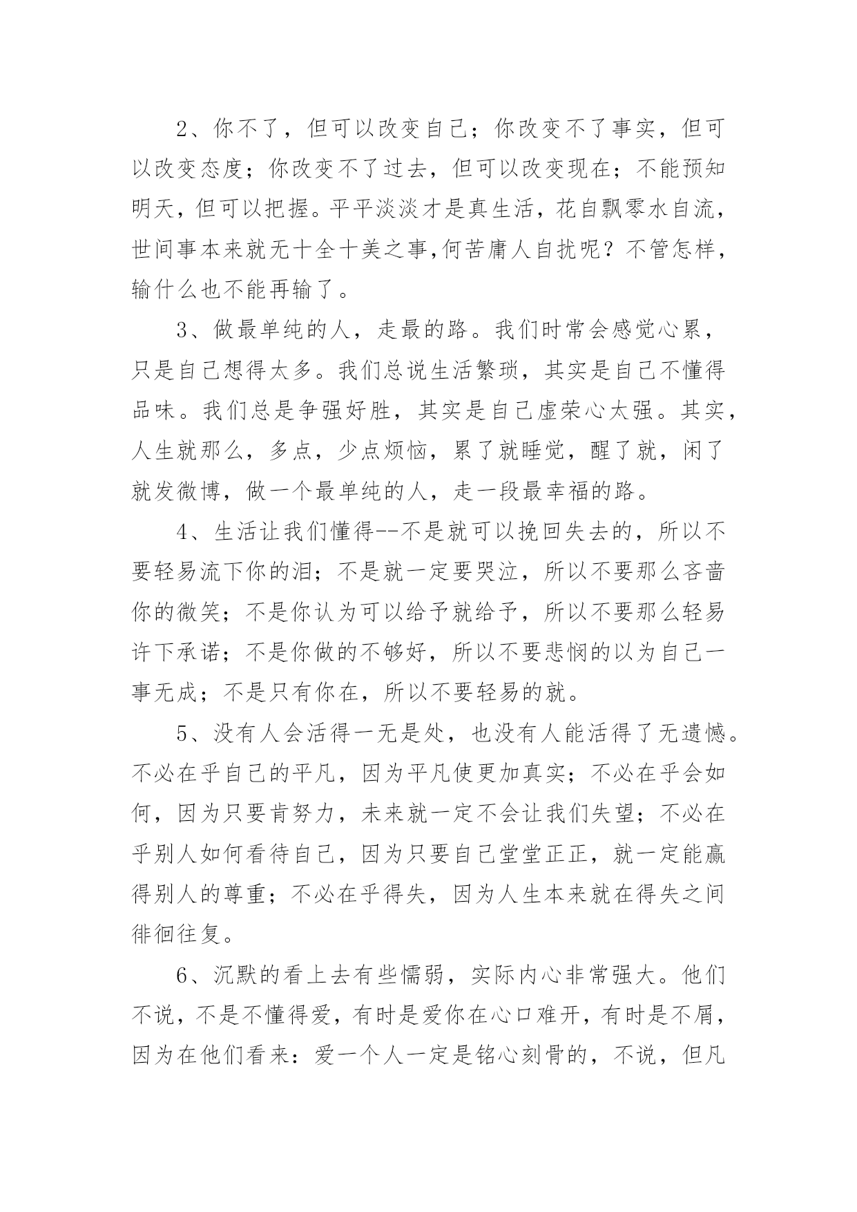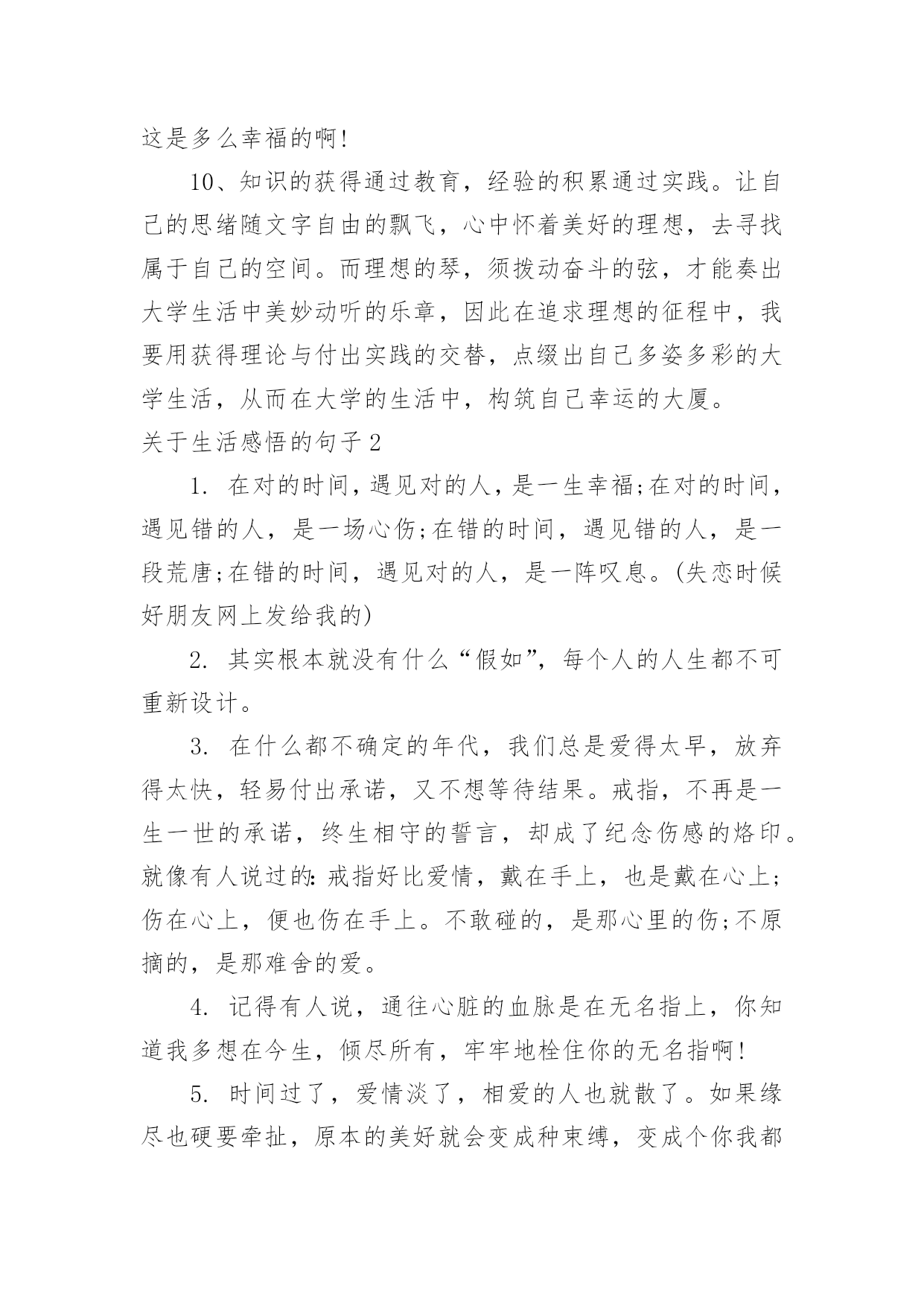 生活感悟的句子关于生活感悟的句子15篇无论是身处学校还是步入社会,说到句子,大家肯定都不陌生吧,句子能表达一个完整的意思,如告诉别人一件事情,提出一个问题,表示要求或者制止,表示某种感慨,表示对一段话的延续或省略。那些被广泛运用的句子都是什么样子的呢?以下是小编精心整理的关于生活感悟的句子,仅供参考,欢迎大家阅读。关于生活感悟的句子11、回忆是对往日美好的珍藏。打开尘封的记忆,穿越时光的隧道,在大学一年多的生活中,我学会了在失败与成功的交替中点缀充实的生活;学会了在独处与交往的环境中释放自己的心情;学会了在聆听与诉说的交互中加深真正的友谊。漫步在美丽的校园中,回想自己过去一年留下的足迹,感觉自己已经长大,不再是一年前那个懵懂的男孩。很幸运自己能在这安适的求学环境中认识很多亲切的老师,结识许多真挚的同学,是他们,让我的大学生活更充实,使我的生活中充满了快乐,幸福的元素。2、静谧的天空,每颗星星都有自己的轨迹,我会在大学生活中找到自己的最佳位置,让心目中的世界变得和谐安宁。昨天,在我的记忆里还是这样的清晰--好吧,把它珍藏起来,让我以自信的笑脸,积极的心态去迎接美好的明天和灿烂的大学生活吧!3、人的成熟离不开自身各种的经历:曲折,加速着人意志的成长;挫折,培育着人性格的完善;困难,坚定着人信念的追求。生活告诉我,路是人走出来的,关键要靠自己,振作起来,生活的意义就是前进。我不会忘记自己走过的路:那些洒着汗珠,闪着光彩的路;那些浸透汗水,努力拼搏的路;那些崎岖不平,备感艰辛的路……但我会在心里对自己说:“只有记住这些路,才能走好以后的路”。4、生活是有目标的,而目标就是我们的希望。生活中最可贵的财富是希望,希望将给自己的生活带来永久的乐趣与动力。在生活的画卷中,偶尔抹上一道灰色,并不预示着失败与沉沦,重要的是,能在灰色中提取绿色的希望。任何时候我都会怀着美好的希望去面对我的大学生活,因为我懂得:虽然生活的征程有时会坎坷不平,然而,希望的大门对任何人总是永远敞开的!5、生活总是在不断的追求中度过。回首过去一年的大学生活,我经历过失败的痛苦,品尝过成功的喜悦,正是在这种不断追求生活目标的过程中,让我感受到了大学生活的丰富多彩:参加各种社团活动,举办各种专业比赛,组织各种旅游活动……它们充实了我大学生活中的每一天,给了我追求的源动力。6、我热爱自己的大学生活,无论是遭遇曲折还是赢得胜利,我都会用一颗平常的心去坦然面对。因为我知道,只有懂得生活的人才能领悟人生的真谛,微笑着去生活,生活也会对你报以微笑。懂得生活的人,能领悟到花的娇艳;懂得友爱的人,能领悟到他人心中的芬芳。一个人的成长,离不开朋友的帮助与关怀,把友谊留在身边,无论走多远,我依然拥有蔚蓝的天空。很高兴自己在大学中能结交这么多意趣相投的朋友,是他们,在我失意,沉思的时候,给我清新的思想,无尽的力量,温馨的暖流。是他们,让我感觉到了集体的温暖,团结的力量,真挚的友爱。“人生得一知己足矣,斯世当以同怀视之”,我会珍惜所拥有的友谊,用真心去浇灌友谊之花,让它盛开在我的心灵深处,让流水冲走一切烦恼,让真诚加深我们的情谊。7、像蝴蝶飞过花丛,像清泉流经山谷,在记忆的空间里,大学生活,恰似五彩斑斓的画面,又如欢快跳跃的音符。凝视落日的余辉,倾听和风的声音,勾起我无尽的想象。悠悠我思,岁月漂移,时间虽能改变许多东西,但我的心灵却恒久不变。8、在大学生活中,学习将是我的主旋律,我要勤学广识,将“业精于勤荒于嬉,行成于思毁于随”铭记心中,去充实,丰富自己的知识,学好专业技能,并将所学理论知识转化为具体的实践,不断超越自我,完善自我,用知识的风帆来鼓动心灵之舟,使自己迈向人生的成功之旅。9、在这凉风习习的夜色里,在这月光融融的大学校园里,想着和同学们和睦相处,团结互助,以舒畅的心情,平常的心态,去诠释着爱的释语,坦然面对大学生活的考验,这是多么幸福的啊!10、知识的获得通过教育,经验的积累通过实践。让自己的思绪随文字自由的飘飞,心中怀着美好的理想,去寻找属于自己的空间。而理想的琴,须拨动奋斗的弦,才能奏出大学生活中美妙动听的乐章,因此在追求理想的征程中,我要用获得理论与付出实践的交替,点缀出自己多姿多彩的大学生活,从而在大学的生活中,构筑自己幸运的大厦。关于生活感悟的句子21.在对的时间,遇见对的人,是一生幸福;在对的时间,遇见错的人,是一场心伤;在错的时间,遇见错的人,是一段荒唐;在错的时间,遇见对的人,是一阵叹息。(失恋时候好朋友网上发给我的)2.其实根本就没有什么“假如”,每个人的人生都不可重新设计。3.在什么都不确定的年代,我们总是爱得太早,放弃得太快,轻易付出承诺,又不想等待结果。戒指,不再是一生一世的承诺,终生相守的誓言,却成了纪念伤感的烙印。就像有人说过的:戒指好比爱情,戴在手上,