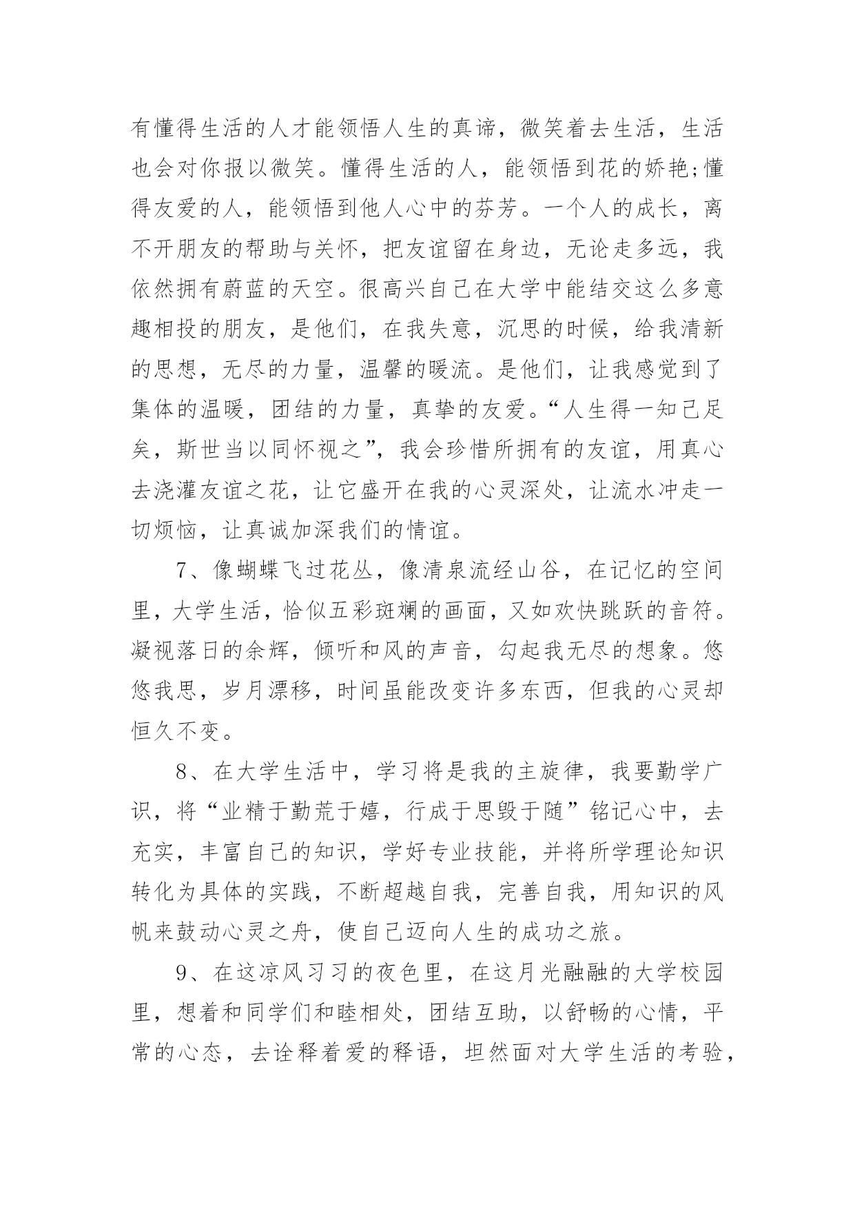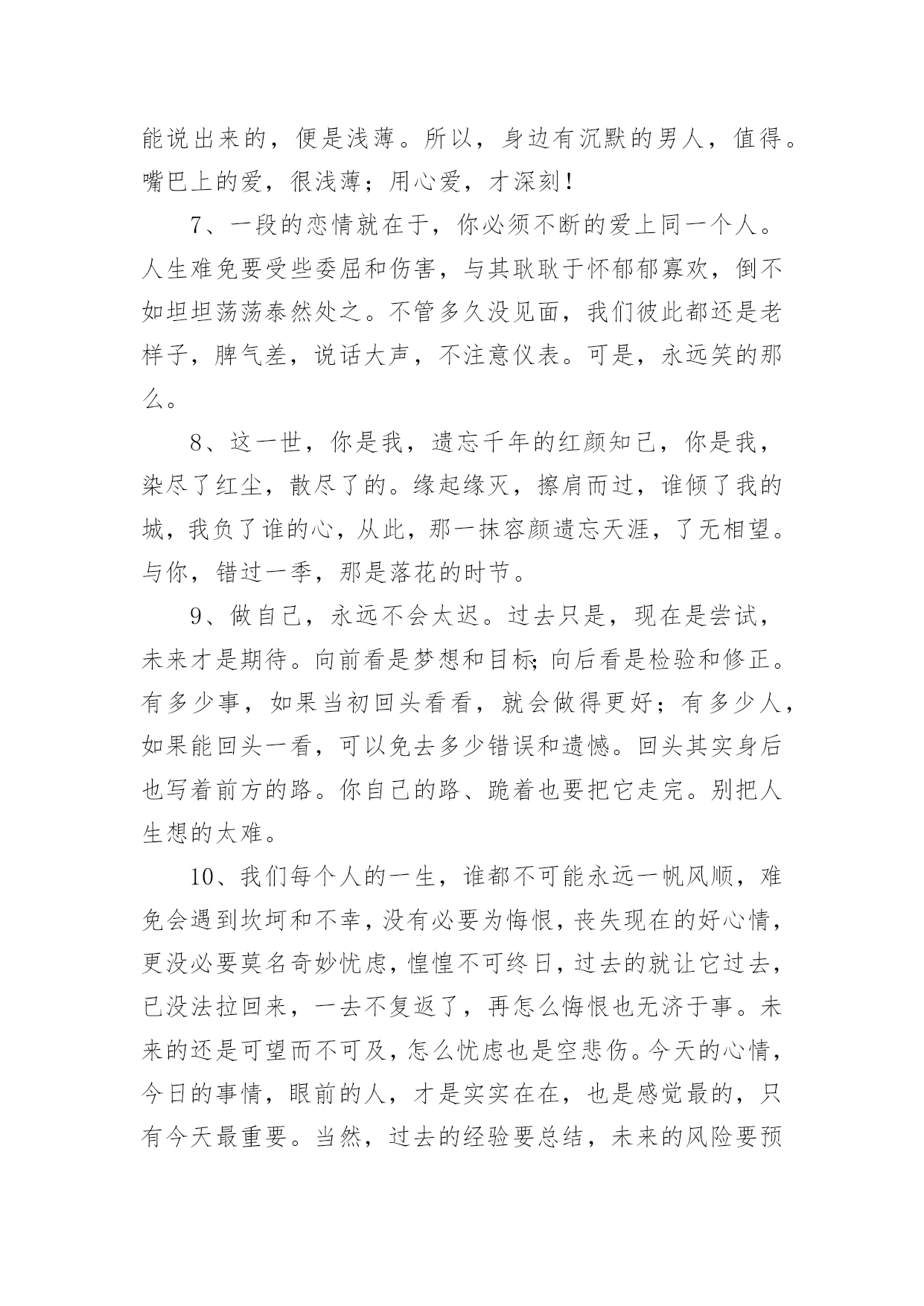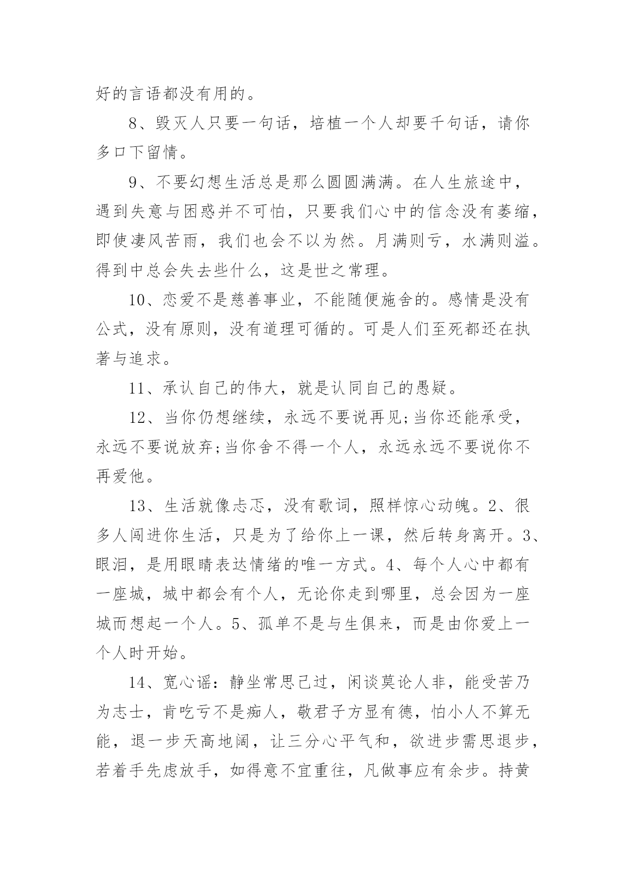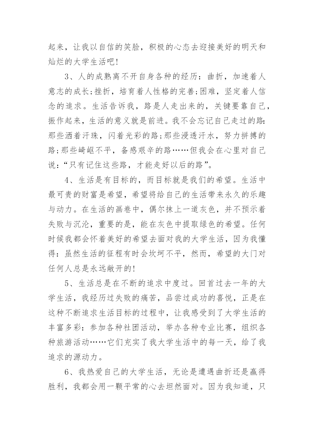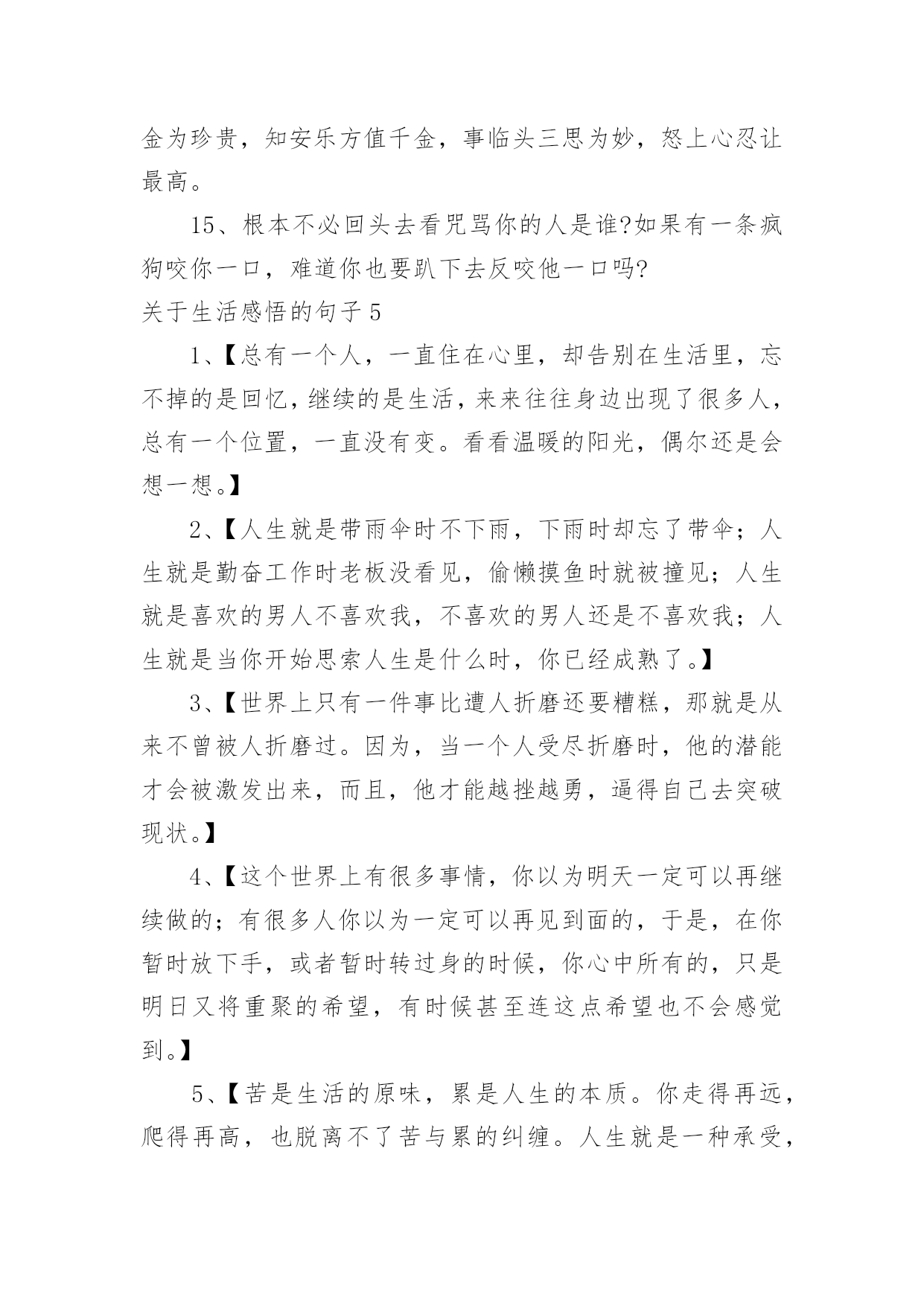 生活感悟的句子关于生活感悟的句子15篇无论是身处学校还是步入社会,说到句子,大家肯定都不陌生吧,句子能表达一个完整的意思,如告诉别人一件事情,提出一个问题,表示要求或者制止,表示某种感慨,表示对一段话的延续或省略。那些被广泛运用的句子都是什么样子的呢?以下是小编精心整理的关于生活感悟的句子,仅供参考,欢迎大家阅读。关于生活感悟的句子11、回忆是对往日美好的珍藏。打开尘封的记忆,穿越时光的隧道,在大学一年多的生活中,我学会了在失败与成功的交替中点缀充实的生活;学会了在独处与交往的环境中释放自己的心情;学会了在聆听与诉说的交互中加深真正的友谊。漫步在美丽的校园中,回想自己过去一年留下的足迹,感觉自己已经长大,不再是一年前那个懵懂的男孩。很幸运自己能在这安适的求学环境中认识很多亲切的老师,结识许多真挚的同学,是他们,让我的大学生活更充实,使我的生活中充满了快乐,幸福的元素。2、静谧的天空,每颗星星都有自己的轨迹,我会在大学生活中找到自己的最佳位置,让心目中的世界变得和谐安宁。昨天,在我的记忆里还是这样的清晰--好吧,把它珍藏起来,让我以自信的笑脸,积极的心态去迎接美好的明天和灿烂的大学生活吧!3、人的成熟离不开自身各种的经历:曲折,加速着人意志的成长;挫折,培育着人性格的完善;困难,坚定着人信念的追求。生活告诉我,路是人走出来的,关键要靠自己,振作起来,生活的意义就是前进。我不会忘记自己走过的路:那些洒着汗珠,闪着光彩的路;那些浸透汗水,努力拼搏的路;那些崎岖不平,备感艰辛的路……但我会在心里对自己说:“只有记住这些路,才能走好以后的路”。4、生活是有目标的,而目标就是我们的希望。生活中最可贵的财富是希望,希望将给自己的生活带来永久的乐趣与动力。在生活的画卷中,偶尔抹上一道灰色,并不预示着失败与沉沦,重要的是,能在灰色中提取绿色的希望。任何时候我都会怀着美好的希望去面对我的大学生活,因为我懂得:虽然生活的征程有时会坎坷不平,然而,希望的大门对任何人总是永远敞开的!5、生活总是在不断的追求中度过。回首过去一年的大学生活,我经历过失败的痛苦,品尝过成功的喜悦,正是在这种不断追求生活目标的过程中,让我感受到了大学生活的丰富多彩:参加各种社团活动,举办各种专业比赛,组织各种旅游活动……它们充实了我大学生活中的每一天,给了我追求的源动力。6、我热爱自己的大学生活,无论是遭遇曲折还是赢得胜利,我都会用一颗平常的心去坦然面对。因为我知道,只有懂得生活的人才能领悟人生的真谛,微笑着去生活,生活也会对你报以微笑。懂得生活的人,能领悟到花的娇艳;懂得友爱的人,能领悟到他人心中的芬芳。一个人的成长,离不开朋友的帮助与关怀,把友谊留在身边,无论走多远,我依然拥有蔚蓝的天空。很高兴自己在大学中能结交这么多意趣相投的朋友,是他们,在我失意,沉思的时候,给我清新的思想,无尽的力量,温馨的暖流。是他们,让我感觉到了集体的温暖,团结的力量,真挚的友爱。“人生得一知己足矣,斯世当以同怀视之”,我会珍惜所拥有的友谊,用真心去浇灌友谊之花,让它盛开在我的心灵深处,让流水冲走一切烦恼,让真诚加深我们的情谊。7、像蝴蝶飞过花丛,像清泉流经山谷,在记忆的空间里,大学生活,恰似五彩斑斓的画面,又如欢快跳跃的音符。凝视落日的余辉,倾听和风的声音,勾起我无尽的想象。悠悠我思,岁月漂移,时间虽能改变许多东西,但我的心灵却恒久不变。8、在大学生活中,学习将是我的主旋律,我要勤学广识,将“业精于勤荒于嬉,行成于思毁于随”铭记心中,去充实,丰富自己的知识,学好专业技能,并将所学理论知识转化为具体的实践,不断超越自我,完善自我,用知识的风帆来鼓动心灵之舟,使自己迈向人生的成功之旅。9、在这凉风习习的夜色里,在这月光融融的大学校园里,想着和同学们和睦相处,团结互助,以舒畅的心情,平常的心态,去诠释着爱的释语,坦然面对大学生活的考验,这是多么幸福的啊!10、知识的获得通过教育,经验的积累通过实践。让自己的思绪随文字自由的飘飞,心中怀着美好的理想,去寻找属于自己的空间。而理想的琴,须拨动奋斗的弦,才能奏出大学生活中美妙动听的乐章,因此在追求理想的征程中,我要用获得理论与付出实践的交替,点缀出自己多姿多彩的大学生活,从而在大学的生活中,构筑自己幸运的大厦。关于生活感悟的句子21.在对的时间,遇见对的人,是一生幸福;在对的时间,遇见错的人,是一场心伤;在错的时间,遇见错的人,是一段荒唐;在错的时间,遇见对的人,是一阵叹息。(失恋时候好朋友网上发给我的)2.其实根本就没有什么“假如”,每个人的人生都不可重新设计。3.在什么都不确定的年代,我们总是爱得太早,放弃得太快,轻易付出承诺,又不想等待结果。戒指,不再是一生一世的承诺,终生相守的誓言,却成了纪念伤感的烙印。就像有人说过的:戒指好比爱情,戴在手上,