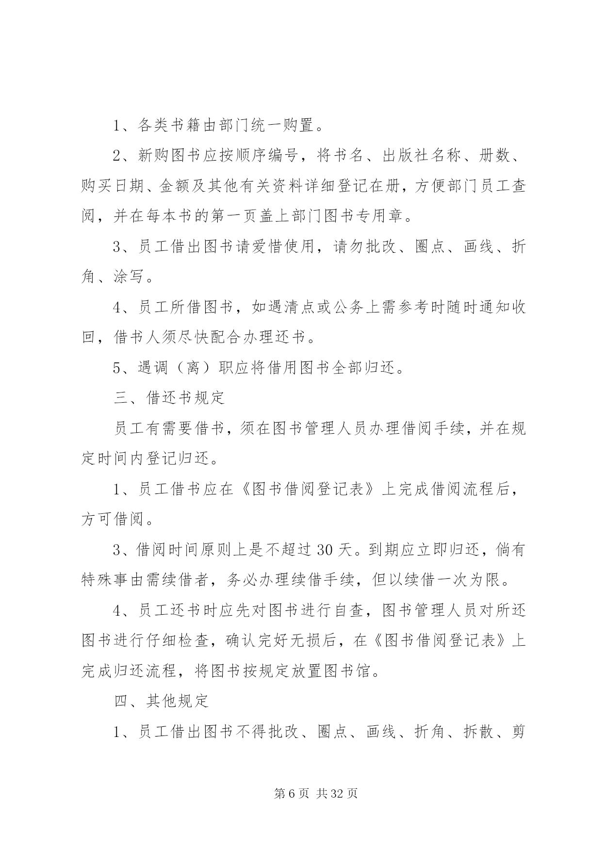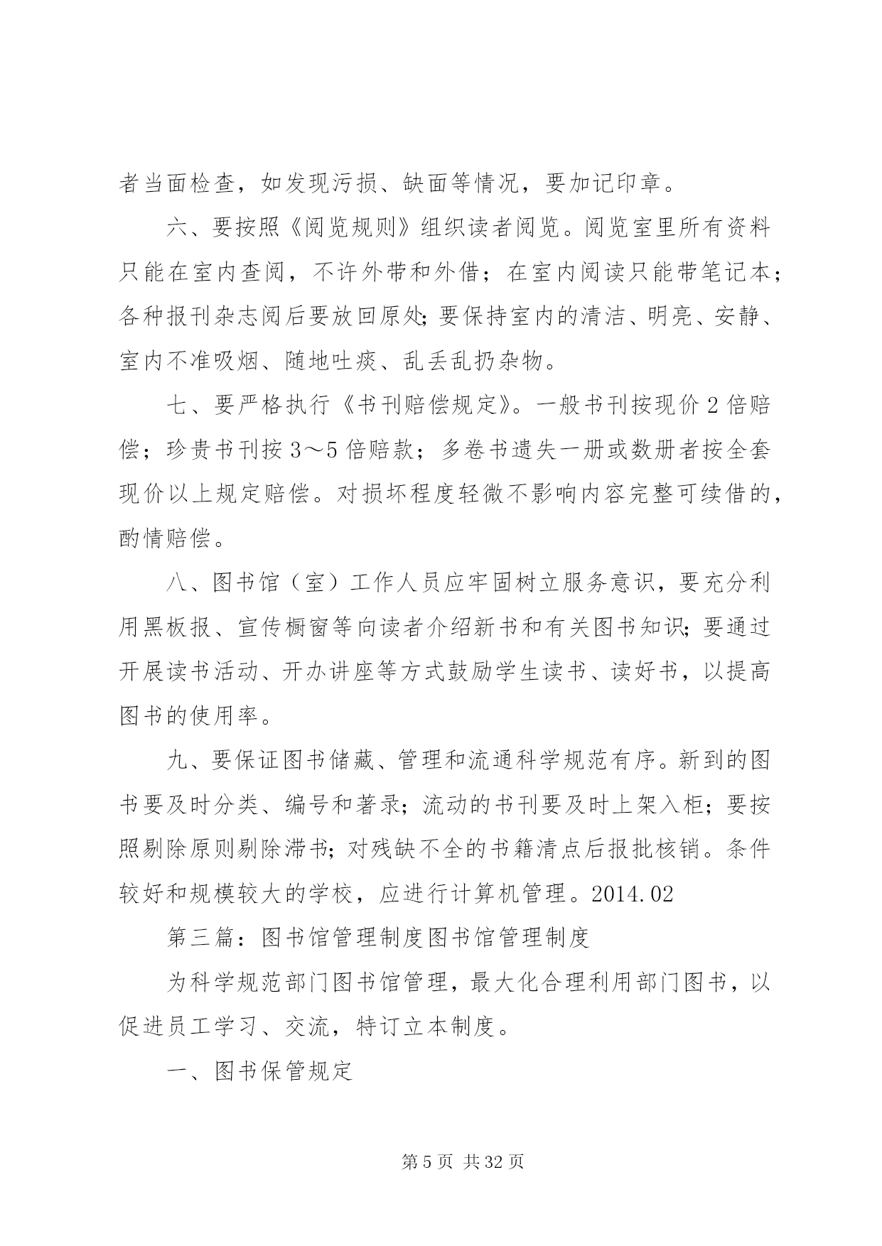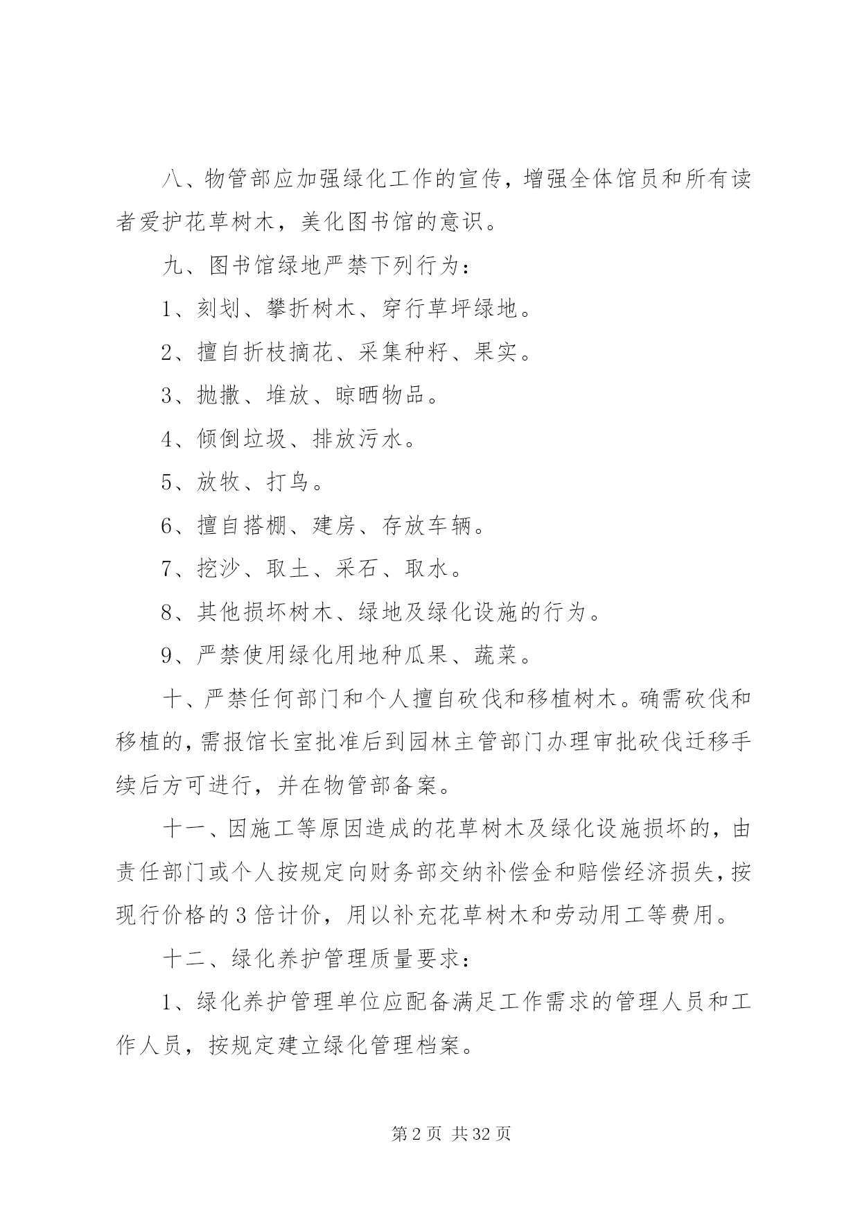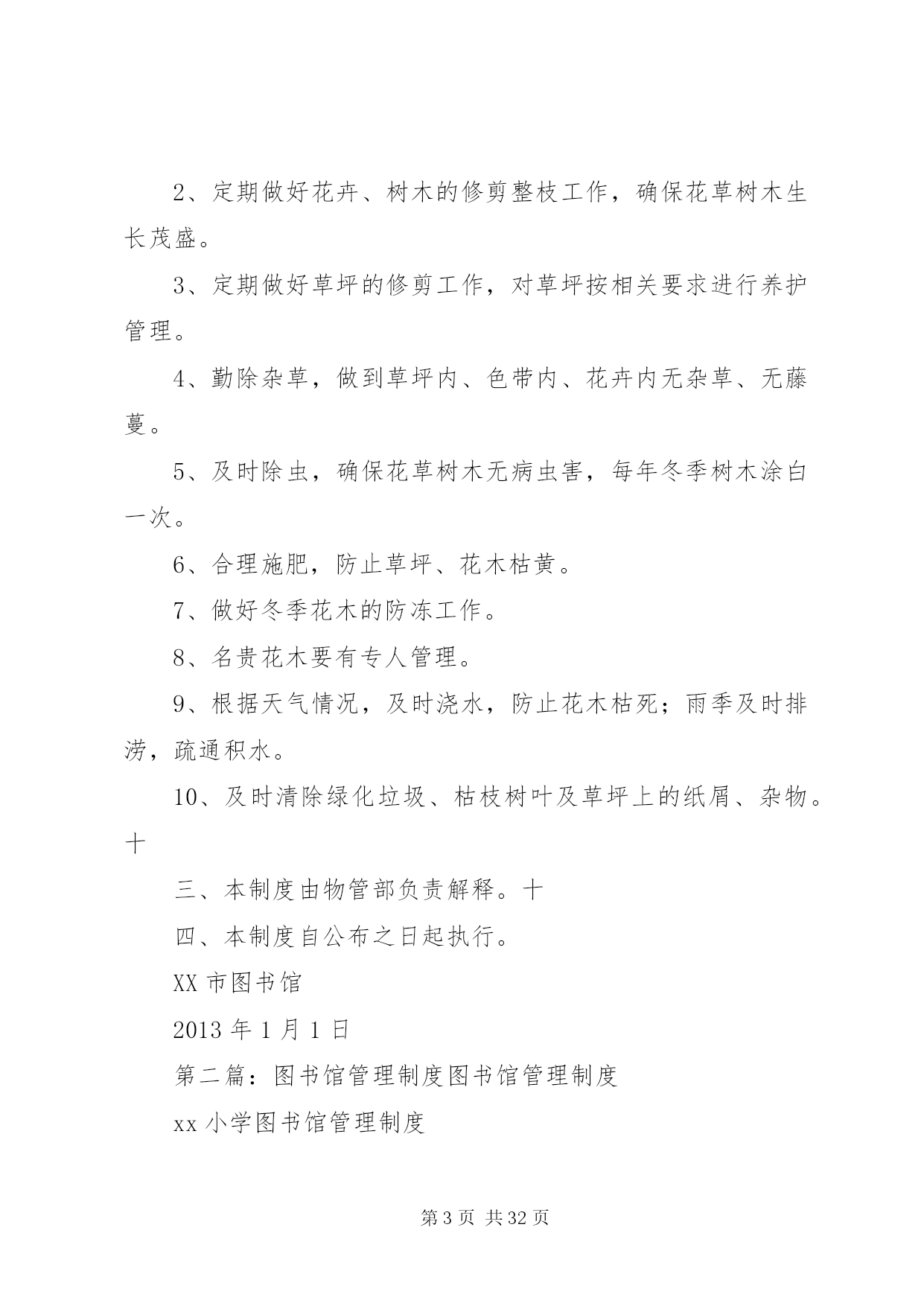 第PAGE\*Arabic\*MERGEFORMAT32页共NUMPAGES\*MERGEFORMAT32页图书馆绿化管理制度为进一步加强图书馆绿化管理、促进图书馆绿化建设、保护和改善图书馆生态环境,根据国家、省、市的有关规定,结合我馆实际情况,制订本制度。一、馆长室组织办公室和物管部共同编制图书馆绿化规划,并纳入到图书馆总体规划。二、馆长室把图书馆绿化建设纳入整体发展计划,并在建设资金中安排绿化建设和管理养护资金。三、图书馆绿化工作由物管部主管。托管物业负责图书馆绿化的养护、管理。物管部负责对全馆的绿化工作实施监督、协调。四、任何部门和个人不得擅自改变绿化规划、不得擅自占用绿化用地,需要临时占用的,使用部门报馆长室批准后实施,并报物管部备案。五、图书馆绿化面积占公共建筑总面积的比率、人均公共绿地面积和绿化覆盖率等规划指标,按上级有关部门的规定标准执行。六、图书馆绿地应符合绿化规划的要求,主要绿化部位的设计方案,应经相关主管部门审核。一般性绿化建设方案,应经研究确定后,方可开工建设。七、图书馆公共绿地、花草树木,实行以绿化专业队伍养护和管理为主的绿化养护和管理方法。八、物管部应加强绿化工作的宣传,增强全体馆员和所有读者爱护花草树木,美化图书馆的意识。九、图书馆绿地严禁下列行为:1、刻划、攀折树木、穿行草坪绿地。2、擅自折枝摘花、采集种籽、果实。3、抛撒、堆放、晾晒物品。4、倾倒垃圾、排放污水。5、放牧、打鸟。6、擅自搭棚、建房、存放车辆。7、挖沙、取土、采石、取水。8、其他损坏树木、绿地及绿化设施的行为。9、严禁使用绿化用地种瓜果、蔬菜。十、严禁任何部门和个人擅自砍伐和移植树木。确需砍伐和移植的,需报馆长室批准后到园林主管部门办理审批砍伐迁移手续后方可进行,并在物管部备案。十一、因施工等原因造成的花草树木及绿化设施损坏的,由责任部门或个人按规定向财务部交纳补偿金和赔偿经济损失,按现行价格的3倍计价,用以补充花草树木和劳动用工等费用。十二、绿化养护管理质量要求:1、绿化养护管理单位应配备满足工作需求的管理人员和工作人员,按规定建立绿化管理档案。2、定期做好花卉、树木的修剪整枝工作,确保花草树木生长茂盛。3、定期做好草坪的修剪工作,对草坪按相关要求进行养护管理。4、勤除杂草,做到草坪内、色带内、花卉内无杂草、无藤蔓。5、及时除虫,确保花草树木无病虫害,每年冬季树木涂白一次。6、合理施肥,防止草坪、花木枯黄。7、做好冬季花木的防冻工作。8、名贵花木要有专人管理。9、根据天气情况,及时浇水,防止花木枯死;雨季及时排涝,疏通积水。10、及时清除绿化垃圾、枯枝树叶及草坪上的纸屑、杂物。十三、本制度由物管部负责解释。十四、本制度自公布之日起执行。XX市图书馆2013年1月1日第二篇:图书馆管理制度图书馆管理制度xx小学图书馆管理制度一、图书馆工作是学校教育教学工作的重要组成部分。图书馆(室)要依照《中小学图书馆(室)规程》的要求建立管理机构,落实管理人员,进行科学规范化管理。工作人员要经过上级教育主管部门组织的培训,持证上岗。二、图书馆(室)的书应包含各类图书、报刊和供教师使用的教学参考书、教育教学研究和应用型书籍。图书、报刊的采集收藏应优先选购国家教委和省教委评审推荐的书目。藏书应有益于青少年身心健康发展。三、各类书刊均要建立总括目录和个别登录两种账目,新购进的图书应由图书管理人员验收、学校领导人审批后才能办理报销手续。图书出库时应由管理人员填写出库单,标明书名、册数、单价、金额,经领导审批后方能办理出库手续。有保存价值的报纸和期刊要按年度装订成册。四、书刊分类执行《中国图书馆图书分类法(儿童图书馆、中小学图书馆版)》《中国图书馆分类法期分类表》标准,书刊著录依据《普通图书著录规则》和《连续出版物著录规则》标准和要求。目录设置以卡片目录为主,中学应设书名目录和分类目录,小学设书名目录,规模较小的且采用了半开架借书方式的学校,可不采用卡片目录。要做到书卡相符。五、要按照《图书借还规定》组织书刊借阅。要及时办理新生《借书证》和换证;要按规则凭证借阅书刊;借书时要求借阅者当面检查,如发现污损、缺面等情况,要加记印章。六、要按照《阅览规则》组织读者阅览。阅览室里所有资料只能在室内查阅,不许外带和外借;在室内阅读只能带笔记本;各种报刊杂志阅后要放回原处;要保持室内的清洁、明亮、安静、室内不准吸烟、随地吐痰、乱丢乱扔杂物。七、要严格执行《书刊赔偿规定》。一般书刊按现价2倍赔偿;珍贵书刊按3~5倍赔款;多卷书遗失一册或数册者按全套现价以上规定赔偿。对损坏程度轻微不影响内容完整可续借的,酌情赔偿。八、图书馆(室)工作人员应牢固树立服务意识,要充分利用黑板报、宣传橱窗等向读者介绍新书和有关图书知识;要通过开展读书活动、开办讲座等方