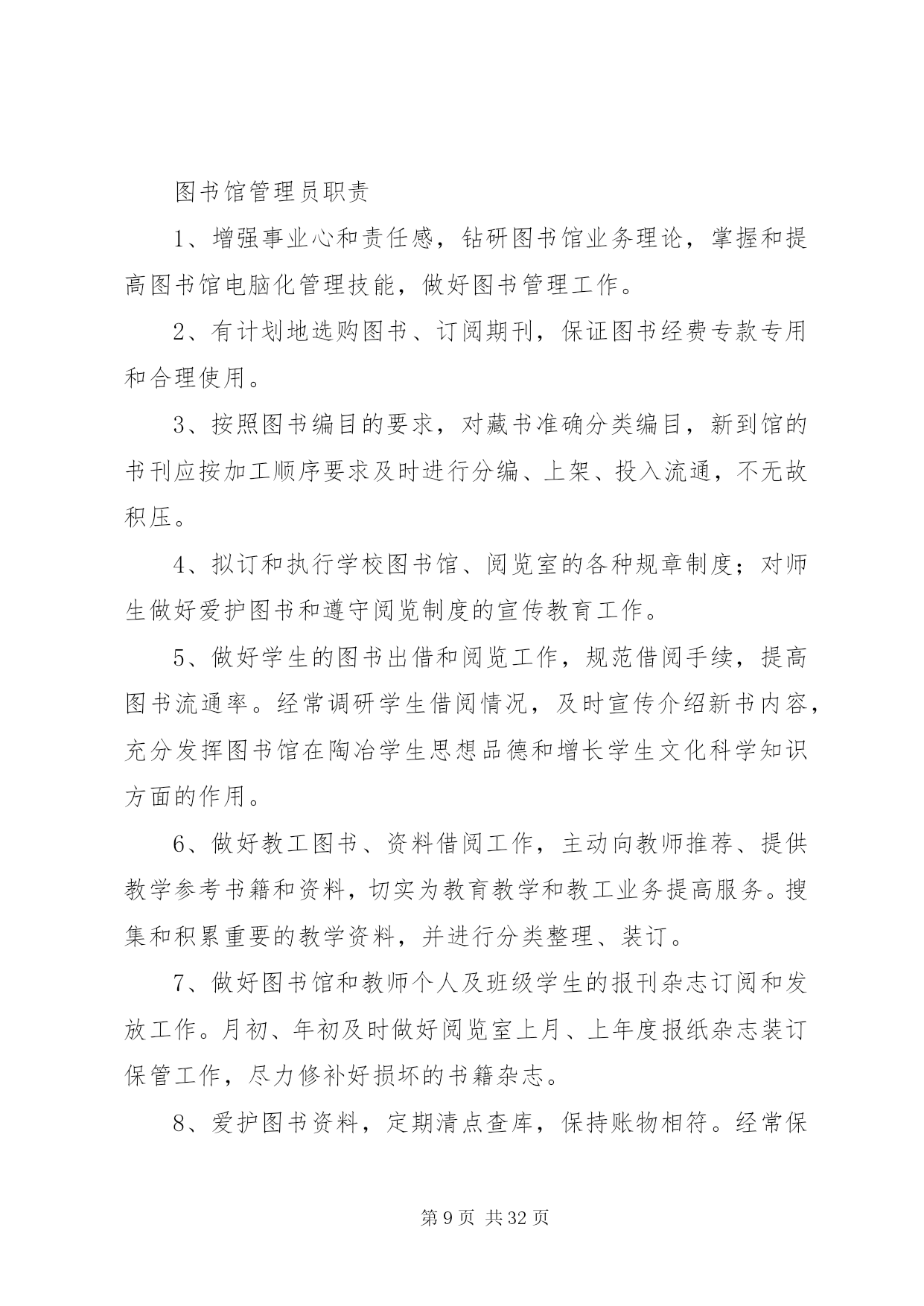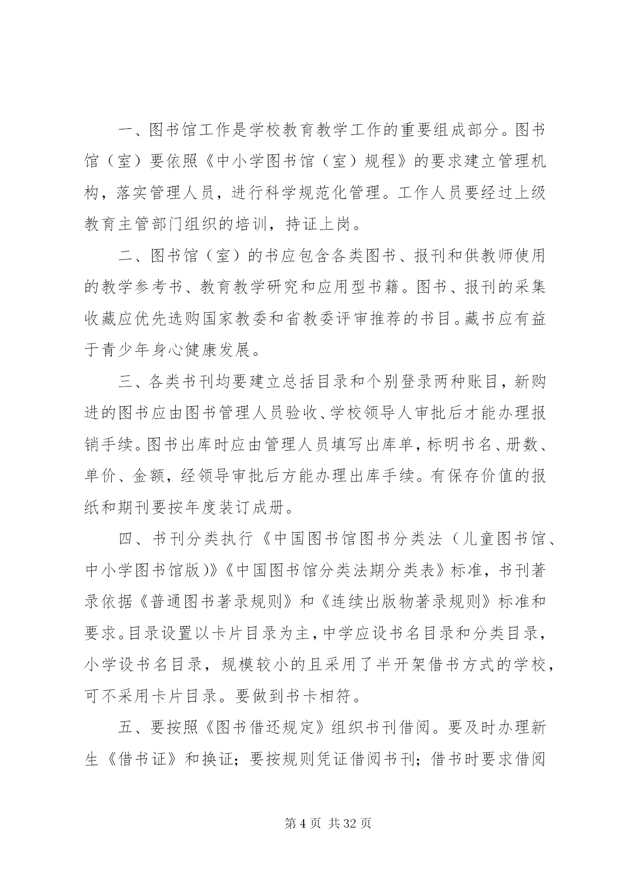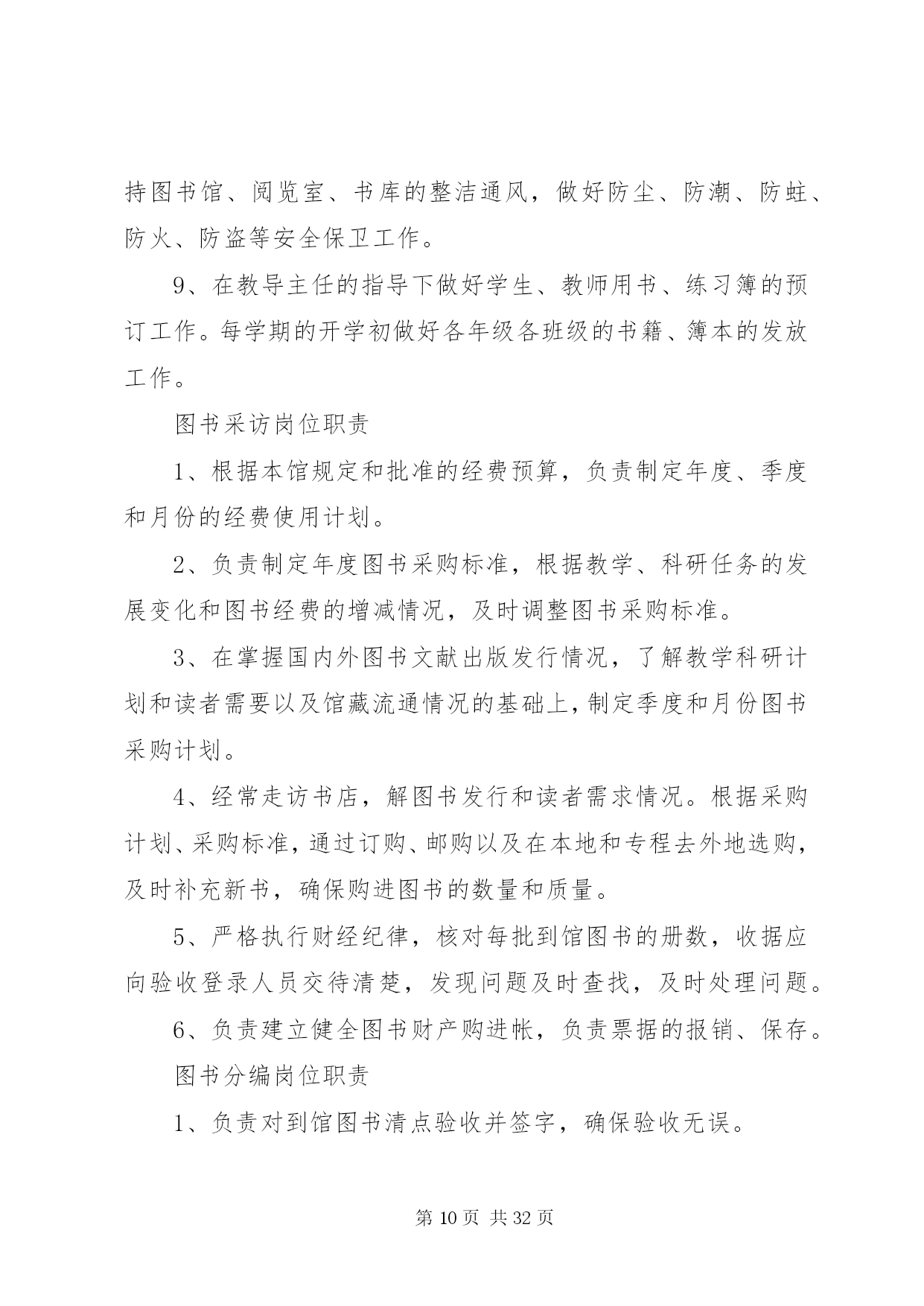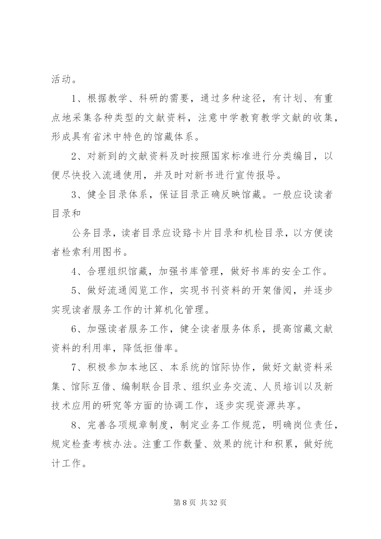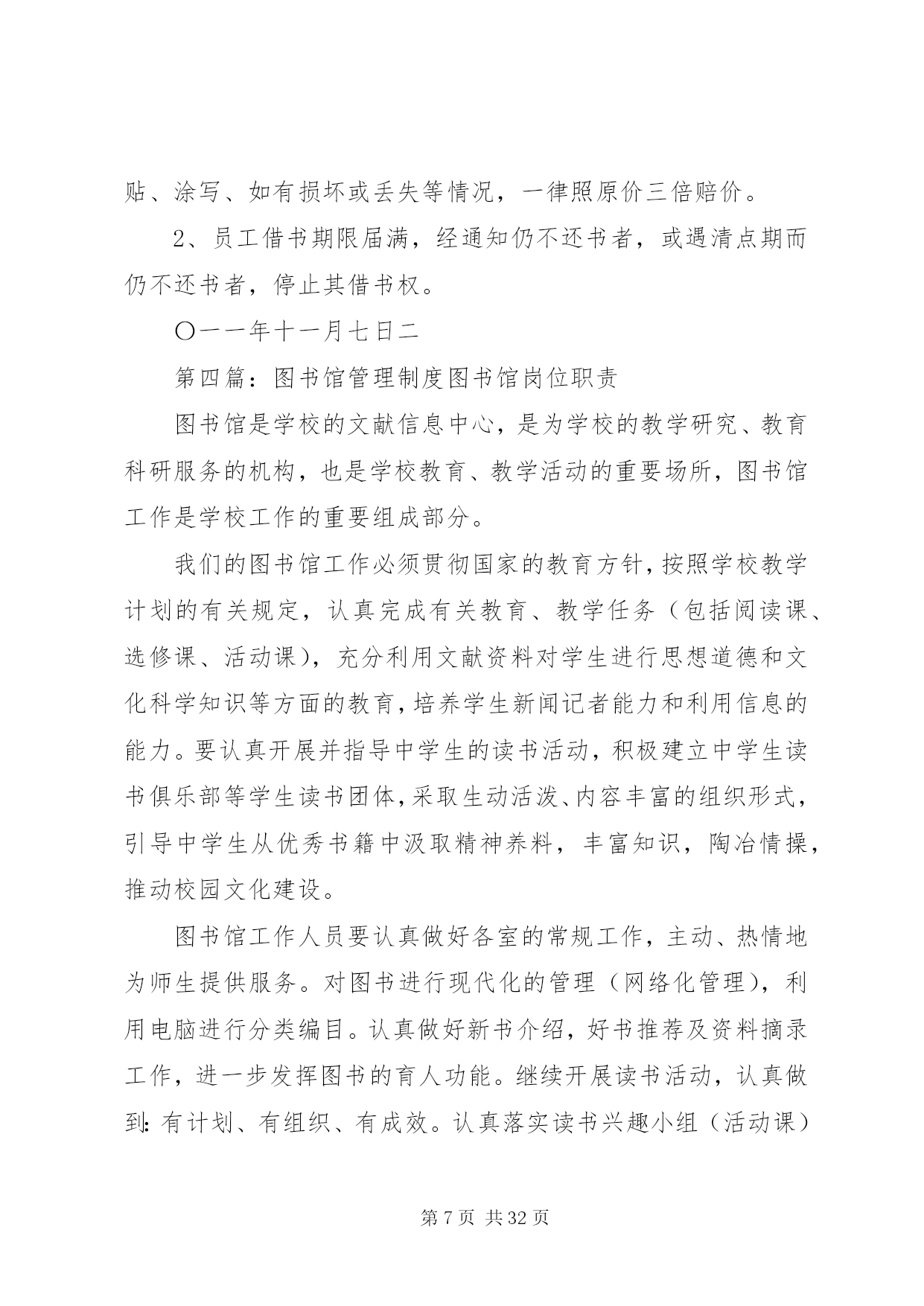 第PAGE\*Arabic\*MERGEFORMAT32页共NUMPAGES\*MERGEFORMAT32页图书馆绿化管理制度为进一步加强图书馆绿化管理、促进图书馆绿化建设、保护和改善图书馆生态环境,根据国家、省、市的有关规定,结合我馆实际情况,制订本制度。一、馆长室组织办公室和物管部共同编制图书馆绿化规划,并纳入到图书馆总体规划。二、馆长室把图书馆绿化建设纳入整体发展计划,并在建设资金中安排绿化建设和管理养护资金。三、图书馆绿化工作由物管部主管。托管物业负责图书馆绿化的养护、管理。物管部负责对全馆的绿化工作实施监督、协调。四、任何部门和个人不得擅自改变绿化规划、不得擅自占用绿化用地,需要临时占用的,使用部门报馆长室批准后实施,并报物管部备案。五、图书馆绿化面积占公共建筑总面积的比率、人均公共绿地面积和绿化覆盖率等规划指标,按上级有关部门的规定标准执行。六、图书馆绿地应符合绿化规划的要求,主要绿化部位的设计方案,应经相关主管部门审核。一般性绿化建设方案,应经研究确定后,方可开工建设。七、图书馆公共绿地、花草树木,实行以绿化专业队伍养护和管理为主的绿化养护和管理方法。八、物管部应加强绿化工作的宣传,增强全体馆员和所有读者爱护花草树木,美化图书馆的意识。九、图书馆绿地严禁下列行为:1、刻划、攀折树木、穿行草坪绿地。2、擅自折枝摘花、采集种籽、果实。3、抛撒、堆放、晾晒物品。4、倾倒垃圾、排放污水。5、放牧、打鸟。6、擅自搭棚、建房、存放车辆。7、挖沙、取土、采石、取水。8、其他损坏树木、绿地及绿化设施的行为。9、严禁使用绿化用地种瓜果、蔬菜。十、严禁任何部门和个人擅自砍伐和移植树木。确需砍伐和移植的,需报馆长室批准后到园林主管部门办理审批砍伐迁移手续后方可进行,并在物管部备案。十一、因施工等原因造成的花草树木及绿化设施损坏的,由责任部门或个人按规定向财务部交纳补偿金和赔偿经济损失,按现行价格的3倍计价,用以补充花草树木和劳动用工等费用。十二、绿化养护管理质量要求:1、绿化养护管理单位应配备满足工作需求的管理人员和工作人员,按规定建立绿化管理档案。2、定期做好花卉、树木的修剪整枝工作,确保花草树木生长茂盛。3、定期做好草坪的修剪工作,对草坪按相关要求进行养护管理。4、勤除杂草,做到草坪内、色带内、花卉内无杂草、无藤蔓。5、及时除虫,确保花草树木无病虫害,每年冬季树木涂白一次。6、合理施肥,防止草坪、花木枯黄。7、做好冬季花木的防冻工作。8、名贵花木要有专人管理。9、根据天气情况,及时浇水,防止花木枯死;雨季及时排涝,疏通积水。10、及时清除绿化垃圾、枯枝树叶及草坪上的纸屑、杂物。十三、本制度由物管部负责解释。十四、本制度自公布之日起执行。XX市图书馆2013年1月1日第二篇:图书馆管理制度图书馆管理制度xx小学图书馆管理制度一、图书馆工作是学校教育教学工作的重要组成部分。图书馆(室)要依照《中小学图书馆(室)规程》的要求建立管理机构,落实管理人员,进行科学规范化管理。工作人员要经过上级教育主管部门组织的培训,持证上岗。二、图书馆(室)的书应包含各类图书、报刊和供教师使用的教学参考书、教育教学研究和应用型书籍。图书、报刊的采集收藏应优先选购国家教委和省教委评审推荐的书目。藏书应有益于青少年身心健康发展。三、各类书刊均要建立总括目录和个别登录两种账目,新购进的图书应由图书管理人员验收、学校领导人审批后才能办理报销手续。图书出库时应由管理人员填写出库单,标明书名、册数、单价、金额,经领导审批后方能办理出库手续。有保存价值的报纸和期刊要按年度装订成册。四、书刊分类执行《中国图书馆图书分类法(儿童图书馆、中小学图书馆版)》《中国图书馆分类法期分类表》标准,书刊著录依据《普通图书著录规则》和《连续出版物著录规则》标准和要求。目录设置以卡片目录为主,中学应设书名目录和分类目录,小学设书名目录,规模较小的且采用了半开架借书方式的学校,可不采用卡片目录。要做到书卡相符。五、要按照《图书借还规定》组织书刊借阅。要及时办理新生《借书证》和换证;要按规则凭证借阅书刊;借书时要求借阅者当面检查,如发现污损、缺面等情况,要加记印章。六、要按照《阅览规则》组织读者阅览。阅览室里所有资料只能在室内查阅,不许外带和外借;在室内阅读只能带笔记本;各种报刊杂志阅后要放回原处;要保持室内的清洁、明亮、安静、室内不准吸烟、随地吐痰、乱丢乱扔杂物。七、要严格执行《书刊赔偿规定》。一般书刊按现价2倍赔偿;珍贵书刊按3~5倍赔款;多卷书遗失一册或数册者按全套现价以上规定赔偿。对损坏程度轻微不影响内容完整可续借的,酌情赔偿。八、图书馆(室)工作人员应牢固树立服务意识,要充分利用黑板报、宣传橱窗等向读者介绍新书和有关图书知识;要通过开展读书活动、开办讲座等方