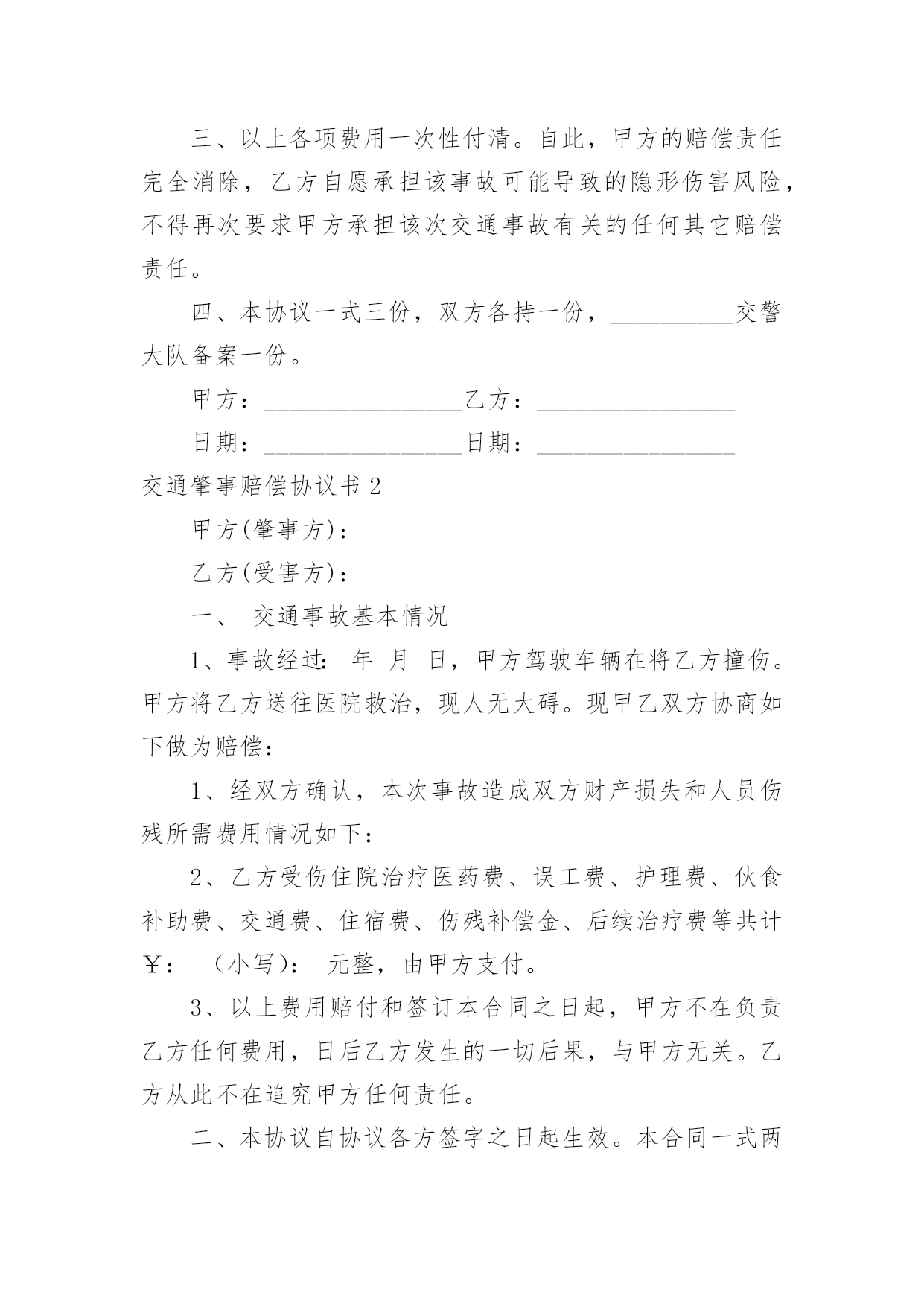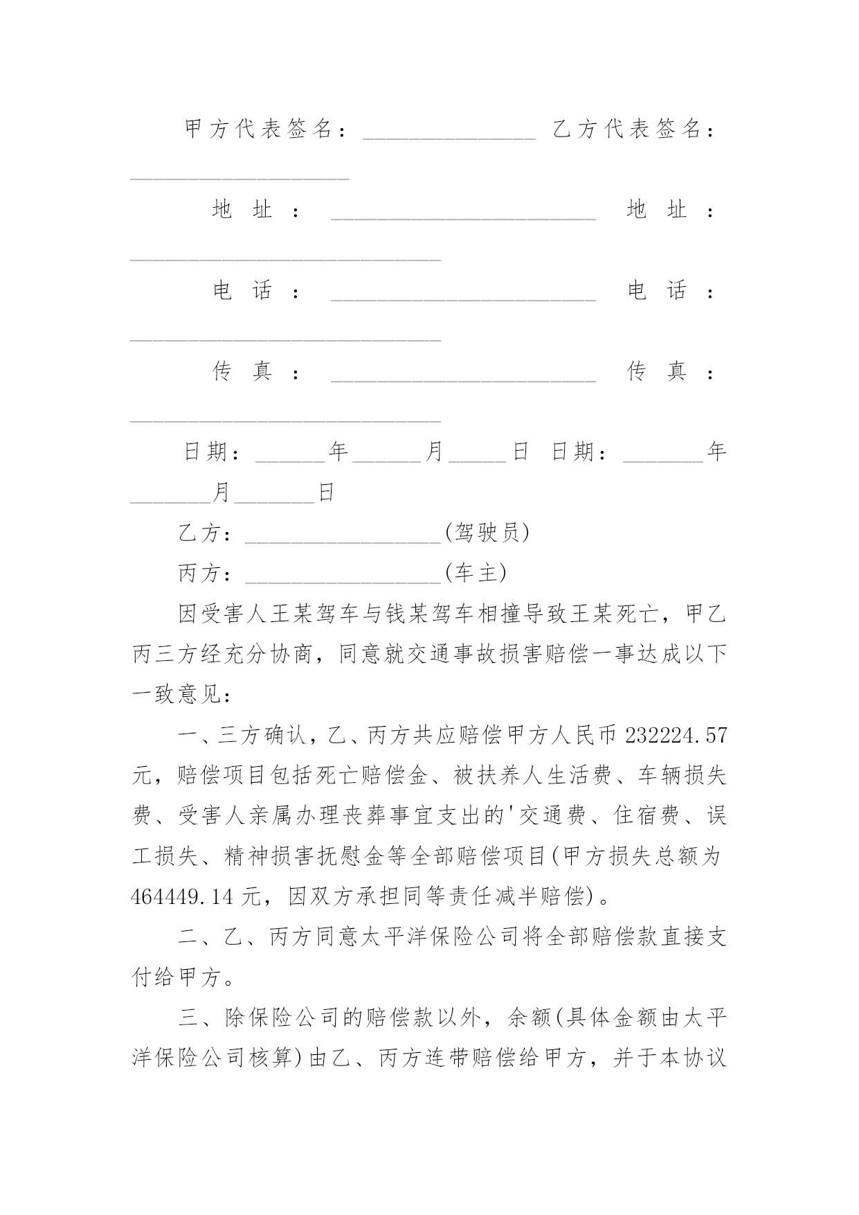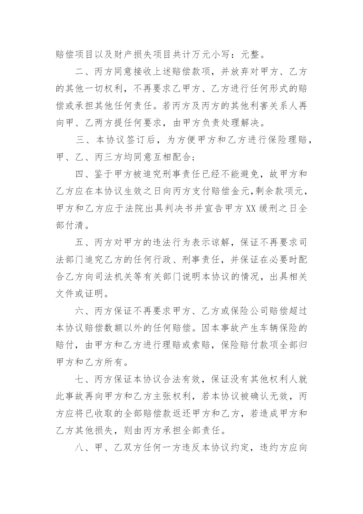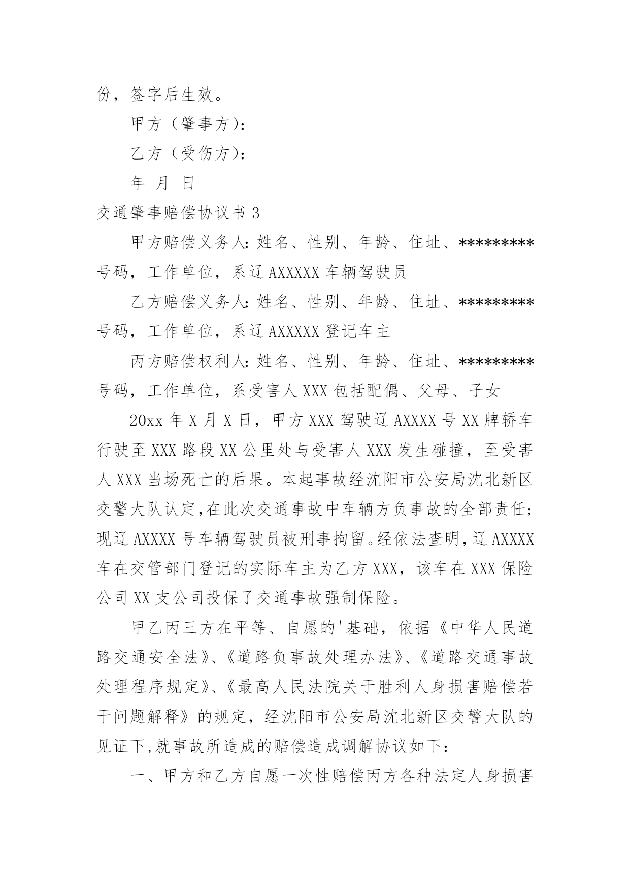 交通肇事赔偿协议书(荐)交通肇事赔偿协议书在不断进步的时代,人们运用到协议的场合不断增多,签订协议是提高经济效益的手段。我们该怎么拟定协议呢?下面是小编帮大家整理的交通肇事赔偿协议书,希望对大家有所帮助。交通肇事赔偿协议书1甲方:________________乙方:__________________________年__________月__________日晚,甲方驾驶一辆白色面包车在大理州__________县__________镇__________村把在路边行走的乙方撞伤,致使乙方左肋骨折断两根。当晚,甲方立即将乙方送至__________县医院紧急救治。住院期间,乙方家人一直陪伴照顾。_________年_____月__________日,乙方治愈出院。现双方友好协商,并经双方家属同意,就该交通事故的`相关赔偿事宜协议如下:一、乙方住院期间已经产生的医疗费用及其他必要费用全部由甲方承担。二、出院后,甲方一次性付给乙方营养费_____________元、误工费_______________元、护理费_____________元、住院伙食补助费_______________元、复查费__________元等费用,合计_________________元。三、以上各项费用一次性付清。自此,甲方的赔偿责任完全消除,乙方自愿承担该事故可能导致的隐形伤害风险,不得再次要求甲方承担该次交通事故有关的任何其它赔偿责任。四、本协议一式三份,双方各持一份,__________交警大队备案一份。甲方:________________乙方:________________日期:________________日期:________________交通肇事赔偿协议书2甲方(肇事方):乙方(受害方):一、交通事故基本情况1、事故经过:年月日,甲方驾驶车辆在将乙方撞伤。甲方将乙方送往医院救治,现人无大碍。现甲乙双方协商如下做为赔偿:1、经双方确认,本次事故造成双方财产损失和人员伤残所需费用情况如下:2、乙方受伤住院治疗医药费、误工费、护理费、伙食补助费、交通费、住宿费、伤残补偿金、后续治疗费等共计¥:(小写):元整,由甲方支付。3、以上费用赔付和签订本合同之日起,甲方不在负责乙方任何费用,日后乙方发生的一切后果,与甲方无关。乙方从此不在追究甲方任何责任。二、本协议自协议各方签字之日起生效。本合同一式两份,签字后生效。甲方(肇事方):乙方(受伤方):年月日交通肇事赔偿协议书3甲方赔偿义务人:姓名、性别、年龄、住址、*********号码,工作单位,系辽AXXXXX车辆驾驶员乙方赔偿义务人:姓名、性别、年龄、住址、*********号码,工作单位,系辽AXXXXX登记车主丙方赔偿权利人:姓名、性别、年龄、住址、*********号码,工作单位,系受害人XXX包括配偶、父母、子女20xx年X月X日,甲方XXX驾驶辽AXXXX号XX牌轿车行驶至XXX路段XX公里处与受害人XXX发生碰撞,至受害人XXX当场死亡的后果。本起事故经沈阳市公安局沈北新区交警大队认定,在此次交通事故中车辆方负事故的全部责任;现辽AXXXX号车辆驾驶员被刑事拘留。经依法查明,辽AXXXX车在交管部门登记的实际车主为乙方XXX,该车在XXX保险公司XX支公司投保了交通事故强制保险。甲乙丙三方在平等、自愿的'基础,依据《中华人民道路交通安全法》、《道路负事故处理办法》、《道路交通事故处理程序规定》、《最高人民法院关于胜利人身损害赔偿若干问题解释》的规定,经沈阳市公安局沈北新区交警大队的见证下,就事故所造成的赔偿造成调解协议如下:一、甲方和乙方自愿一次性赔偿丙方各种法定人身损害赔偿项目以及财产损失项目共计万元小写:元整。二、丙方同意接收上述赔偿款项,并放弃对甲方、乙方的其他一切权利,不再要求乙甲方、乙方进行任何形式的赔偿或承担其他任何责任。若丙方及丙方的其他利害关系人再向甲、乙两方提任何要求,由甲方负责处理解决。三、本协议签订后,为方便甲方和乙方进行保险理赔,甲、乙、丙三方均同意互相配合;四、鉴于甲方被追究刑事责任已经不能避免,故甲方和乙方应在本协议生效之日向丙方支付赔偿金元,剩余款项元,甲方和乙方应于法院出具判决书并宣告甲方XX缓刑之日全部付清。五、丙方对甲方的违法行为表示谅解,保证不再要求司法部门追究乙方的任何行政、刑事责任,并保证在必要时配合乙方向司法机关等有关部门说明本协议的情况,出具相关文件或证明。六、丙方保证不再要求甲方、乙方或保险公司赔偿超过本协议赔偿数额以外的任何赔偿。因本事故产生车辆保险的赔付,由甲方和乙方进行理赔或索赔,保险赔付款项全部归甲方和乙方所有。七、丙方保证本协议合法有效,保证没有其他权利人就此事故再向甲方和乙方主张权利,若本协议被确认无效,丙方应将已