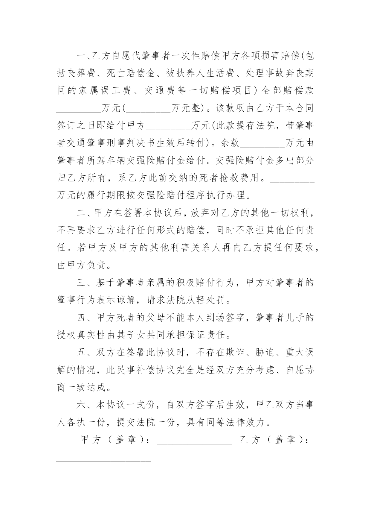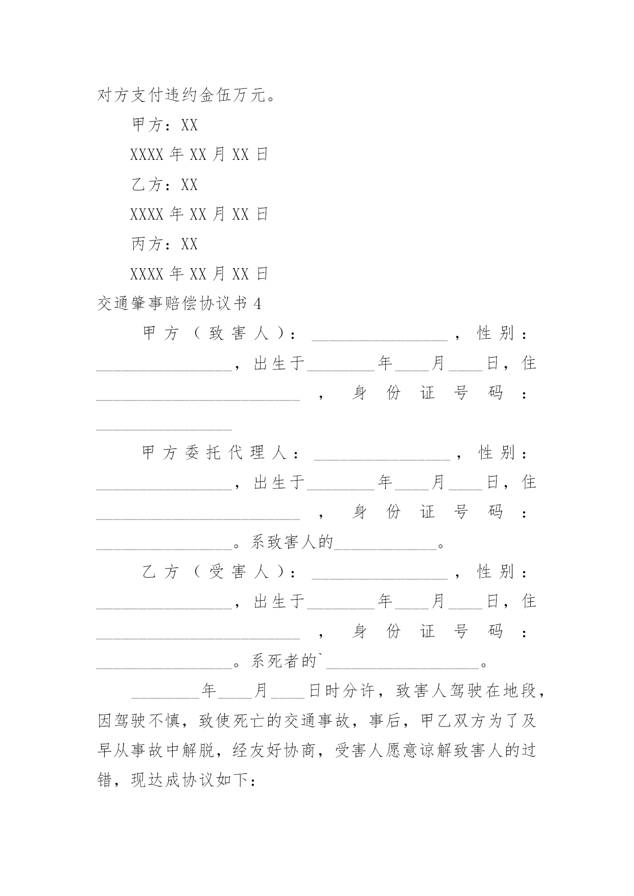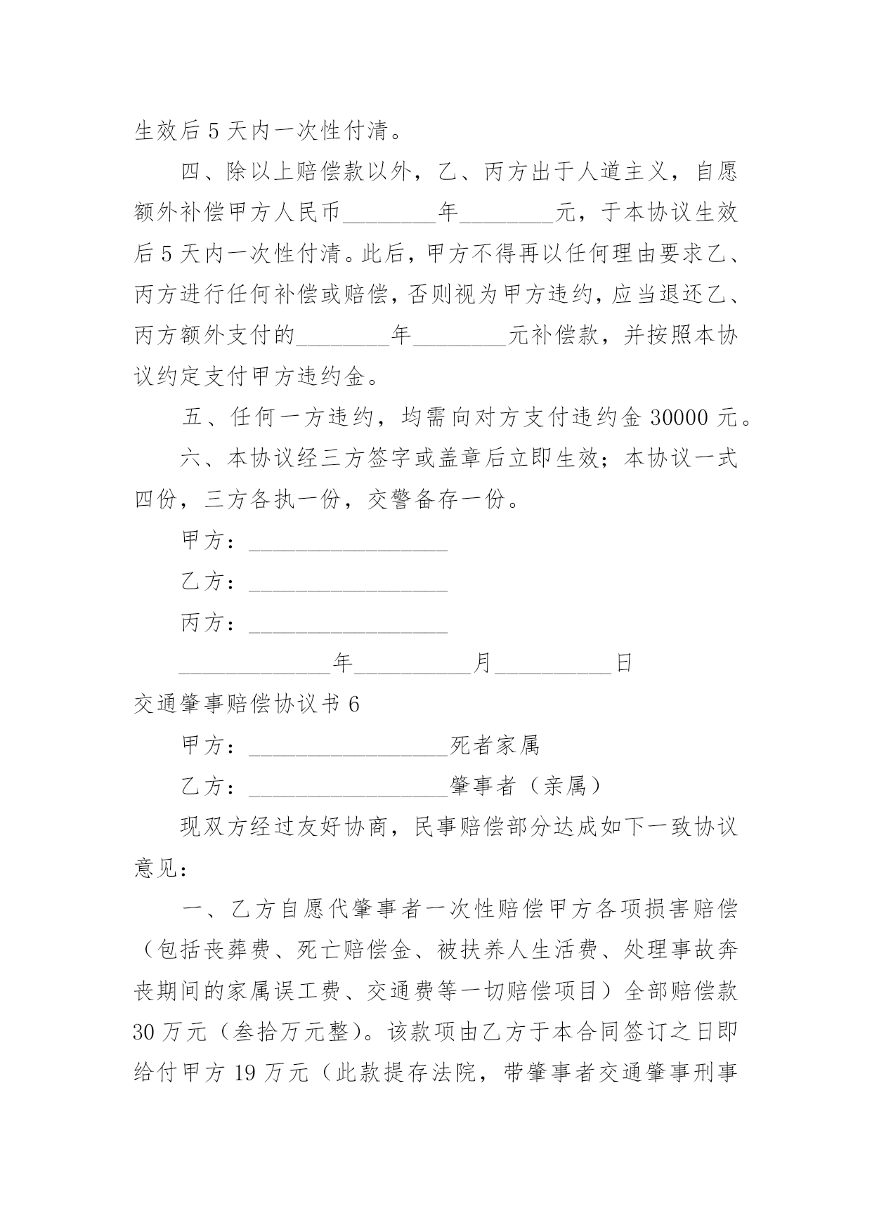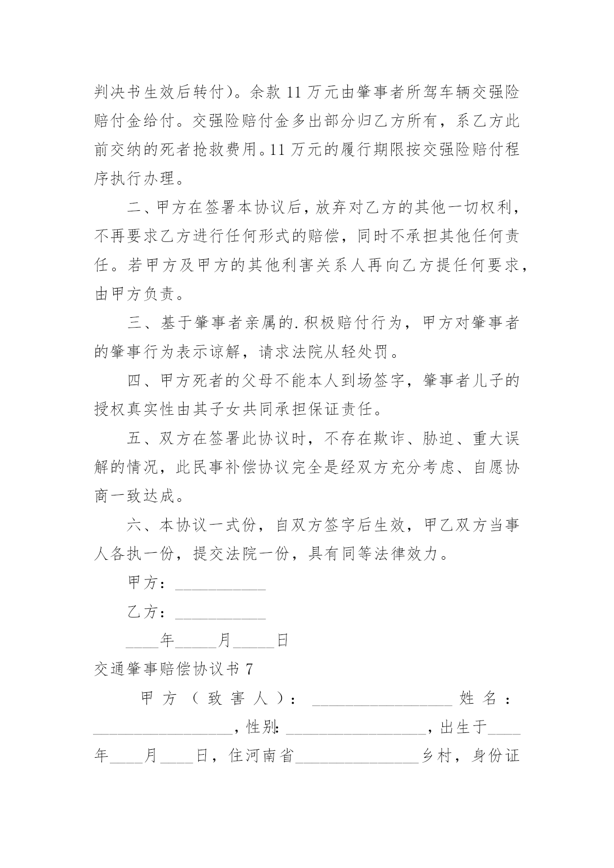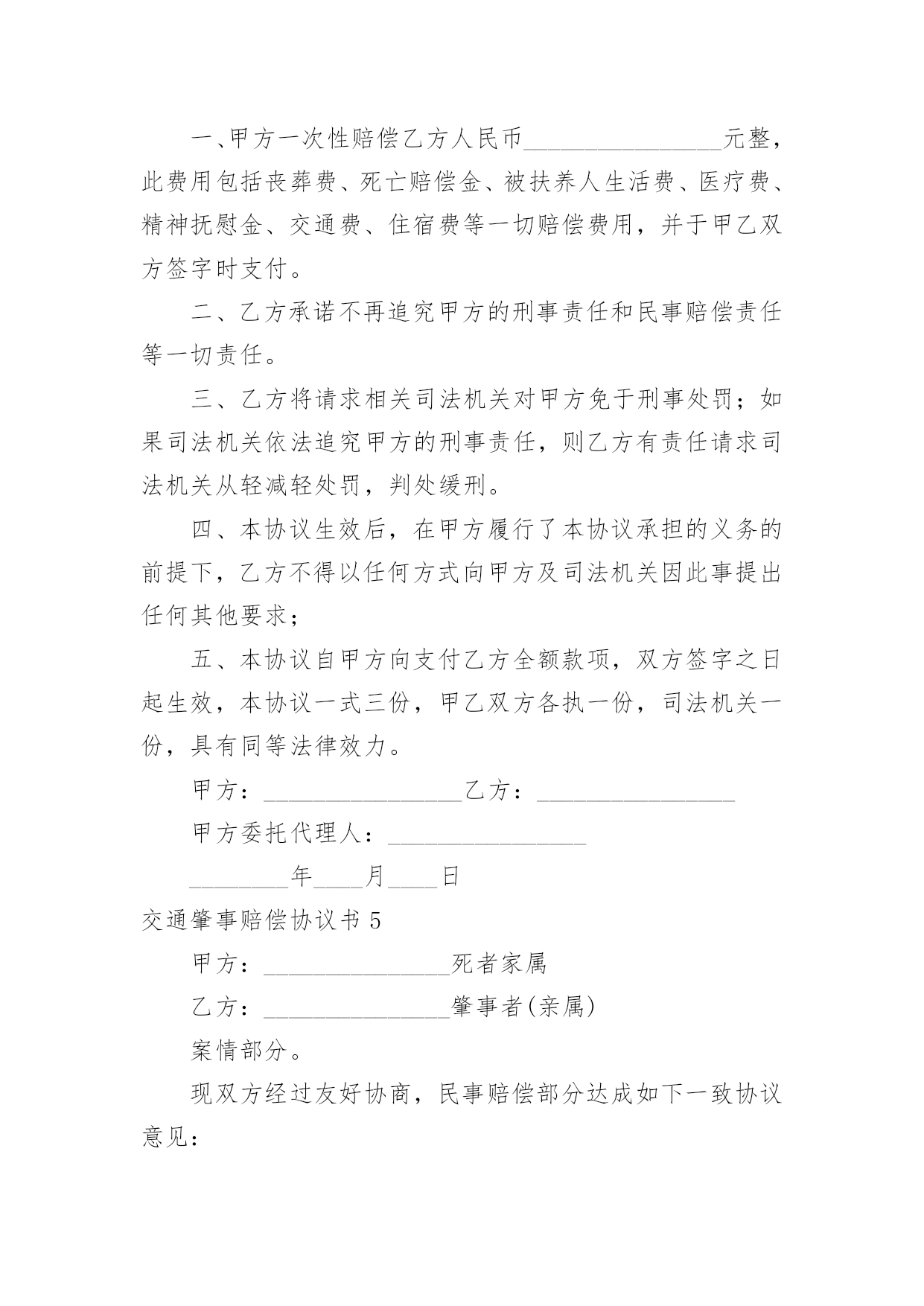 交通肇事赔偿协议书(荐)交通肇事赔偿协议书在不断进步的时代,人们运用到协议的场合不断增多,签订协议是提高经济效益的手段。我们该怎么拟定协议呢?下面是小编帮大家整理的交通肇事赔偿协议书,希望对大家有所帮助。交通肇事赔偿协议书1甲方:________________乙方:__________________________年__________月__________日晚,甲方驾驶一辆白色面包车在大理州__________县__________镇__________村把在路边行走的乙方撞伤,致使乙方左肋骨折断两根。当晚,甲方立即将乙方送至__________县医院紧急救治。住院期间,乙方家人一直陪伴照顾。_________年_____月__________日,乙方治愈出院。现双方友好协商,并经双方家属同意,就该交通事故的`相关赔偿事宜协议如下:一、乙方住院期间已经产生的医疗费用及其他必要费用全部由甲方承担。二、出院后,甲方一次性付给乙方营养费_____________元、误工费_______________元、护理费_____________元、住院伙食补助费_______________元、复查费__________元等费用,合计_________________元。三、以上各项费用一次性付清。自此,甲方的赔偿责任完全消除,乙方自愿承担该事故可能导致的隐形伤害风险,不得再次要求甲方承担该次交通事故有关的任何其它赔偿责任。四、本协议一式三份,双方各持一份,__________交警大队备案一份。甲方:________________乙方:________________日期:________________日期:________________交通肇事赔偿协议书2甲方(肇事方):乙方(受害方):一、交通事故基本情况1、事故经过:年月日,甲方驾驶车辆在将乙方撞伤。甲方将乙方送往医院救治,现人无大碍。现甲乙双方协商如下做为赔偿:1、经双方确认,本次事故造成双方财产损失和人员伤残所需费用情况如下:2、乙方受伤住院治疗医药费、误工费、护理费、伙食补助费、交通费、住宿费、伤残补偿金、后续治疗费等共计¥:(小写):元整,由甲方支付。3、以上费用赔付和签订本合同之日起,甲方不在负责乙方任何费用,日后乙方发生的一切后果,与甲方无关。乙方从此不在追究甲方任何责任。二、本协议自协议各方签字之日起生效。本合同一式两份,签字后生效。甲方(肇事方):乙方(受伤方):年月日交通肇事赔偿协议书3甲方赔偿义务人:姓名、性别、年龄、住址、*********号码,工作单位,系辽AXXXXX车辆驾驶员乙方赔偿义务人:姓名、性别、年龄、住址、*********号码,工作单位,系辽AXXXXX登记车主丙方赔偿权利人:姓名、性别、年龄、住址、*********号码,工作单位,系受害人XXX包括配偶、父母、子女20xx年X月X日,甲方XXX驾驶辽AXXXX号XX牌轿车行驶至XXX路段XX公里处与受害人XXX发生碰撞,至受害人XXX当场死亡的后果。本起事故经沈阳市公安局沈北新区交警大队认定,在此次交通事故中车辆方负事故的全部责任;现辽AXXXX号车辆驾驶员被刑事拘留。经依法查明,辽AXXXX车在交管部门登记的实际车主为乙方XXX,该车在XXX保险公司XX支公司投保了交通事故强制保险。甲乙丙三方在平等、自愿的'基础,依据《中华人民道路交通安全法》、《道路负事故处理办法》、《道路交通事故处理程序规定》、《最高人民法院关于胜利人身损害赔偿若干问题解释》的规定,经沈阳市公安局沈北新区交警大队的见证下,就事故所造成的赔偿造成调解协议如下:一、甲方和乙方自愿一次性赔偿丙方各种法定人身损害赔偿项目以及财产损失项目共计万元小写:元整。二、丙方同意接收上述赔偿款项,并放弃对甲方、乙方的其他一切权利,不再要求乙甲方、乙方进行任何形式的赔偿或承担其他任何责任。若丙方及丙方的其他利害关系人再向甲、乙两方提任何要求,由甲方负责处理解决。三、本协议签订后,为方便甲方和乙方进行保险理赔,甲、乙、丙三方均同意互相配合;四、鉴于甲方被追究刑事责任已经不能避免,故甲方和乙方应在本协议生效之日向丙方支付赔偿金元,剩余款项元,甲方和乙方应于法院出具判决书并宣告甲方XX缓刑之日全部付清。五、丙方对甲方的违法行为表示谅解,保证不再要求司法部门追究乙方的任何行政、刑事责任,并保证在必要时配合乙方向司法机关等有关部门说明本协议的情况,出具相关文件或证明。六、丙方保证不再要求甲方、乙方或保险公司赔偿超过本协议赔偿数额以外的任何赔偿。因本事故产生车辆保险的赔付,由甲方和乙方进行理赔或索赔,保险赔付款项全部归甲方和乙方所有。七、丙方保证本协议合法有效,保证没有其他权利人就此事故再向甲方和乙方主张权利,若本协议被确认无效,丙方应将已
