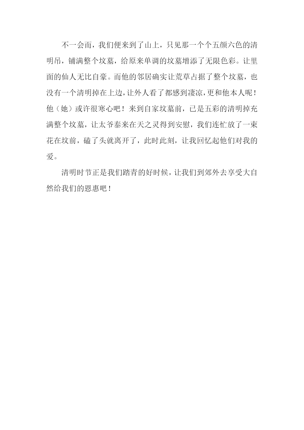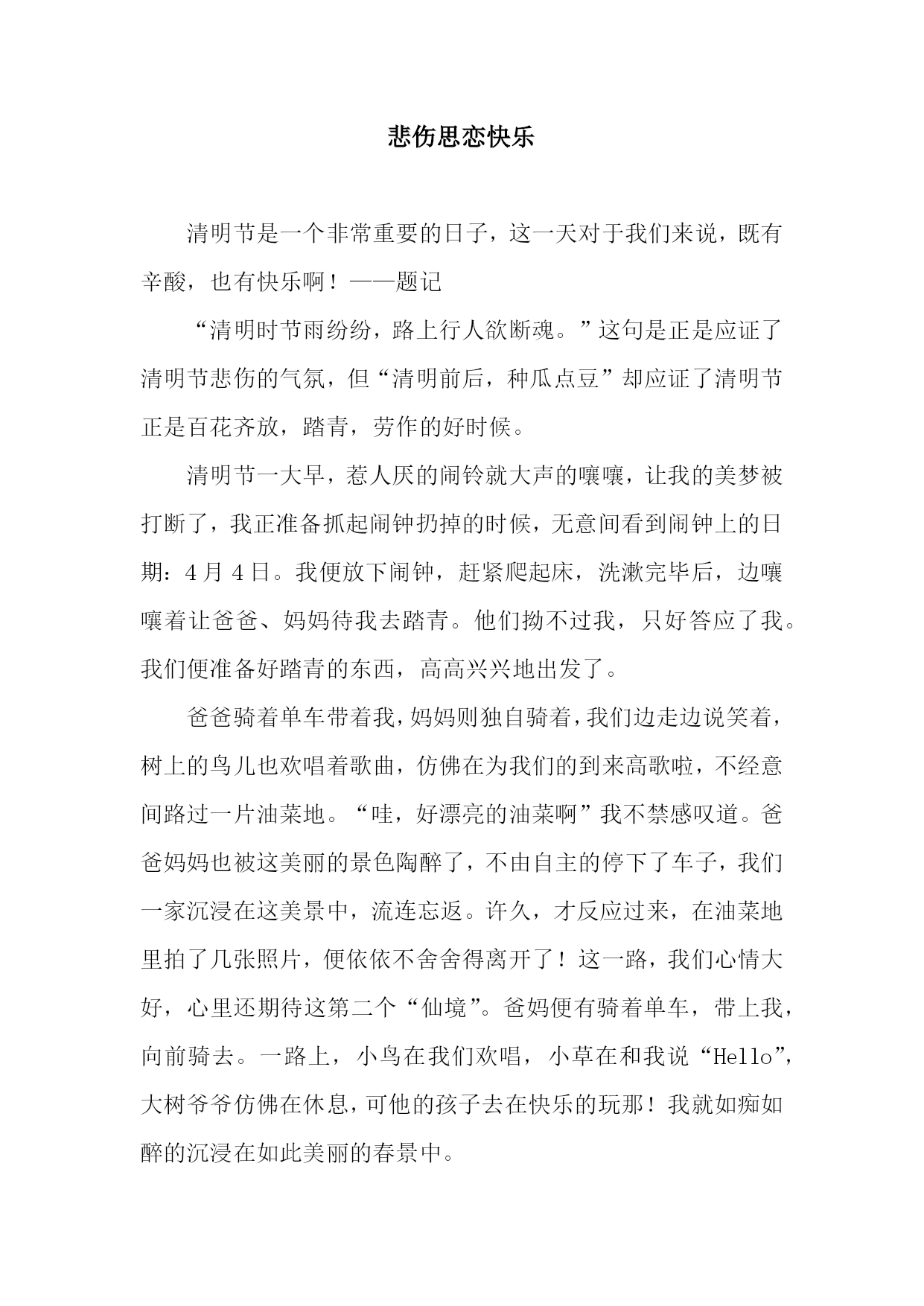 悲伤思恋快乐清明节是一个非常重要的日子,这一天对于我们来说,既有辛酸,也有快乐啊!——题记“清明时节雨纷纷,路上行人欲断魂。”这句是正是应证了清明节悲伤的气氛,但“清明前后,种瓜点豆”却应证了清明节正是百花齐放,踏青,劳作的好时候。清明节一大早,惹人厌的闹铃就大声的嚷嚷,让我的美梦被打断了,我正准备抓起闹钟扔掉的时候,无意间看到闹钟上的日期:4月4日。我便放下闹钟,赶紧爬起床,洗漱完毕后,边嚷嚷着让爸爸、妈妈待我去踏青。他们拗不过我,只好答应了我。我们便准备好踏青的东西,高高兴兴地出发了。爸爸骑着单车带着我,妈妈则独自骑着,我们边走边说笑着,树上的鸟儿也欢唱着歌曲,仿佛在为我们的到来高歌啦,不经意间路过一片油菜地。“哇,好漂亮的油菜啊”我不禁感叹道。爸爸妈妈也被这美丽的景色陶醉了,不由自主的停下了车子,我们一家沉浸在这美景中,流连忘返。许久,才反应过来,在油菜地里拍了几张照片,便依依不舍舍得离开了!这一路,我们心情大好,心里还期待这第二个“仙境”。爸妈便有骑着单车,带上我,向前骑去。一路上,小鸟在我们欢唱,小草在和我说“Hello”,大树爷爷仿佛在休息,可他的孩子去在快乐的玩那!我就如痴如醉的沉浸在如此美丽的春景中。不一会而,我们便来到了山上,只见那一个个五颜六色的清明吊,铺满整个坟墓,给原来单调的坟墓增添了无限色彩。让里面的仙人无比自豪。而他的邻居确实让荒草占据了整个坟墓,也没有一个清明掉在上边,让外人看了都感到凄凉,更和他本人呢!他(她)或许很寒心吧!来到自家坟墓前,已是五彩的清明掉充满整个坟墓,让太爷泰来在天之灵得到安慰,我们连忙放了一束花在坟前,磕了头就离开了,此时此刻,让我回忆起他们对我的爱。清明时节正是我们踏青的好时候,让我们到郊外去享受大自然给我们的恩惠吧!