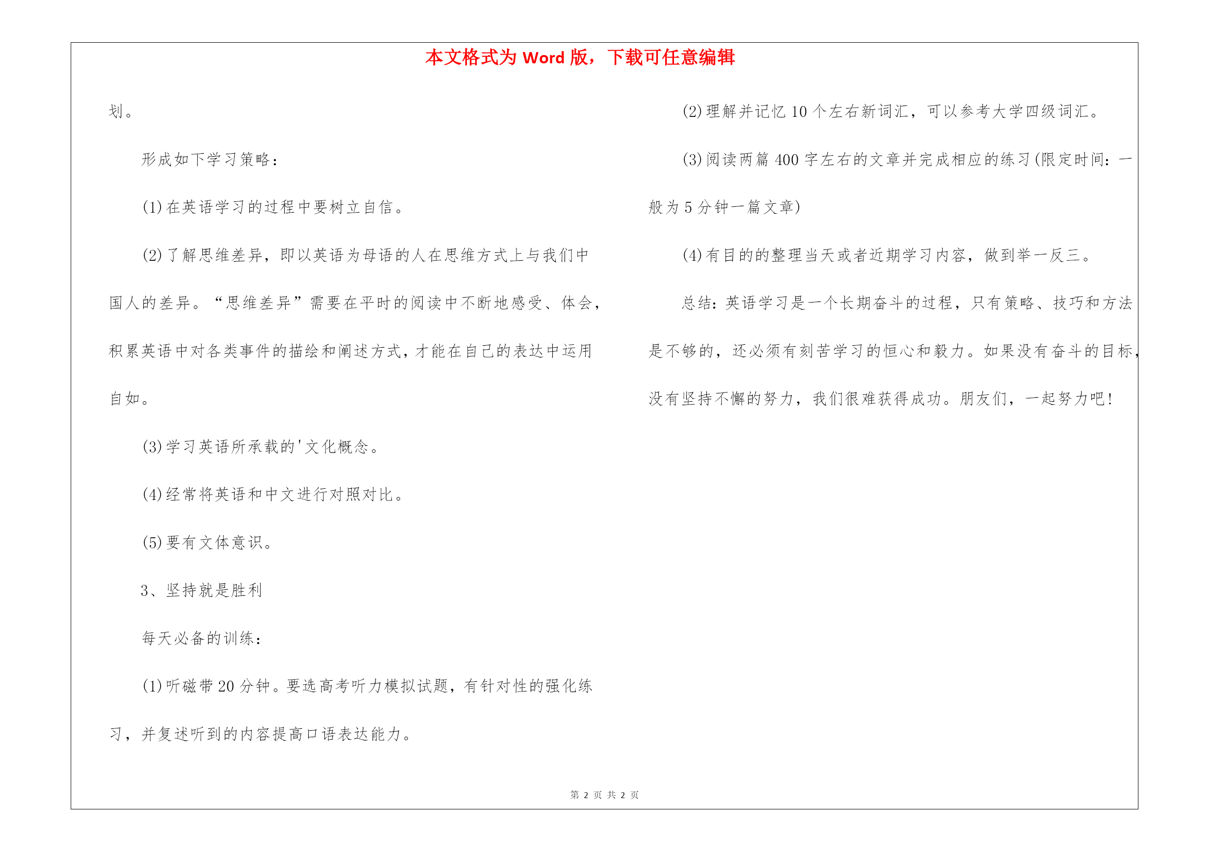 本文格式为Word版,下载可任意编辑第PAGE\*MERGEFORMAT2页共NUMPAGES\*MERGEFORMAT2页高考英语每日学习计划高考英语每日学习计划学习计划1、目标定位(1)选择一个目标进行突破。经过对学习效率低的原因分析,找出自己的症结所在。首先选择其中较为可行的一项进行重点突破。某些学生在接受长辈一顿训斥后,立即制定一个宏大的学习计划,其实这种计划十有八九是执行不下去的,要根据自己的实际情况,从某一方面进行突破。(2)实行新的学习程序。如果你的症结是行为拖拉,为克服这个缺点你就应该给自己订一个规则,每天不完成预订的任务不睡觉;如果原因是对英语不感兴趣,则首先努力去改变单调枯燥的学习方法,将英语学习与工作、娱乐、陶冶性情结合起来,坚持一段时间后,随着良好习惯的形成,学习兴趣就会逐渐浓厚。2、行成一些好的习惯和学习策略要尽可能的形成如下学习习惯:(1)养成提问的好习惯。它不仅有助于语言学习,也是个人成长的好习惯;(2)学习时要经常准备好学习的工具,如字典、软件、记录本等,将不明白的地方随时记录下来或者直接进行查阅。(3)将经常出错的地方记录在一个小本上,不断温习巩固,并避免重复犯错;将朗读作为每天早晨起来以后的一个习惯动作(4)分阶段录下自己朗读的声音文件,保存起来,以后在不同的阶段放给自己听听,看看是不是有明显的进步。(5)挑选语言优美的经典名片作为背诵的对象。不要光为了背诵而背诵,将语音的练习、内容的欣赏、单词的记忆、句型的巩固、语感的培养有意无意地作为背诵的目的。(6)将复习作为学习的一个重要过程,制定一些学习和复习的计划。形成如下学习策略:(1)在英语学习的过程中要树立自信。(2)了解思维差异,即以英语为母语的人在思维方式上与我们中国人的差异。“思维差异”需要在平时的阅读中不断地感受、体会,积累英语中对各类事件的描绘和阐述方式,才能在自己的表达中运用自如。(3)学习英语所承载的'文化概念。(4)经常将英语和中文进行对照对比。(5)要有文体意识。3、坚持就是胜利每天必备的训练:(1)听磁带20分钟。要选高考听力模拟试题,有针对性的强化练习,并复述听到的内容提高口语表达能力。(2)理解并记忆10个左右新词汇,可以参考大学四级词汇。(3)阅读两篇400字左右的文章并完成相应的练习(限定时间:一般为5分钟一篇文章)(4)有目的的整理当天或者近期学习内容,做到举一反三。总结:英语学习是一个长期奋斗的过程,只有策略、技巧和方法是不够的,还必须有刻苦学习的恒心和毅力。如果没有奋斗的目标,没有坚持不懈的努力,我们很难获得成功。朋友们,一起努力吧!