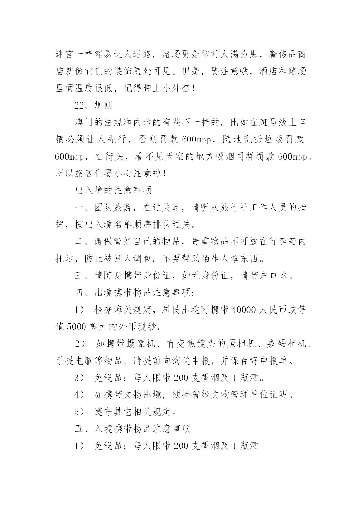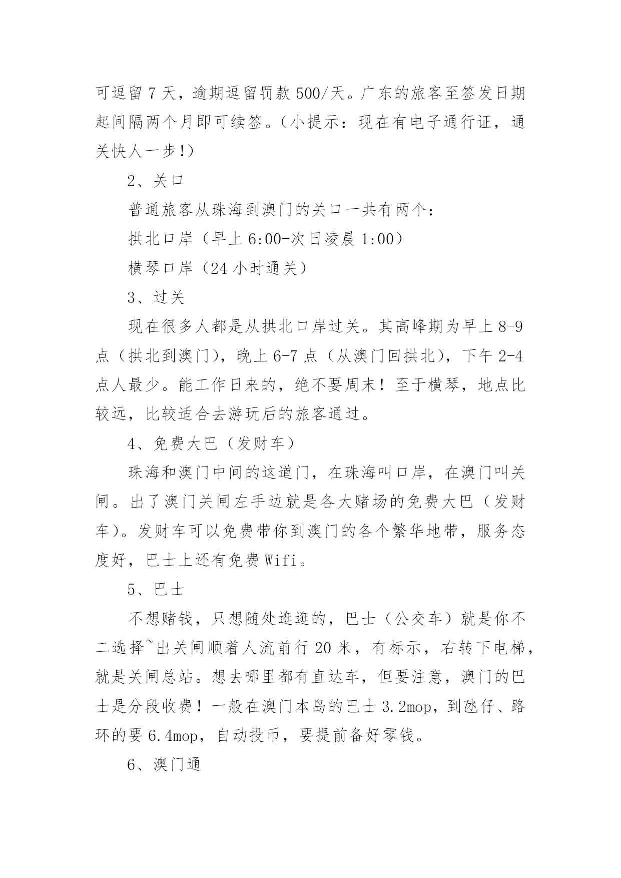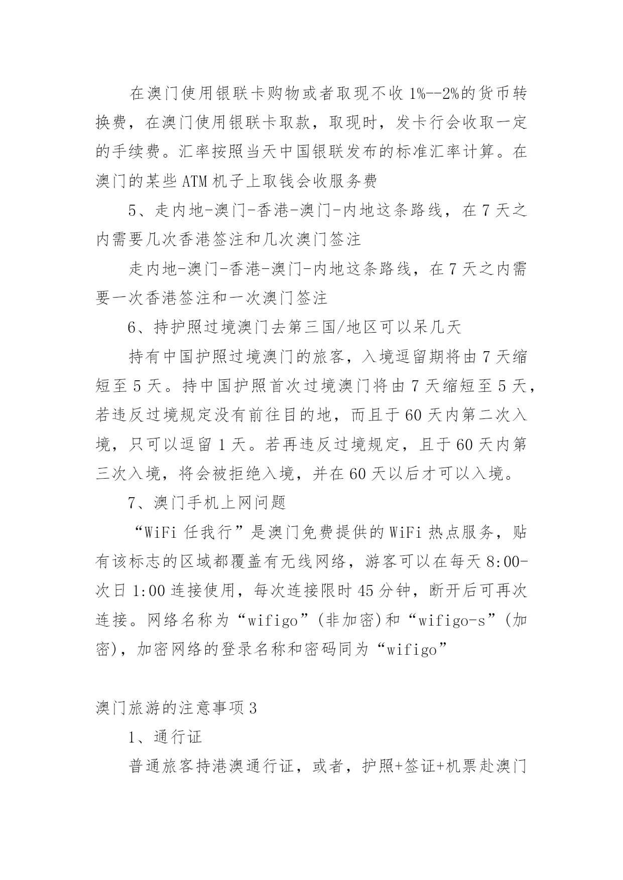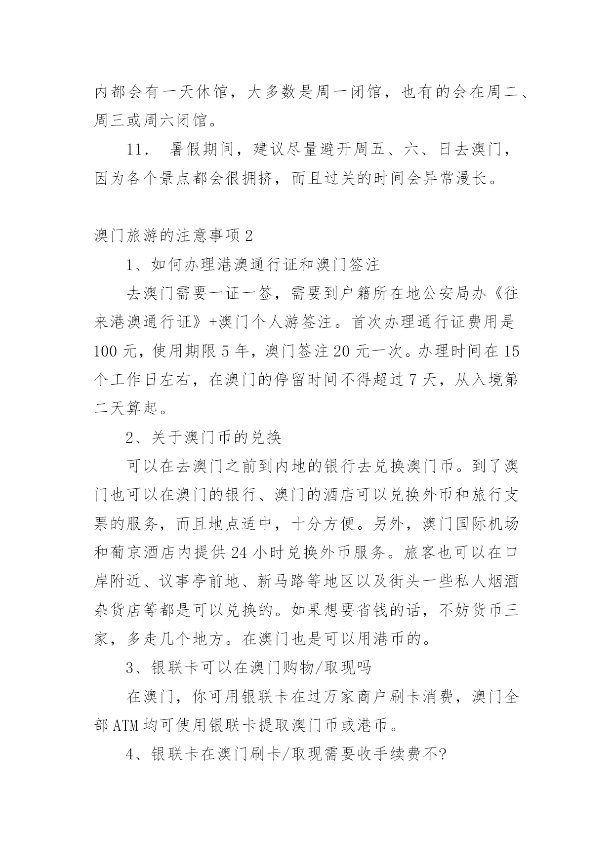 澳门旅游的注意事项澳门旅游的注意事项澳门旅游的注意事项1澳门是一个自由港,也是世界四大赌城之一。在澳门这块宝地,其中美食、酒店、购物、景点等早为人所知,下面给大家介绍一下澳门旅游注意事项。1.在澳门的公众假日期间,多数茶餐厅都关门休息,照常营业的餐厅会加收10%-20%的服务费。2.澳门治安良好,一般不会出现问题,但不建议深夜在赌场门口走动。3.澳门的饮食和气候容易上火,可以购买当地的凉茶。4.澳门的插座与内陆地区不同,记得携带转换器。5.入境澳门时,可能要在入境大厅等很久。6.澳门路牌很有特色,都是瓷片做的,路面的瓷砖也铺成各式花样,稍加留意就能看到很多款式。7.澳门本岛因为巷道狭窄且单行道多,有时打车会感觉出租车司机在绕路,所以有些地方用步行可能会更快。8.大三巴的背面搭有楼梯可以登上去,但女性游客不要穿短裙上去,以免走光。9.各个娱乐场内都提供免费的饮料,可以随意拿来喝。10.澳门有许多博物馆,不过几乎所有博物馆在一周内都会有一天休馆,大多数是周一闭馆,也有的会在周二、周三或周六闭馆。11.暑假期间,建议尽量避开周五、六、日去澳门,因为各个景点都会很拥挤,而且过关的时间会异常漫长。澳门旅游的注意事项21、如何办理港澳通行证和澳门签注去澳门需要一证一签,需要到户籍所在地公安局办《往来港澳通行证》+澳门个人游签注。首次办理通行证费用是100元,使用期限5年,澳门签注20元一次。办理时间在15个工作日左右,在澳门的停留时间不得超过7天,从入境第二天算起。2、关于澳门币的兑换可以在去澳门之前到内地的银行去兑换澳门币。到了澳门也可以在澳门的银行、澳门的酒店可以兑换外币和旅行支票的服务,而且地点适中,十分方便。另外,澳门国际机场和葡京酒店内提供24小时兑换外币服务。旅客也可以在口岸附近、议事亭前地、新马路等地区以及街头一些私人烟酒杂货店等都是可以兑换的。如果想要省钱的话,不妨货币三家,多走几个地方。在澳门也是可以用港币的。3、银联卡可以在澳门购物/取现吗在澳门,你可用银联卡在过万家商户刷卡消费,澳门全部ATM均可使用银联卡提取澳门币或港币。4、银联卡在澳门刷卡/取现需要收手续费不?在澳门使用银联卡购物或者取现不收1%--2%的货币转换费,在澳门使用银联卡取款,取现时,发卡行会收取一定的手续费。汇率按照当天中国银联发布的标准汇率计算。在澳门的某些ATM机子上取钱会收服务费5、走内地-澳门-香港-澳门-内地这条路线,在7天之内需要几次香港签注和几次澳门签注走内地-澳门-香港-澳门-内地这条路线,在7天之内需要一次香港签注和一次澳门签注6、持护照过境澳门去第三国/地区可以呆几天持有中国护照过境澳门的旅客,入境逗留期将由7天缩短至5天。持中国护照首次过境澳门将由7天缩短至5天,若违反过境规定没有前往目的地,而且于60天内第二次入境,只可以逗留1天。若再违反过境规定,且于60天内第三次入境,将会被拒绝入境,并在60天以后才可以入境。7、澳门手机上网问题“WiFi任我行”是澳门免费提供的WiFi热点服务,贴有该标志的区域都覆盖有无线网络,游客可以在每天8:00-次日1:00连接使用,每次连接限时45分钟,断开后可再次连接。网络名称为“wifigo”(非加密)和“wifigo-s”(加密),加密网络的登录名称和密码同为“wifigo”澳门旅游的注意事项31、通行证普通旅客持港澳通行证,或者,护照+签证+机票赴澳门可逗留7天,逾期逗留罚款500/天。广东的旅客至签发日期起间隔两个月即可续签。(小提示:现在有电子通行证,通关快人一步!)2、关口普通旅客从珠海到澳门的关口一共有两个:拱北口岸(早上6:00-次日凌晨1:00)横琴口岸(24小时通关)3、过关现在很多人都是从拱北口岸过关。其高峰期为早上8-9点(拱北到澳门),晚上6-7点(从澳门回拱北),下午2-4点人最少。能工作日来的,绝不要周末!至于横琴,地点比较远,比较适合去游玩后的旅客通过。4、免费大巴(发财车)珠海和澳门中间的这道门,在珠海叫口岸,在澳门叫关闸。出了澳门关闸左手边就是各大赌场的免费大巴(发财车)。发财车可以免费带你到澳门的各个繁华地带,服务态度好,巴士上还有免费Wifi。5、巴士不想赌钱,只想随处逛逛的,巴士(公交车)就是你不二选择~出关闸顺着人流前行20米,有标示,右转下电梯,就是关闸总站。想去哪里都有直达车,但要注意,澳门的巴士是分段收费!一般在澳门本岛的巴士3.2mop,到氹仔、路环的要6.4mop,自动投币,要提前备好零钱。6、澳门通如果觉得准备零钱比较麻烦,可以在便利店买张澳门通,押金30,充值一次最少50。是“一人一卡”使用,1小时内有一次免费换乘。但是一年只来一两次澳门的旅客们,还是坐发财车或者找零钱比较好!7、的士澳门的的士计费较高,行李费、过桥费加起来,真是