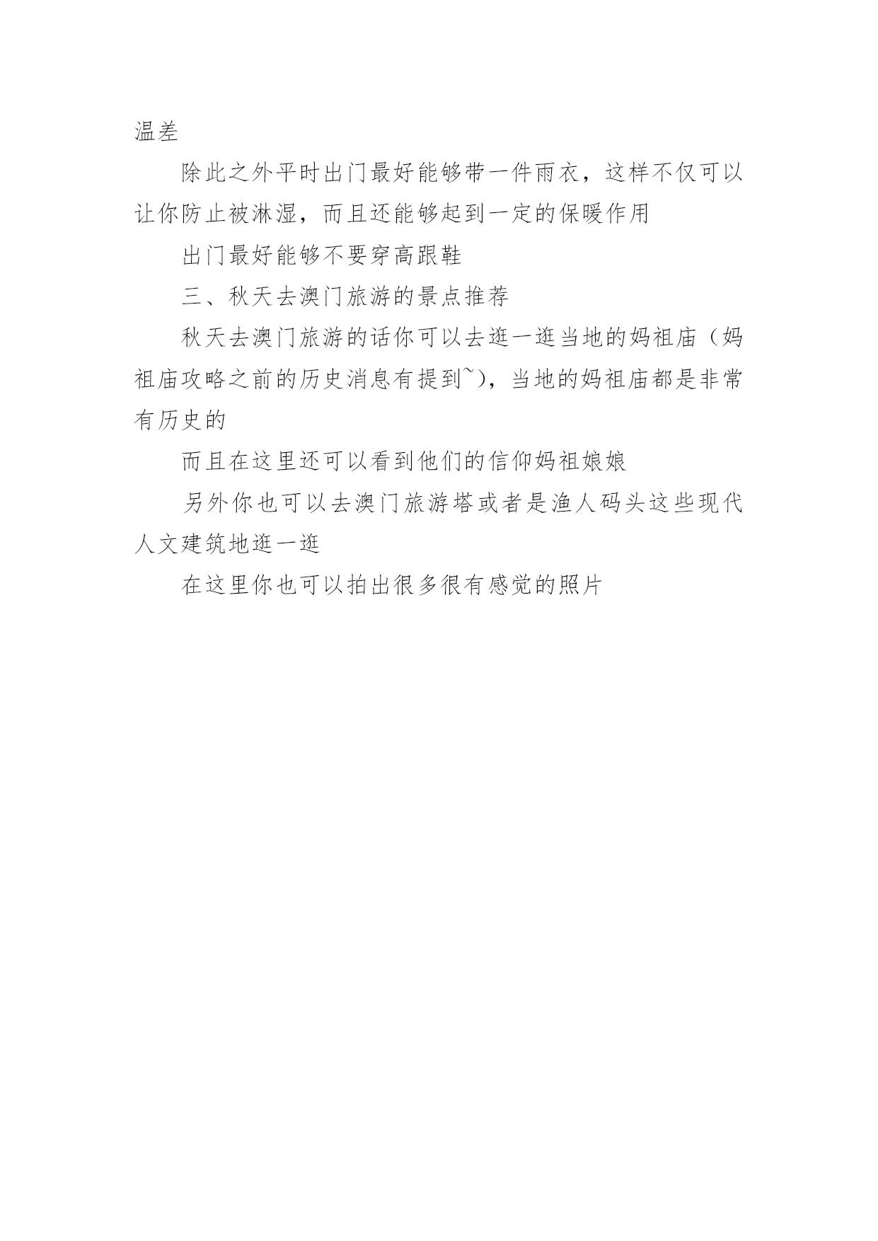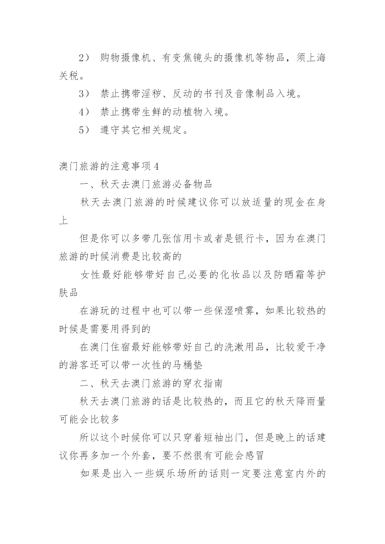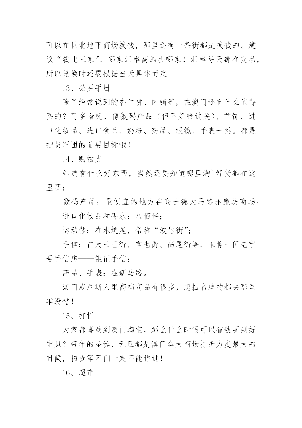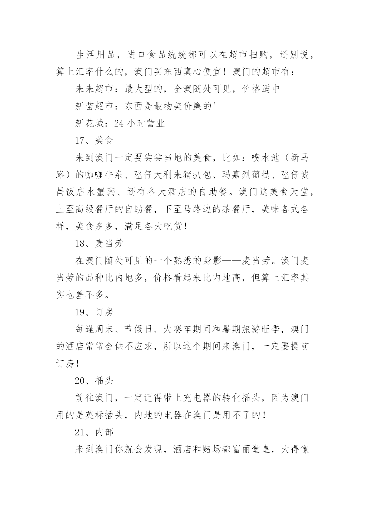 澳门旅游的注意事项澳门旅游的注意事项澳门旅游的注意事项1澳门是一个自由港,也是世界四大赌城之一。在澳门这块宝地,其中美食、酒店、购物、景点等早为人所知,下面给大家介绍一下澳门旅游注意事项。1.在澳门的公众假日期间,多数茶餐厅都关门休息,照常营业的餐厅会加收10%-20%的服务费。2.澳门治安良好,一般不会出现问题,但不建议深夜在赌场门口走动。3.澳门的饮食和气候容易上火,可以购买当地的凉茶。4.澳门的插座与内陆地区不同,记得携带转换器。5.入境澳门时,可能要在入境大厅等很久。6.澳门路牌很有特色,都是瓷片做的,路面的瓷砖也铺成各式花样,稍加留意就能看到很多款式。7.澳门本岛因为巷道狭窄且单行道多,有时打车会感觉出租车司机在绕路,所以有些地方用步行可能会更快。8.大三巴的背面搭有楼梯可以登上去,但女性游客不要穿短裙上去,以免走光。9.各个娱乐场内都提供免费的饮料,可以随意拿来喝。10.澳门有许多博物馆,不过几乎所有博物馆在一周内都会有一天休馆,大多数是周一闭馆,也有的会在周二、周三或周六闭馆。11.暑假期间,建议尽量避开周五、六、日去澳门,因为各个景点都会很拥挤,而且过关的时间会异常漫长。澳门旅游的注意事项21、如何办理港澳通行证和澳门签注去澳门需要一证一签,需要到户籍所在地公安局办《往来港澳通行证》+澳门个人游签注。首次办理通行证费用是100元,使用期限5年,澳门签注20元一次。办理时间在15个工作日左右,在澳门的停留时间不得超过7天,从入境第二天算起。2、关于澳门币的兑换可以在去澳门之前到内地的银行去兑换澳门币。到了澳门也可以在澳门的银行、澳门的酒店可以兑换外币和旅行支票的服务,而且地点适中,十分方便。另外,澳门国际机场和葡京酒店内提供24小时兑换外币服务。旅客也可以在口岸附近、议事亭前地、新马路等地区以及街头一些私人烟酒杂货店等都是可以兑换的。如果想要省钱的话,不妨货币三家,多走几个地方。在澳门也是可以用港币的。3、银联卡可以在澳门购物/取现吗在澳门,你可用银联卡在过万家商户刷卡消费,澳门全部ATM均可使用银联卡提取澳门币或港币。4、银联卡在澳门刷卡/取现需要收手续费不?在澳门使用银联卡购物或者取现不收1%--2%的货币转换费,在澳门使用银联卡取款,取现时,发卡行会收取一定的手续费。汇率按照当天中国银联发布的标准汇率计算。在澳门的某些ATM机子上取钱会收服务费5、走内地-澳门-香港-澳门-内地这条路线,在7天之内需要几次香港签注和几次澳门签注走内地-澳门-香港-澳门-内地这条路线,在7天之内需要一次香港签注和一次澳门签注6、持护照过境澳门去第三国/地区可以呆几天持有中国护照过境澳门的旅客,入境逗留期将由7天缩短至5天。持中国护照首次过境澳门将由7天缩短至5天,若违反过境规定没有前往目的地,而且于60天内第二次入境,只可以逗留1天。若再违反过境规定,且于60天内第三次入境,将会被拒绝入境,并在60天以后才可以入境。7、澳门手机上网问题“WiFi任我行”是澳门免费提供的WiFi热点服务,贴有该标志的区域都覆盖有无线网络,游客可以在每天8:00-次日1:00连接使用,每次连接限时45分钟,断开后可再次连接。网络名称为“wifigo”(非加密)和“wifigo-s”(加密),加密网络的登录名称和密码同为“wifigo”澳门旅游的注意事项31、通行证普通旅客持港澳通行证,或者,护照+签证+机票赴澳门可逗留7天,逾期逗留罚款500/天。广东的旅客至签发日期起间隔两个月即可续签。(小提示:现在有电子通行证,通关快人一步!)2、关口普通旅客从珠海到澳门的关口一共有两个:拱北口岸(早上6:00-次日凌晨1:00)横琴口岸(24小时通关)3、过关现在很多人都是从拱北口岸过关。其高峰期为早上8-9点(拱北到澳门),晚上6-7点(从澳门回拱北),下午2-4点人最少。能工作日来的,绝不要周末!至于横琴,地点比较远,比较适合去游玩后的旅客通过。4、免费大巴(发财车)珠海和澳门中间的这道门,在珠海叫口岸,在澳门叫关闸。出了澳门关闸左手边就是各大赌场的免费大巴(发财车)。发财车可以免费带你到澳门的各个繁华地带,服务态度好,巴士上还有免费Wifi。5、巴士不想赌钱,只想随处逛逛的,巴士(公交车)就是你不二选择~出关闸顺着人流前行20米,有标示,右转下电梯,就是关闸总站。想去哪里都有直达车,但要注意,澳门的巴士是分段收费!一般在澳门本岛的巴士3.2mop,到氹仔、路环的要6.4mop,自动投币,要提前备好零钱。6、澳门通如果觉得准备零钱比较麻烦,可以在便利店买张澳门通,押金30,充值一次最少50。是“一人一卡”使用,1小时内有一次免费换乘。但是一年只来一两次澳门的旅客们,还是坐发财车或者找零钱比较好!7、的士澳门的的士计费较高,行李费、过桥费加起来,真是