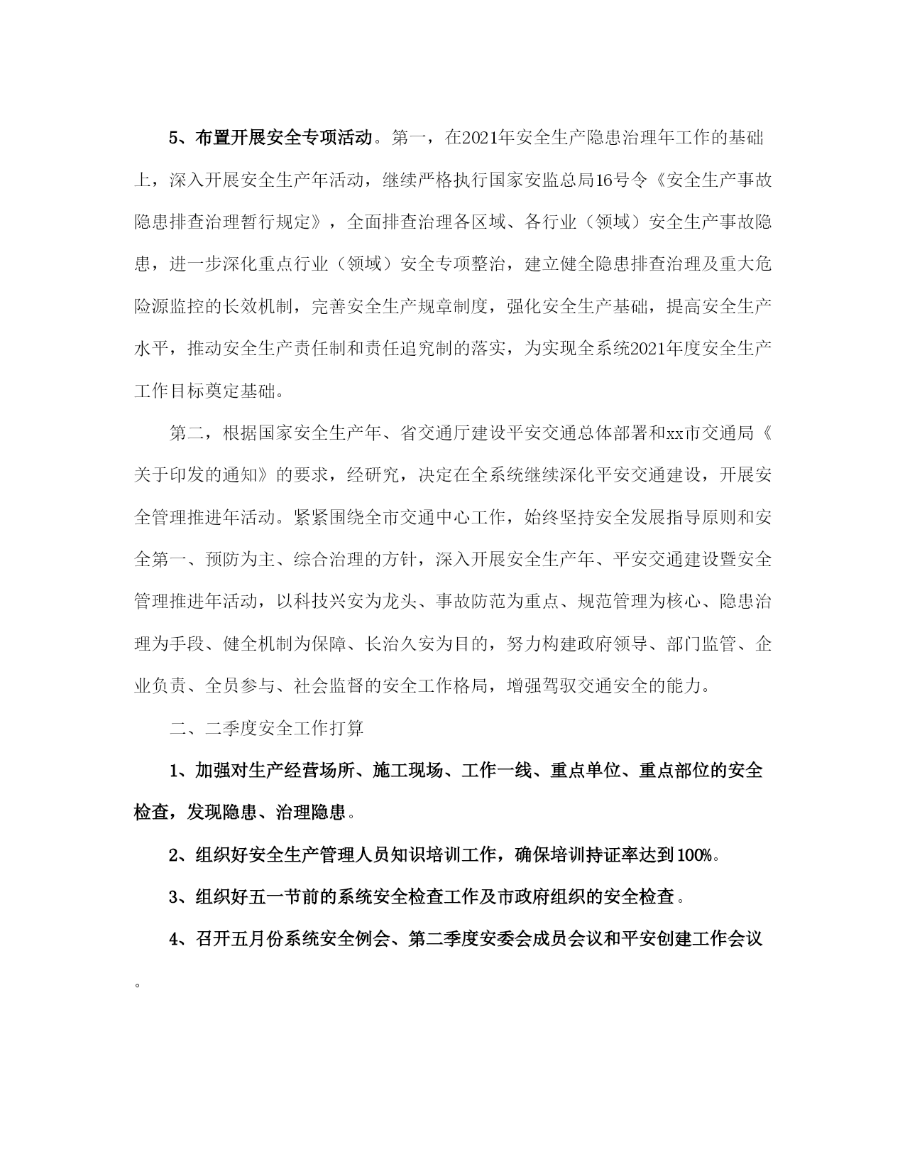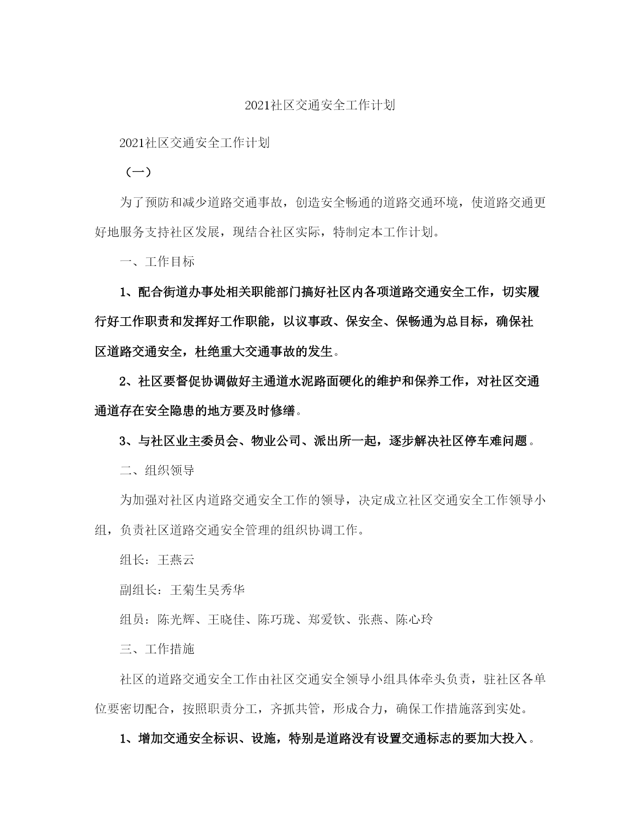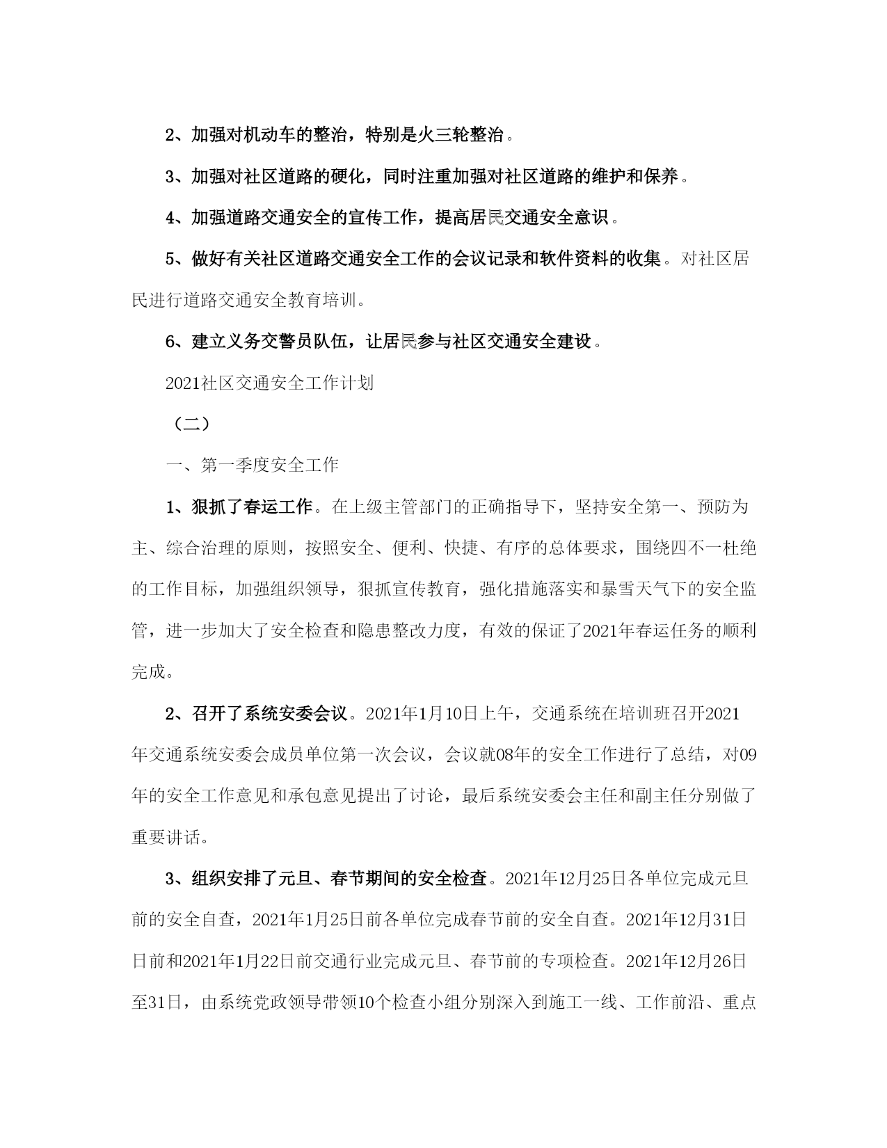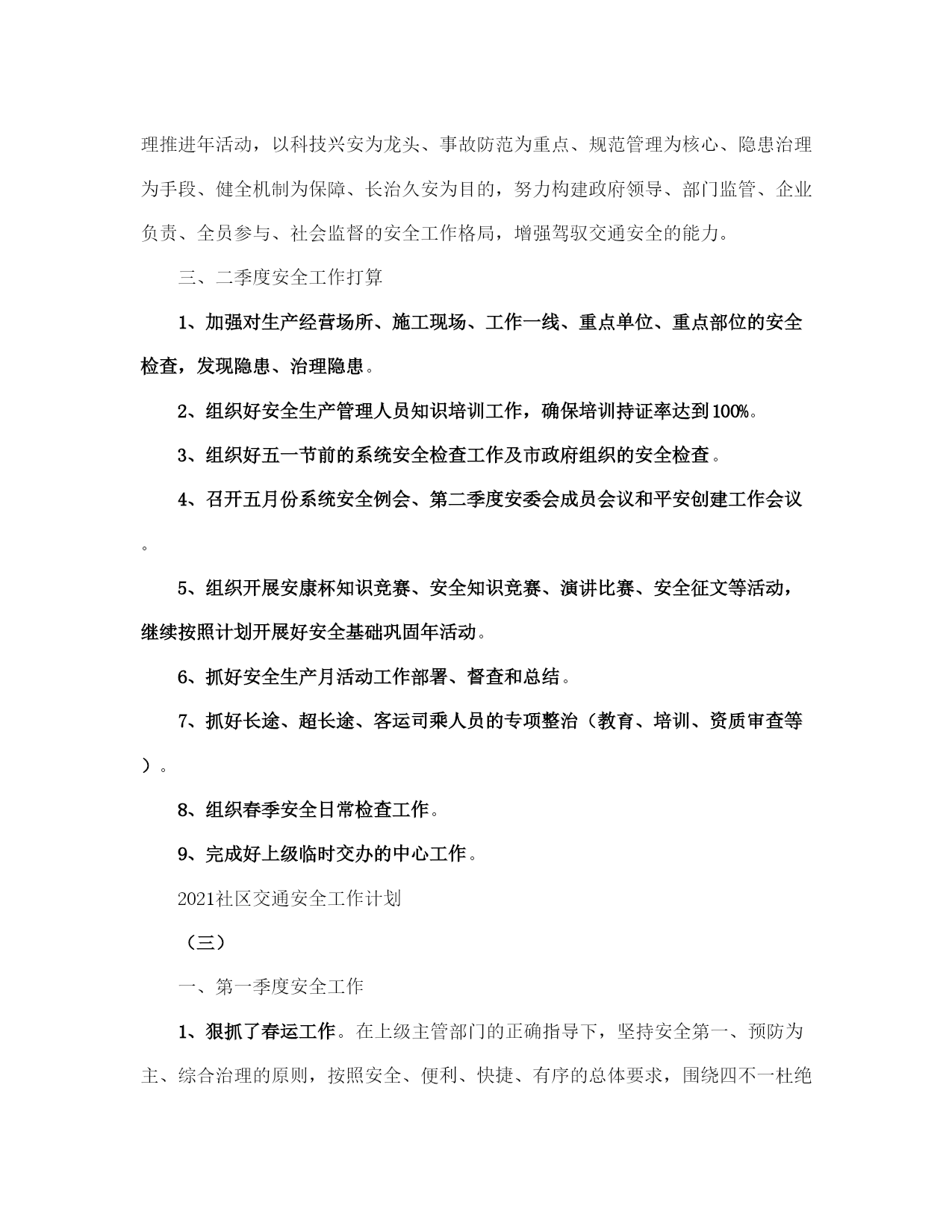 社区交通安全工作计划(完整版)文档资料可直接使用,可编辑,欢迎下载2021社区交通安全工作计划2021社区交通安全工作计划(一)为了预防和减少道路交通事故,创造安全畅通的道路交通环境,使道路交通更好地服务支持社区发展,现结合社区实际,特制定本工作计划。一、工作目标1、配合街道办事处相关职能部门搞好社区内各项道路交通安全工作,切实履行好工作职责和发挥好工作职能,以议事政、保安全、保畅通为总目标,确保社区道路交通安全,杜绝重大交通事故的发生。2、社区要督促协调做好主通道水泥路面硬化的维护和保养工作,对社区交通通道存在安全隐患的地方要及时修缮。3、与社区业主委员会、物业公司、派出所一起,逐步解决社区停车难问题。二、组织领导为加强对社区内道路交通安全工作的领导,决定成立社区交通安全工作领导小组,负责社区道路交通安全管理的组织协调工作。组长:王燕云副组长:王菊生吴秀华组员:陈光辉、王晓佳、陈巧珑、郑爱钦、张燕、陈心玲三、工作措施社区的道路交通安全工作由社区交通安全领导小组具体牵头负责,驻社区各单位要密切配合,按照职责分工,齐抓共管,形成合力,确保工作措施落到实处。1、增加交通安全标识、设施,特别是道路没有设置交通标志的要加大投入。2、加强对机动车的整治,特别是火三轮整治。3、加强对社区道路的硬化,同时注重加强对社区道路的维护和保养。4、加强道路交通安全的宣传工作,提高居民交通安全意识。5、做好有关社区道路交通安全工作的会议记录和软件资料的收集。对社区居民进行道路交通安全教育培训。6、建立义务交警员队伍,让居民参与社区交通安全建设。2021社区交通安全工作计划(二)一、第一季度安全工作1、狠抓了春运工作。在上级主管部门的正确指导下,坚持安全第一、预防为主、综合治理的原则,按照安全、便利、快捷、有序的总体要求,围绕四不一杜绝的工作目标,加强组织领导,狠抓宣传教育,强化措施落实和暴雪天气下的安全监管,进一步加大了安全检查和隐患整改力度,有效的保证了2021年春运任务的顺利完成。2、召开了系统安委会议。2021年1月10日上午,交通系统在培训班召开2021年交通系统安委会成员单位第一次会议,会议就08年的安全工作进行了总结,对09年的安全工作意见和承包意见提出了讨论,最后系统安委会主任和副主任分别做了重要讲话。3、组织安排了元旦、春节期间的安全检查。2021年12月25日各单位完成元旦前的安全自查,2021年1月25日前各单位完成春节前的安全自查。2021年12月31日日前和2021年1月22日前交通行业完成元旦、春节前的专项检查。2021年12月26日至31日,由系统党政领导带领10个检查小组分别深入到施工一线、工作前沿、重点部位、重要岗位进行了全面、深入、细致的安全督查。总体而言,各单位都能坚持安全第一、预防为主、综合治理的方针,大力开展各项安全活动。责任明确、管理规范、整改迅速,记录较为全面,活动较为经常,领导较为重视,成绩较为明显,资料较为规范、齐全;安全形势较为稳定。4、狠抓了责任制的落实。进一步建立健全安全制度、强化安全措施落实、加强安全教育培训,切实做好企业内部的安全管理工作,确保年度安全工作目标的实现,经交通系统党委、安委会研究决定,2021年继续与系统有关单位签订安全工作目标风险抵押承包责任书。风险抵押金额,按照企业规模大小,安全风险系数,安全管理工作难度,在册职工总数等因素,确定标准,相关单位已在规定的时间内向局补缴了2021年安全风险抵押金,总金额4,5000元。各单位内部党政工负责人也层层签订了责任书。5、布置开展安全专项活动。第一,在2021年安全生产隐患治理年工作的基础上,深入开展安全生产年活动,继续严格执行国家安监总局16号令《安全生产事故隐患排查治理暂行规定》,全面排查治理各区域、各行业(领域)安全生产事故隐患,进一步深化重点行业(领域)安全专项整治,建立健全隐患排查治理及重大危险源监控的长效机制,完善安全生产规章制度,强化安全生产基础,提高安全生产水平,推动安全生产责任制和责任追究制的落实,为实现全系统2021年度安全生产工作目标奠定基础。二、根据国家安全生产年、省交通厅建设平安交通总体部署和xx市交通局《关于印发的通知》的要求,经研究,决定在全系统继续深化平安交通建设,开展安全管理推进年活动。紧紧围绕全市交通中心工作,始终坚持安全发展指导原则和安全第一、预防为主、综合治理的方针,深入开展安全生产年、平安交通建设暨安全管理推进年活动,以科技兴安为龙头、事故防范为重点、规范管理为核心、隐患治理为手段、健全机制为保障、长治久安为目的,努力构建政府领导、部门监管、企业负责、全员参与、社会监督的安全工作格局,增强驾驭交通安全的能力。三、二季度安全工作打算