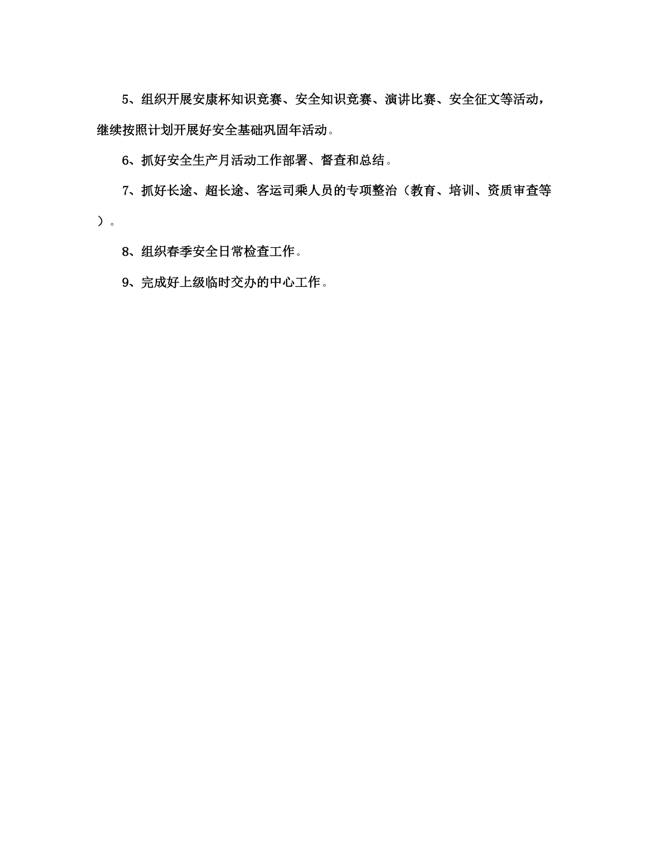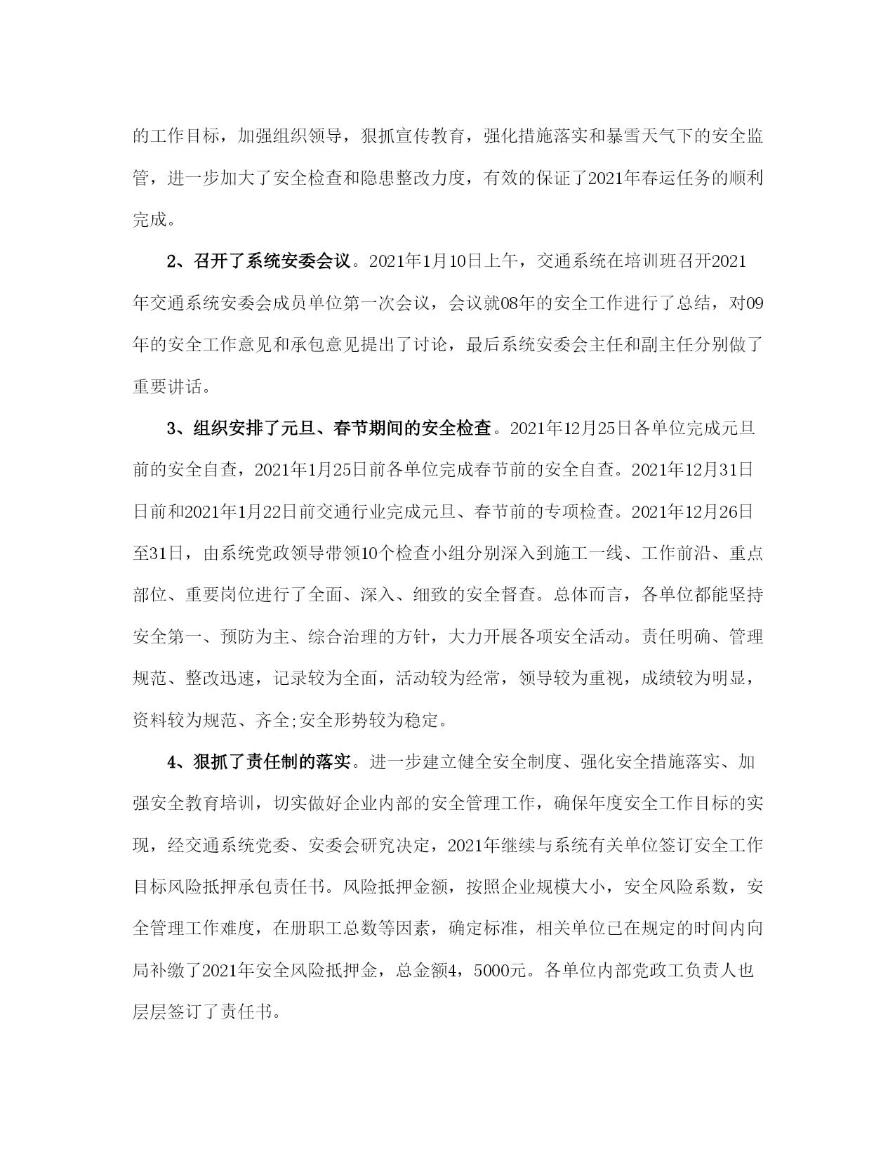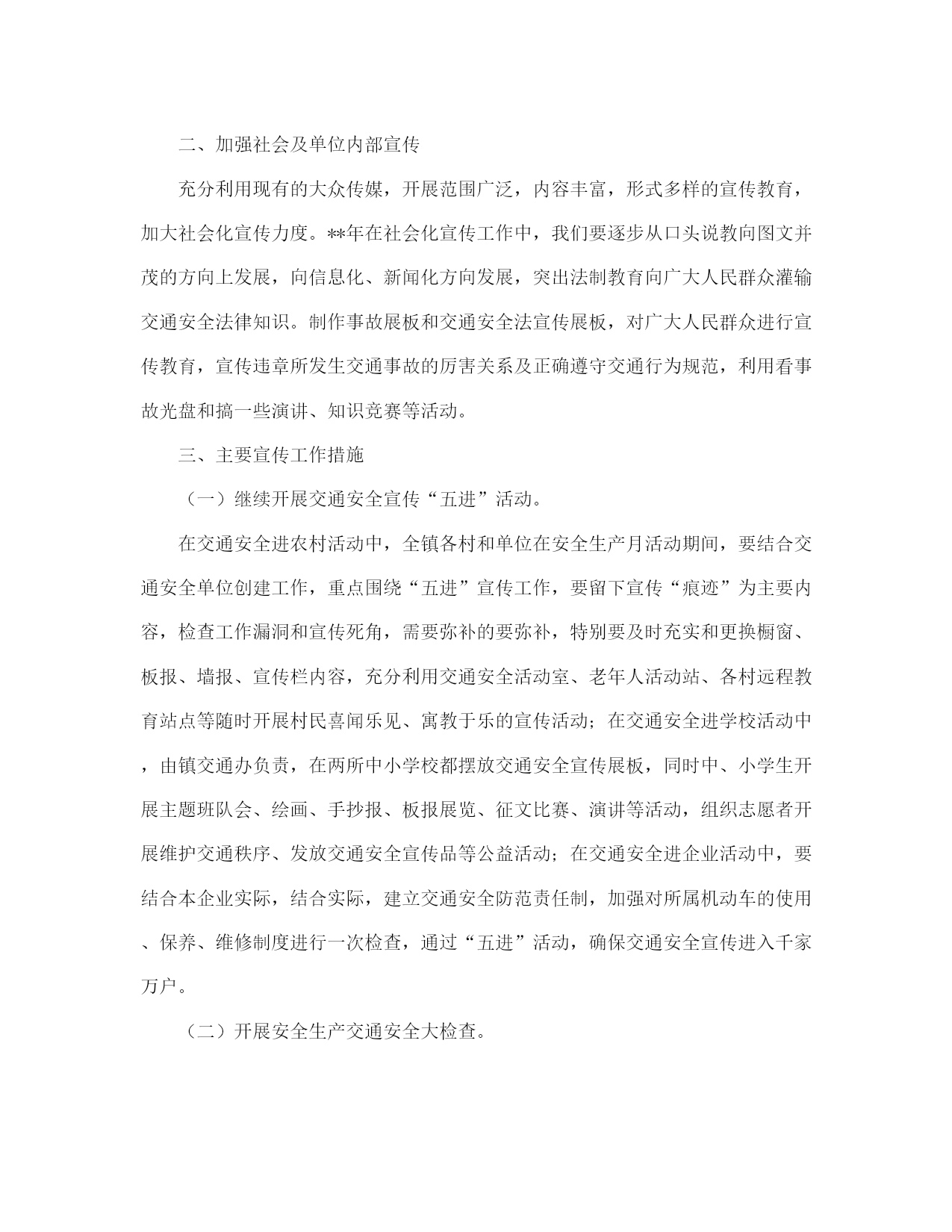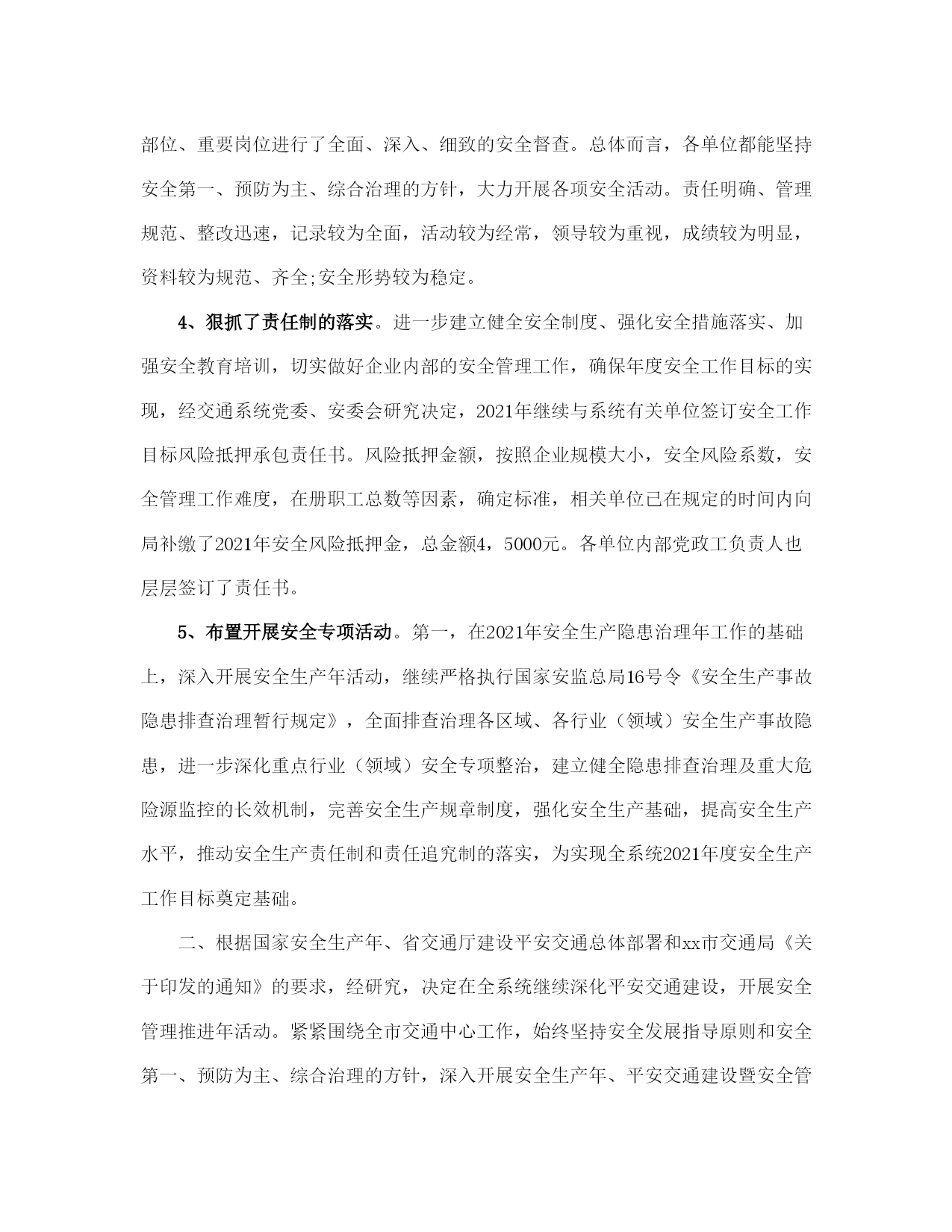 社区交通安全工作计划(完整版)文档资料可直接使用,可编辑,欢迎下载2021社区交通安全工作计划2021社区交通安全工作计划(一)为了预防和减少道路交通事故,创造安全畅通的道路交通环境,使道路交通更好地服务支持社区发展,现结合社区实际,特制定本工作计划。一、工作目标1、配合街道办事处相关职能部门搞好社区内各项道路交通安全工作,切实履行好工作职责和发挥好工作职能,以议事政、保安全、保畅通为总目标,确保社区道路交通安全,杜绝重大交通事故的发生。2、社区要督促协调做好主通道水泥路面硬化的维护和保养工作,对社区交通通道存在安全隐患的地方要及时修缮。3、与社区业主委员会、物业公司、派出所一起,逐步解决社区停车难问题。二、组织领导为加强对社区内道路交通安全工作的领导,决定成立社区交通安全工作领导小组,负责社区道路交通安全管理的组织协调工作。组长:王燕云副组长:王菊生吴秀华组员:陈光辉、王晓佳、陈巧珑、郑爱钦、张燕、陈心玲三、工作措施社区的道路交通安全工作由社区交通安全领导小组具体牵头负责,驻社区各单位要密切配合,按照职责分工,齐抓共管,形成合力,确保工作措施落到实处。1、增加交通安全标识、设施,特别是道路没有设置交通标志的要加大投入。2、加强对机动车的整治,特别是火三轮整治。3、加强对社区道路的硬化,同时注重加强对社区道路的维护和保养。4、加强道路交通安全的宣传工作,提高居民交通安全意识。5、做好有关社区道路交通安全工作的会议记录和软件资料的收集。对社区居民进行道路交通安全教育培训。6、建立义务交警员队伍,让居民参与社区交通安全建设。2021社区交通安全工作计划(二)一、第一季度安全工作1、狠抓了春运工作。在上级主管部门的正确指导下,坚持安全第一、预防为主、综合治理的原则,按照安全、便利、快捷、有序的总体要求,围绕四不一杜绝的工作目标,加强组织领导,狠抓宣传教育,强化措施落实和暴雪天气下的安全监管,进一步加大了安全检查和隐患整改力度,有效的保证了2021年春运任务的顺利完成。2、召开了系统安委会议。2021年1月10日上午,交通系统在培训班召开2021年交通系统安委会成员单位第一次会议,会议就08年的安全工作进行了总结,对09年的安全工作意见和承包意见提出了讨论,最后系统安委会主任和副主任分别做了重要讲话。3、组织安排了元旦、春节期间的安全检查。2021年12月25日各单位完成元旦前的安全自查,2021年1月25日前各单位完成春节前的安全自查。2021年12月31日日前和2021年1月22日前交通行业完成元旦、春节前的专项检查。2021年12月26日至31日,由系统党政领导带领10个检查小组分别深入到施工一线、工作前沿、重点部位、重要岗位进行了全面、深入、细致的安全督查。总体而言,各单位都能坚持安全第一、预防为主、综合治理的方针,大力开展各项安全活动。责任明确、管理规范、整改迅速,记录较为全面,活动较为经常,领导较为重视,成绩较为明显,资料较为规范、齐全;安全形势较为稳定。4、狠抓了责任制的落实。进一步建立健全安全制度、强化安全措施落实、加强安全教育培训,切实做好企业内部的安全管理工作,确保年度安全工作目标的实现,经交通系统党委、安委会研究决定,2021年继续与系统有关单位签订安全工作目标风险抵押承包责任书。风险抵押金额,按照企业规模大小,安全风险系数,安全管理工作难度,在册职工总数等因素,确定标准,相关单位已在规定的时间内向局补缴了2021年安全风险抵押金,总金额4,5000元。各单位内部党政工负责人也层层签订了责任书。5、布置开展安全专项活动。第一,在2021年安全生产隐患治理年工作的基础上,深入开展安全生产年活动,继续严格执行国家安监总局16号令《安全生产事故隐患排查治理暂行规定》,全面排查治理各区域、各行业(领域)安全生产事故隐患,进一步深化重点行业(领域)安全专项整治,建立健全隐患排查治理及重大危险源监控的长效机制,完善安全生产规章制度,强化安全生产基础,提高安全生产水平,推动安全生产责任制和责任追究制的落实,为实现全系统2021年度安全生产工作目标奠定基础。二、根据国家安全生产年、省交通厅建设平安交通总体部署和xx市交通局《关于印发的通知》的要求,经研究,决定在全系统继续深化平安交通建设,开展安全管理推进年活动。紧紧围绕全市交通中心工作,始终坚持安全发展指导原则和安全第一、预防为主、综合治理的方针,深入开展安全生产年、平安交通建设暨安全管理推进年活动,以科技兴安为龙头、事故防范为重点、规范管理为核心、隐患治理为手段、健全机制为保障、长治久安为目的,努力构建政府领导、部门监管、企业负责、全员参与、社会监督的安全工作格局,增强驾驭交通安全的能力。三、二季度安全工作打算