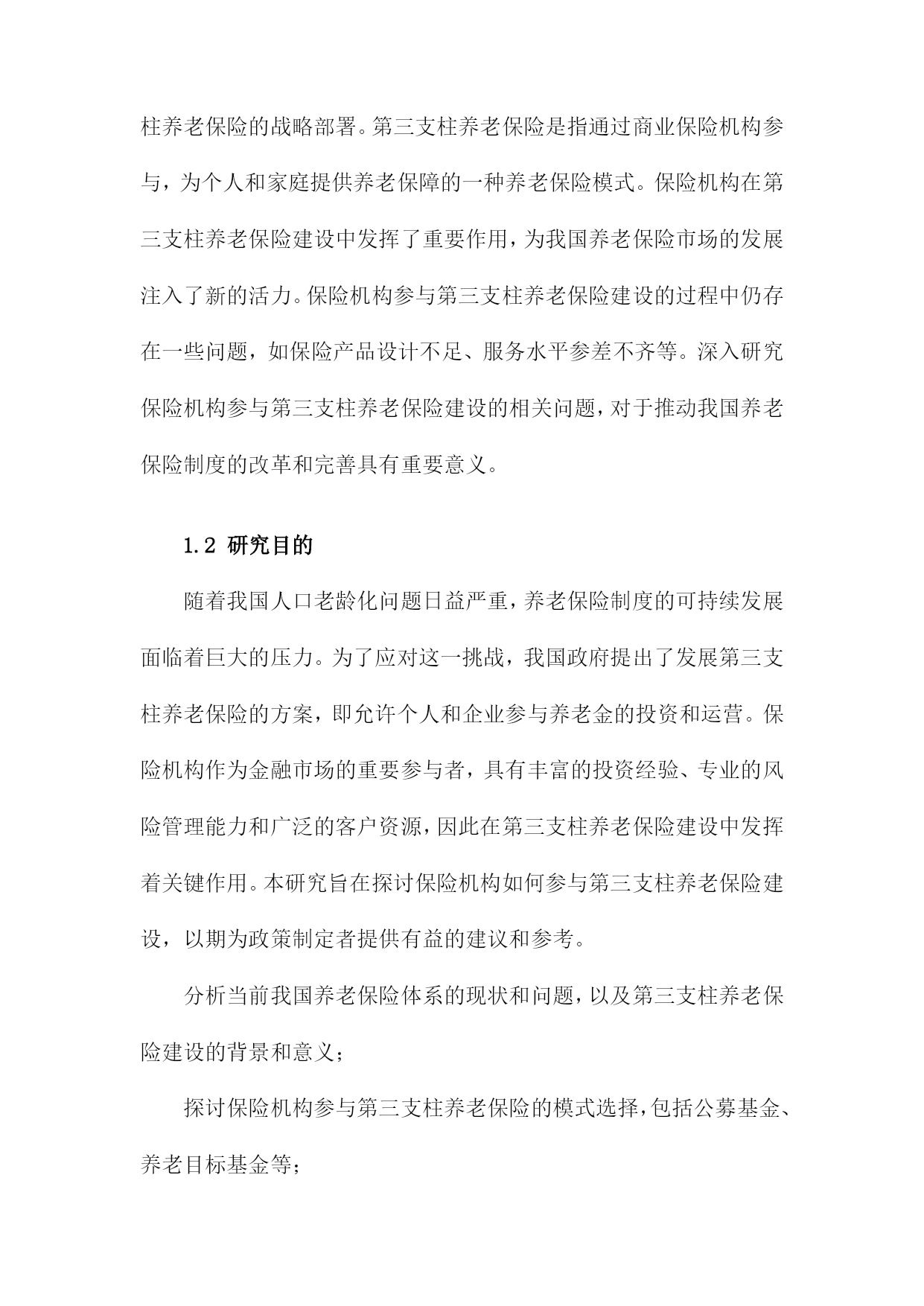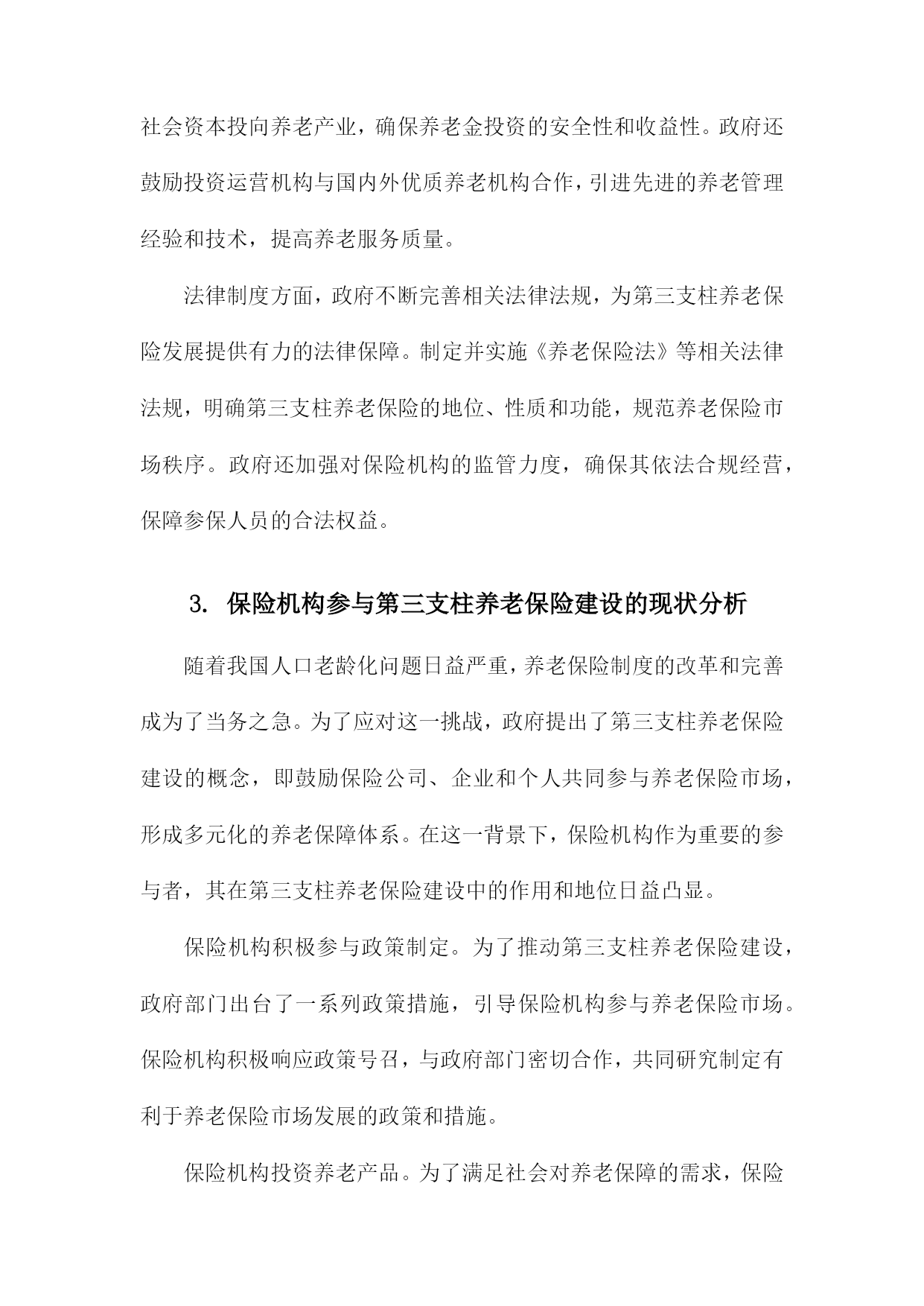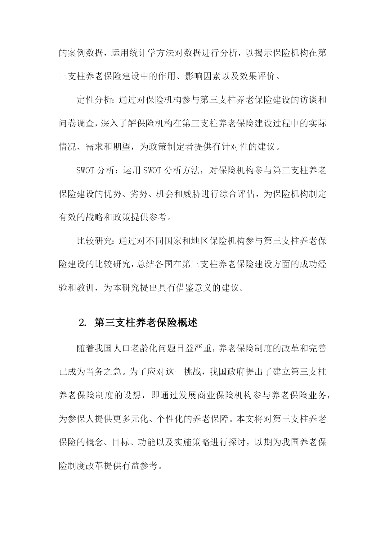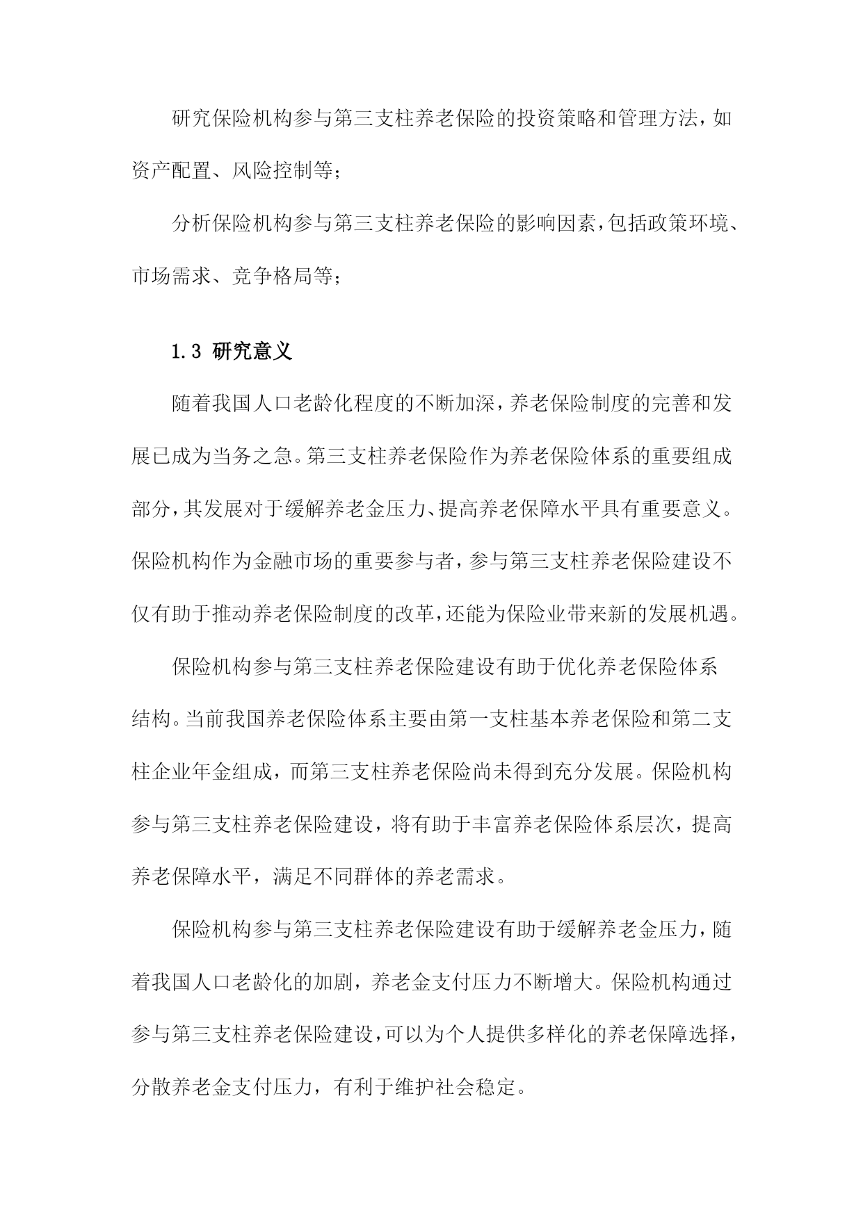 保险机构参与第三支柱养老保险建设研究1.内容描述本研究旨在探讨保险机构在第三支柱养老保险建设中的作用和影响。随着我国人口老龄化问题日益严重,养老保障体系的完善成为社会关注的焦点。第三支柱养老保险作为养老保险体系的重要组成部分,旨在通过个人储蓄和商业保险的方式,为老年人提供更多元化、个性化的养老保障。分析保险机构参与第三支柱养老保险建设的现状和趋势,了解保险机构在这一领域的市场空间和发展机遇;探讨保险机构参与第三支柱养老保险建设的主要模式和途径,包括保险产品创新、投资运营策略、风险管理等方面;评估保险机构参与第三支柱养老保险建设的影响,包括对保险行业发展、资本市场、社会福利等方面的影响;提出保险机构参与第三支柱养老保险建设的政策建议,以促进保险业与养老保障体系的协同发展。1.1研究背景随着我国人口老龄化问题日益严重,养老保险制度的可持续发展面临着巨大的挑战。为了应对这一挑战,我国政府提出了发展第三支柱养老保险的战略部署。第三支柱养老保险是指通过商业保险机构参与,为个人和家庭提供养老保障的一种养老保险模式。保险机构在第三支柱养老保险建设中发挥了重要作用,为我国养老保险市场的发展注入了新的活力。保险机构参与第三支柱养老保险建设的过程中仍存在一些问题,如保险产品设计不足、服务水平参差不齐等。深入研究保险机构参与第三支柱养老保险建设的相关问题,对于推动我国养老保险制度的改革和完善具有重要意义。1.2研究目的随着我国人口老龄化问题日益严重,养老保险制度的可持续发展面临着巨大的压力。为了应对这一挑战,我国政府提出了发展第三支柱养老保险的方案,即允许个人和企业参与养老金的投资和运营。保险机构作为金融市场的重要参与者,具有丰富的投资经验、专业的风险管理能力和广泛的客户资源,因此在第三支柱养老保险建设中发挥着关键作用。本研究旨在探讨保险机构如何参与第三支柱养老保险建设,以期为政策制定者提供有益的建议和参考。分析当前我国养老保险体系的现状和问题,以及第三支柱养老保险建设的背景和意义;探讨保险机构参与第三支柱养老保险的模式选择,包括公募基金、养老目标基金等;研究保险机构参与第三支柱养老保险的投资策略和管理方法,如资产配置、风险控制等;分析保险机构参与第三支柱养老保险的影响因素,包括政策环境、市场需求、竞争格局等;1.3研究意义随着我国人口老龄化程度的不断加深,养老保险制度的完善和发展已成为当务之急。第三支柱养老保险作为养老保险体系的重要组成部分,其发展对于缓解养老金压力、提高养老保障水平具有重要意义。保险机构作为金融市场的重要参与者,参与第三支柱养老保险建设不仅有助于推动养老保险制度的改革,还能为保险业带来新的发展机遇。保险机构参与第三支柱养老保险建设有助于优化养老保险体系结构。当前我国养老保险体系主要由第一支柱基本养老保险和第二支柱企业年金组成,而第三支柱养老保险尚未得到充分发展。保险机构参与第三支柱养老保险建设,将有助于丰富养老保险体系层次,提高养老保障水平,满足不同群体的养老需求。保险机构参与第三支柱养老保险建设有助于缓解养老金压力,随着我国人口老龄化的加剧,养老金支付压力不断增大。保险机构通过参与第三支柱养老保险建设,可以为个人提供多样化的养老保障选择,分散养老金支付压力,有利于维护社会稳定。保险机构参与第三支柱养老保险建设有助于推动保险业转型升级。保险机构参与第三支柱养老保险建设,需要运用现代金融科技手段,如大数据、云计算、人工智能等,提高养老服务的智能化、个性化水平。这将有助于推动保险业在产品创新、服务升级、风险管理等方面的转型升级,提升行业整体竞争力。保险机构参与第三支柱养老保险建设有助于促进经济发展,保险业与养老产业的融合发展,将带动相关产业链的发展,创造就业机会,促进经济增长。保险机构通过参与第三支柱养老保险建设,可以为个人提供更加便捷、高效的养老保障服务,提高居民消费能力,对经济发展具有积极作用。保险机构参与第三支柱养老保险建设具有重要的理论意义和现实意义。本研究旨在分析保险机构参与第三支柱养老保险建设的影响因素及政策建议,为我国养老保险制度改革和保险业发展提供有益参考。1.4研究方法文献综述:通过对国内外关于第三支柱养老保险理论和实践的研究文献进行梳理和分析,总结出当前第三支柱养老保险建设的主要趋势、问题和挑战,为后续研究提供理论基础和参考依据。实证分析:通过收集和整理保险机构参与第三支柱养老保险建设的案例数据,运用统计学方法对数据进行分析,以揭示保险机构在第三支柱养老保险建设中的作用、影响因素以及效果评价。定性分析:通过对保险机构参与第三支柱养老保险建设的访谈和问卷调查,深入了解保险机构在第三支柱养老保险建设过程中的实际情况、需求和期望,为政策制定者提供有针对性的建议。SWO