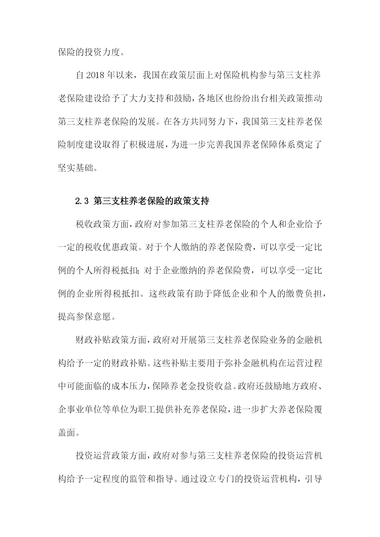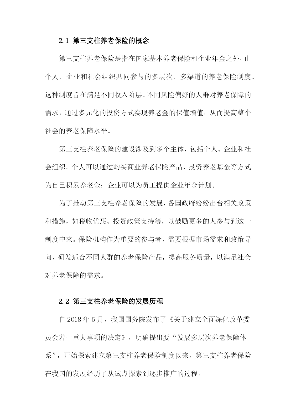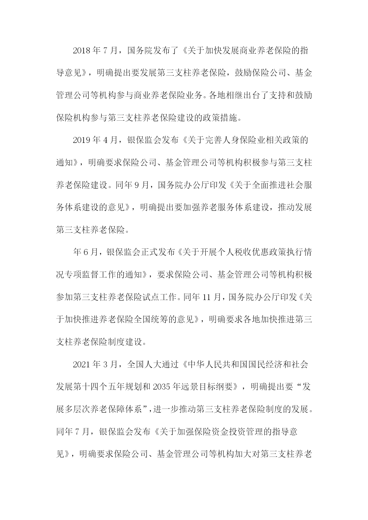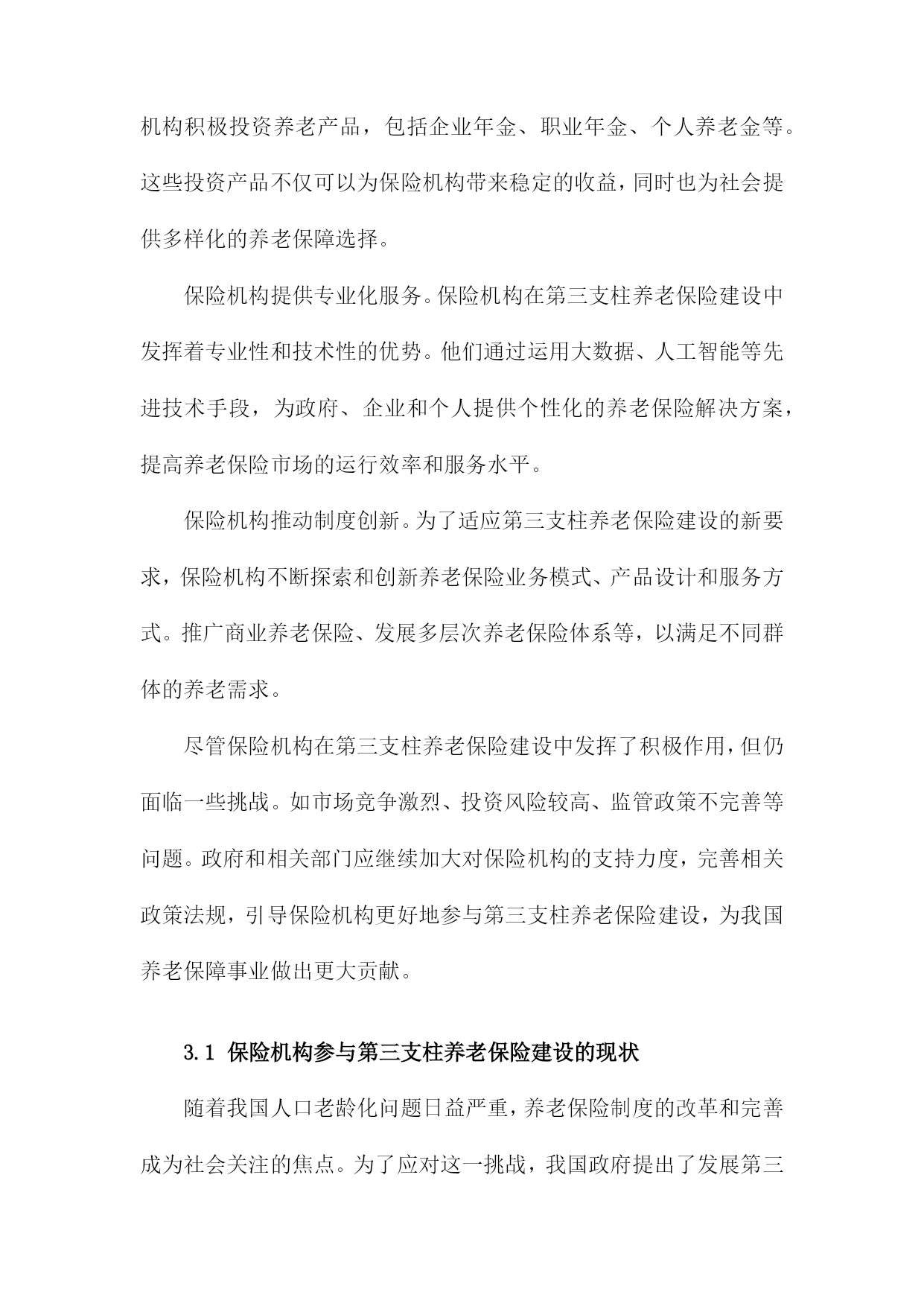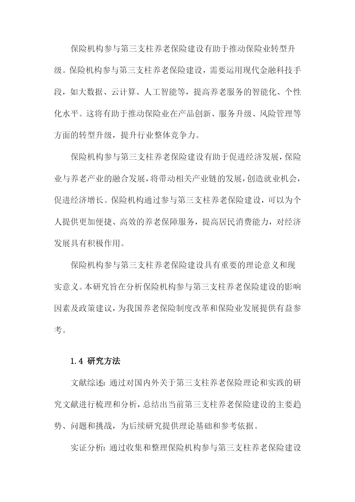 保险机构参与第三支柱养老保险建设研究1.内容描述本研究旨在探讨保险机构在第三支柱养老保险建设中的作用和影响。随着我国人口老龄化问题日益严重,养老保障体系的完善成为社会关注的焦点。第三支柱养老保险作为养老保险体系的重要组成部分,旨在通过个人储蓄和商业保险的方式,为老年人提供更多元化、个性化的养老保障。分析保险机构参与第三支柱养老保险建设的现状和趋势,了解保险机构在这一领域的市场空间和发展机遇;探讨保险机构参与第三支柱养老保险建设的主要模式和途径,包括保险产品创新、投资运营策略、风险管理等方面;评估保险机构参与第三支柱养老保险建设的影响,包括对保险行业发展、资本市场、社会福利等方面的影响;提出保险机构参与第三支柱养老保险建设的政策建议,以促进保险业与养老保障体系的协同发展。1.1研究背景随着我国人口老龄化问题日益严重,养老保险制度的可持续发展面临着巨大的挑战。为了应对这一挑战,我国政府提出了发展第三支柱养老保险的战略部署。第三支柱养老保险是指通过商业保险机构参与,为个人和家庭提供养老保障的一种养老保险模式。保险机构在第三支柱养老保险建设中发挥了重要作用,为我国养老保险市场的发展注入了新的活力。保险机构参与第三支柱养老保险建设的过程中仍存在一些问题,如保险产品设计不足、服务水平参差不齐等。深入研究保险机构参与第三支柱养老保险建设的相关问题,对于推动我国养老保险制度的改革和完善具有重要意义。1.2研究目的随着我国人口老龄化问题日益严重,养老保险制度的可持续发展面临着巨大的压力。为了应对这一挑战,我国政府提出了发展第三支柱养老保险的方案,即允许个人和企业参与养老金的投资和运营。保险机构作为金融市场的重要参与者,具有丰富的投资经验、专业的风险管理能力和广泛的客户资源,因此在第三支柱养老保险建设中发挥着关键作用。本研究旨在探讨保险机构如何参与第三支柱养老保险建设,以期为政策制定者提供有益的建议和参考。分析当前我国养老保险体系的现状和问题,以及第三支柱养老保险建设的背景和意义;探讨保险机构参与第三支柱养老保险的模式选择,包括公募基金、养老目标基金等;研究保险机构参与第三支柱养老保险的投资策略和管理方法,如资产配置、风险控制等;分析保险机构参与第三支柱养老保险的影响因素,包括政策环境、市场需求、竞争格局等;1.3研究意义随着我国人口老龄化程度的不断加深,养老保险制度的完善和发展已成为当务之急。第三支柱养老保险作为养老保险体系的重要组成部分,其发展对于缓解养老金压力、提高养老保障水平具有重要意义。保险机构作为金融市场的重要参与者,参与第三支柱养老保险建设不仅有助于推动养老保险制度的改革,还能为保险业带来新的发展机遇。保险机构参与第三支柱养老保险建设有助于优化养老保险体系结构。当前我国养老保险体系主要由第一支柱基本养老保险和第二支柱企业年金组成,而第三支柱养老保险尚未得到充分发展。保险机构参与第三支柱养老保险建设,将有助于丰富养老保险体系层次,提高养老保障水平,满足不同群体的养老需求。保险机构参与第三支柱养老保险建设有助于缓解养老金压力,随着我国人口老龄化的加剧,养老金支付压力不断增大。保险机构通过参与第三支柱养老保险建设,可以为个人提供多样化的养老保障选择,分散养老金支付压力,有利于维护社会稳定。保险机构参与第三支柱养老保险建设有助于推动保险业转型升级。保险机构参与第三支柱养老保险建设,需要运用现代金融科技手段,如大数据、云计算、人工智能等,提高养老服务的智能化、个性化水平。这将有助于推动保险业在产品创新、服务升级、风险管理等方面的转型升级,提升行业整体竞争力。保险机构参与第三支柱养老保险建设有助于促进经济发展,保险业与养老产业的融合发展,将带动相关产业链的发展,创造就业机会,促进经济增长。保险机构通过参与第三支柱养老保险建设,可以为个人提供更加便捷、高效的养老保障服务,提高居民消费能力,对经济发展具有积极作用。保险机构参与第三支柱养老保险建设具有重要的理论意义和现实意义。本研究旨在分析保险机构参与第三支柱养老保险建设的影响因素及政策建议,为我国养老保险制度改革和保险业发展提供有益参考。1.4研究方法文献综述:通过对国内外关于第三支柱养老保险理论和实践的研究文献进行梳理和分析,总结出当前第三支柱养老保险建设的主要趋势、问题和挑战,为后续研究提供理论基础和参考依据。实证分析:通过收集和整理保险机构参与第三支柱养老保险建设的案例数据,运用统计学方法对数据进行分析,以揭示保险机构在第三支柱养老保险建设中的作用、影响因素以及效果评价。定性分析:通过对保险机构参与第三支柱养老保险建设的访谈和问卷调查,深入了解保险机构在第三支柱养老保险建设过程中的实际情况、需求和期望,为政策制定者提供有针对性的建议。SWO