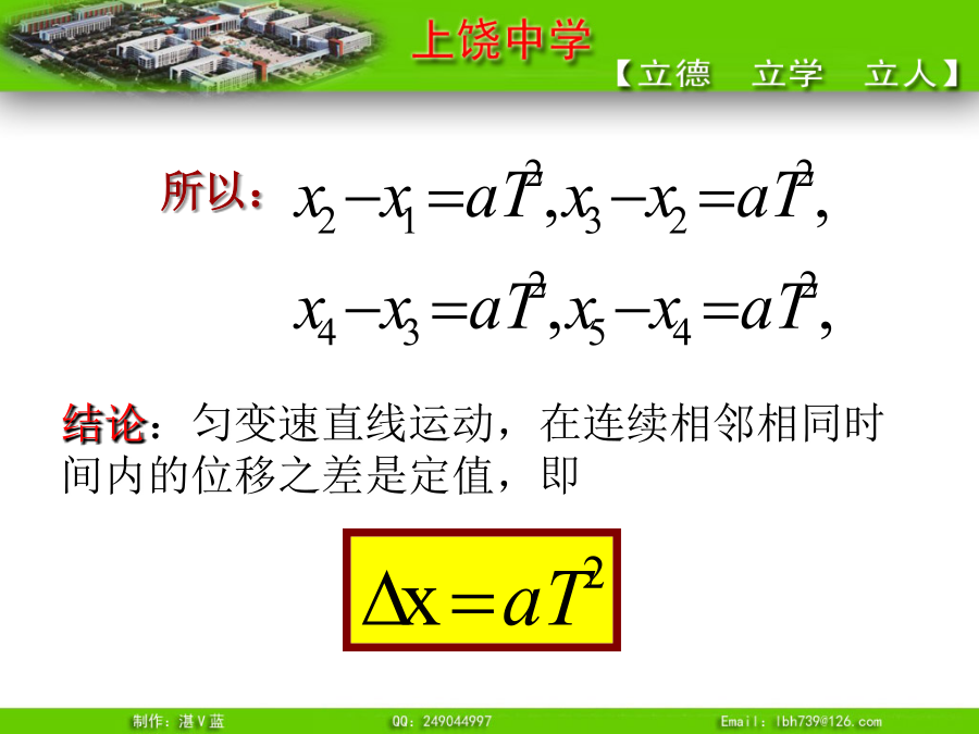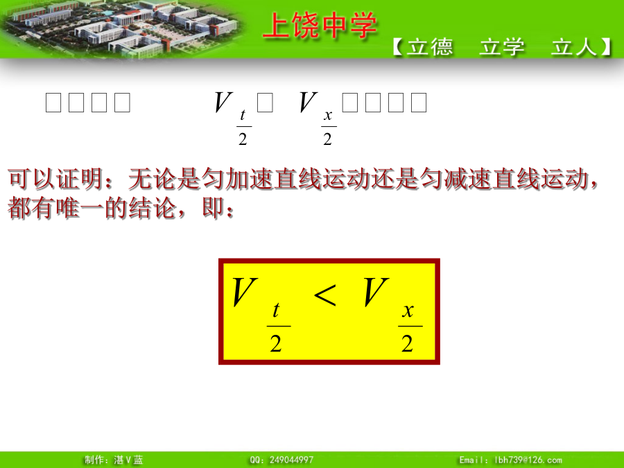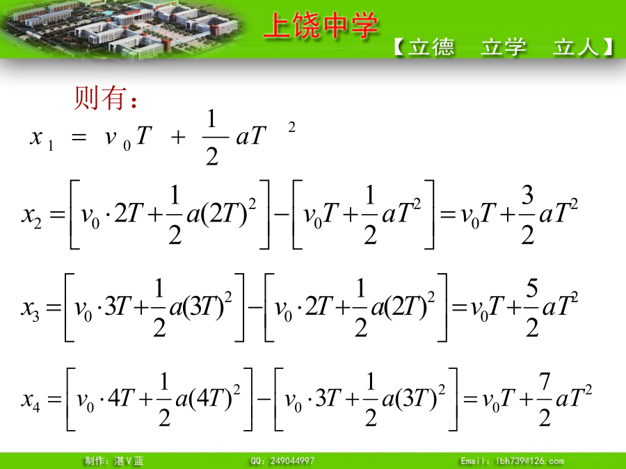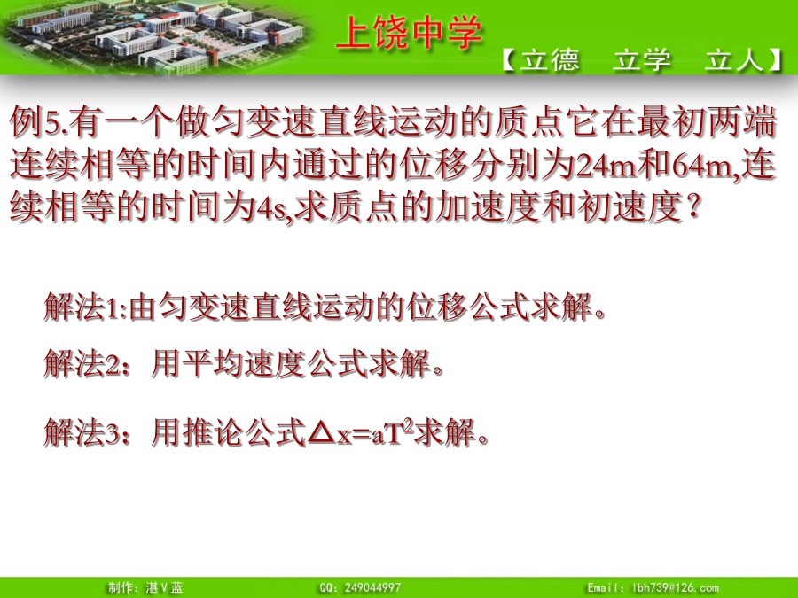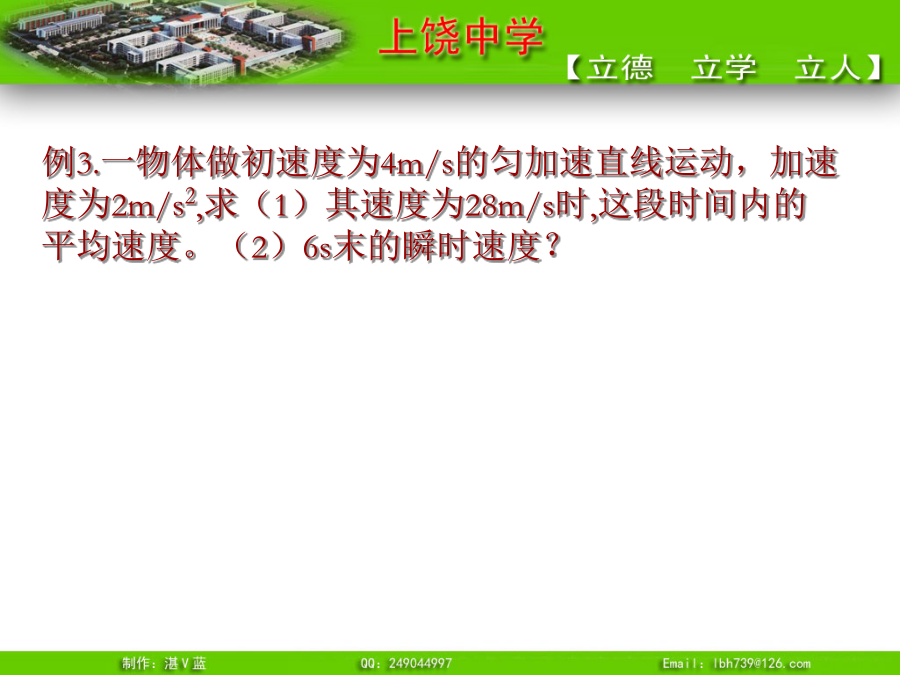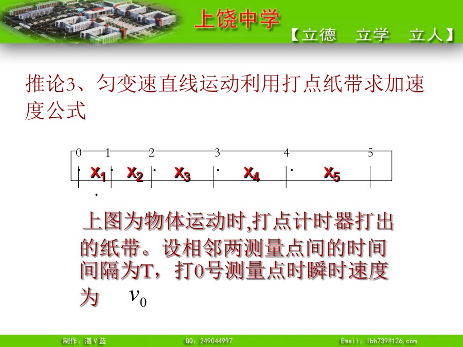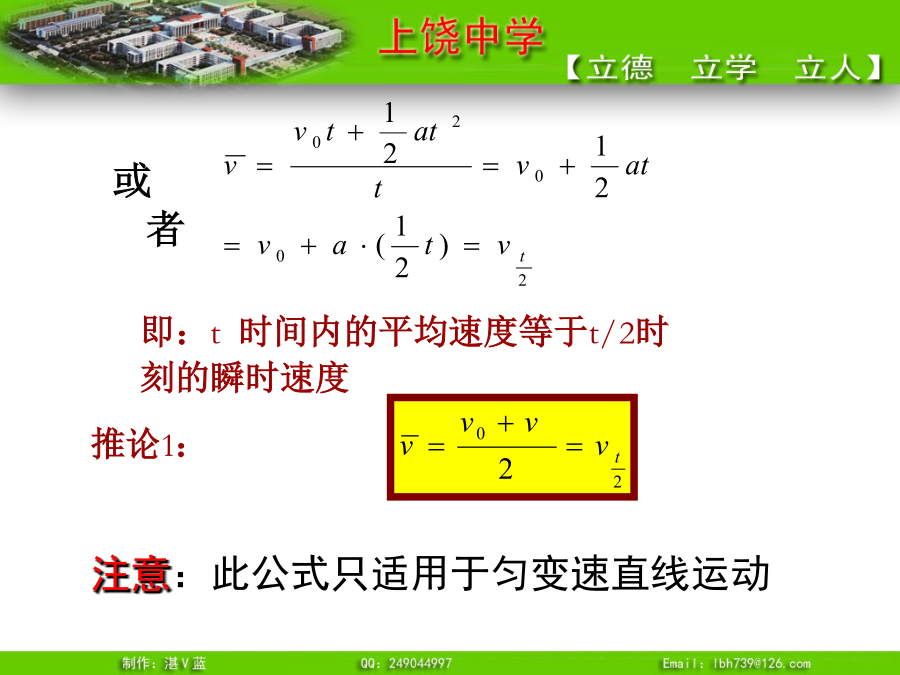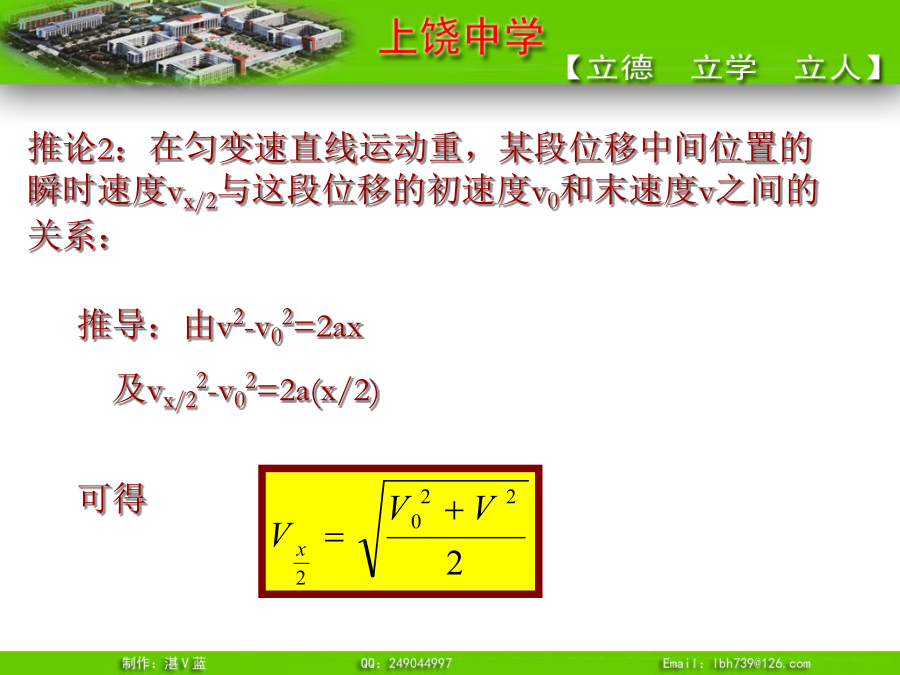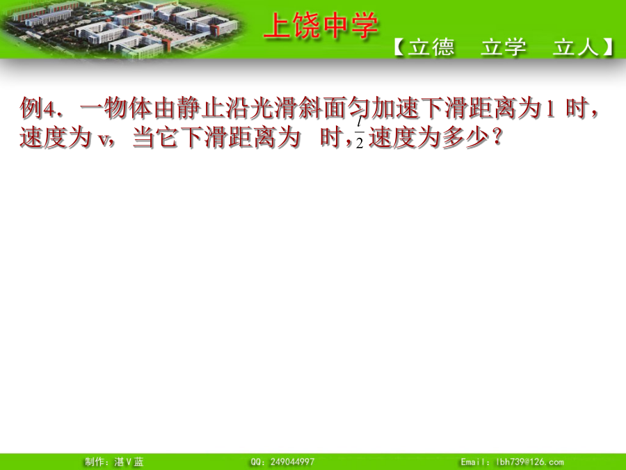 推论1、匀变速直线运动的平均速度即:t时间内的平均速度等于t/2时刻的瞬时速度例3.一物体做初速度为4m/s的匀加速直线运动,加速度为2m/s2,求(1)其速度为28m/s时,这段时间内的平均速度。(2)6s末的瞬时速度?例4.一物体由静止沿光滑斜面匀加速下滑距离为l时,速度为v,当它下滑距离为时,速度为多少?可以证明:无论是匀加速直线运动还是匀减速直线运动,都有唯一的结论,即:推论3、匀变速直线运动利用打点纸带求加速度公式则有:所以:例5.有一个做匀变速直线运动的质点它在最初两端连续相等的时间内通过的位移分别为24m和64m,连续相等的时间为4s,求质点的加速度和初速度?推论4逆向思维法:末速度为零的匀减速直线运动可看成初速度为零,加速度大小相等的匀加速直线运动。总结1.练习1:一物体做初速为零的匀加速直线运动。求:(2)前1秒、前2秒、前3秒……位移之比(3)第一秒、第二秒、第三秒……位移之比(4)通过连续相等位移所用时间之比故:四个比例式:物体做初速为零的匀加速直线运动,几个常用的比例式:练习2解题技巧③一般应该先用字母代表物理量进行运算,得出用已知量表达未知量的关系式,然后再把数值代入。这样做能够清楚地看出未知量与已知量的关系,计算也比较简便。追及和相遇问题“追及和相遇”问题[例1]:一辆汽车在十字路口等候绿灯,当绿灯亮时汽车以3m/s2的加速度开始加速行驶,恰在这时一辆自行车以6m/s的速度匀速驶来,从后边超过汽车。试求:汽车从路口开动后,在追上自行车之前经过多长时间两车相距最远?此时距离是多少?方法一:物理分析法方法二:图象法方法三:二次函数极值法方法四:相对运动法[例2]:A火车以v1=20m/s速度匀速行驶,司机发现前方同轨道上相距100m处有另一列火车B正以v2=10m/s速度匀速行驶,A车立即做加速度大小为a的匀减速直线运动。要使两车不相撞,a应满足什么条件?方法二:图象法方法三:二次函数极值法方法四:相对运动法练习1、一车从静止开始以1m/s2的加速度前进,车后相距x0为25m处,某人同时开始以6m/s的速度匀速追车,能否追上?如追不上,求人、车间的最小距离。练习2:汽车正以10m/s的速度在平直公路上做匀速直线运动,突然发现正前方10m处有一辆自行车以4m/s的速度同方向做匀速直线运动,汽车立即关闭油门,做加速度为6m/s2的匀减速运动,问:(1)汽车能否撞上自行车?若汽车不能撞上自行车,汽车与自行车间的最近距离为多少?(2)汽车减速时,他们间距离至少多大不相撞?小结:追及和相遇问题的分析方法“追及和相遇”问题解题的关键是:练习1、一车从静止开始以1m/s2的加速度前进,车后相距x0为25m处,某人同时开始以6m/s的速度匀速追车,能否追上?如追不上,求人、车间的最小距离。