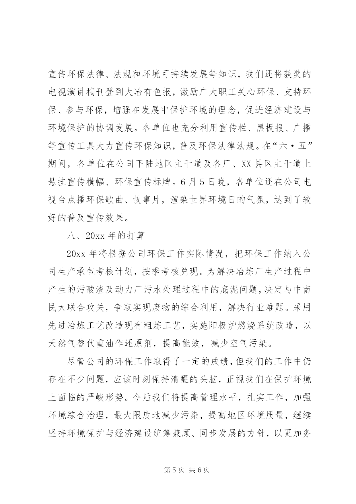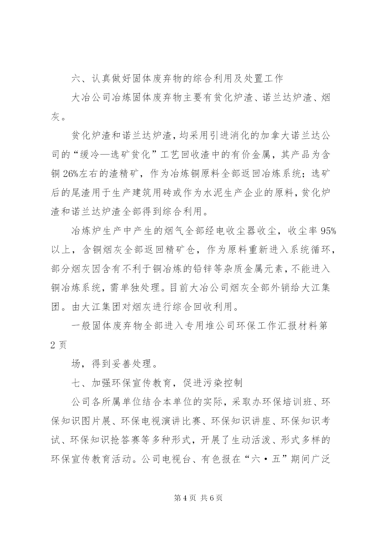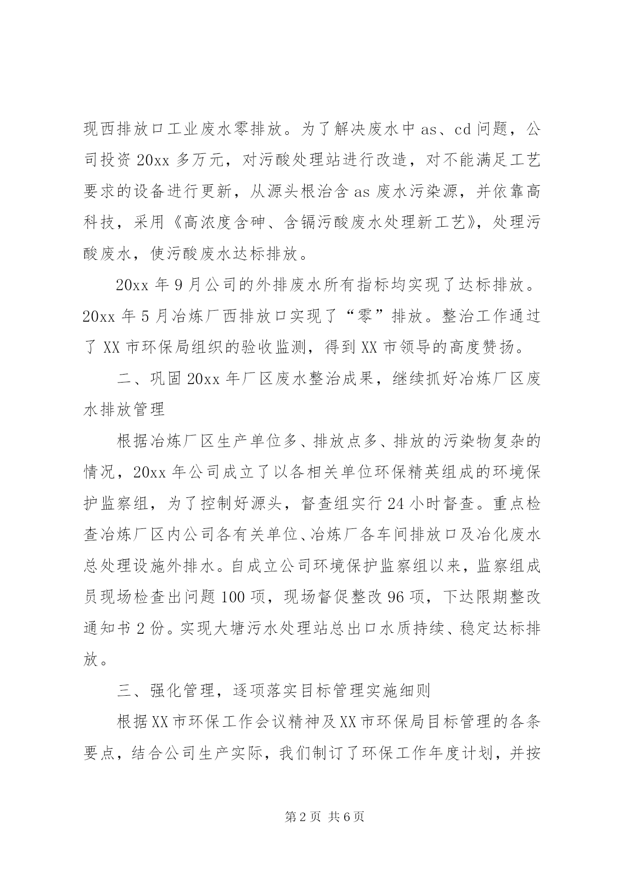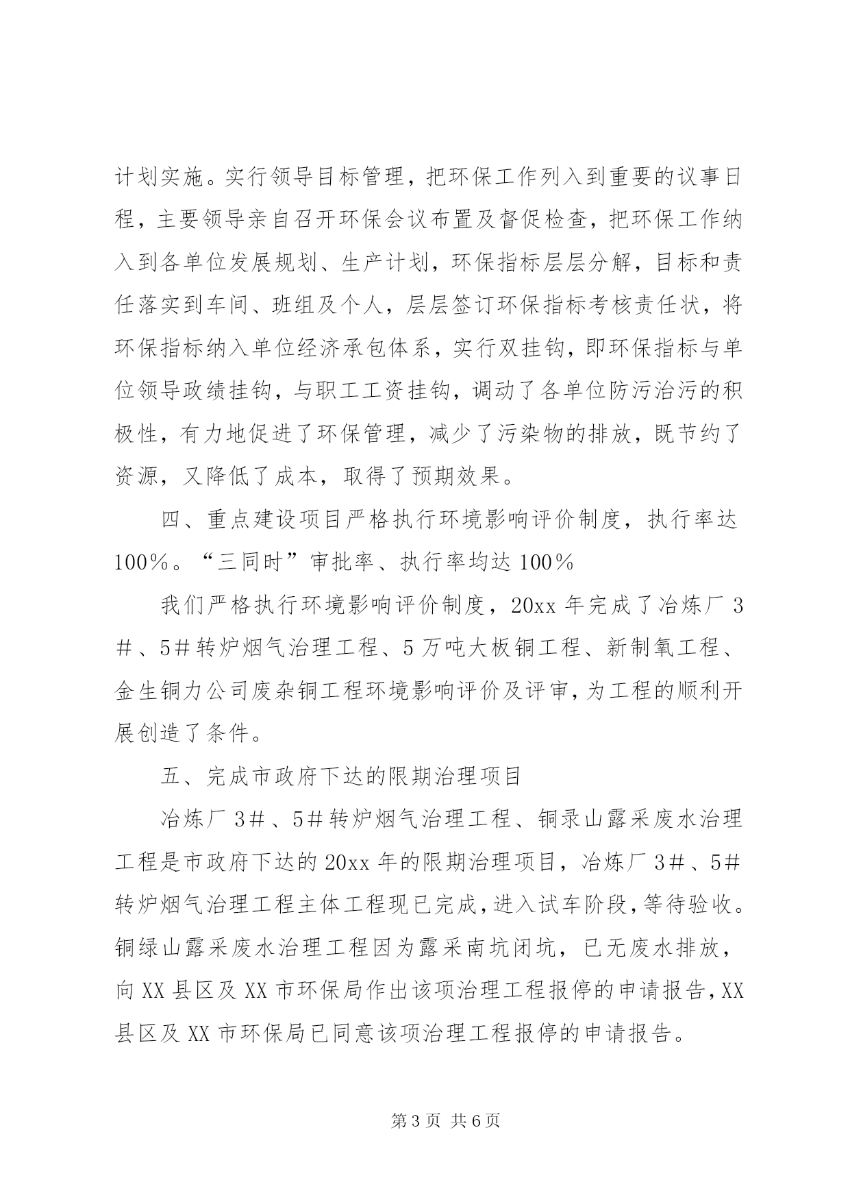 第PAGE\*Arabic\*MERGEFORMAT6页共NUMPAGES\*MERGEFORMAT6页公司环保工作汇报材料各位领导、与会代表们:大家好。xx公司是以生产铜为主的大型联合企业。历年来,我们一贯遵守国家环境保护法的规定,认真贯彻中央、省、市环境保护政策,始终如一地坚持环境保护同经济建设、社会发展相协调的原则,落实XX市环境保护工作规划,积极开展环境污染的综合治理,努力做到生产建设与环境整治同步发展,取得了有目共睹的经济效益、社会效益和环境效益。一、加大投资,构建达标排放平台我公司先后投资数亿元用于生产工艺改造、“三废”综合利用及环境治理。如投资4.8亿元引进加拿大诺兰达炼铜工艺、投资1.98亿元引进美国孟山都先进的制酸技术,投资9900万元对3#、5#转炉进行改造,使尾气so2排放浓度有效控制在排放限值内,s的实收率达到97.8%。投资800万元建成日处理能力为2.4万吨的工业污水处理站,使冶化废水得到全部处理,循环使用率达到80%以上。为了提高水质和废水回用率,我公司采取了一系列处理措施,主要是:投资800多万元对污水处理站进行改造,扩大污水处理容量,增加预沉池;对澄清池和过滤池进行改造,提高处理能力及处理效果;采用西水东调的方法,建一水池和泵房,将西边的生活污水及地面渗漏水由管道排向污水站,实现西排放口工业废水零排放。为了解决废水中as、cd问题,公司投资20xx多万元,对污酸处理站进行改造,对不能满足工艺要求的设备进行更新,从源头根治含as废水污染源,并依靠高科技,采用《高浓度含砷、含镉污酸废水处理新工艺》,处理污酸废水,使污酸废水达标排放。20xx年9月公司的外排废水所有指标均实现了达标排放。20xx年5月冶炼厂西排放口实现了“零”排放。整治工作通过了XX市环保局组织的验收监测,得到XX市领导的高度赞扬。二、巩固20xx年厂区废水整治成果,继续抓好冶炼厂区废水排放管理根据冶炼厂区生产单位多、排放点多、排放的污染物复杂的情况,20xx年公司成立了以各相关单位环保精英组成的环境保护监察组,为了控制好源头,督查组实行24小时督查。重点检查冶炼厂区内公司各有关单位、冶炼厂各车间排放口及冶化废水总处理设施外排水。自成立公司环境保护监察组以来,监察组成员现场检查出问题100项,现场督促整改96项,下达限期整改通知书2份。实现大塘污水处理站总出口水质持续、稳定达标排放。三、强化管理,逐项落实目标管理实施细则根据XX市环保工作会议精神及XX市环保局目标管理的各条要点,结合公司生产实际,我们制订了环保工作年度计划,并按计划实施。实行领导目标管理,把环保工作列入到重要的议事日程,主要领导亲自召开环保会议布置及督促检查,把环保工作纳入到各单位发展规划、生产计划,环保指标层层分解,目标和责任落实到车间、班组及个人,层层签订环保指标考核责任状,将环保指标纳入单位经济承包体系,实行双挂钩,即环保指标与单位领导政绩挂钩,与职工工资挂钩,调动了各单位防污治污的积极性,有力地促进了环保管理,减少了污染物的排放,既节约了资源,又降低了成本,取得了预期效果。四、重点建设项目严格执行环境影响评价制度,执行率达100%。“三同时”审批率、执行率均达100%我们严格执行环境影响评价制度,20xx年完成了冶炼厂3#、5#转炉烟气治理工程、5万吨大板铜工程、新制氧工程、金生铜力公司废杂铜工程环境影响评价及评审,为工程的顺利开展创造了条件。五、完成市政府下达的限期治理项目冶炼厂3#、5#转炉烟气治理工程、铜录山露采废水治理工程是市政府下达的20xx年的限期治理项目,冶炼厂3#、5#转炉烟气治理工程主体工程现已完成,进入试车阶段,等待验收。铜绿山露采废水治理工程因为露采南坑闭坑,已无废水排放,向XX县区及XX市环保局作出该项治理工程报停的申请报告,XX县区及XX市环保局已同意该项治理工程报停的申请报告。六、认真做好固体废弃物的综合利用及处置工作大冶公司冶炼固体废弃物主要有贫化炉渣、诺兰达炉渣、烟灰。贫化炉渣和诺兰达炉渣,均采用引进消化的加拿大诺兰达公司的“缓冷—选矿贫化”工艺回收渣中的有价金属,其产品为含铜26%左右的渣精矿,作为冶炼铜原料全部返回冶炼系统;选矿后的尾渣用于生产建筑用砖或作为水泥生产企业的原料,贫化炉渣和诺兰达炉渣全部得到综合利用。冶炼炉生产中产生的烟气全部经电收尘器收尘,收尘率95%以上,含铜烟灰全部返回精矿仓,作为原料重新进入系统循环,部分烟灰因含有不利于铜冶炼的铅锌等杂质金属元素,不能进入铜冶炼系统,需单独处理。目前大冶公司烟灰全部外销给大江集团。由大江集团对烟灰进行综合回收利用。一般固体废弃物全部进入专用堆公司环保工作汇报材料场,得到妥善处理。七、加强环保宣传教育,促进污染控制公司各所属单位结合本单位的实际