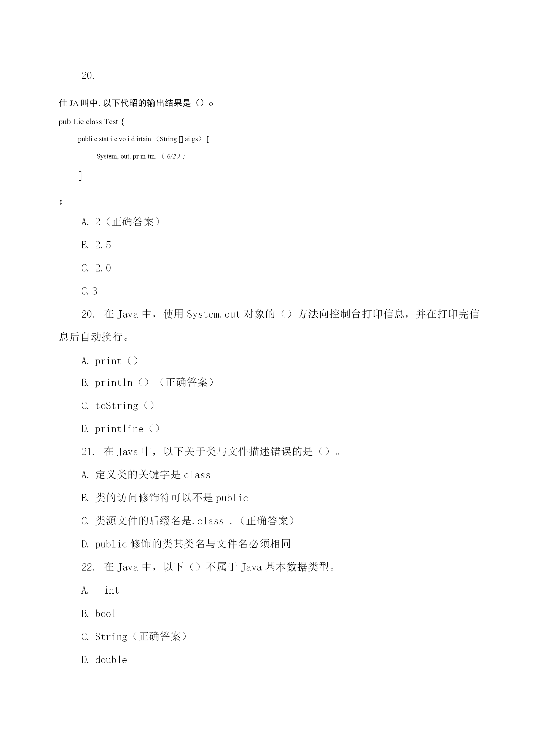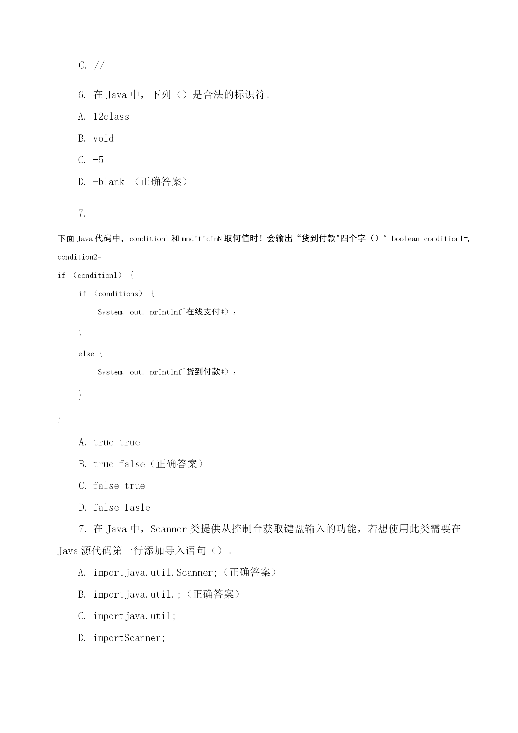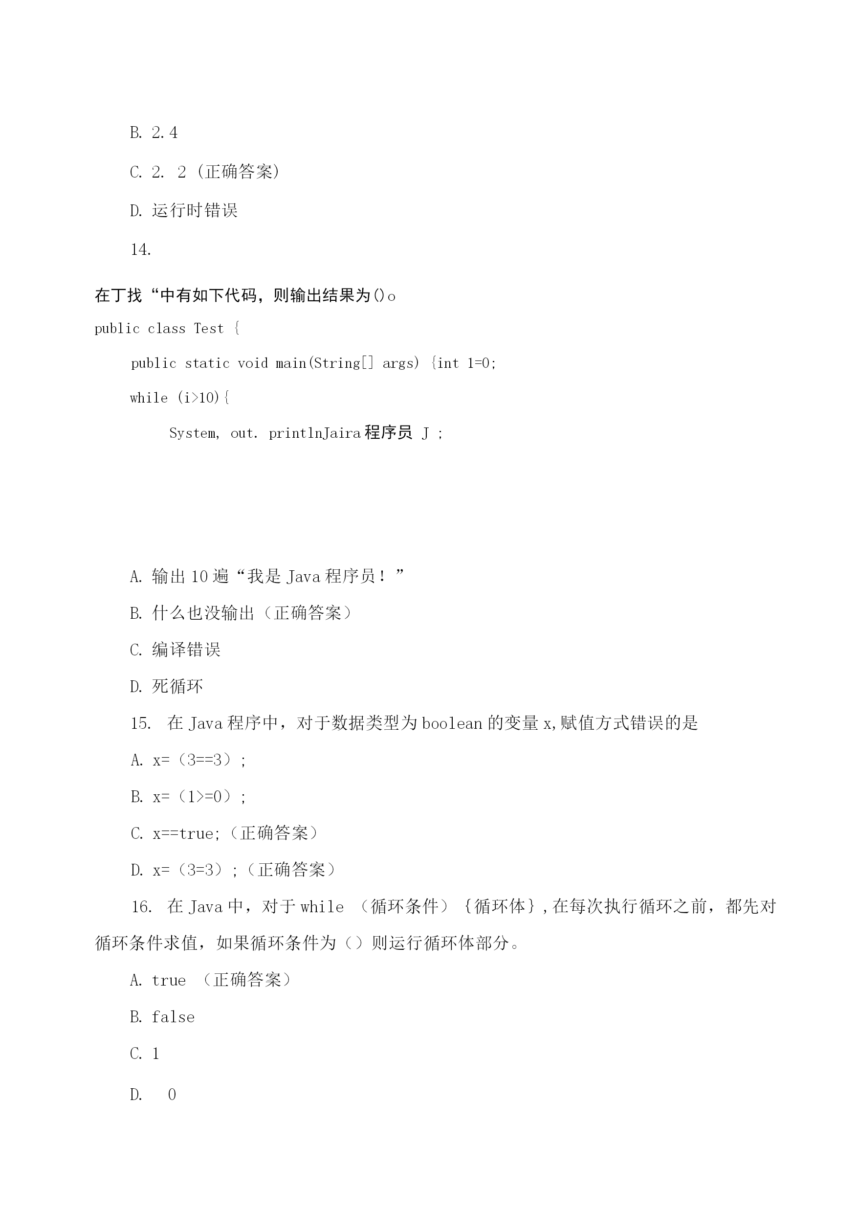 java程序设计期末理论模拟测试编译Java源程序后产生的字节码文件的扩展名为()。.java.class(正确答案).html.exe开发Java程序的步骤包括运行、编写、编译,它们的先后顺序是()。运行->编写->编译编写->编译->运行(正确答案)编译->编写->运行编写->运行->编译在Java中,main()方法书写正确的是()。publicvoidmain(string[]args)publicstaticmain(String[]args)publicvoidstaticmain(string[]args)publicstaticvoidmain(String[]args)(正确答案)下列选项中,能实现在控制台输出“祝你好运”,并在输出后换行的是(祝你好运);System.out.print("祝你好运");(祝你好运);System.out.println("祝你好运");(正确答案)在Java中,多行注释使用()符号结尾。//(正确答案)C.//在Java中,下列()是合法的标识符。12classTOC\o"1-5"\h\zvoid-5-blank(正确答案)7.下面Java代码中,conditionl和mnditicinN取何值时!会输出“货到付款"四个字()°booleanconditionl=,condition2=;if(conditionl){if(conditions){System,out.printlnf^在线支付*);}else{System,out.printlnf^货到付款*);}}truetruetruefalse(正确答案)falsetruefalsefasle在Java中,Scanner类提供从控制台获取键盘输入的功能,若想使用此类需要在Java源代码第一行添加导入语句()。importjava.util.Scanner;(正确答案)importjava.util.;(正确答案)importjava.util;importScanner;在Java中,下面()语句不能正确通过编译。System.out.println(1+1);chari=2+'2';Strings="on"+,ez;(正确答案)intb=255.0;(正确答案)10.在Java语言和*语言中均可以,使用switch结构解决等值判断问题,以下Ja”代码的运行结果是()。publicclassHelloAccp{publiestaticvuidmain(.String[]args.)[intsvr=O;switch(.sw.)[case0:System,out.print成[J]了-').:case1:System,out.print(j你失败了!");break;}}}你成功了!你失败了!(正确答案)你失败了!你成功了!出现编译错误,因为缺少default子句11.下面是某类的main。方法代码,编译运行该类的输出结果是(1。publicstaticvoidmain(String[]ar^s){fortinti=0;i<10;i++){if(i%2.=0){break;System^out.printt.i.);135790246801234567890(正确答案)12.分析以下使用fn循环的丁应丑代;玛,其最后的运行结果是()publicclassHelloAccp{publicstatlcvoidmain(String[]args){inti=2;fort;i<5;i十十)fSystem,out.printIn广我是晶好的J");输出两行“我是最好的!”输出三行“我是最好的!”(正确答案)输出四行“我是最好的!”存在错误,缺少for循环的第一个表达式13.在:Tw角中,以,下代码段的输出结果是(),publicclassTest{publicstaticvoidmain(String[]args){doublenum=1.2;System,out.println(++nuin);}}1.22.42.2(正确答案)运行时错误14.在丁找“中有如下代码,则输出结果为()opublicclassTest{publicstaticvoidmain(String[]args){int1=0;while(i>10){System,out.printlnJaira程序员J;输出10遍“我是Java程序员!”什么也没输出(正确答案)编译错误死循环在Java程序中,对于数据类型为boolean的变