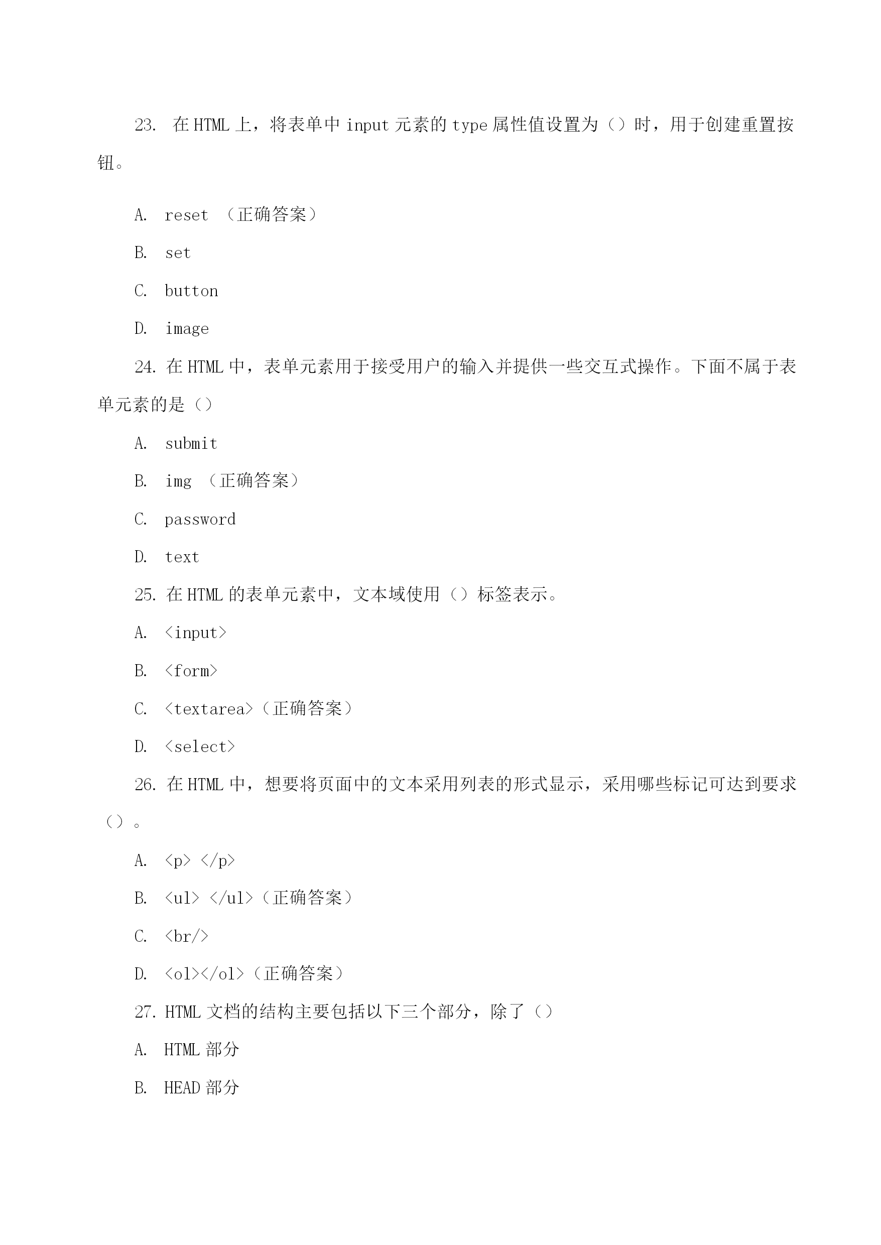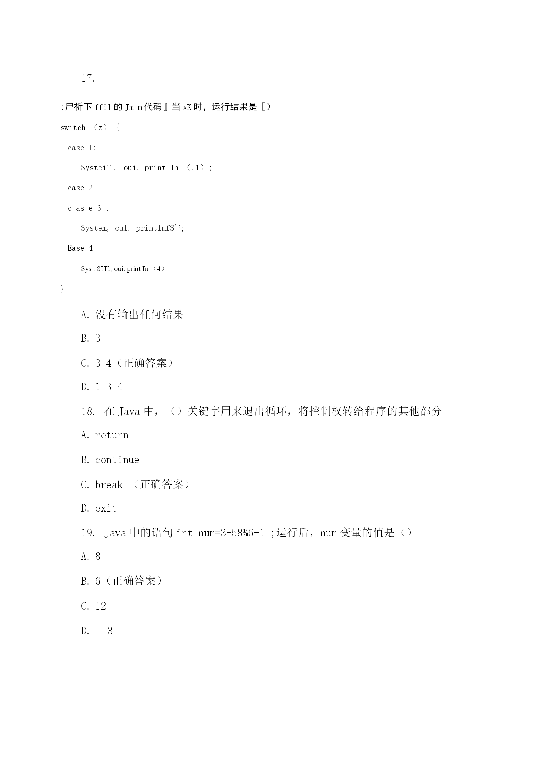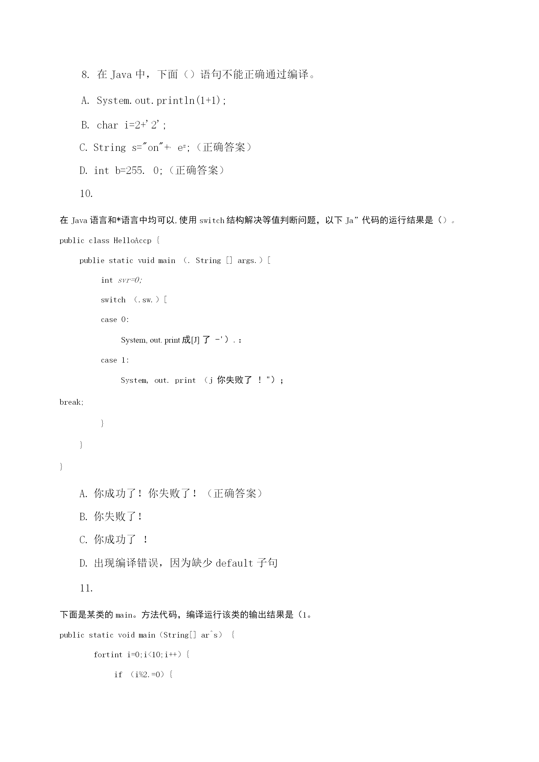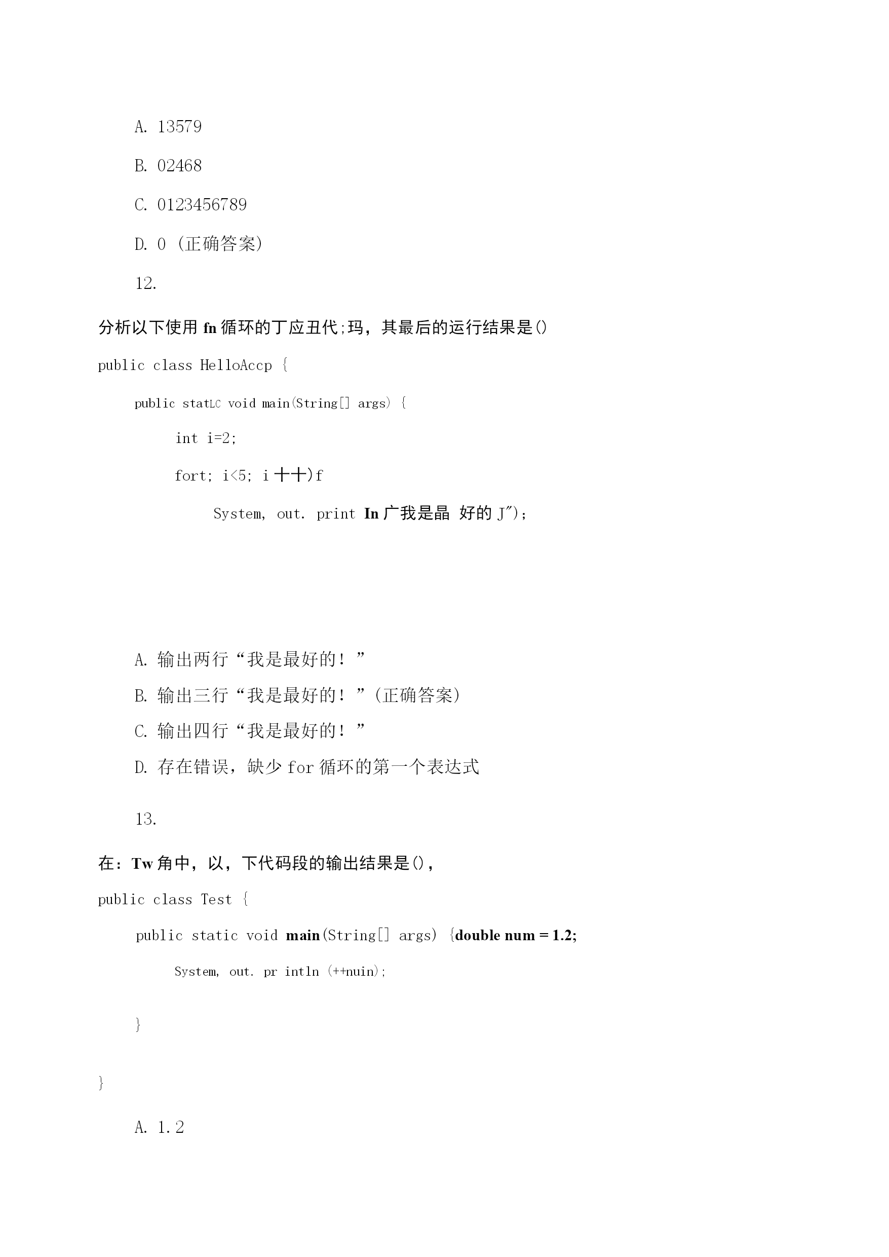 java程序设计期末理论模拟测试编译Java源程序后产生的字节码文件的扩展名为()。.java.class(正确答案).html.exe开发Java程序的步骤包括运行、编写、编译,它们的先后顺序是()。运行->编写->编译编写->编译->运行(正确答案)编译->编写->运行编写->运行->编译在Java中,main()方法书写正确的是()。publicvoidmain(string[]args)publicstaticmain(String[]args)publicvoidstaticmain(string[]args)publicstaticvoidmain(String[]args)(正确答案)下列选项中,能实现在控制台输出“祝你好运”,并在输出后换行的是(祝你好运);System.out.print("祝你好运");(祝你好运);System.out.println("祝你好运");(正确答案)在Java中,多行注释使用()符号结尾。//(正确答案)C.//在Java中,下列()是合法的标识符。12classTOC\o"1-5"\h\zvoid-5-blank(正确答案)7.下面Java代码中,conditionl和mnditicinN取何值时!会输出“货到付款"四个字()°booleanconditionl=,condition2=;if(conditionl){if(conditions){System,out.printlnf^在线支付*);}else{System,out.printlnf^货到付款*);}}truetruetruefalse(正确答案)falsetruefalsefasle在Java中,Scanner类提供从控制台获取键盘输入的功能,若想使用此类需要在Java源代码第一行添加导入语句()。importjava.util.Scanner;(正确答案)importjava.util.;(正确答案)importjava.util;importScanner;在Java中,下面()语句不能正确通过编译。System.out.println(1+1);chari=2+'2';Strings="on"+,ez;(正确答案)intb=255.0;(正确答案)10.在Java语言和*语言中均可以,使用switch结构解决等值判断问题,以下Ja”代码的运行结果是()。publicclassHelloAccp{publiestaticvuidmain(.String[]args.)[intsvr=O;switch(.sw.)[case0:System,out.print成[J]了-').:case1:System,out.print(j你失败了!");break;}}}你成功了!你失败了!(正确答案)你失败了!你成功了!出现编译错误,因为缺少default子句11.下面是某类的main。方法代码,编译运行该类的输出结果是(1。publicstaticvoidmain(String[]ar^s){fortinti=0;i<10;i++){if(i%2.=0){break;System^out.printt.i.);135790246801234567890(正确答案)12.分析以下使用fn循环的丁应丑代;玛,其最后的运行结果是()publicclassHelloAccp{publicstatlcvoidmain(String[]args){inti=2;fort;i<5;i十十)fSystem,out.printIn广我是晶好的J");输出两行“我是最好的!”输出三行“我是最好的!”(正确答案)输出四行“我是最好的!”存在错误,缺少for循环的第一个表达式13.在:Tw角中,以,下代码段的输出结果是(),publicclassTest{publicstaticvoidmain(String[]args){doublenum=1.2;System,out.println(++nuin);}}1.22.42.2(正确答案)运行时错误14.在丁找“中有如下代码,则输出结果为()opublicclassTest{publicstaticvoidmain(String[]args){int1=0;while(i>10){System,out.printlnJaira程序员J;输出10遍“我是Java程序员!”什么也没输出(正确答案)编译错误死循环在Java程序中,对于数据类型为boolean的变