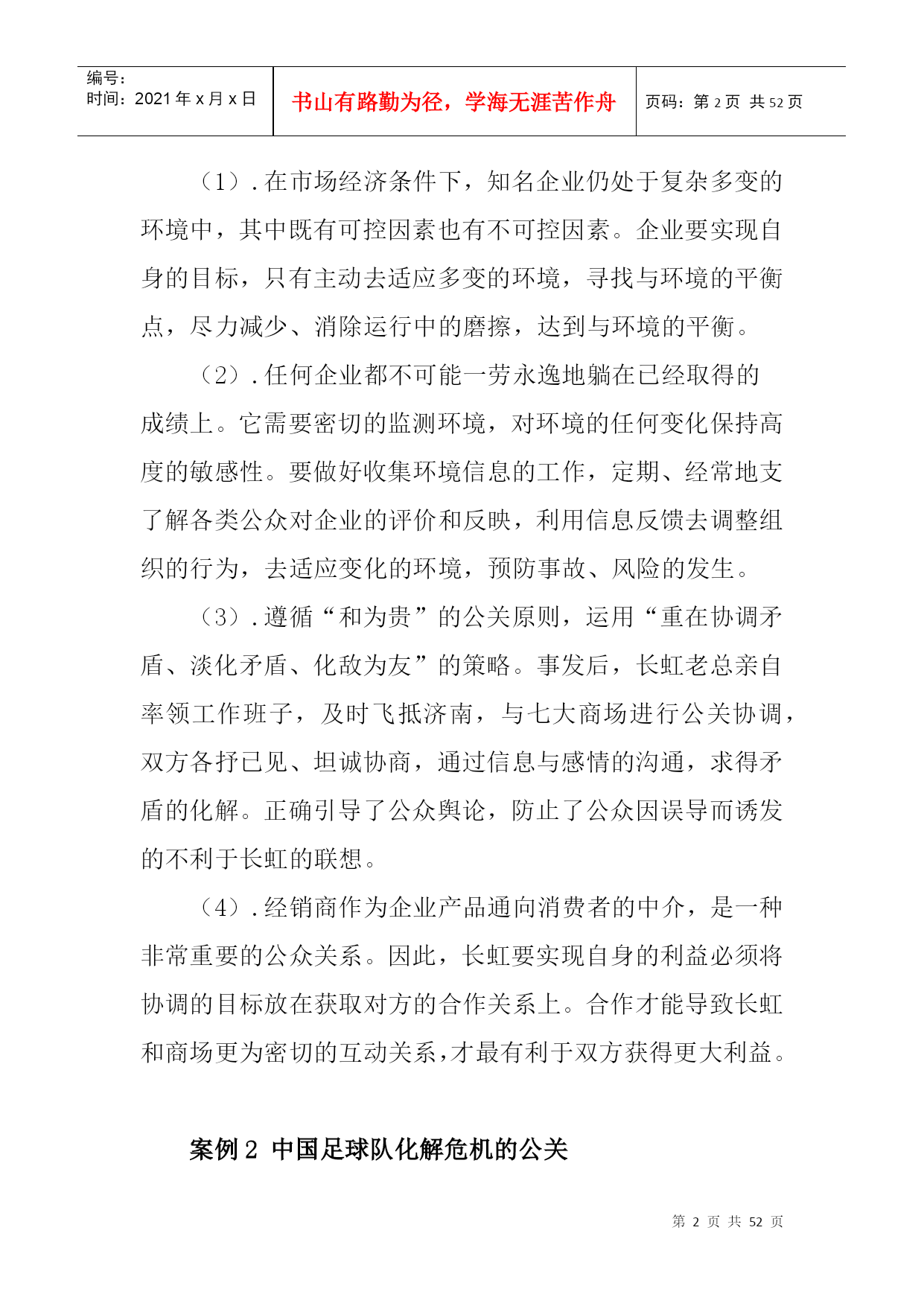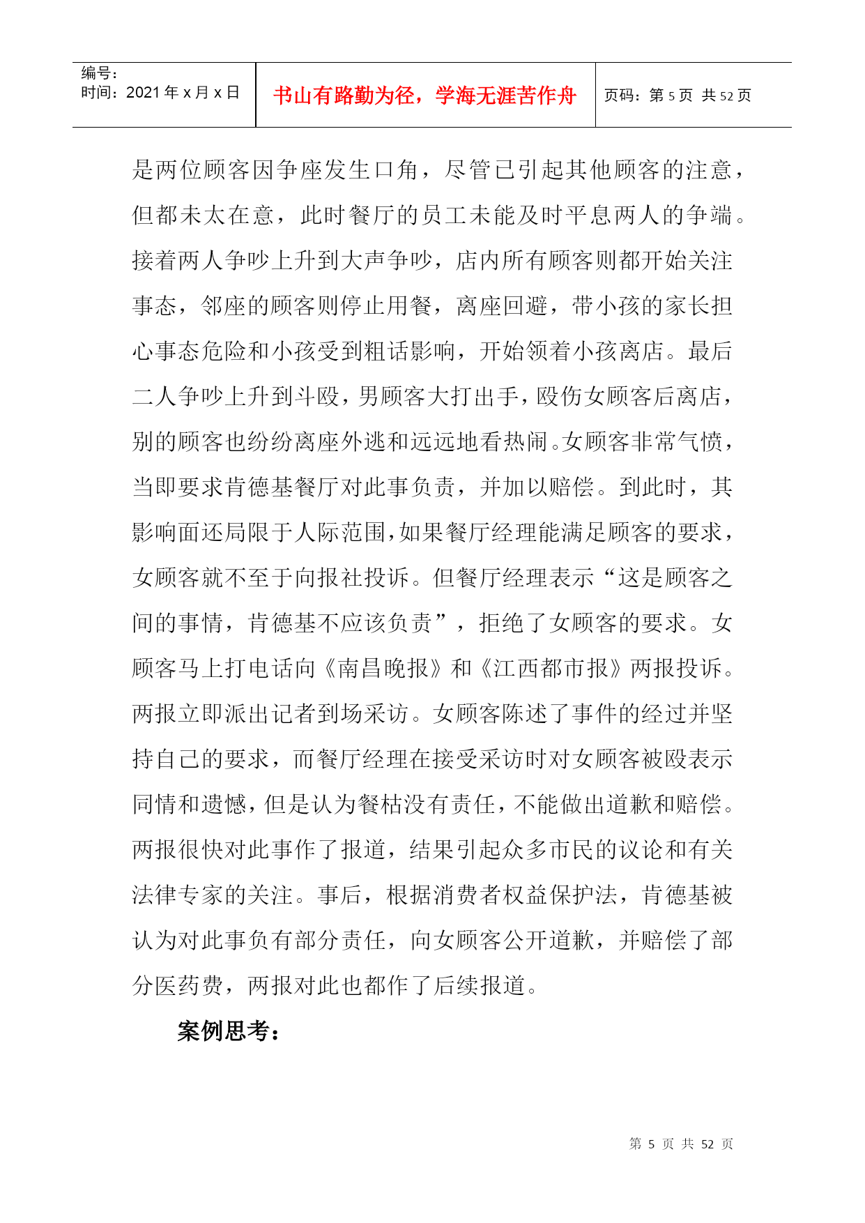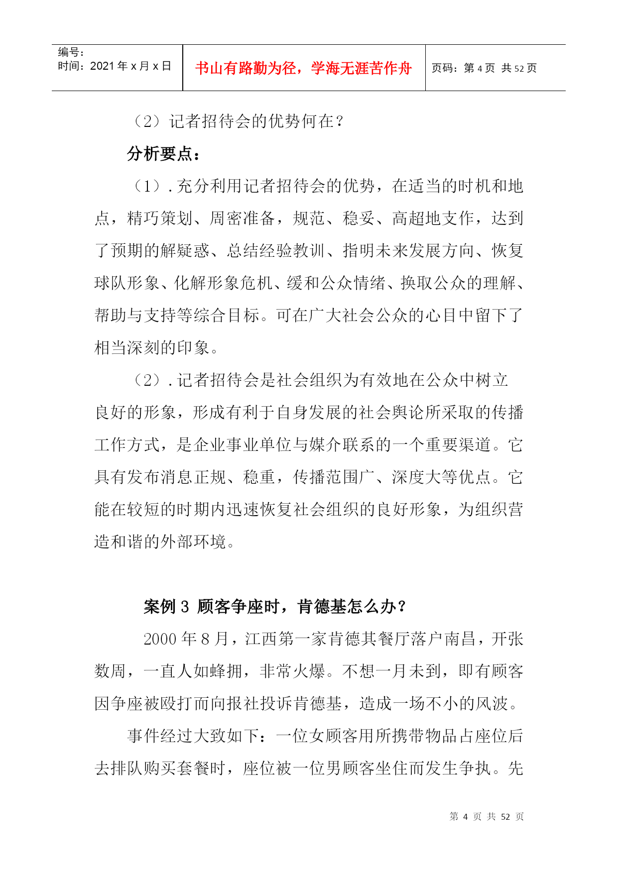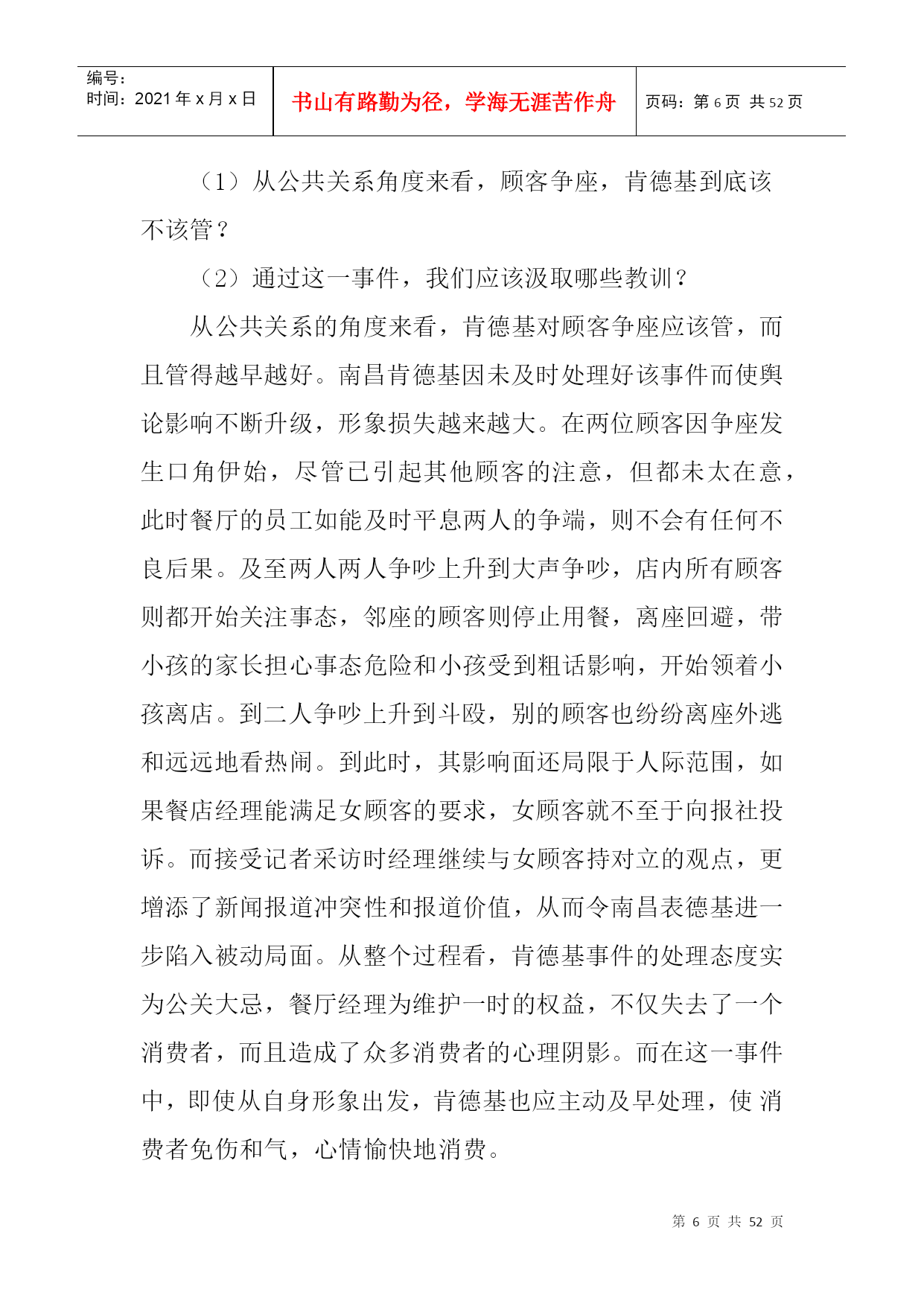 编号:时间:2021年x月x日书山有路勤为径,学海无涯苦作舟页码:第PAGE52页共NUMPAGES52页第PAGE\*MERGEFORMAT52页共NUMPAGES\*MERGEFORMAT52页公共关系学案例分析案例1商场联合拒销“长虹”,“长虹”如何化险为夷?1998年2月,春节的喜庆气氛还没消失,四川长虹彩电却在济南商场栽了跟斗——被七家商场联合“拒售”。这意味着长将在济南失去市场。在家电竞争日益激烈的今天,企业还有什么比失支去市场更大的风险?再者,今天有济南“拒售”,明天再有别家效仿又该如何?为什么“拒售”?据商家一方理由是“售后服务”不好;而长虹方面说每天有四辆流动服务车在市内流动维修,而济南消费者协会也证实没有关于长虹的投诉。这究竟是怎么一回事?一时间公众议论纷纷,多家媒体也作了追踪报道。据报载,长虹老总在事发后立即率领一班人马前往济南与七大商家进行斡旋,双方均表示“有话好好说”,争取及早平息风波,取得圆满解决。案例思考:(1)在激烈的市场竞争中,有知名度的企业仍应注意哪些问题?(2)面对突发事件,公关主体应遵循怎样的思路,运用怎样的办法来解决矛盾?分析要点:(1).在市场经济条件下,知名企业仍处于复杂多变的环境中,其中既有可控因素也有不可控因素。企业要实现自身的目标,只有主动去适应多变的环境,寻找与环境的平衡点,尽力减少、消除运行中的磨擦,达到与环境的平衡。(2).任何企业都不可能一劳永逸地躺在已经取得的成绩上。它需要密切的监测环境,对环境的任何变化保持高度的敏感性。要做好收集环境信息的工作,定期、经常地支了解各类公众对企业的评价和反映,利用信息反馈去调整组织的行为,去适应变化的环境,预防事故、风险的发生。(3).遵循“和为贵”的公关原则,运用“重在协调矛盾、淡化矛盾、化敌为友”的策略。事发后,长虹老总亲自率领工作班子,及时飞抵济南,与七大商场进行公关协调,双方各抒已见、坦诚协商,通过信息与感情的沟通,求得矛盾的化解。正确引导了公众舆论,防止了公众因误导而诱发的不利于长虹的联想。(4).经销商作为企业产品通向消费者的中介,是一种非常重要的公众关系。因此,长虹要实现自身的利益必须将协调的目标放在获取对方的合作关系上。合作才能导致长虹和商场更为密切的互动关系,才最有利于双方获得更大利益。案例2中国足球队化解危机的公关1997年11月8日凌晨,世界杯亚洲区预选赛十强赛卡塔尔、伊朗之战终场哨响,预示着中国足球队新一轮冲击世界杯再次失利。以后的比赛,对中国队来说,仅仅具有形式上的意义。民众的疑惑、失望、忿恨、痛苦溢于言表,外在化、激情化的言辞、行动不断出现有各种媒体上。中国队的能力受到极大的怀疑,形象遇到前所未有的危机。“给民众一个说法”已是大势所趋。11月13日,中国足球队在大连东方大厦举行记者招待会。足球常务副主席王俊生为主要发言人、国家体委宣传司司长何慧娴为主持人,教练组成员戚务生、金志扬、迟尚斌、陈熙荣,运动员代表范志毅、徐弘、区楚良等出席会议。何女士首先表达了中国队非常希望与新闻媒体见面,共同为中国足球会诊的真诚愿望。王俊生接着作长篇发言,分析此次失利的主要原因:判断出偏差,发挥欠稳定,战术组合需要尽快提高,关键时刻在关键位置上出现了技术失误,导致失分。亿他和其他发言人还回答了记者提出的问题。会上发布了中国队致全国球迷的一封公开信《擦干眼泪,奋起直追》。来自全国各地的新闻单位的百余名记者参加了2小时的记者招待会。案例思考:(1)社会组织如何化解形象危机?(2)记者招待会的优势何在?分析要点:(1).充分利用记者招待会的优势,在适当的时机和地点,精巧策划、周密准备,规范、稳妥、高超地支作,达到了预期的解疑惑、总结经验教训、指明未来发展方向、恢复球队形象、化解形象危机、缓和公众情绪、换取公众的理解、帮助与支持等综合目标。可在广大社会公众的心目中留下了相当深刻的印象。(2).记者招待会是社会组织为有效地在公众中树立良好的形象,形成有利于自身发展的社会舆论所采取的传播工作方式,是企业事业单位与媒介联系的一个重要渠道。它具有发布消息正规、稳重,传播范围广、深度大等优点。它能在较短的时期内迅速恢复社会组织的良好形象,为组织营造和谐的外部环境。案例3顾客争座时,肯德基怎么办?2000年8月,江西第一家肯德其餐厅落户南昌,开张数周,一直人如蜂拥,非常火爆。不想一月未到,即有顾客因争座被殴打而向报社投诉肯德基,造成一场不小的风波。事件经过大致如下:一位女顾客用所携带物品占座位后去排队购买套餐时,座位被一位男顾客坐住而发生争执。先是两位顾客因争座发生口角,尽管已引起其他顾客的注意,但都未太在意,此时餐厅的员工未能及时平息两人的争端。接着两人争吵上