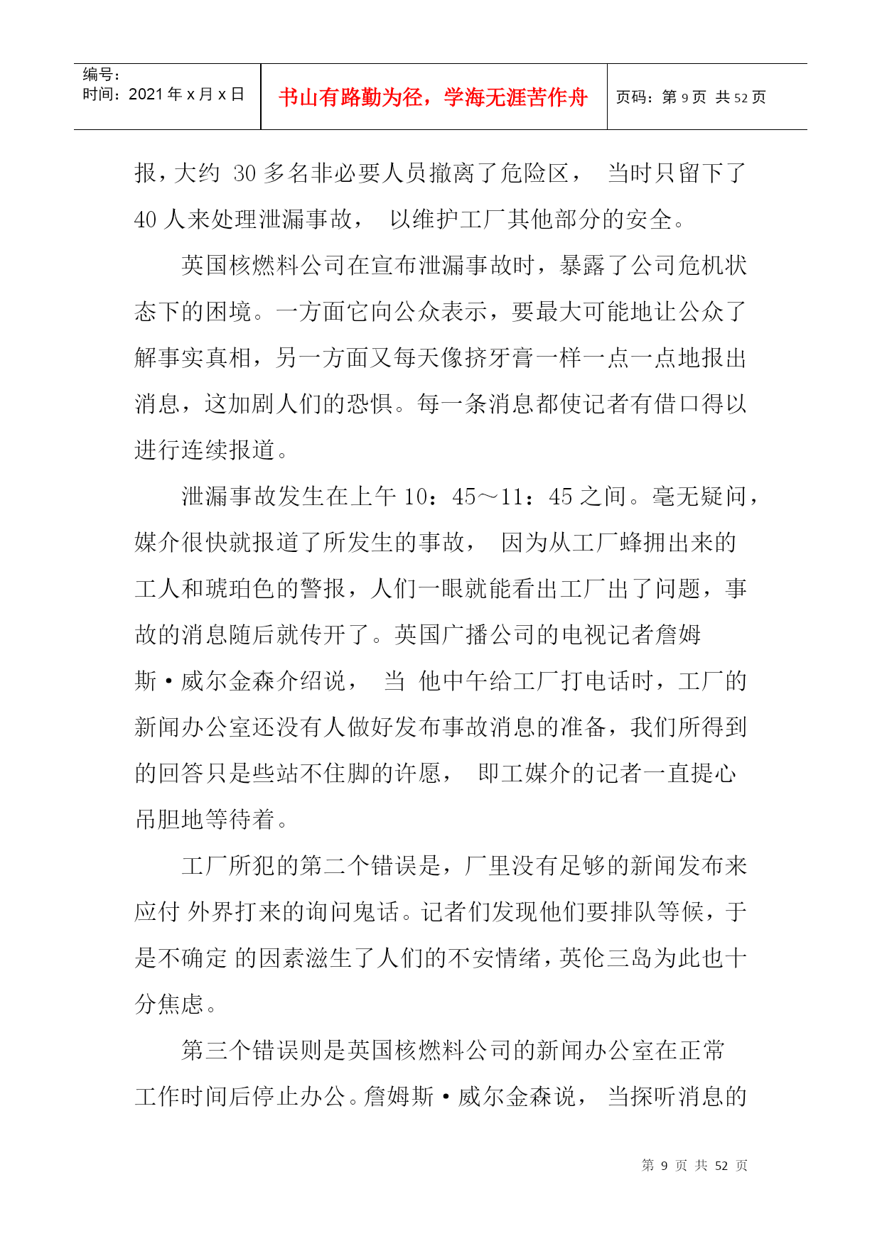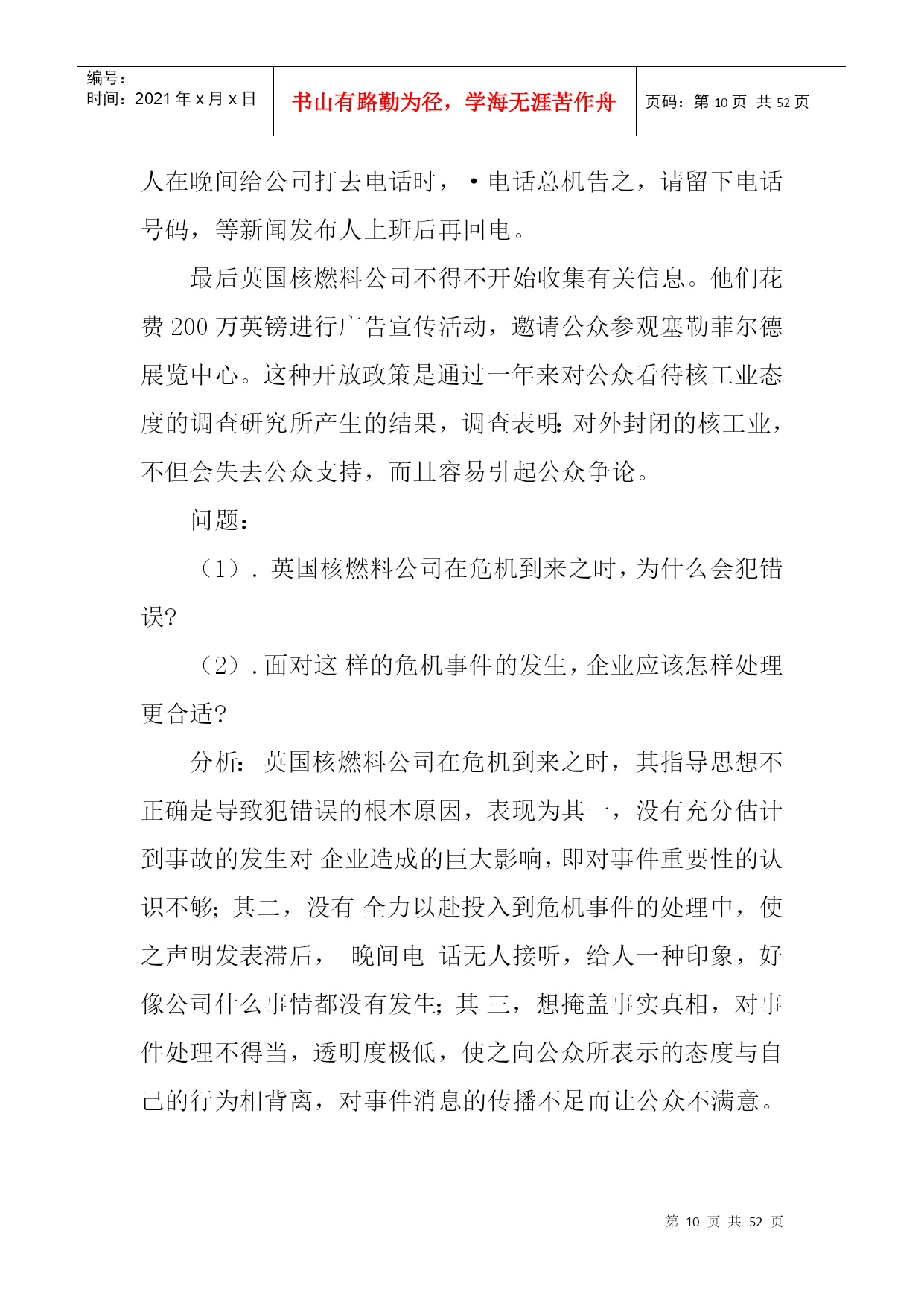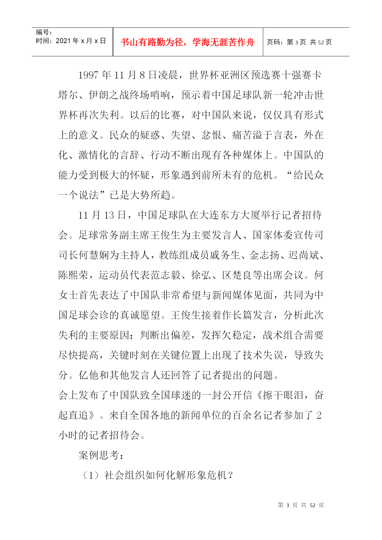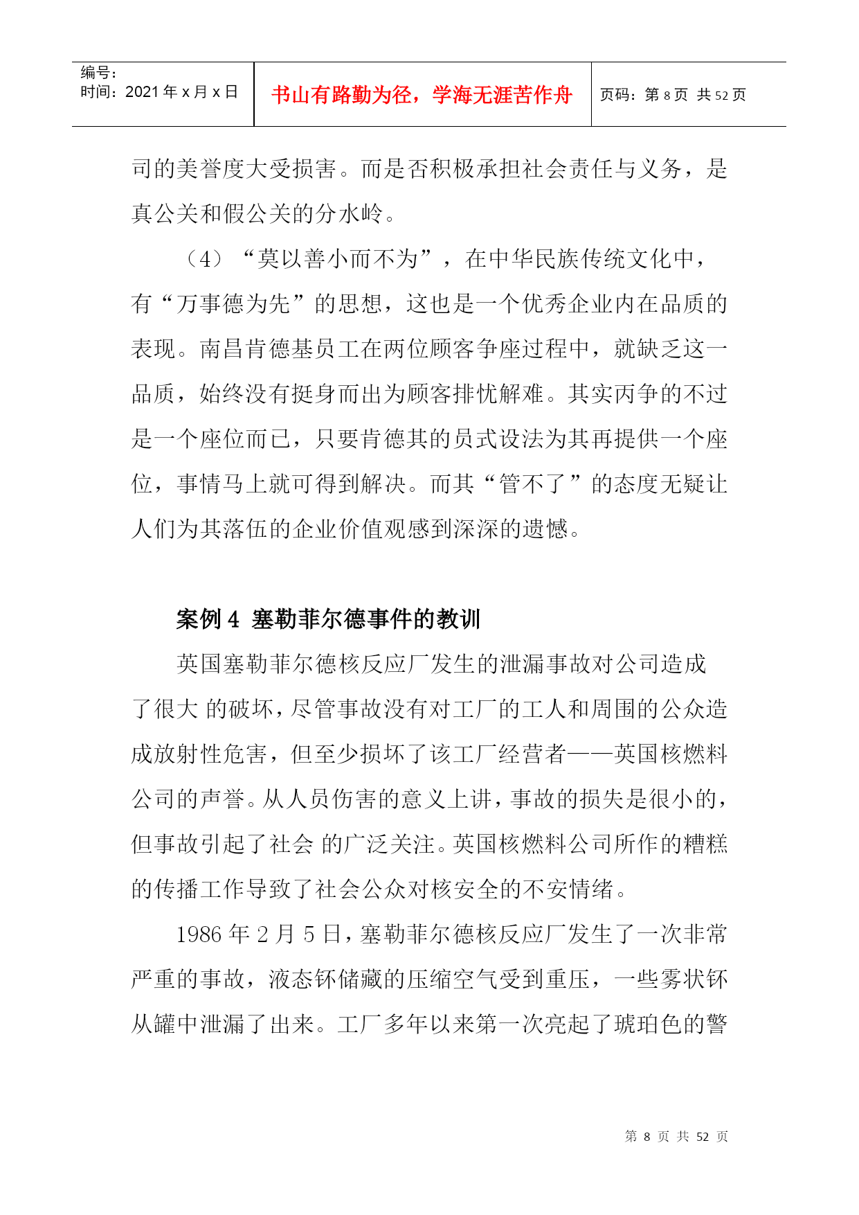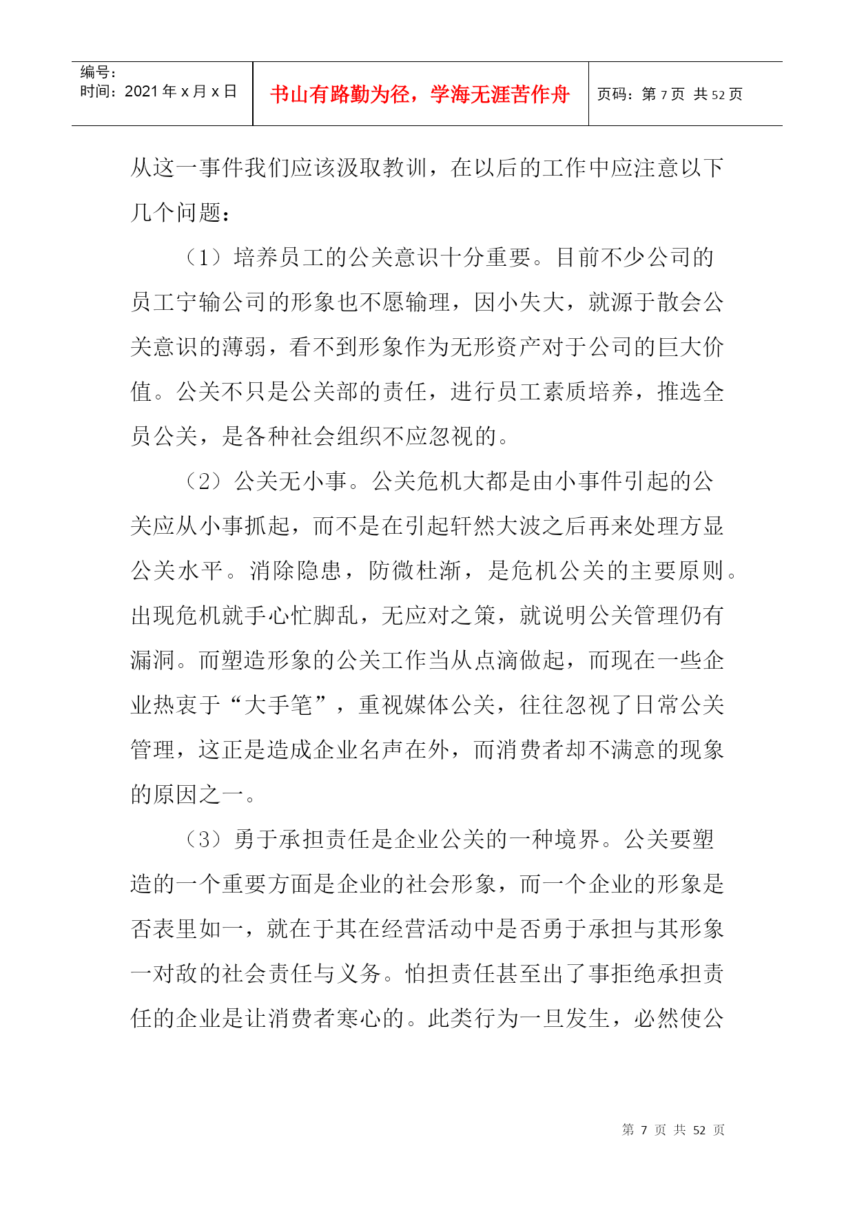 编号:时间:2021年x月x日书山有路勤为径,学海无涯苦作舟页码:第PAGE52页共NUMPAGES52页第PAGE\*MERGEFORMAT52页共NUMPAGES\*MERGEFORMAT52页公共关系学案例分析案例1商场联合拒销“长虹”,“长虹”如何化险为夷?1998年2月,春节的喜庆气氛还没消失,四川长虹彩电却在济南商场栽了跟斗——被七家商场联合“拒售”。这意味着长将在济南失去市场。在家电竞争日益激烈的今天,企业还有什么比失支去市场更大的风险?再者,今天有济南“拒售”,明天再有别家效仿又该如何?为什么“拒售”?据商家一方理由是“售后服务”不好;而长虹方面说每天有四辆流动服务车在市内流动维修,而济南消费者协会也证实没有关于长虹的投诉。这究竟是怎么一回事?一时间公众议论纷纷,多家媒体也作了追踪报道。据报载,长虹老总在事发后立即率领一班人马前往济南与七大商家进行斡旋,双方均表示“有话好好说”,争取及早平息风波,取得圆满解决。案例思考:(1)在激烈的市场竞争中,有知名度的企业仍应注意哪些问题?(2)面对突发事件,公关主体应遵循怎样的思路,运用怎样的办法来解决矛盾?分析要点:(1).在市场经济条件下,知名企业仍处于复杂多变的环境中,其中既有可控因素也有不可控因素。企业要实现自身的目标,只有主动去适应多变的环境,寻找与环境的平衡点,尽力减少、消除运行中的磨擦,达到与环境的平衡。(2).任何企业都不可能一劳永逸地躺在已经取得的成绩上。它需要密切的监测环境,对环境的任何变化保持高度的敏感性。要做好收集环境信息的工作,定期、经常地支了解各类公众对企业的评价和反映,利用信息反馈去调整组织的行为,去适应变化的环境,预防事故、风险的发生。(3).遵循“和为贵”的公关原则,运用“重在协调矛盾、淡化矛盾、化敌为友”的策略。事发后,长虹老总亲自率领工作班子,及时飞抵济南,与七大商场进行公关协调,双方各抒已见、坦诚协商,通过信息与感情的沟通,求得矛盾的化解。正确引导了公众舆论,防止了公众因误导而诱发的不利于长虹的联想。(4).经销商作为企业产品通向消费者的中介,是一种非常重要的公众关系。因此,长虹要实现自身的利益必须将协调的目标放在获取对方的合作关系上。合作才能导致长虹和商场更为密切的互动关系,才最有利于双方获得更大利益。案例2中国足球队化解危机的公关1997年11月8日凌晨,世界杯亚洲区预选赛十强赛卡塔尔、伊朗之战终场哨响,预示着中国足球队新一轮冲击世界杯再次失利。以后的比赛,对中国队来说,仅仅具有形式上的意义。民众的疑惑、失望、忿恨、痛苦溢于言表,外在化、激情化的言辞、行动不断出现有各种媒体上。中国队的能力受到极大的怀疑,形象遇到前所未有的危机。“给民众一个说法”已是大势所趋。11月13日,中国足球队在大连东方大厦举行记者招待会。足球常务副主席王俊生为主要发言人、国家体委宣传司司长何慧娴为主持人,教练组成员戚务生、金志扬、迟尚斌、陈熙荣,运动员代表范志毅、徐弘、区楚良等出席会议。何女士首先表达了中国队非常希望与新闻媒体见面,共同为中国足球会诊的真诚愿望。王俊生接着作长篇发言,分析此次失利的主要原因:判断出偏差,发挥欠稳定,战术组合需要尽快提高,关键时刻在关键位置上出现了技术失误,导致失分。亿他和其他发言人还回答了记者提出的问题。会上发布了中国队致全国球迷的一封公开信《擦干眼泪,奋起直追》。来自全国各地的新闻单位的百余名记者参加了2小时的记者招待会。案例思考:(1)社会组织如何化解形象危机?(2)记者招待会的优势何在?分析要点:(1).充分利用记者招待会的优势,在适当的时机和地点,精巧策划、周密准备,规范、稳妥、高超地支作,达到了预期的解疑惑、总结经验教训、指明未来发展方向、恢复球队形象、化解形象危机、缓和公众情绪、换取公众的理解、帮助与支持等综合目标。可在广大社会公众的心目中留下了相当深刻的印象。(2).记者招待会是社会组织为有效地在公众中树立良好的形象,形成有利于自身发展的社会舆论所采取的传播工作方式,是企业事业单位与媒介联系的一个重要渠道。它具有发布消息正规、稳重,传播范围广、深度大等优点。它能在较短的时期内迅速恢复社会组织的良好形象,为组织营造和谐的外部环境。案例3顾客争座时,肯德基怎么办?2000年8月,江西第一家肯德其餐厅落户南昌,开张数周,一直人如蜂拥,非常火爆。不想一月未到,即有顾客因争座被殴打而向报社投诉肯德基,造成一场不小的风波。事件经过大致如下:一位女顾客用所携带物品占座位后去排队购买套餐时,座位被一位男顾客坐住而发生争执。先是两位顾客因争座发生口角,尽管已引起其他顾客的注意,但都未太在意,此时餐厅的员工未能及时平息两人的争端。接着两人争吵上