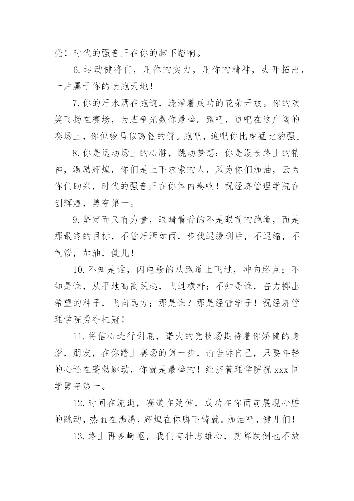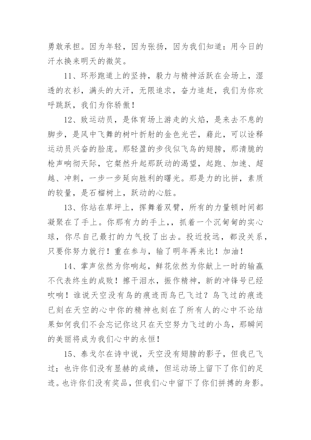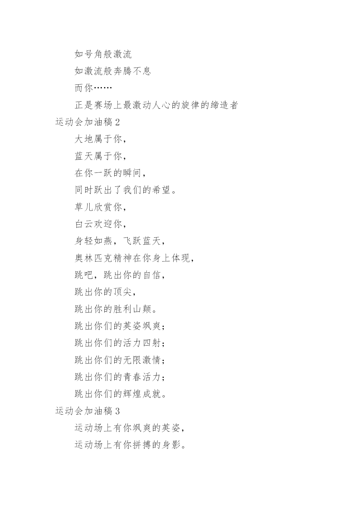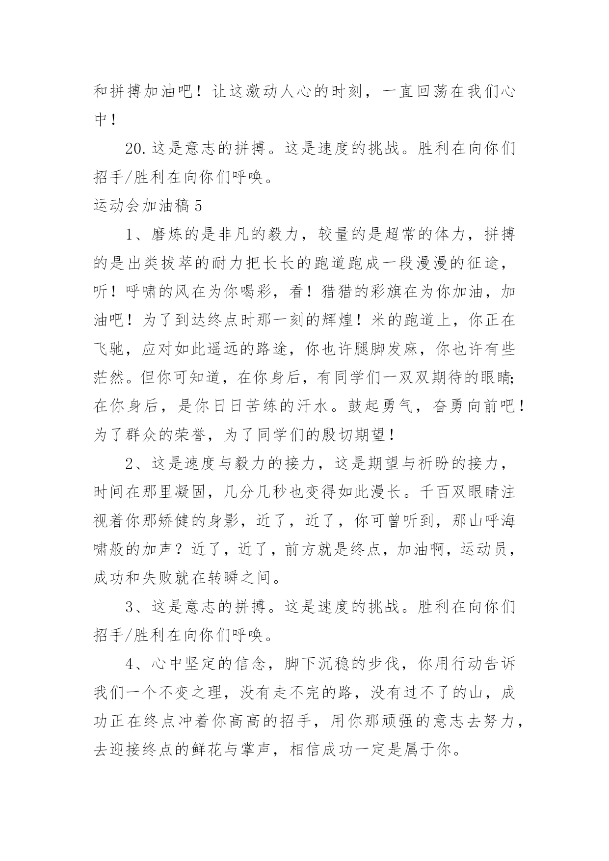 运动会加油稿运动会加油稿在发展不断提速的社会中,我们用到加油稿的地方越来越多,加油稿可以起到活跃气氛的作用。你所见过的加油稿是什么样的呢?下面是小编为大家收集的运动会加油稿,供大家参考借鉴,希望可以帮助到有需要的朋友。运动会加油稿1【致跑步运动员】那是毅力与速度的挑战是激情与汗水的诠释拼搏,从这里开始胜利。在这边召唤向前,向前不论成功与否,你已曾经拥有曾记否,在终点欢呼,惊震四周你听那激烈奔跑的脚步震撼大地你听那欢呼加油的呐喊声催人奋进赛场上的旋律如旋风般急速如号角般激流如激流般奔腾不息而你……正是赛场上最激动人心的旋律的缔造者运动会加油稿2大地属于你,蓝天属于你,在你一跃的瞬间,同时跃出了我们的希望。草儿欣赏你,白云欢迎你,身轻如燕,飞跃蓝天,奥林匹克精神在你身上体现,跳吧,跳出你的自信,跳出你的顶尖,跳出你的胜利山颠。跳出你们的英姿飒爽;跳出你们的活力四射;跳出你们的无限激情;跳出你们的青春活力;跳出你们的辉煌成就。运动会加油稿3运动场上有你飒爽的英姿,运动场上有你拼搏的身影。面对着漫漫征途,你没有畏惧和退缩。任汗水大湿脊背,任疲惫爬满全身,你依然奋力追赶,只有一个目标,只有一个信念。为了班级的荣誉,拼搏吧,让我为你们呐喊。运动会加油稿41.天空更加蔚蓝,阳光更加灿烂,草地如翡翠一般,跑到更加鲜艳;而你,定会更加自信,你的成绩,必然更加辉煌。经济管理学院祝xxx同学勇夺第一。2.运动健将们,用你的实力,用你的精神,去开拓出,一片属于你的长跑天地;踏上跑道,是一种选择。离开起点,是一种勇气。驰骋赛场,是一种胜利;广阔的绿茵场,是为你们搭建的舞台。张扬吧,年轻的心,我们将为你永远喝彩!3.为了希望,为了胜利,运动健儿们,战出属于我们青春的梦想,经济管理学院加油吧!我们是最棒的!4.时间在流逝,赛道在延伸,成功在你面前展现心脏的跳动,热血在沸腾,辉煌在你脚下铸就加油吧,健儿们。5.坚定,执着,耐力与希望,在延伸的白色跑道中点点凝聚!力量,信念,拼搏与奋斗,在遥远的终点线上渐渐明亮!时代的强音正在你的脚下踏响。6.运动健将们,用你的实力,用你的精神,去开拓出,一片属于你的长跑天地!7.你的汗水洒在跑道,浇灌着成功的花朵开放。你的欢笑飞扬在赛场,为班争光数你最棒。跑吧,追吧在这广阔的赛场上,你似骏马似离铉的箭。跑吧,追吧你比虎猛比豹强。8.你是运动场上的心脏,跳动梦想;你是漫长路上的精神,激励辉煌,你们是上下求索的人,风为你们加油,云为你们助兴,时代的强音正在你体内奏响!祝经济管理学院在创辉煌,勇夺第一。9.坚定而又有力量,眼睛看着的不是眼前的跑道,而是那最终的目标,不管汗洒如雨,步伐迟缓到后,不退缩,不气馁,加油,健儿!10.不知是谁,闪电般的从跑道上飞过,冲向终点;不知是谁,从平地高高跃起,飞过横杆;不知是谁,奋力掷出希望的种子,飞向远方;那是谁?那是经管学子!祝经济管理学院勇夺桂冠!11.将信心进行到底,诺大的竞技场期待着你矫健的身影,朋友,在你踏上赛场的第一步,请告诉自己,只要年轻的心还在蓬勃跳动,你就是最棒的!经济管理学院祝xxx同学勇夺第一。12.时间在流逝,赛道在延伸,成功在你面前展现心脏的跳动,热血在沸腾,辉煌在你脚下铸就。加油吧,健儿们!13.路上再多崎岖,我们有壮志雄心,就算跌倒也不放弃,拿出你们炙热的心,赛出崭新的自己,赢得最后的胜利!祝经济管理学院全体同学再创辉煌!14.青春的脚步,青春的速度,青春的活力,青春的激情,将会在你们的身上尽情体现。迎接自我,挑战自我,战胜自我!我们相信你们一定能行,加油吧,运动员!终点就在眼前!15.加油吧,健儿们,年轻的我们自信飞扬,青春的气息如同出生的朝阳,蓬勃的力量如同阳光挥洒,论何成功,谈何荣辱,你们永远是我们的骄傲。经济管理学院祝全体运动员赛场加油!16.相信自己,你将赢得胜利,创造奇迹;相信自己,梦想在你手中,这是你的天地。当一切过去,你们将是第一。相信自己,你将超越极限,超越自己!相信自己,加油吧,相信你自己。17.心中坚定的信念,脚下沉稳的步伐,你用行动告诉我们一个不变之理,没有走不完的路,没有过不了的山,成功正在终点冲着你高高的招手,用你那顽强的意志去努力,去迎接终点的鲜花与掌声,迎接自我,挑战自我,战胜自我!我们相信成功一定是属于你。加油吧,终点就在眼前!18.不长不短的距离,需要的是全身心全程投入;自始至终,你们都在拼全力;此时此刻,你们处在最风光的一刻;无论第几,坚持胜利的信心,只要跑下来,你们就是英雄!19.一根小小的木棒,连接的是团结和友爱一根小小的木棒,传递的是勇气和力量一根小小的木棒,演绎的是奋斗和拼搏加油吧!让这激动人心的时刻,一直回荡在我们心中!20.这是意志的拼搏。这是速度的挑战。胜利在向你们招手/胜利在向你们呼唤。运动会加油稿51、磨炼