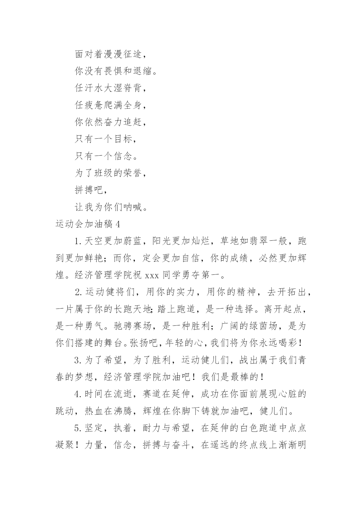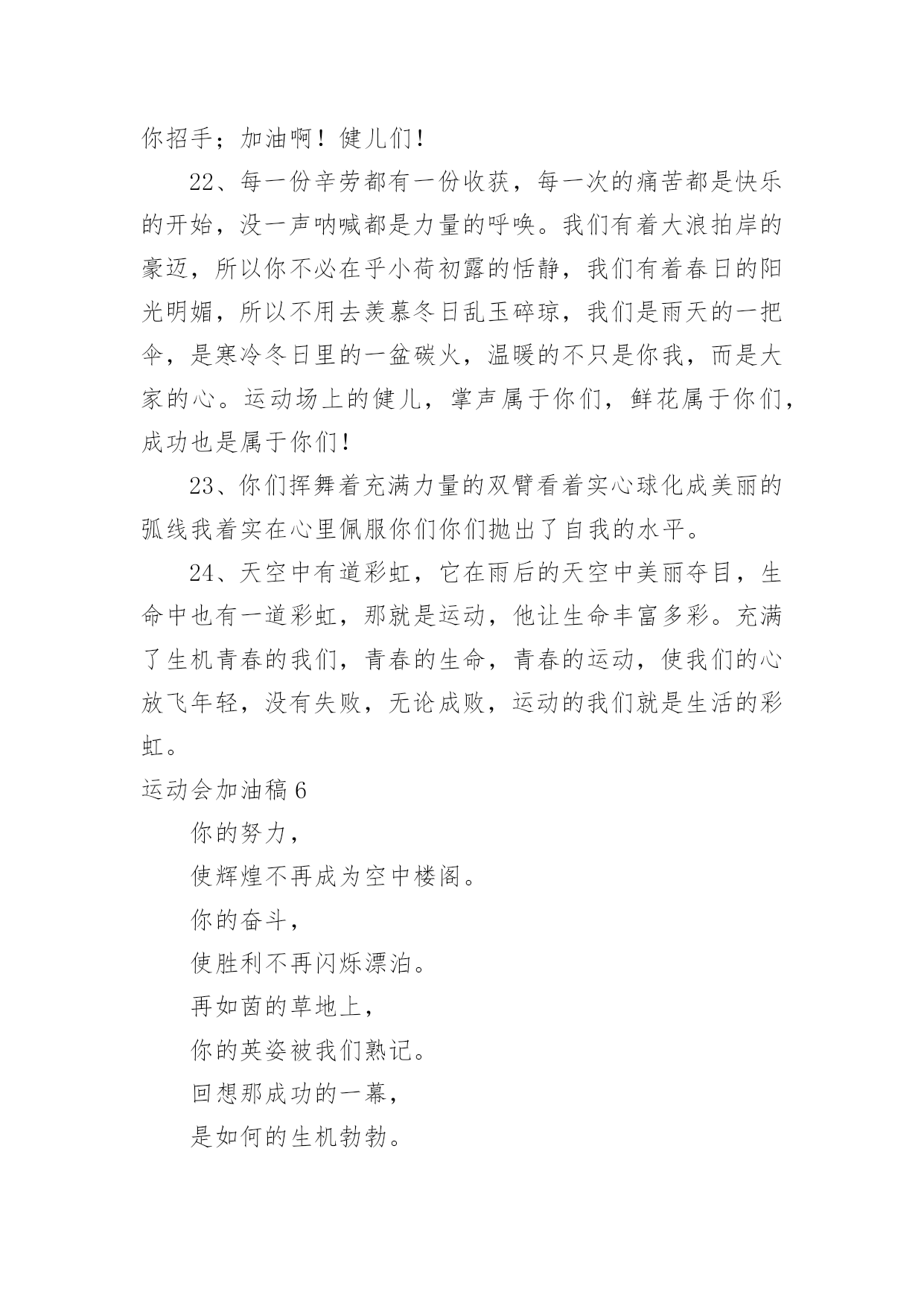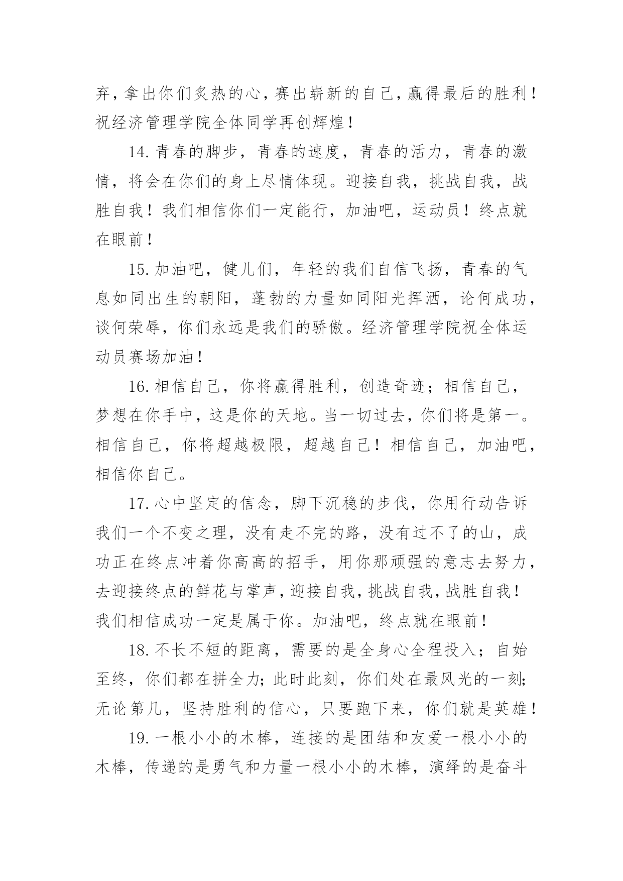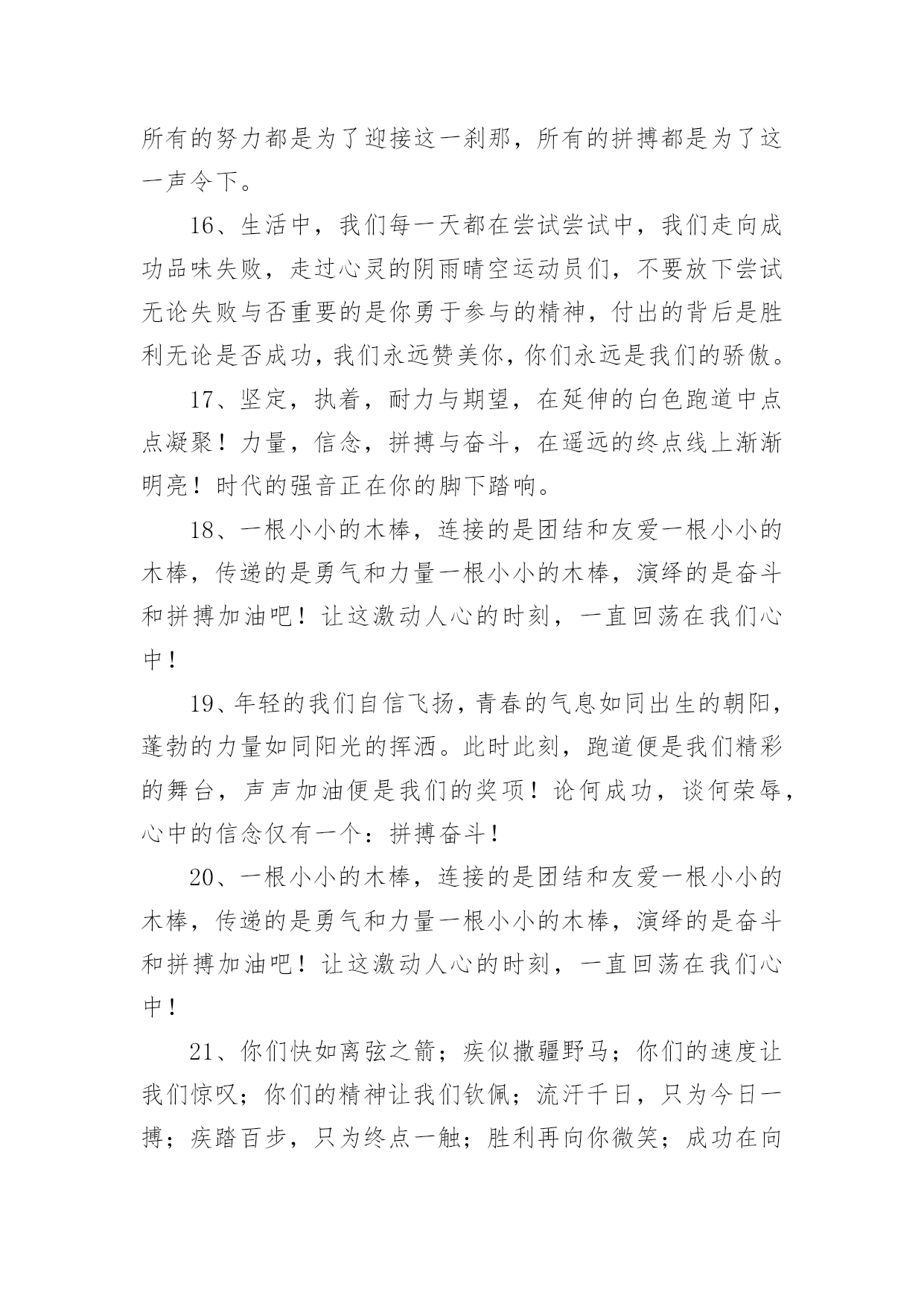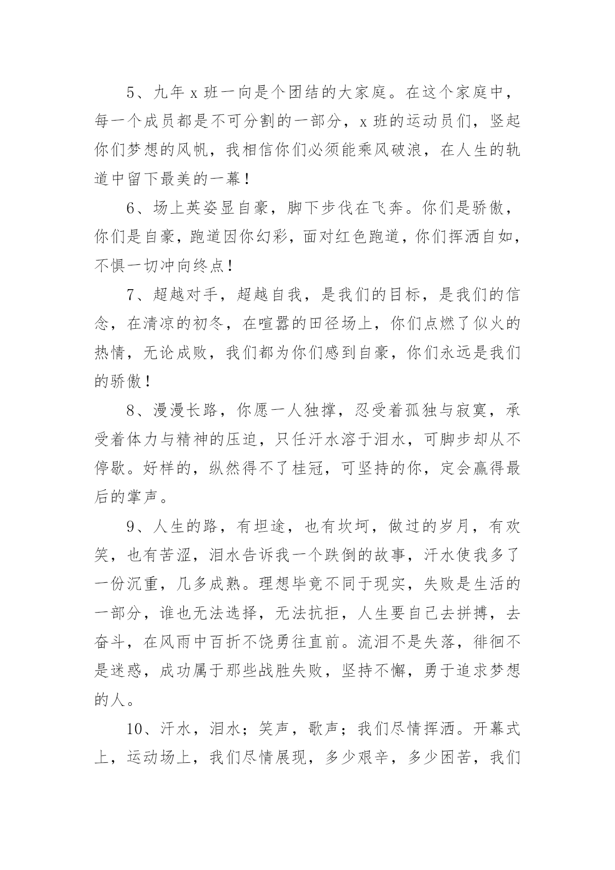 运动会加油稿运动会加油稿在发展不断提速的社会中,我们用到加油稿的地方越来越多,加油稿可以起到活跃气氛的作用。你所见过的加油稿是什么样的呢?下面是小编为大家收集的运动会加油稿,供大家参考借鉴,希望可以帮助到有需要的朋友。运动会加油稿1【致跑步运动员】那是毅力与速度的挑战是激情与汗水的诠释拼搏,从这里开始胜利。在这边召唤向前,向前不论成功与否,你已曾经拥有曾记否,在终点欢呼,惊震四周你听那激烈奔跑的脚步震撼大地你听那欢呼加油的呐喊声催人奋进赛场上的旋律如旋风般急速如号角般激流如激流般奔腾不息而你……正是赛场上最激动人心的旋律的缔造者运动会加油稿2大地属于你,蓝天属于你,在你一跃的瞬间,同时跃出了我们的希望。草儿欣赏你,白云欢迎你,身轻如燕,飞跃蓝天,奥林匹克精神在你身上体现,跳吧,跳出你的自信,跳出你的顶尖,跳出你的胜利山颠。跳出你们的英姿飒爽;跳出你们的活力四射;跳出你们的无限激情;跳出你们的青春活力;跳出你们的辉煌成就。运动会加油稿3运动场上有你飒爽的英姿,运动场上有你拼搏的身影。面对着漫漫征途,你没有畏惧和退缩。任汗水大湿脊背,任疲惫爬满全身,你依然奋力追赶,只有一个目标,只有一个信念。为了班级的荣誉,拼搏吧,让我为你们呐喊。运动会加油稿41.天空更加蔚蓝,阳光更加灿烂,草地如翡翠一般,跑到更加鲜艳;而你,定会更加自信,你的成绩,必然更加辉煌。经济管理学院祝xxx同学勇夺第一。2.运动健将们,用你的实力,用你的精神,去开拓出,一片属于你的长跑天地;踏上跑道,是一种选择。离开起点,是一种勇气。驰骋赛场,是一种胜利;广阔的绿茵场,是为你们搭建的舞台。张扬吧,年轻的心,我们将为你永远喝彩!3.为了希望,为了胜利,运动健儿们,战出属于我们青春的梦想,经济管理学院加油吧!我们是最棒的!4.时间在流逝,赛道在延伸,成功在你面前展现心脏的跳动,热血在沸腾,辉煌在你脚下铸就加油吧,健儿们。5.坚定,执着,耐力与希望,在延伸的白色跑道中点点凝聚!力量,信念,拼搏与奋斗,在遥远的终点线上渐渐明亮!时代的强音正在你的脚下踏响。6.运动健将们,用你的实力,用你的精神,去开拓出,一片属于你的长跑天地!7.你的汗水洒在跑道,浇灌着成功的花朵开放。你的欢笑飞扬在赛场,为班争光数你最棒。跑吧,追吧在这广阔的赛场上,你似骏马似离铉的箭。跑吧,追吧你比虎猛比豹强。8.你是运动场上的心脏,跳动梦想;你是漫长路上的精神,激励辉煌,你们是上下求索的人,风为你们加油,云为你们助兴,时代的强音正在你体内奏响!祝经济管理学院在创辉煌,勇夺第一。9.坚定而又有力量,眼睛看着的不是眼前的跑道,而是那最终的目标,不管汗洒如雨,步伐迟缓到后,不退缩,不气馁,加油,健儿!10.不知是谁,闪电般的从跑道上飞过,冲向终点;不知是谁,从平地高高跃起,飞过横杆;不知是谁,奋力掷出希望的种子,飞向远方;那是谁?那是经管学子!祝经济管理学院勇夺桂冠!11.将信心进行到底,诺大的竞技场期待着你矫健的身影,朋友,在你踏上赛场的第一步,请告诉自己,只要年轻的心还在蓬勃跳动,你就是最棒的!经济管理学院祝xxx同学勇夺第一。12.时间在流逝,赛道在延伸,成功在你面前展现心脏的跳动,热血在沸腾,辉煌在你脚下铸就。加油吧,健儿们!13.路上再多崎岖,我们有壮志雄心,就算跌倒也不放弃,拿出你们炙热的心,赛出崭新的自己,赢得最后的胜利!祝经济管理学院全体同学再创辉煌!14.青春的脚步,青春的速度,青春的活力,青春的激情,将会在你们的身上尽情体现。迎接自我,挑战自我,战胜自我!我们相信你们一定能行,加油吧,运动员!终点就在眼前!15.加油吧,健儿们,年轻的我们自信飞扬,青春的气息如同出生的朝阳,蓬勃的力量如同阳光挥洒,论何成功,谈何荣辱,你们永远是我们的骄傲。经济管理学院祝全体运动员赛场加油!16.相信自己,你将赢得胜利,创造奇迹;相信自己,梦想在你手中,这是你的天地。当一切过去,你们将是第一。相信自己,你将超越极限,超越自己!相信自己,加油吧,相信你自己。17.心中坚定的信念,脚下沉稳的步伐,你用行动告诉我们一个不变之理,没有走不完的路,没有过不了的山,成功正在终点冲着你高高的招手,用你那顽强的意志去努力,去迎接终点的鲜花与掌声,迎接自我,挑战自我,战胜自我!我们相信成功一定是属于你。加油吧,终点就在眼前!18.不长不短的距离,需要的是全身心全程投入;自始至终,你们都在拼全力;此时此刻,你们处在最风光的一刻;无论第几,坚持胜利的信心,只要跑下来,你们就是英雄!19.一根小小的木棒,连接的是团结和友爱一根小小的木棒,传递的是勇气和力量一根小小的木棒,演绎的是奋斗和拼搏加油吧!让这激动人心的时刻,一直回荡在我们心中!20.这是意志的拼搏。这是速度的挑战。胜利在向你们招手/胜利在向你们呼唤。运动会加油稿51、磨炼