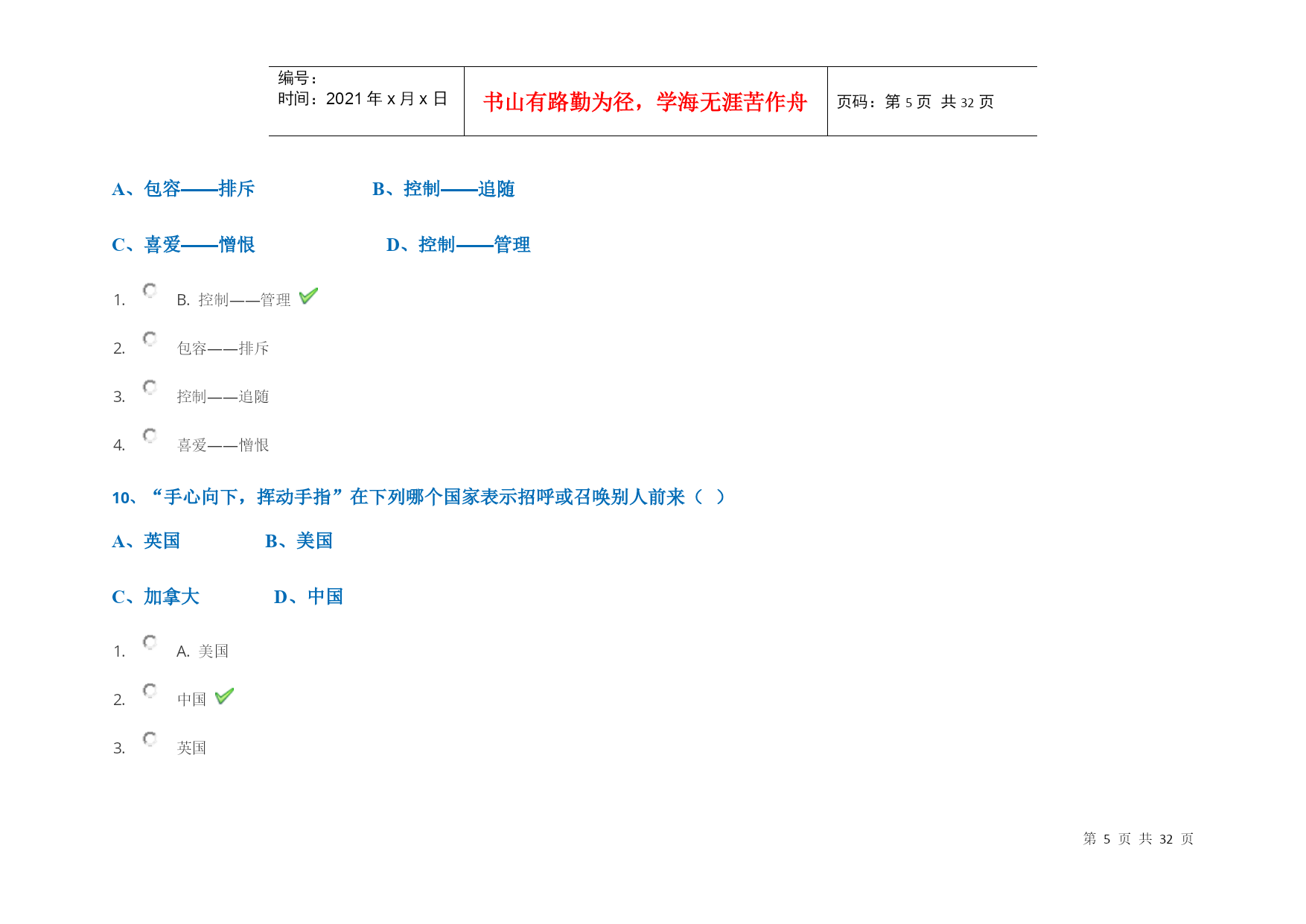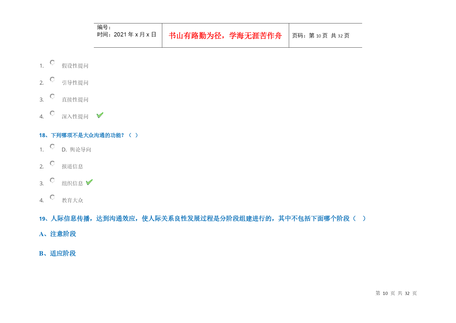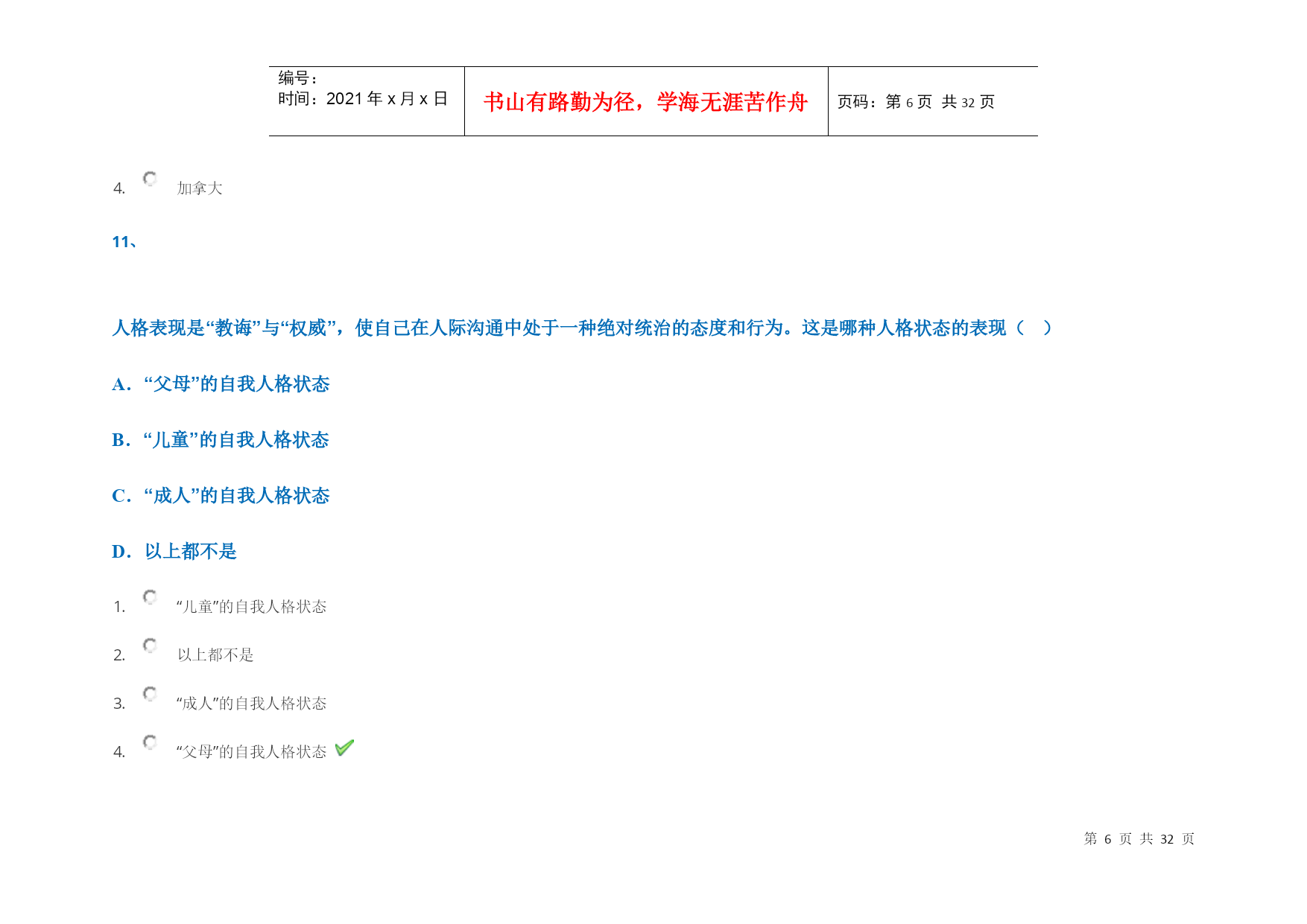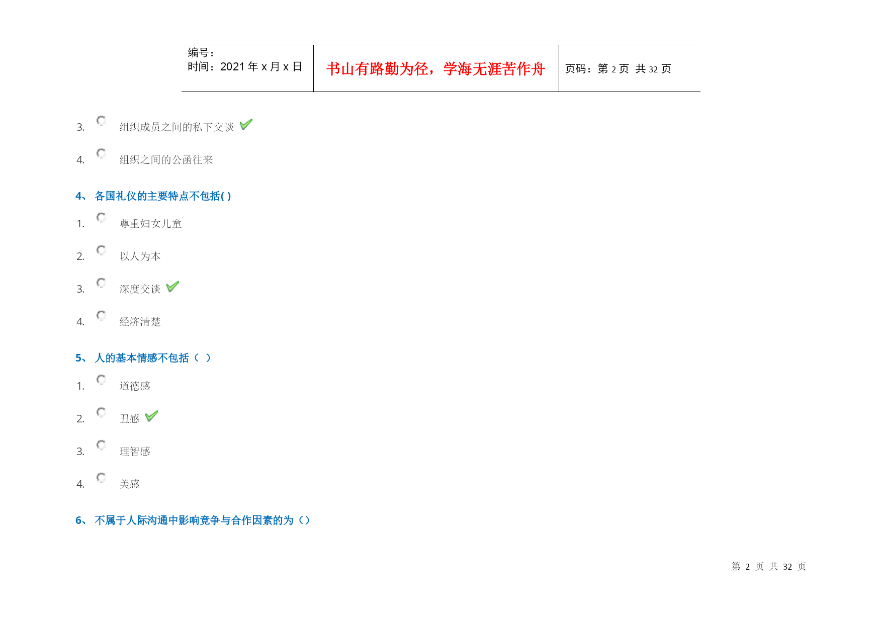 编号:时间:2021年x月x日书山有路勤为径,学海无涯苦作舟页码:第PAGE32页共NUMPAGES32页第PAGE\*MERGEFORMAT32页共NUMPAGES\*MERGEFORMAT32页1、人际信息传播,达到沟通效应,使人际关系良性发展过程是分阶段组建进行的,其中不包括下面哪个阶段()注意阶段适应阶段漠视阶段依附阶段2、人际关系的基本类型不包括()喜爱——憎恨包容——排斥控制——追随控制——管理3、下列选项中属于非正式沟通的是()上级指示文件下达组织成员之间的私下交谈组织之间的公函往来4、各国礼仪的主要特点不包括()尊重妇女儿童以人为本深度交谈经济清楚5、人的基本情感不包括()道德感丑感理智感美感6、不属于人际沟通中影响竞争与合作因素的为()A、C.动机威胁刺激关系7、下列说法中不正确的是()A、孤立的与外界没有任何关系的组织系统实际上是不存在的。B、非正式沟通是组织沟通的主流。C、组织是社会的一个细胞,无论是组织的一般环境还是间接环境都影响着组织活动。D、管理水平和管理效果与管理过程中信息流动的质量、流动的方式,以及对信息的利用水平密切相关。孤立的与外界没有任何关系的组织系统实际上是不存在的。组织是社会的一个细胞,无论是组织的一般环境还是间接环境都影响着组织活动。管理水平和管理效果与管理过程中信息流动的质量、流动的方式,以及对信息的利用水平密切相关。非正式沟通是组织沟通的主流。8、下列哪项不是大众沟通的功能?()A、报道信息B、舆论导向C、组织信息D、教育大众舆论导向报道信息组织信息教育大众9、人际关系的基本类型不包括()A、包容——排斥B、控制——追随C、喜爱——憎恨D、控制——管理B.控制——管理包容——排斥控制——追随喜爱——憎恨10、“手心向下,挥动手指”在下列哪个国家表示招呼或召唤别人前来()A、英国B、美国C、加拿大D、中国A.美国中国英国加拿大11、人格表现是“教诲”与“权威”,使自己在人际沟通中处于一种绝对统治的态度和行为。这是哪种人格状态的表现()A.“父母”的自我人格状态B.“儿童”的自我人格状态C.“成人”的自我人格状态D.以上都不是“儿童”的自我人格状态以上都不是“成人”的自我人格状态“父母”的自我人格状态12、下列选项中属于非正式沟通的是()A、组织之间的公函往来B、文件下达C、上级指示D、组织成员之间的私下交谈组织之间的公函往来组织成员之间的私下交谈上级指示文件下达13、关于制定面谈计划,美国著名学者哈罗德·拉斯韦尔的“五W”模式中,“Whom”是指()通过什么渠道谁产生什么效果对谁14、认为符号理论是关于意识与经验研究的哲学家是()A.索绪尔B.皮士尔C.卡西尔D.亚里士多德索绪尔皮士尔亚里士多德卡西尔15、认为符号理论是关于意识与经验研究的哲学家是()卡西尔索绪尔亚里士多德皮士尔16、提倡“法治”,认为“饥而欲食,寒而温暖,劳而欲息,好利而恶害”的是()道家学派墨家学派法家学派儒家学派17、1、“你认为这几个人中,哪个最为严重?”这属于()A、深入性提问B、假设性提问C、直接性提问D、引导性提问假设性提问引导性提问直接性提问深入性提问18、下列哪项不是大众沟通的功能?()D.舆论导向报道信息组织信息教育大众19、人际信息传播,达到沟通效应,使人际关系良性发展过程是分阶段组建进行的,其中不包括下面哪个阶段()A、注意阶段B、适应阶段C、依附阶段D、漠视阶段E.适应阶段依附阶段注意阶段漠视阶段20、各国礼仪的主要特点不包括()A、以人为本B、尊重妇女儿童C、深度交谈D、经济清楚深度交谈经济清楚尊重妇女儿童以人为本21、下列倾听者的哪种非语言符号不能给讲话者一种支持和鼓励的表示()A、微笑B、注视讲话者C、轻轻点头D、昂头注视讲话者昂头轻轻点头微笑22、下列倾听者的哪种非语言符号不能给讲话者一种支持和鼓励的表示()注视讲话者昂头微笑轻轻点头23、下列说法中不正确的是()非正式沟通是组织沟通的主流。孤立的与外界没有任何关系的组织系统实际上是不存在的。管理水平和管理效果与管理过程中信息流动的质量、流动的方式,以及对信息的利用水平密切相关。组织是社会的一个细胞,无论是组织的一般环境还是间接环境都影响着组织活动。24、主张部分亲疏厚薄地“兼爱”,提倡“饥者得食,寒者得衣,劳者得息”的是()A、法家学派B、墨家学派C、道家学派D、儒家学派法家学派墨家学派道家学派儒家学派25