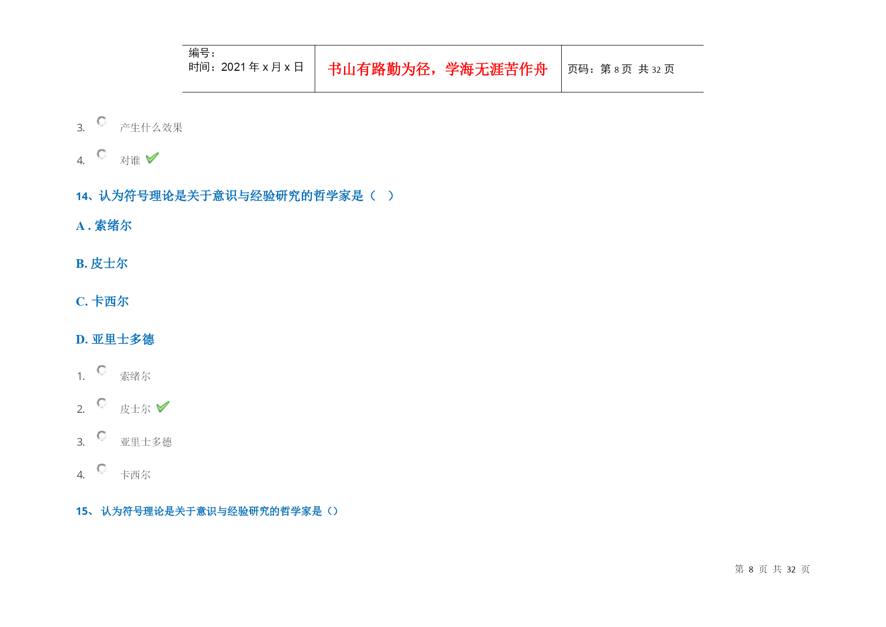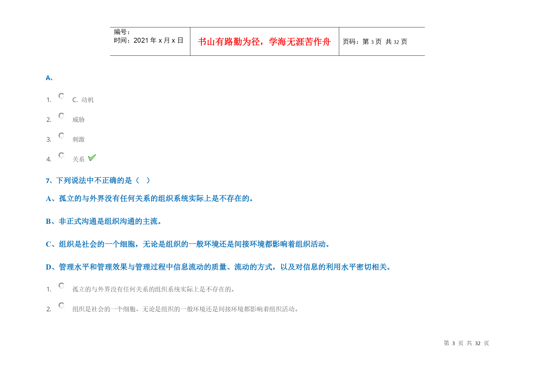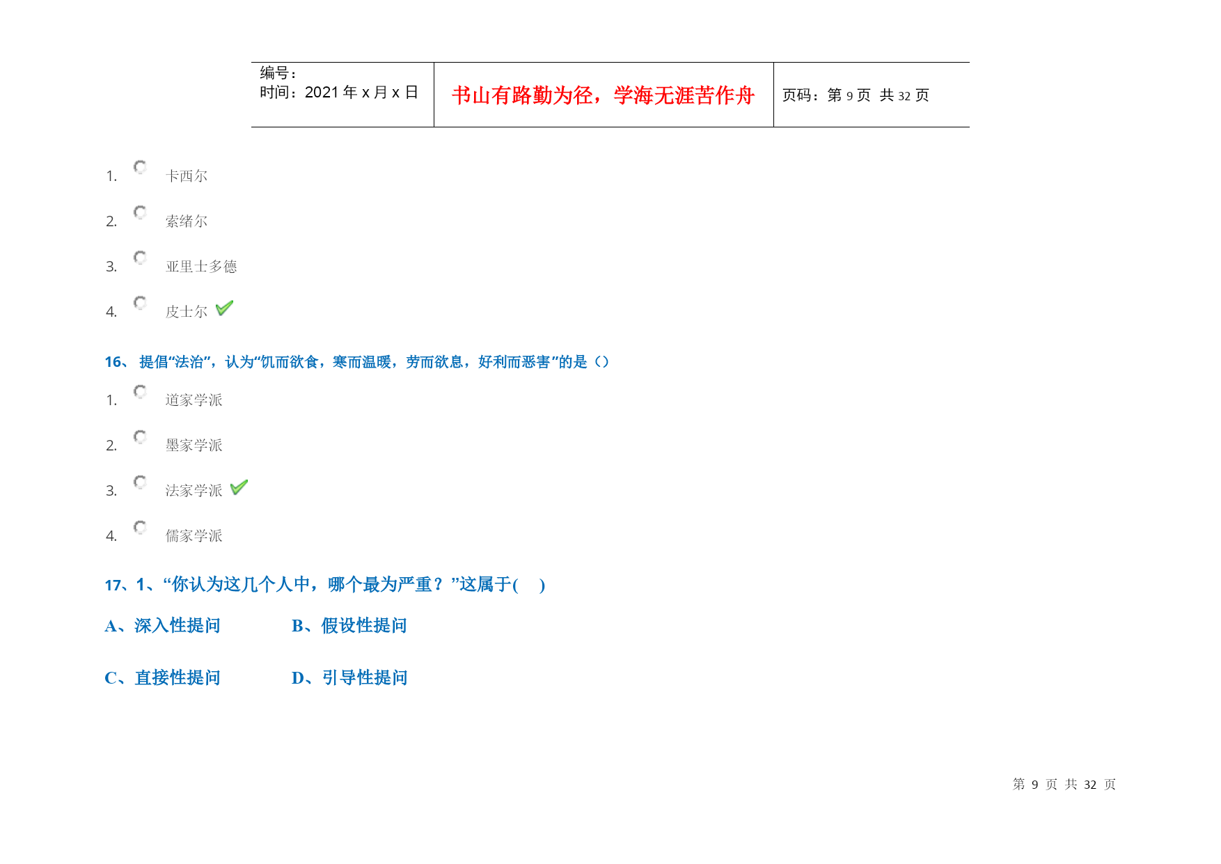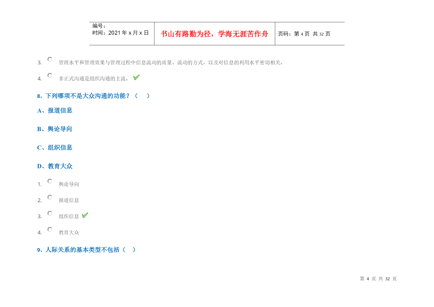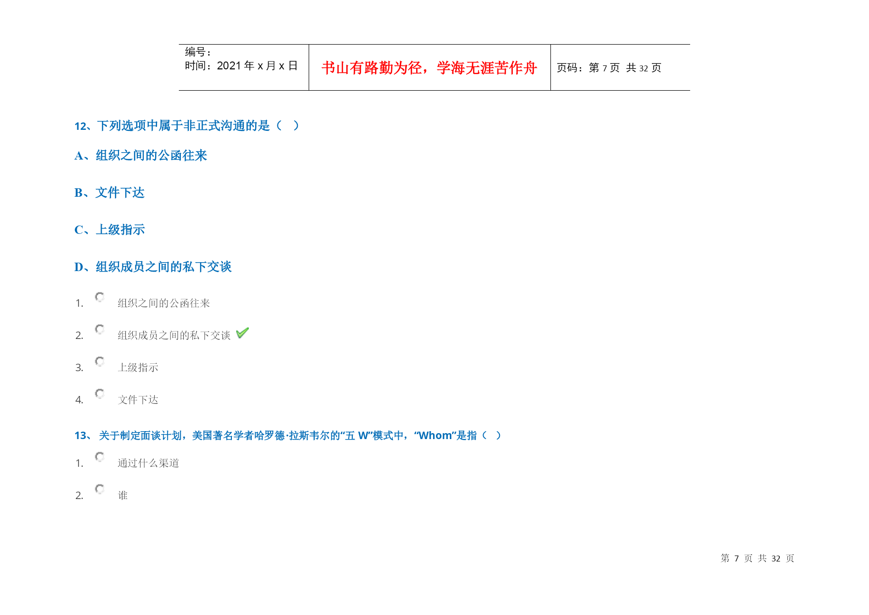 编号:时间:2021年x月x日书山有路勤为径,学海无涯苦作舟页码:第PAGE32页共NUMPAGES32页第PAGE\*MERGEFORMAT32页共NUMPAGES\*MERGEFORMAT32页1、人际信息传播,达到沟通效应,使人际关系良性发展过程是分阶段组建进行的,其中不包括下面哪个阶段()注意阶段适应阶段漠视阶段依附阶段2、人际关系的基本类型不包括()喜爱——憎恨包容——排斥控制——追随控制——管理3、下列选项中属于非正式沟通的是()上级指示文件下达组织成员之间的私下交谈组织之间的公函往来4、各国礼仪的主要特点不包括()尊重妇女儿童以人为本深度交谈经济清楚5、人的基本情感不包括()道德感丑感理智感美感6、不属于人际沟通中影响竞争与合作因素的为()A、C.动机威胁刺激关系7、下列说法中不正确的是()A、孤立的与外界没有任何关系的组织系统实际上是不存在的。B、非正式沟通是组织沟通的主流。C、组织是社会的一个细胞,无论是组织的一般环境还是间接环境都影响着组织活动。D、管理水平和管理效果与管理过程中信息流动的质量、流动的方式,以及对信息的利用水平密切相关。孤立的与外界没有任何关系的组织系统实际上是不存在的。组织是社会的一个细胞,无论是组织的一般环境还是间接环境都影响着组织活动。管理水平和管理效果与管理过程中信息流动的质量、流动的方式,以及对信息的利用水平密切相关。非正式沟通是组织沟通的主流。8、下列哪项不是大众沟通的功能?()A、报道信息B、舆论导向C、组织信息D、教育大众舆论导向报道信息组织信息教育大众9、人际关系的基本类型不包括()A、包容——排斥B、控制——追随C、喜爱——憎恨D、控制——管理B.控制——管理包容——排斥控制——追随喜爱——憎恨10、“手心向下,挥动手指”在下列哪个国家表示招呼或召唤别人前来()A、英国B、美国C、加拿大D、中国A.美国中国英国加拿大11、人格表现是“教诲”与“权威”,使自己在人际沟通中处于一种绝对统治的态度和行为。这是哪种人格状态的表现()A.“父母”的自我人格状态B.“儿童”的自我人格状态C.“成人”的自我人格状态D.以上都不是“儿童”的自我人格状态以上都不是“成人”的自我人格状态“父母”的自我人格状态12、下列选项中属于非正式沟通的是()A、组织之间的公函往来B、文件下达C、上级指示D、组织成员之间的私下交谈组织之间的公函往来组织成员之间的私下交谈上级指示文件下达13、关于制定面谈计划,美国著名学者哈罗德·拉斯韦尔的“五W”模式中,“Whom”是指()通过什么渠道谁产生什么效果对谁14、认为符号理论是关于意识与经验研究的哲学家是()A.索绪尔B.皮士尔C.卡西尔D.亚里士多德索绪尔皮士尔亚里士多德卡西尔15、认为符号理论是关于意识与经验研究的哲学家是()卡西尔索绪尔亚里士多德皮士尔16、提倡“法治”,认为“饥而欲食,寒而温暖,劳而欲息,好利而恶害”的是()道家学派墨家学派法家学派儒家学派17、1、“你认为这几个人中,哪个最为严重?”这属于()A、深入性提问B、假设性提问C、直接性提问D、引导性提问假设性提问引导性提问直接性提问深入性提问18、下列哪项不是大众沟通的功能?()D.舆论导向报道信息组织信息教育大众19、人际信息传播,达到沟通效应,使人际关系良性发展过程是分阶段组建进行的,其中不包括下面哪个阶段()A、注意阶段B、适应阶段C、依附阶段D、漠视阶段E.适应阶段依附阶段注意阶段漠视阶段20、各国礼仪的主要特点不包括()A、以人为本B、尊重妇女儿童C、深度交谈D、经济清楚深度交谈经济清楚尊重妇女儿童以人为本21、下列倾听者的哪种非语言符号不能给讲话者一种支持和鼓励的表示()A、微笑B、注视讲话者C、轻轻点头D、昂头注视讲话者昂头轻轻点头微笑22、下列倾听者的哪种非语言符号不能给讲话者一种支持和鼓励的表示()注视讲话者昂头微笑轻轻点头23、下列说法中不正确的是()非正式沟通是组织沟通的主流。孤立的与外界没有任何关系的组织系统实际上是不存在的。管理水平和管理效果与管理过程中信息流动的质量、流动的方式,以及对信息的利用水平密切相关。组织是社会的一个细胞,无论是组织的一般环境还是间接环境都影响着组织活动。24、主张部分亲疏厚薄地“兼爱”,提倡“饥者得食,寒者得衣,劳者得息”的是()A、法家学派B、墨家学派C、道家学派D、儒家学派法家学派墨家学派道家学派儒家学派25
