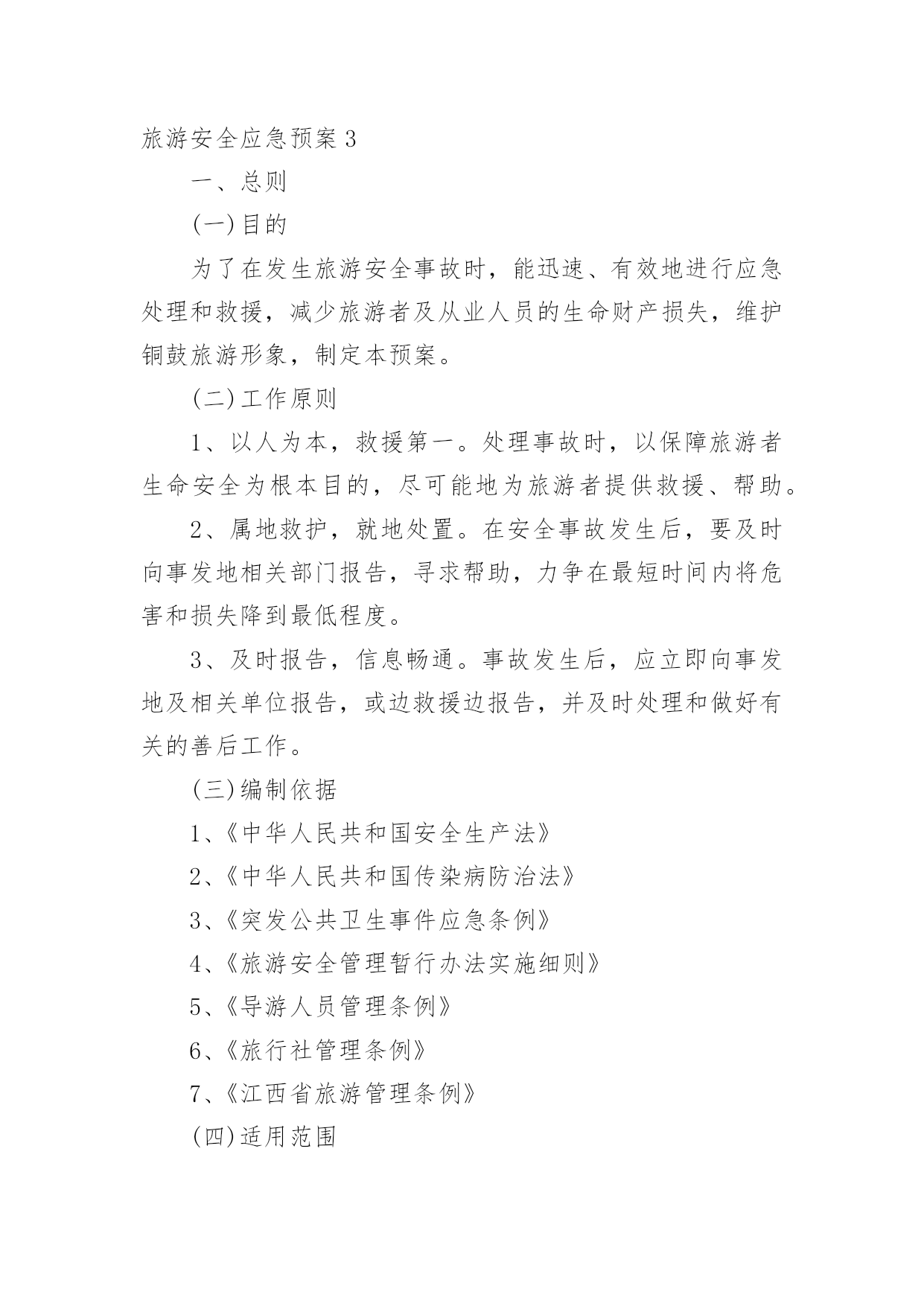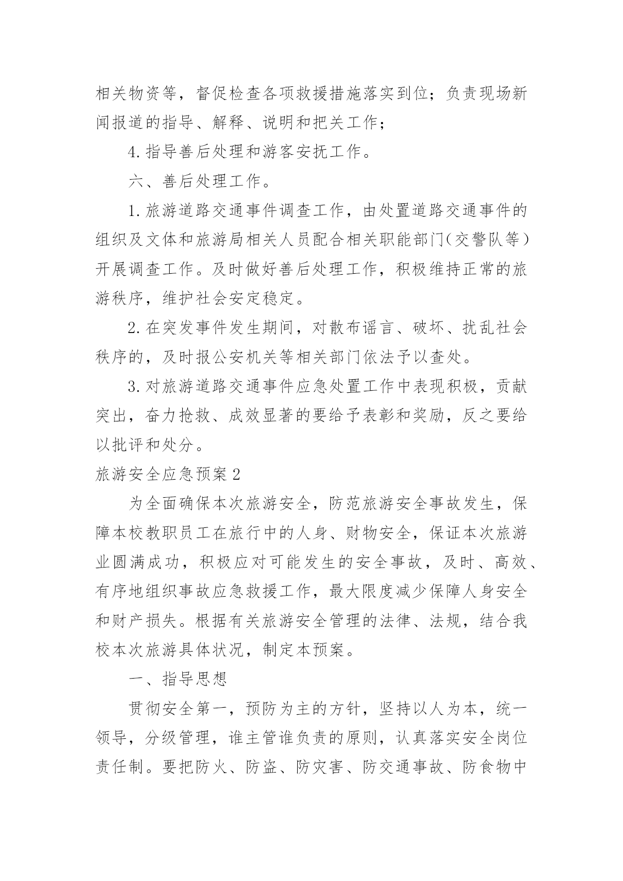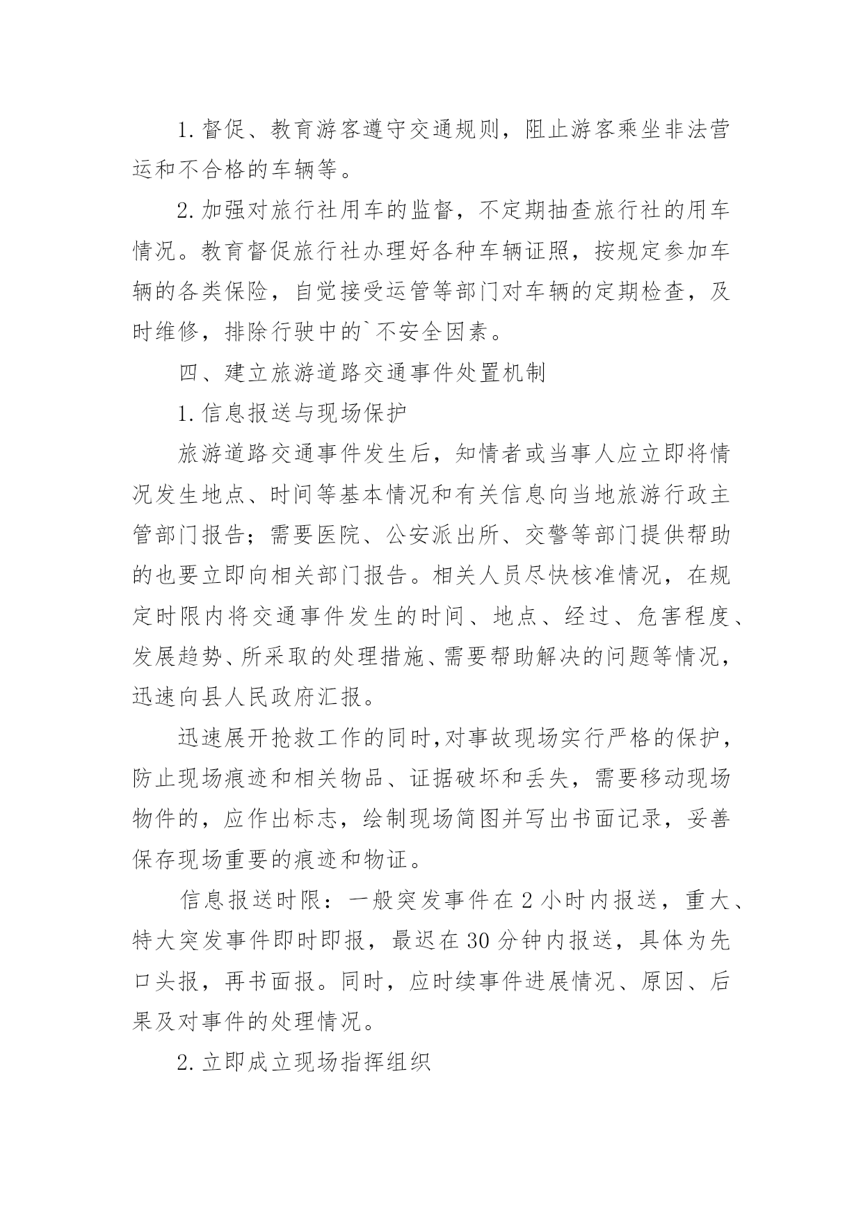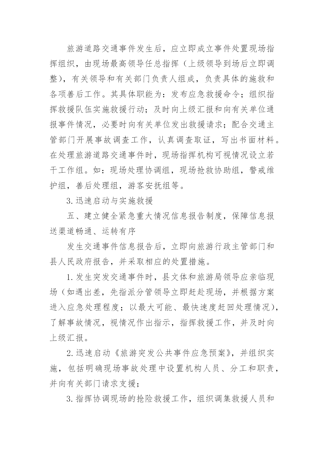 旅游安全应急预案旅游安全应急预案(9篇)在平时的学习、工作或生活中,难免会发生一些不在自己预料之中的事件,为了控制事故的发展势态,通常会被要求事先编制应急预案。那么问题来了,应急预案应该怎么写?下面是小编整理的旅游安全应急预案,仅供参考,希望能够帮助到大家。旅游安全应急预案1为切实加强旅游安全工作,进一步落实安全工作责任制,杜绝旅游道路交通安全事故。科学、迅速、有效地处置旅游道路交通事件,最大限度地预防旅游道路交通事件的发生和降低旅游道路交通事件造成的危害,确保游客的人身、财产安全,根据有关精神,结合我县旅游业的实际情况,特制定本应急预案。一、旅游道路交通事件的范畴旅游道路交通事件是指发生在景区内交通道路上或组团外出旅游的突然发生涉及游客,造成人身财产较大损害的交通事件,以及由自然现象引起的灾害性交通事故。主要包括:1.游客在组团外出旅游过程中的交通事件。2.游客进入景区过程中的交通事件。3.因突发自然灾害,致使游客乘坐车辆发生交通事件。4.其他不可预料因素而造成的旅游交通事件。旅游道路交通事件按其影响大小和危害程度划分为一般、重大、特大三个级别。处置旅游道路交通事件的责任单位根据旅游车辆使用情况和游客所属情况而定。旅游道路交通事件出现后,负责人应遵循属地原则,向当地旅游行政主管部门汇报,同时,及时先行处置,以最快速度、尽最大努力实现应急处置。二、建立旅游道路交通事件预警系统成立由县文体和旅游局主要领导、分管领导等人员组成安全工作领导小组。组长:县文体和旅游局局长副组长:县文化和旅游市场执法大队大队长县文体和旅游局二级主任科员组员:游国文县文体和旅游局旅游股负责人县文化和旅游市场执法大队队员领导小组负责组织协调和检查督导我县旅游道路交通的安全预防工作。主要职责为:及时提供旅游交通事件的危险信号,畅通信息渠道,提醒游客注意险情,采取切实有效措施,竭力避免发生旅游道路交通事件。旅游道路交通事件发生后,能客观真实地反映情况,及时向领导建言献策。旅游道路交通事故的预防应坚持教育在先、预防在先、多方配合、共同负责的原则。三、建立保障机制1.督促、教育游客遵守交通规则,阻止游客乘坐非法营运和不合格的车辆等。2.加强对旅行社用车的监督,不定期抽查旅行社的用车情况。教育督促旅行社办理好各种车辆证照,按规定参加车辆的各类保险,自觉接受运管等部门对车辆的定期检查,及时维修,排除行驶中的`不安全因素。四、建立旅游道路交通事件处置机制1.信息报送与现场保护旅游道路交通事件发生后,知情者或当事人应立即将情况发生地点、时间等基本情况和有关信息向当地旅游行政主管部门报告;需要医院、公安派出所、交警等部门提供帮助的也要立即向相关部门报告。相关人员尽快核准情况,在规定时限内将交通事件发生的时间、地点、经过、危害程度、发展趋势、所采取的处理措施、需要帮助解决的问题等情况,迅速向县人民政府汇报。迅速展开抢救工作的同时,对事故现场实行严格的保护,防止现场痕迹和相关物品、证据破坏和丢失,需要移动现场物件的,应作出标志,绘制现场简图并写出书面记录,妥善保存现场重要的痕迹和物证。信息报送时限:一般突发事件在2小时内报送,重大、特大突发事件即时即报,最迟在30分钟内报送,具体为先口头报,再书面报。同时,应时续事件进展情况、原因、后果及对事件的处理情况。2.立即成立现场指挥组织旅游道路交通事件发生后,应立即成立事件处置现场指挥组织,由现场最高领导任总指挥(上级领导到场后立即调整),有关领导和有关部门负责人组成,负责具体的施救和各项善后工作。其具体职能为:发布应急救援命令;组织指挥救援队伍实施救援行动;及时向上级汇报和向有关单位通报事件情况,必要时向有关单位发出救援请求;配合交通主管部门开展事故调查工作,认真调查取证,写出书面材料。在处理旅游道路交通事件时,现场指挥机构可视情况设立若干工作组。如:现场处理协调组,现场抢救协助组,警戒维护组,善后处理组,游客安抚组等。3.迅速启动与实施救援五、建立健全紧急重大情况信息报告制度,保障信息报送渠道畅通、运转有序发生交通事件信息报告后,立即向旅游行政主管部门和县人民政府报告,并采取相应的处置措施。1.发生突发交通事件时,县文体和旅游局领导应亲临现场(如遇出差,先指派分管领导立即赶赴现场,并根据方案进入应急处理程度;以最大可能、最快速度赶回处理情况),了解事故情况,视情况作出指示,指挥救援工作,并及时向上级汇报。2.迅速启动《旅游突发公共事件应急预案》,并组织实施,包括明确现场事故处理中设置机构人员、分工和职责,并向有关部门请求支援;3.指挥协调现场的抢险救援工作,组织调集救援人员和相关物资等,督促检查各项救援措施落实到位;负责现场新闻报道的指导、解释、说明和把关工作;4.指导善后处理和游客安抚工作。六、善后处理工作。1.旅游道路交通