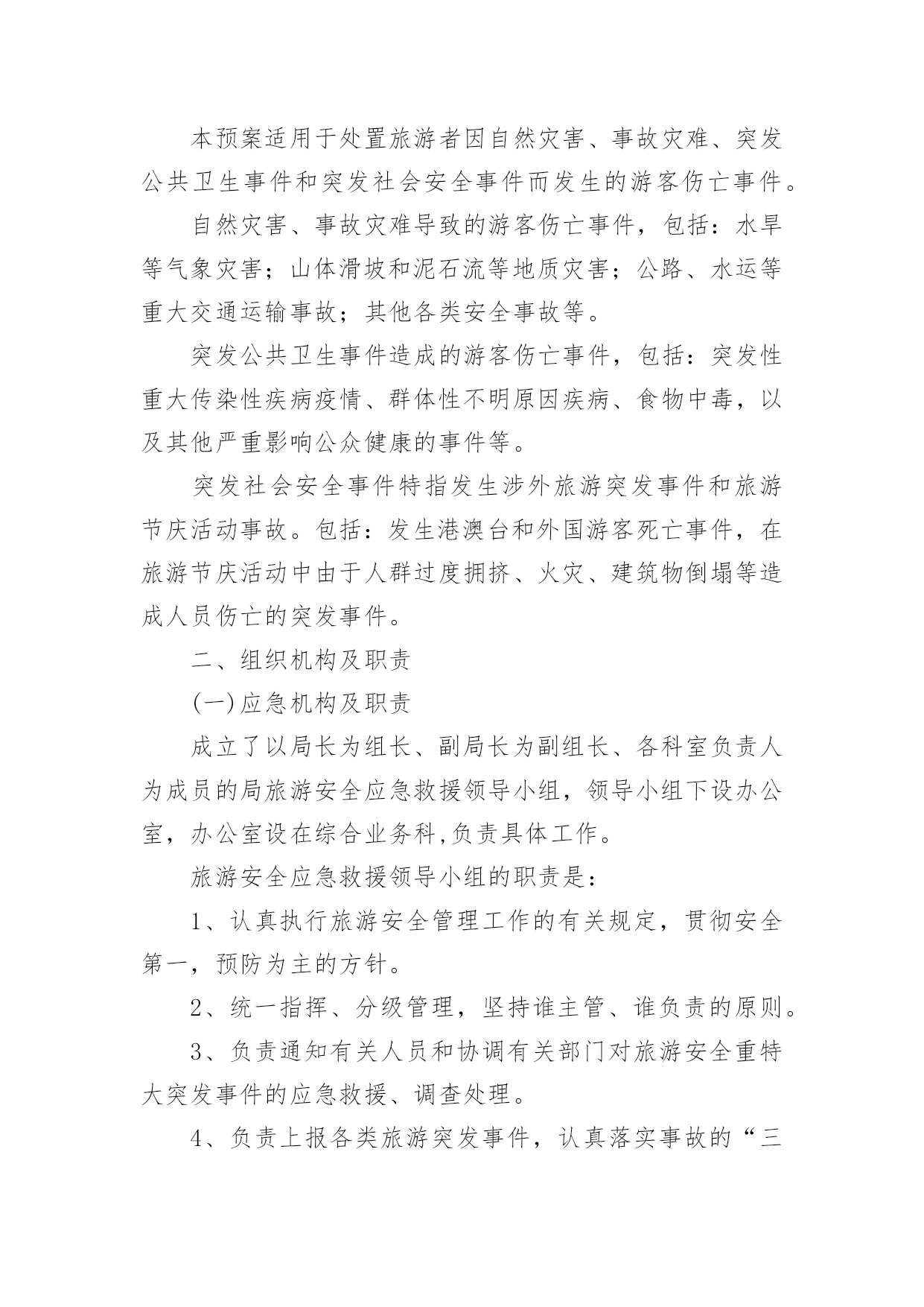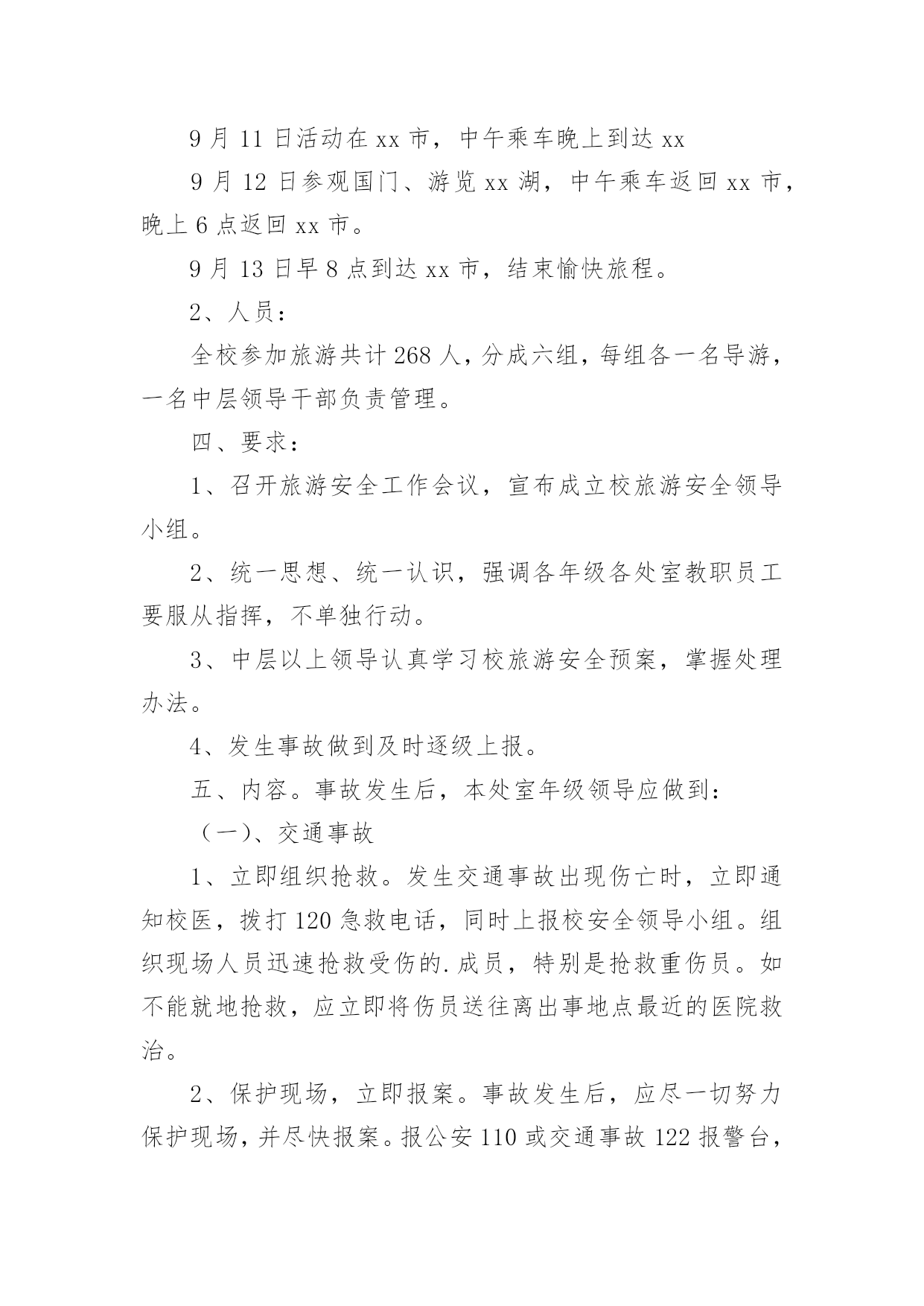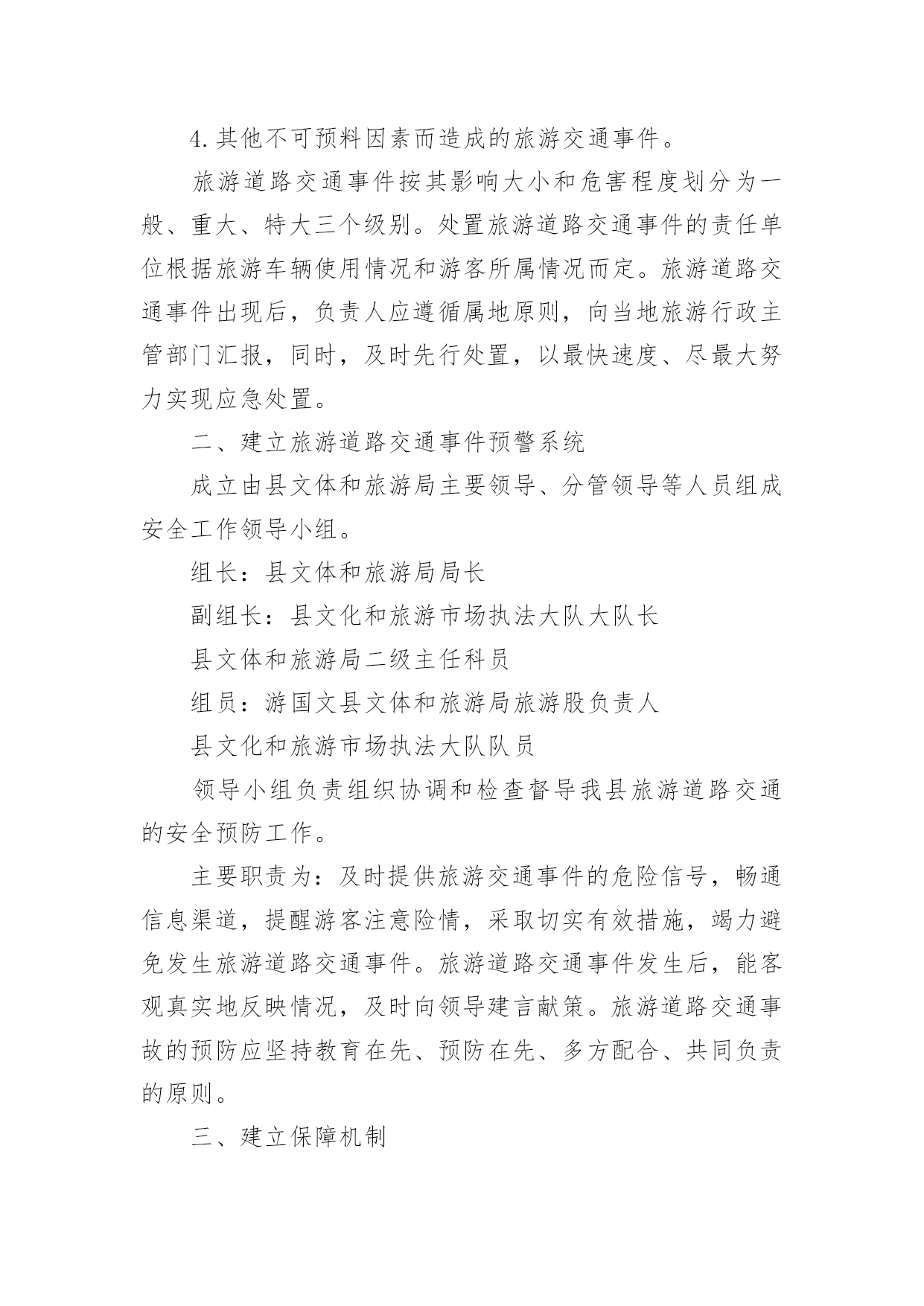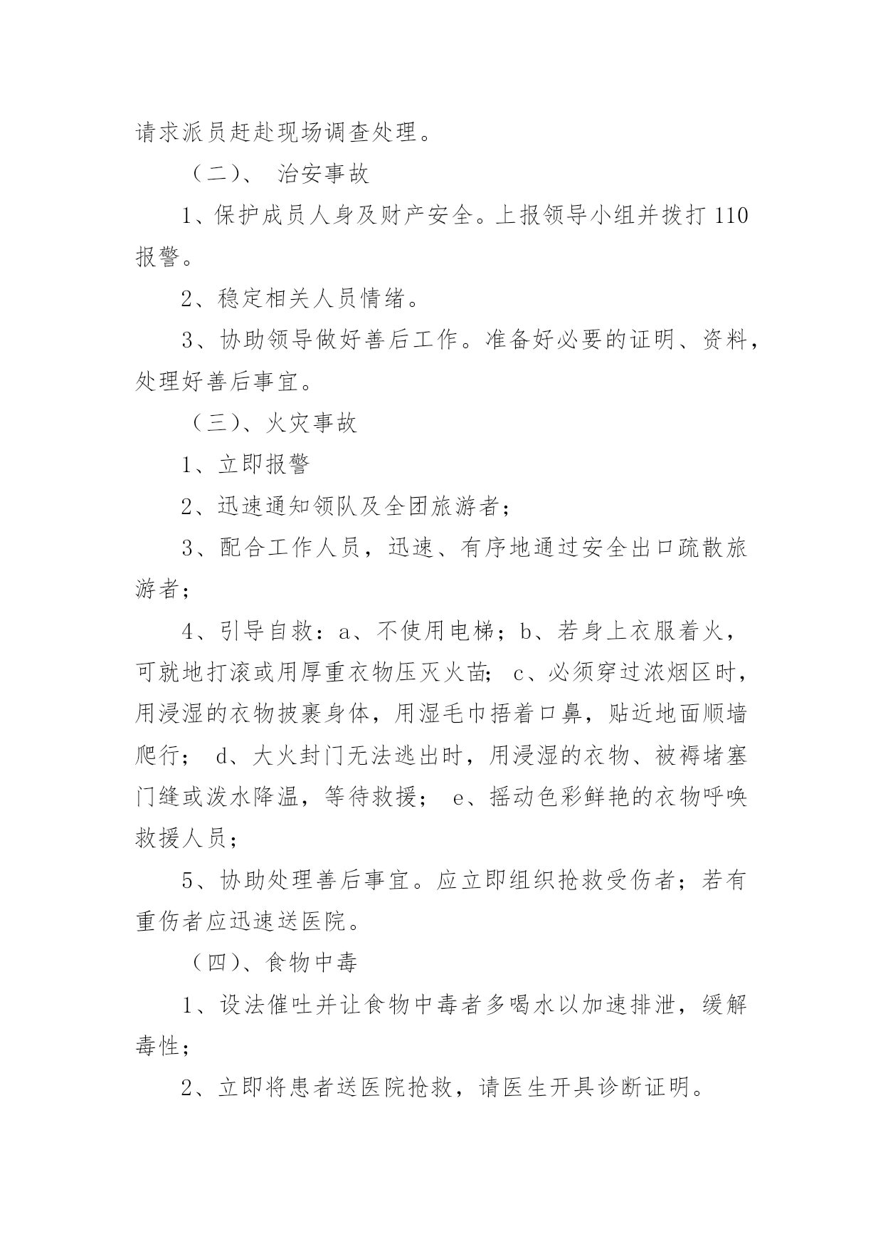 旅游安全应急预案旅游安全应急预案(9篇)在平时的学习、工作或生活中,难免会发生一些不在自己预料之中的事件,为了控制事故的发展势态,通常会被要求事先编制应急预案。那么问题来了,应急预案应该怎么写?下面是小编整理的旅游安全应急预案,仅供参考,希望能够帮助到大家。旅游安全应急预案1为切实加强旅游安全工作,进一步落实安全工作责任制,杜绝旅游道路交通安全事故。科学、迅速、有效地处置旅游道路交通事件,最大限度地预防旅游道路交通事件的发生和降低旅游道路交通事件造成的危害,确保游客的人身、财产安全,根据有关精神,结合我县旅游业的实际情况,特制定本应急预案。一、旅游道路交通事件的范畴旅游道路交通事件是指发生在景区内交通道路上或组团外出旅游的突然发生涉及游客,造成人身财产较大损害的交通事件,以及由自然现象引起的灾害性交通事故。主要包括:1.游客在组团外出旅游过程中的交通事件。2.游客进入景区过程中的交通事件。3.因突发自然灾害,致使游客乘坐车辆发生交通事件。4.其他不可预料因素而造成的旅游交通事件。旅游道路交通事件按其影响大小和危害程度划分为一般、重大、特大三个级别。处置旅游道路交通事件的责任单位根据旅游车辆使用情况和游客所属情况而定。旅游道路交通事件出现后,负责人应遵循属地原则,向当地旅游行政主管部门汇报,同时,及时先行处置,以最快速度、尽最大努力实现应急处置。二、建立旅游道路交通事件预警系统成立由县文体和旅游局主要领导、分管领导等人员组成安全工作领导小组。组长:县文体和旅游局局长副组长:县文化和旅游市场执法大队大队长县文体和旅游局二级主任科员组员:游国文县文体和旅游局旅游股负责人县文化和旅游市场执法大队队员领导小组负责组织协调和检查督导我县旅游道路交通的安全预防工作。主要职责为:及时提供旅游交通事件的危险信号,畅通信息渠道,提醒游客注意险情,采取切实有效措施,竭力避免发生旅游道路交通事件。旅游道路交通事件发生后,能客观真实地反映情况,及时向领导建言献策。旅游道路交通事故的预防应坚持教育在先、预防在先、多方配合、共同负责的原则。三、建立保障机制1.督促、教育游客遵守交通规则,阻止游客乘坐非法营运和不合格的车辆等。2.加强对旅行社用车的监督,不定期抽查旅行社的用车情况。教育督促旅行社办理好各种车辆证照,按规定参加车辆的各类保险,自觉接受运管等部门对车辆的定期检查,及时维修,排除行驶中的`不安全因素。四、建立旅游道路交通事件处置机制1.信息报送与现场保护旅游道路交通事件发生后,知情者或当事人应立即将情况发生地点、时间等基本情况和有关信息向当地旅游行政主管部门报告;需要医院、公安派出所、交警等部门提供帮助的也要立即向相关部门报告。相关人员尽快核准情况,在规定时限内将交通事件发生的时间、地点、经过、危害程度、发展趋势、所采取的处理措施、需要帮助解决的问题等情况,迅速向县人民政府汇报。迅速展开抢救工作的同时,对事故现场实行严格的保护,防止现场痕迹和相关物品、证据破坏和丢失,需要移动现场物件的,应作出标志,绘制现场简图并写出书面记录,妥善保存现场重要的痕迹和物证。信息报送时限:一般突发事件在2小时内报送,重大、特大突发事件即时即报,最迟在30分钟内报送,具体为先口头报,再书面报。同时,应时续事件进展情况、原因、后果及对事件的处理情况。2.立即成立现场指挥组织旅游道路交通事件发生后,应立即成立事件处置现场指挥组织,由现场最高领导任总指挥(上级领导到场后立即调整),有关领导和有关部门负责人组成,负责具体的施救和各项善后工作。其具体职能为:发布应急救援命令;组织指挥救援队伍实施救援行动;及时向上级汇报和向有关单位通报事件情况,必要时向有关单位发出救援请求;配合交通主管部门开展事故调查工作,认真调查取证,写出书面材料。在处理旅游道路交通事件时,现场指挥机构可视情况设立若干工作组。如:现场处理协调组,现场抢救协助组,警戒维护组,善后处理组,游客安抚组等。3.迅速启动与实施救援五、建立健全紧急重大情况信息报告制度,保障信息报送渠道畅通、运转有序发生交通事件信息报告后,立即向旅游行政主管部门和县人民政府报告,并采取相应的处置措施。1.发生突发交通事件时,县文体和旅游局领导应亲临现场(如遇出差,先指派分管领导立即赶赴现场,并根据方案进入应急处理程度;以最大可能、最快速度赶回处理情况),了解事故情况,视情况作出指示,指挥救援工作,并及时向上级汇报。2.迅速启动《旅游突发公共事件应急预案》,并组织实施,包括明确现场事故处理中设置机构人员、分工和职责,并向有关部门请求支援;3.指挥协调现场的抢险救援工作,组织调集救援人员和相关物资等,督促检查各项救援措施落实到位;负责现场新闻报道的指导、解释、说明和把关工作;4.指导善后处理和游客安抚工作。六、善后处理工作。1.旅游道路交通