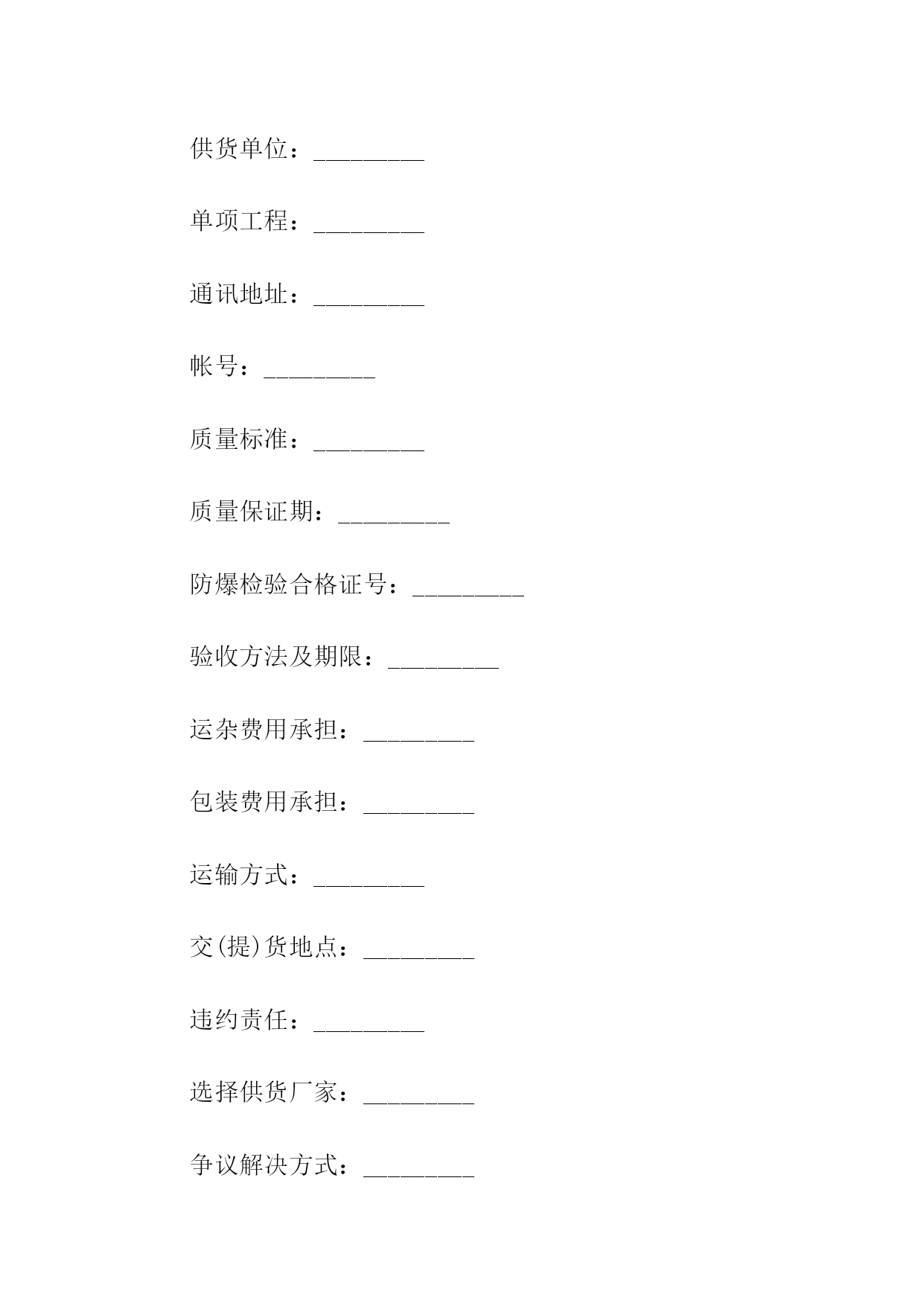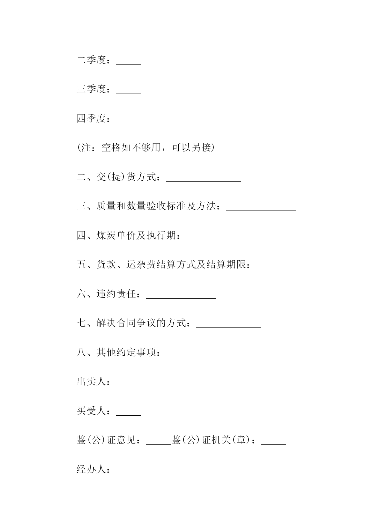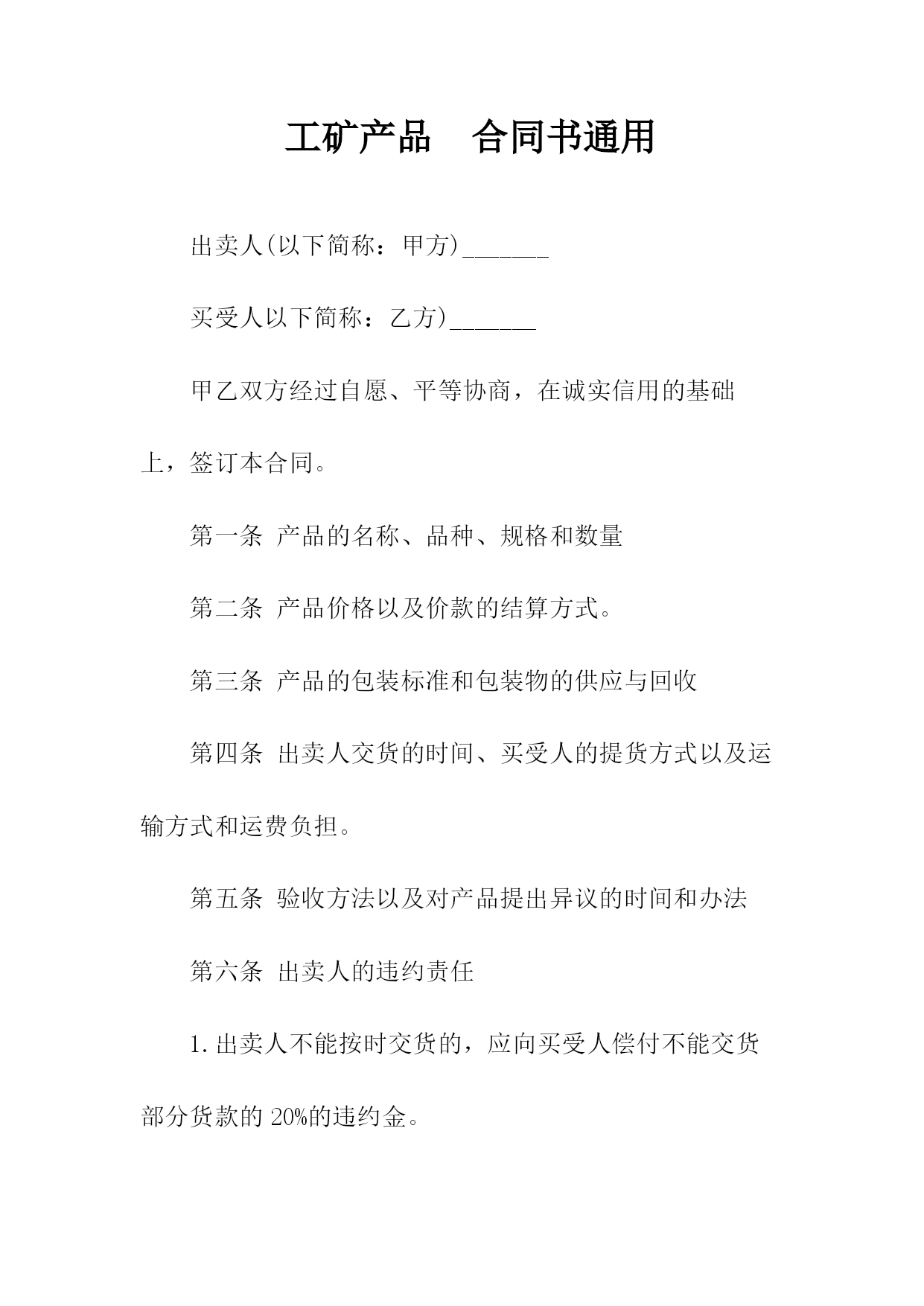 煤矿机电产品合同书买受人编号:_________合同编号:_________设备(配件)名称:_________计量单位:_________数量:_________要求交货期:_________合同单价(万元):_________单价:_________合同交货期:_________总价:_________主辅机型号规格:_________买受人:_________出卖人:_________订货单位:_________供货单位:_________单项工程:_________通讯地址:_________帐号:_________质量标准:_________质量保证期:_________防爆检验合格证号:_________验收方法及期限:_________运杂费用承担:_________包装费用承担:_________运输方式:_________交(提)货地点:_________违约责任:_________选择供货厂家:_________争议解决方式:_________本合同在履行过程中发生的争议,由双方当事人协商解决;协商不成的,按下列第_____种方式解决:(一)提交仲裁委员会仲裁;(二)依向人民法院起诉。鉴(公)证意见:_________鉴(公)证机关(章)经办人:______________年_____月_____日其他约定事项承包单位(章)此合同一式_____份,出卖人_____份,买受人_____份,鉴(公)证机关_____份。说明:本合同未尽事宜按《中华人民共和国合同法》有关规定执行。合同签订地点:___________合同签订时间:_____年_____月____日监制部门:_____________印制单位:_____________工矿产品合同书通用出卖人(以下简称:甲方)_______买受人以下简称:乙方)_______甲乙双方经过自愿、平等协商,在诚实信用的基础上,签订本合同。第一条产品的名称、品种、规格和数量第二条产品价格以及价款的结算方式。第三条产品的包装标准和包装物的供应与回收第四条出卖人交货的时间、买受人的提货方式以及运输方式和运费负担。第五条验收方法以及对产品提出异议的时间和办法第六条出卖人的违约责任1.出卖人不能按时交货的,应向买受人偿付不能交货部分货款的20%的违约金。2.出卖人逾期交货的,按逾期交货部分货款的日万分之五计算,向买受人偿付逾期交货的违约金,并承担买受人因此所受的直接损失费用。第七条买受人的违约责任1.买受人中途退货,应向出卖人偿付退货部分货款20%的违约金。2.买受人逾期付款的,按逾期货款部分的日万分之五向出卖人偿付逾期付款的违约金。第八条合同争议的解决方式本合同在履行过程中发生的争议,由双方当事人协商解决;协商不成,由甲方所在地的人民法院管辖。第九条本合同一式两份,均具有相同的法律效力。第十条本合同经甲乙双方签字后生效。合同有效期一年。甲方:乙方:年月日签订于济南。煤炭合同书通用合同编号:_____出卖人:_____签订地点:_____买受人:_____签订时间:____年____月____日一、收货人名称、发到站、品种规格、质量、交(提)货时间、数量收货人名称:_____发站:_____到站:_____品种规格:_____质量:_____交(提)货时间、数量(吨)全年合计:_____一季度:_____二季度:_____三季度:_____四季度:_____(注:空格如不够用,可以另接)二、交(提)货方式:_______________三、质量和数量验收标准及方法:______________四、煤炭单价及执行期:______________五、货款、运杂费结算方式及结算期限:__________六、违约责任:______________七、解决合同争议的方式:_____________八、其他约定事项:_________出卖人:_____买受人:_____鉴(公)证意见:_____鉴(公)证机关(章):_____经办人:_________年___月___日:_____(注:除国家另有规定处,鉴(公)证实行自愿原则)出卖人名称(章):_____住所:_____法定代表人:_____委托代理人:_____:_____电报挂号:_____开户:_____账号:_____纳税人登记号:_____邮政编号:_____买受人名称(章):_____住所:_____法定代表人:_____委托代理人:_____:_____电报挂号:_____开户:_____账号:_____纳税人登记号:_____邮政编码:_____监制部门:国家工商行政管理局试用合同书通用范本试用合同范本出卖人:(以下简称甲方)买受人:(以下简称乙方)兹为机械先行试验,经双方同意订立协议如下:第一条乙方