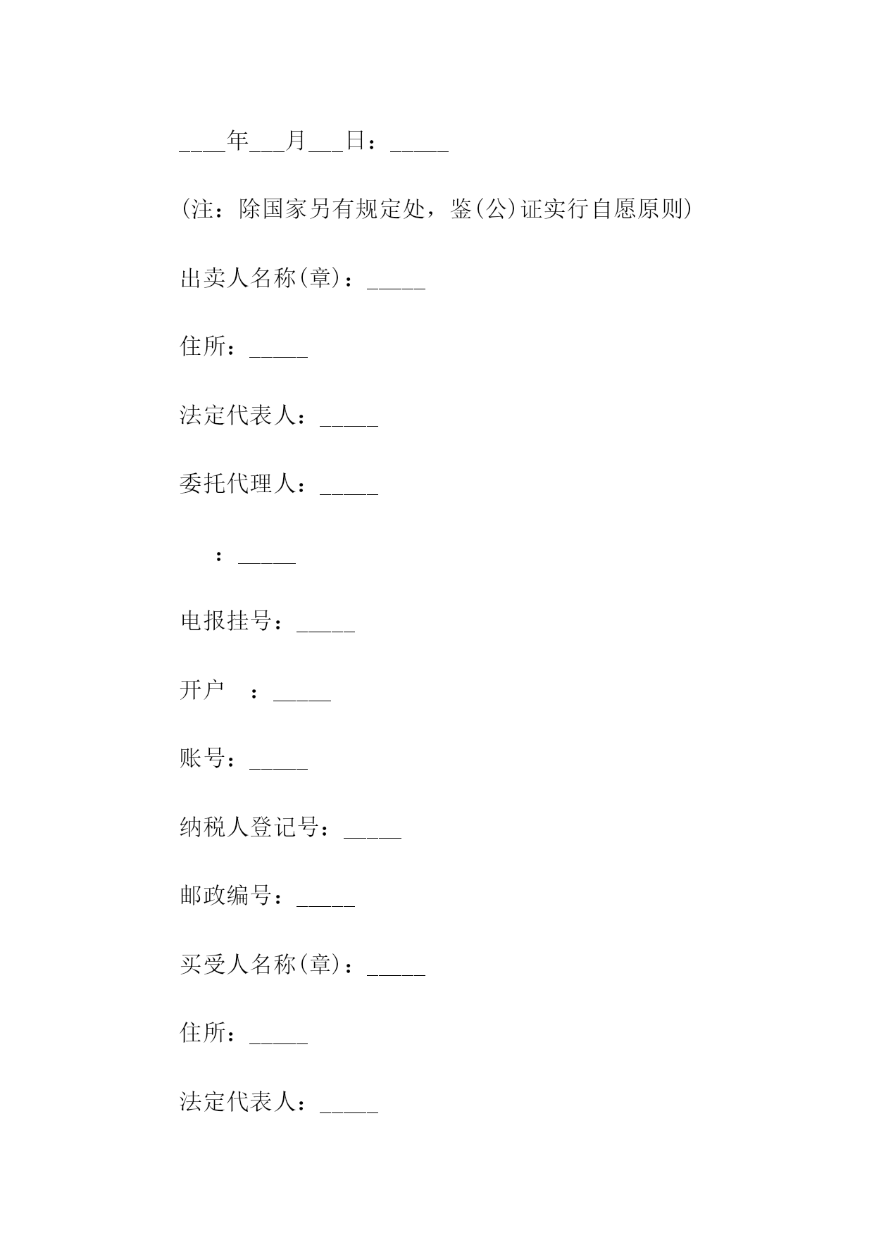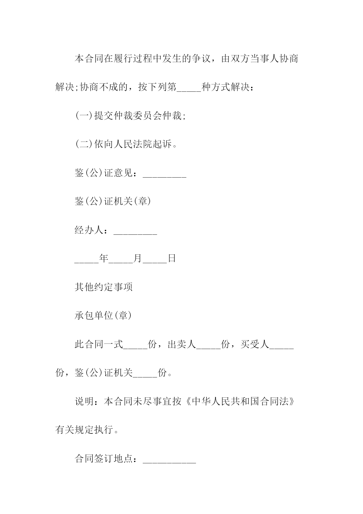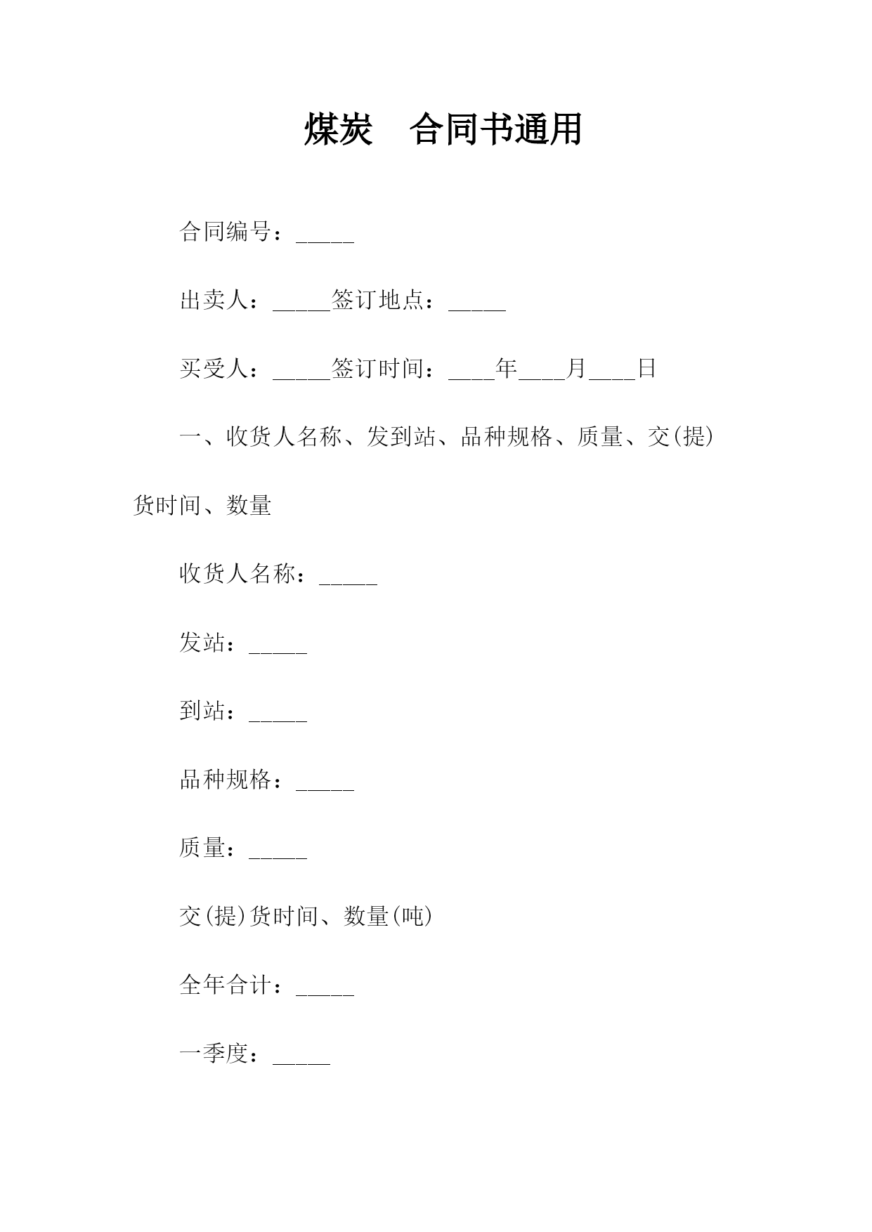 煤矿机电产品合同书买受人编号:_________合同编号:_________设备(配件)名称:_________计量单位:_________数量:_________要求交货期:_________合同单价(万元):_________单价:_________合同交货期:_________总价:_________主辅机型号规格:_________买受人:_________出卖人:_________订货单位:_________供货单位:_________单项工程:_________通讯地址:_________帐号:_________质量标准:_________质量保证期:_________防爆检验合格证号:_________验收方法及期限:_________运杂费用承担:_________包装费用承担:_________运输方式:_________交(提)货地点:_________违约责任:_________选择供货厂家:_________争议解决方式:_________本合同在履行过程中发生的争议,由双方当事人协商解决;协商不成的,按下列第_____种方式解决:(一)提交仲裁委员会仲裁;(二)依向人民法院起诉。鉴(公)证意见:_________鉴(公)证机关(章)经办人:______________年_____月_____日其他约定事项承包单位(章)此合同一式_____份,出卖人_____份,买受人_____份,鉴(公)证机关_____份。说明:本合同未尽事宜按《中华人民共和国合同法》有关规定执行。合同签订地点:___________合同签订时间:_____年_____月____日监制部门:_____________印制单位:_____________工矿产品合同书通用出卖人(以下简称:甲方)_______买受人以下简称:乙方)_______甲乙双方经过自愿、平等协商,在诚实信用的基础上,签订本合同。第一条产品的名称、品种、规格和数量第二条产品价格以及价款的结算方式。第三条产品的包装标准和包装物的供应与回收第四条出卖人交货的时间、买受人的提货方式以及运输方式和运费负担。第五条验收方法以及对产品提出异议的时间和办法第六条出卖人的违约责任1.出卖人不能按时交货的,应向买受人偿付不能交货部分货款的20%的违约金。2.出卖人逾期交货的,按逾期交货部分货款的日万分之五计算,向买受人偿付逾期交货的违约金,并承担买受人因此所受的直接损失费用。第七条买受人的违约责任1.买受人中途退货,应向出卖人偿付退货部分货款20%的违约金。2.买受人逾期付款的,按逾期货款部分的日万分之五向出卖人偿付逾期付款的违约金。第八条合同争议的解决方式本合同在履行过程中发生的争议,由双方当事人协商解决;协商不成,由甲方所在地的人民法院管辖。第九条本合同一式两份,均具有相同的法律效力。第十条本合同经甲乙双方签字后生效。合同有效期一年。甲方:乙方:年月日签订于济南。煤炭合同书通用合同编号:_____出卖人:_____签订地点:_____买受人:_____签订时间:____年____月____日一、收货人名称、发到站、品种规格、质量、交(提)货时间、数量收货人名称:_____发站:_____到站:_____品种规格:_____质量:_____交(提)货时间、数量(吨)全年合计:_____一季度:_____二季度:_____三季度:_____四季度:_____(注:空格如不够用,可以另接)二、交(提)货方式:_______________三、质量和数量验收标准及方法:______________四、煤炭单价及执行期:______________五、货款、运杂费结算方式及结算期限:__________六、违约责任:______________七、解决合同争议的方式:_____________八、其他约定事项:_________出卖人:_____买受人:_____鉴(公)证意见:_____鉴(公)证机关(章):_____经办人:_________年___月___日:_____(注:除国家另有规定处,鉴(公)证实行自愿原则)出卖人名称(章):_____住所:_____法定代表人:_____委托代理人:_____:_____电报挂号:_____开户:_____账号:_____纳税人登记号:_____邮政编号:_____买受人名称(章):_____住所:_____法定代表人:_____委托代理人:_____:_____电报挂号:_____开户:_____账号:_____纳税人登记号:_____邮政编码:_____监制部门:国家工商行政管理局试用合同书通用范本试用合同范本出卖人:(以下简称甲方)买受人:(以下简称乙方)兹为机械先行试验,经双方同意订立协议如下:第一条乙方