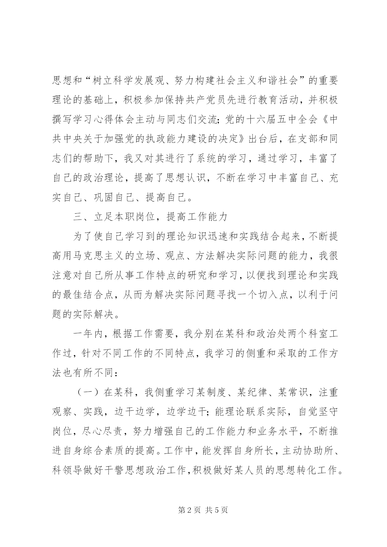 第PAGE\*Arabic\*MERGEFORMAT5页共NUMPAGES\*MERGEFORMAT5页公安系统公务员年度自我总结20xx公安系统公务员年度自我总结时光荏苒、日月如梭。20xx年,是我脱下军装、穿上警服,离开部队、走进某局的第一年,也是注定要在我人生中留下浓重一笔的一年;正是这一年,我从一个充满抱负的军人转变成长为一名努力把抱负变为执著、忠诚的国家公务员,正是这一年,我感受到了真真正正的成长与进步。回首一年来的风风火火,内心感慨颇多。现就一年来的工作简单总结如下:一、努力改造思想,完成角色转换经过“十三年军营”的打造,虽然付出了艰辛,但也增长了学识、炼就了坚毅的秉性,同时也为以后的人生种植了希望;如今,我已经走上了国家安全工作岗位、成为了一名国家公务员,作为人民公仆、人民警察,我首要的任务就是努力改造思想,尽快完成角色的转变。真正从思想上把自己当成“一个兵”,从行动上严谨自律,从小事做起,工作中要努力树立为人民服务的思想,真正做到“情为民所系、权为民所用、利为民所谋”。一年的工作经历使我感受到:搞好角色转换,正是我参加工作后的第一要务。二、认真学习理论,提升思想境界为了更好地指导今后的工作行为,我更加注重了理论知识的学习。一年来,我深入学习贯彻邓小平理论、“三个代表”重要思想和“树立科学发展观、努力构建社会主义和谐社会”的重要理论的基础上,积极参加保持共产党员先进行教育活动,并积极撰写学习心得体会主动与同志们交流;党的十六届五中全会《中共中央关于加强党的执政能力建设的决定》出台后,在支部和同志们的帮助下,我又对其进行了系统的学习,通过学习,丰富了自己的政治理论,提高了思想认识,不断在学习中丰富自己、充实自己、巩固自己、提高自己。三、立足本职岗位,提高工作能力为了使自己学习到的理论知识迅速和实践结合起来,不断提高用马克思主义的立场、观点、方法解决实际问题的能力,我很注意对自己所从事工作特点的研究和学习,以便找到理论和实践的最佳结合点,从而为解决实际问题寻找一个切入点,以利于问题的实际解决。一年内,根据工作需要,我分别在某科和政治处两个科室工作过,针对不同工作的不同特点,我学习的侧重和采取的工作方法也有所不同:(一)在某科,我侧重学习某制度、某纪律、某常识,注重观察、实践,边干边学,边学边干;能理论联系实际,自觉坚守岗位,尽心尽责,努力增强自己的工作能力和业务水平,不断推进自身综合素质的提高。工作中,能发挥自身所长,主动协助所、科领导做好干警思想政治工作,积极做好某人员的思想转化工作。在岗九个月期间,无论是业务工作,还是自身管理都没有发生任何违规、违纪现象,为保证了中心业务工作的顺利进行发挥了积极作用。(二)今年10月,因工作需要,我被调到政治处工作。自到政治处工作以来,在科室领导和党支部的关心、帮助下,在各科室同志们的密切配合下,努力做到爱岗敬业,恪尽职守,以务实的工作作风、坚定的思想信念和饱满的工作热情,较好地完成了自己的本职工作和领导交办的各项任务。到岗后,首先针对政治工作政治性、原则性、理论性强的特点,我认真学习了市局《20xx年—20xx年政治工作规划》和《20xx年度政治工作要点》以及相关文件精神和分管的业务书籍、资料,充分了解和把握上级和本处工作重点,确立工作指导思想,调整工作思路,改进工作方法,较好地完成了自己的本职工作。其次,工作“以人为本”,注重实效。能做到事事有计划,件件有落实,工作思想目标明确,思路清晰,讲究方法,在开展《公务员法》学习培训工作中,积极组织和参加培训,及时主动开展宣传工作,促进了全处干警的学习效果。再次,服从领导,注重协调。能服从安排,较好地协助领导抓好机关政治工作,积极发挥组织协调作用。平时工作积极,作风正派,能遵守工作纪律和规章制度,政治觉悟和组织纪律性较强,廉洁自律,没有出现过任何违纪违规行为。四、注重团结同志、营造和谐氛围因为刚转业到地方工作,对业务还不是很熟悉,难免会遇到这样那样的困惑和不解,每当这时,我就会主动向工作经验丰富的同事或领导请教;对同志们提出的意见、建议甚至批评,我都会虚心接受、认真反思;自觉做到“有则改之,无则加勉。”;无论在哪个科室,都能与同事们和睦相处、团结协作,争取营造一个和谐的人际关系,从而能够拥有一个和谐的工作氛围,工作起来也会更加舒心、更加起劲;因为自己还年轻,争取每天提前上班,主动打扫卫生区和办公室卫生,积极参加处、室的义务劳动和其他公益活动。虽然,自己在工作中付出了努力,取得了一定的成绩和收获,也得到了领导和同志们的一致肯定,想一想,心中甚感欣慰;但是,毕竟自己年纪轻,又是参加工作的第一年,缺乏工作经验,也暴露出了许多缺点和不足,比如:考虑问题不够全面,有时候不注意讲究工作方法;在一些工作细节上不够细心,犯一