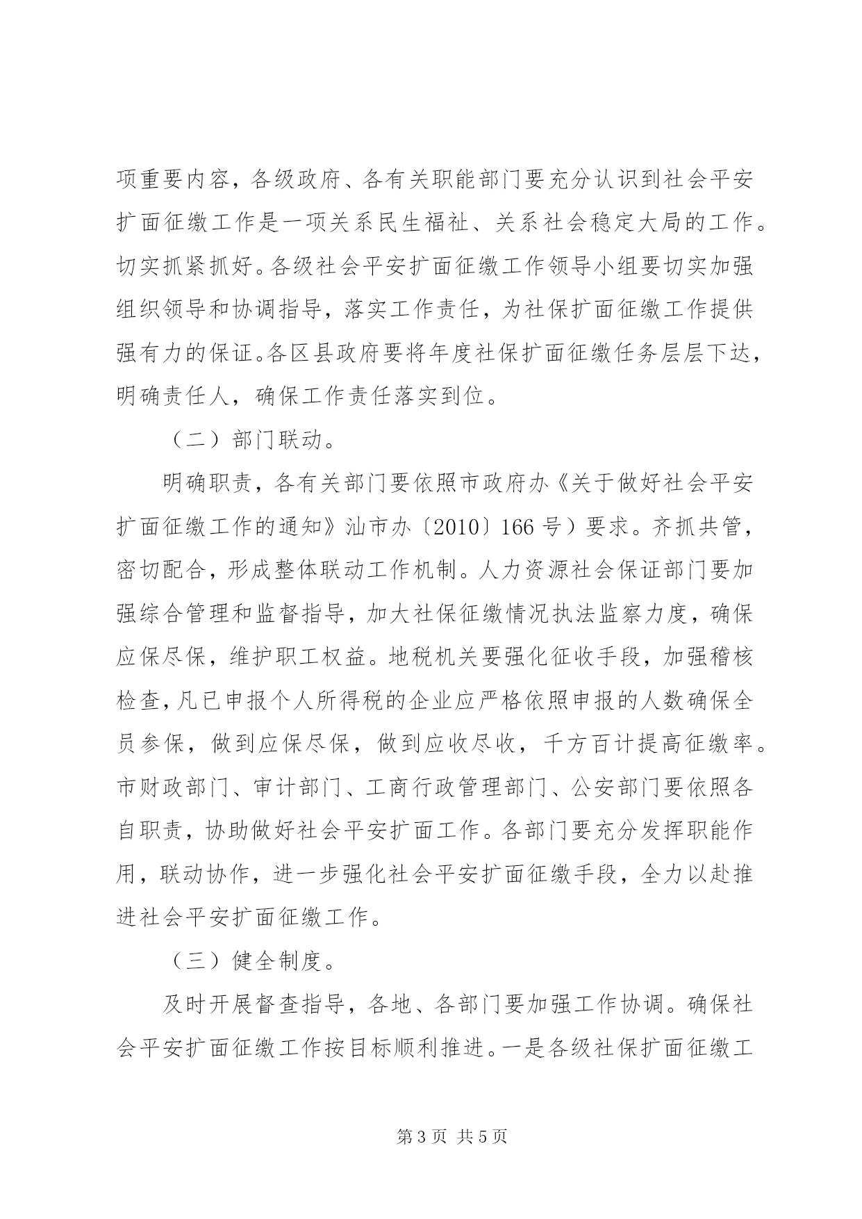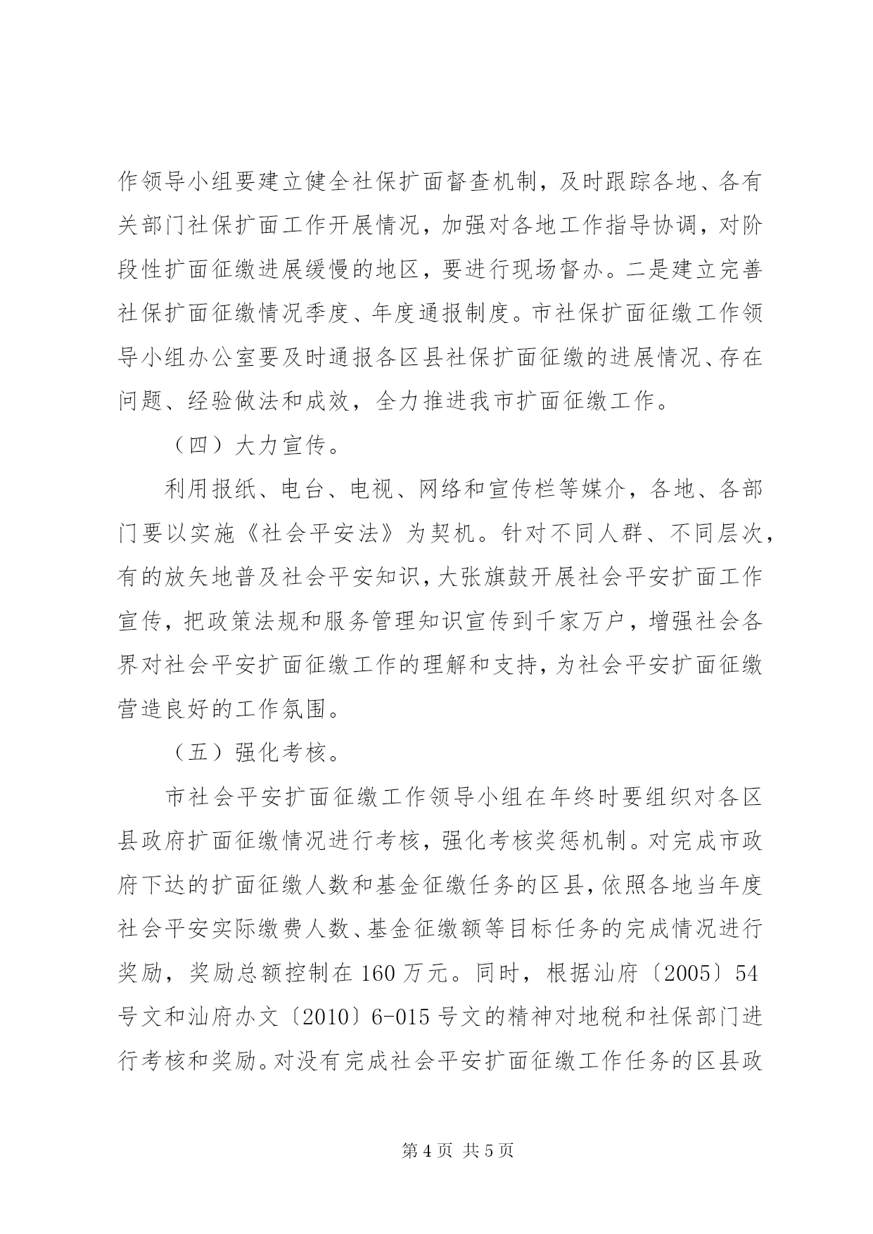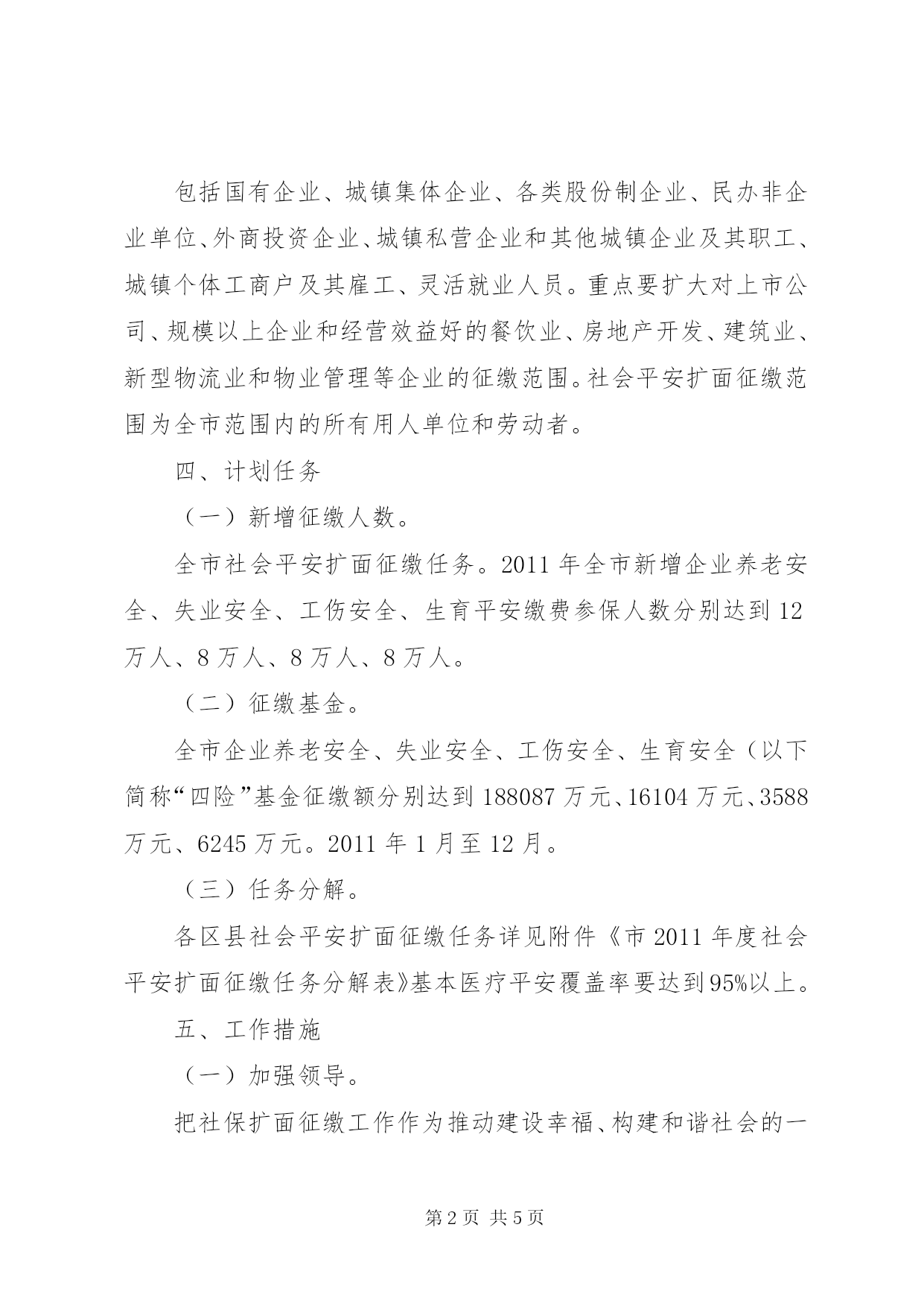 第PAGE\*Arabic\*MERGEFORMAT5页共NUMPAGES\*MERGEFORMAT5页社会保险扩面征缴指导方案推动加快建设幸福,为切实做好社会平安扩面征缴工作。根据市委办、市政府办《关于强化社会平安征缴工作的实施意见》汕市办〔2007〕16号)和市政府办《关于做好社会平安扩面征缴工作的通知》汕府办〔2010〕166号)要求,结合我市社会平安征缴情况,特制定本实施方案。一、指导思想认真贯彻落实市委九届九次和九届十次全会精神,以科学发展观为指导。围绕努力推动科学发展、加快建设幸福这一中心,以实施《社会平安法》为契机,以加快建设城乡一体化社会保证体系为目标,进一步深化思想认识,加大宣传力度,强化征缴措施,全面推进社会平安扩面征缴工作,确保完成今年社会平安扩面征缴工作任务。二、工作原则切实提高社会安全的覆盖率和征缴率;二是坚持依法行政的原则,社会平安扩面征缴工作应遵循以下原则:一是坚持“应保尽保、应收尽收”原则。妥善处置好扩面征缴和促进企业可持续发展的关系,既要注重维护劳动者的合法权益,又要充分发挥社保政策促进企业发展的作用;三是坚持归口管理和属地管理的原则,各地、各部门要切实履行职责,共同推进扩面征缴工作。三、扩面征缴范围包括国有企业、城镇集体企业、各类股份制企业、民办非企业单位、外商投资企业、城镇私营企业和其他城镇企业及其职工、城镇个体工商户及其雇工、灵活就业人员。重点要扩大对上市公司、规模以上企业和经营效益好的餐饮业、房地产开发、建筑业、新型物流业和物业管理等企业的征缴范围。社会平安扩面征缴范围为全市范围内的所有用人单位和劳动者。四、计划任务(一)新增征缴人数。全市社会平安扩面征缴任务。2011年全市新增企业养老安全、失业安全、工伤安全、生育平安缴费参保人数分别达到12万人、8万人、8万人、8万人。(二)征缴基金。全市企业养老安全、失业安全、工伤安全、生育安全(以下简称“四险”基金征缴额分别达到188087万元、16104万元、3588万元、6245万元。2011年1月至12月。(三)任务分解。各区县社会平安扩面征缴任务详见附件《市2011年度社会平安扩面征缴任务分解表》基本医疗平安覆盖率要达到95%以上。五、工作措施(一)加强领导。把社保扩面征缴工作作为推动建设幸福、构建和谐社会的一项重要内容,各级政府、各有关职能部门要充分认识到社会平安扩面征缴工作是一项关系民生福祉、关系社会稳定大局的工作。切实抓紧抓好。各级社会平安扩面征缴工作领导小组要切实加强组织领导和协调指导,落实工作责任,为社保扩面征缴工作提供强有力的保证。各区县政府要将年度社保扩面征缴任务层层下达,明确责任人,确保工作责任落实到位。(二)部门联动。明确职责,各有关部门要依照市政府办《关于做好社会平安扩面征缴工作的通知》汕市办〔2010〕166号)要求。齐抓共管,密切配合,形成整体联动工作机制。人力资源社会保证部门要加强综合管理和监督指导,加大社保征缴情况执法监察力度,确保应保尽保,维护职工权益。地税机关要强化征收手段,加强稽核检查,凡已申报个人所得税的企业应严格依照申报的人数确保全员参保,做到应保尽保,做到应收尽收,千方百计提高征缴率。市财政部门、审计部门、工商行政管理部门、公安部门要依照各自职责,协助做好社会平安扩面工作。各部门要充分发挥职能作用,联动协作,进一步强化社会平安扩面征缴手段,全力以赴推进社会平安扩面征缴工作。(三)健全制度。及时开展督查指导,各地、各部门要加强工作协调。确保社会平安扩面征缴工作按目标顺利推进。一是各级社保扩面征缴工作领导小组要建立健全社保扩面督查机制,及时跟踪各地、各有关部门社保扩面工作开展情况,加强对各地工作指导协调,对阶段性扩面征缴进展缓慢的地区,要进行现场督办。二是建立完善社保扩面征缴情况季度、年度通报制度。市社保扩面征缴工作领导小组办公室要及时通报各区县社保扩面征缴的进展情况、存在问题、经验做法和成效,全力推进我市扩面征缴工作。(四)大力宣传。利用报纸、电台、电视、网络和宣传栏等媒介,各地、各部门要以实施《社会平安法》为契机。针对不同人群、不同层次,有的放矢地普及社会平安知识,大张旗鼓开展社会平安扩面工作宣传,把政策法规和服务管理知识宣传到千家万户,增强社会各界对社会平安扩面征缴工作的理解和支持,为社会平安扩面征缴营造良好的工作氛围。(五)强化考核。市社会平安扩面征缴工作领导小组在年终时要组织对各区县政府扩面征缴情况进行考核,强化考核奖惩机制。对完成市政府下达的扩面征缴人数和基金征缴任务的区县,依照各地当年度社会平安实际缴费人数、基金征缴额等目标任务的完成情况进行奖励,奖励总额控制在160万元。同时,根据汕府〔2005〕54号文和汕府办文〔2010〕6-015号文的精神对地税和社保部