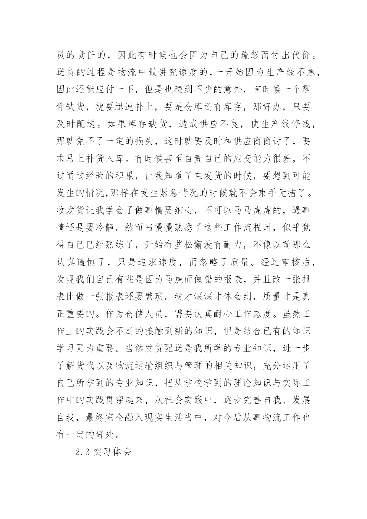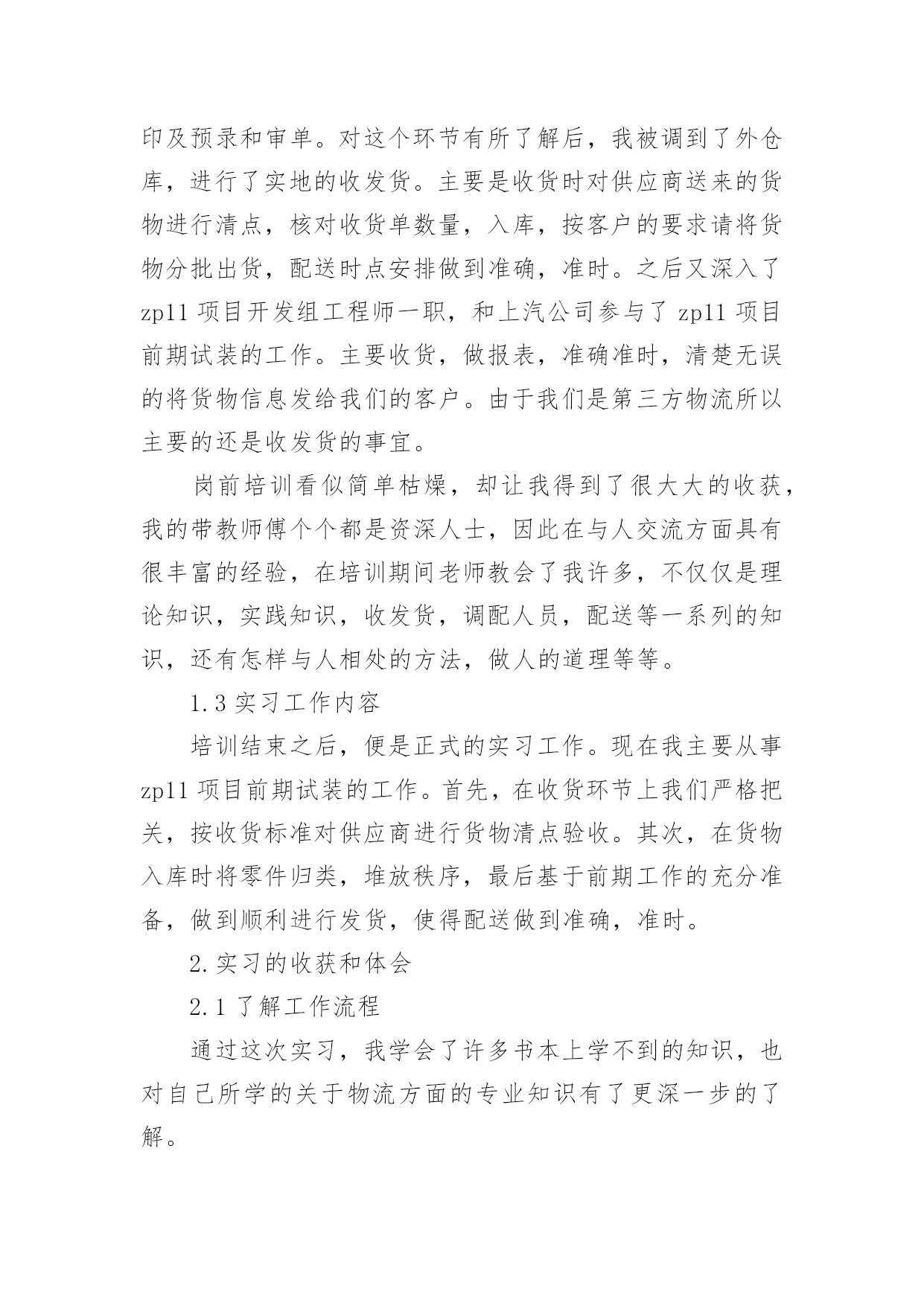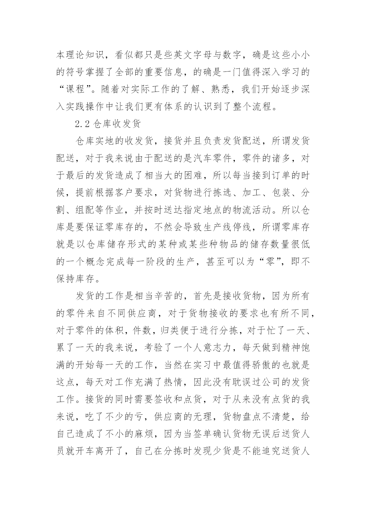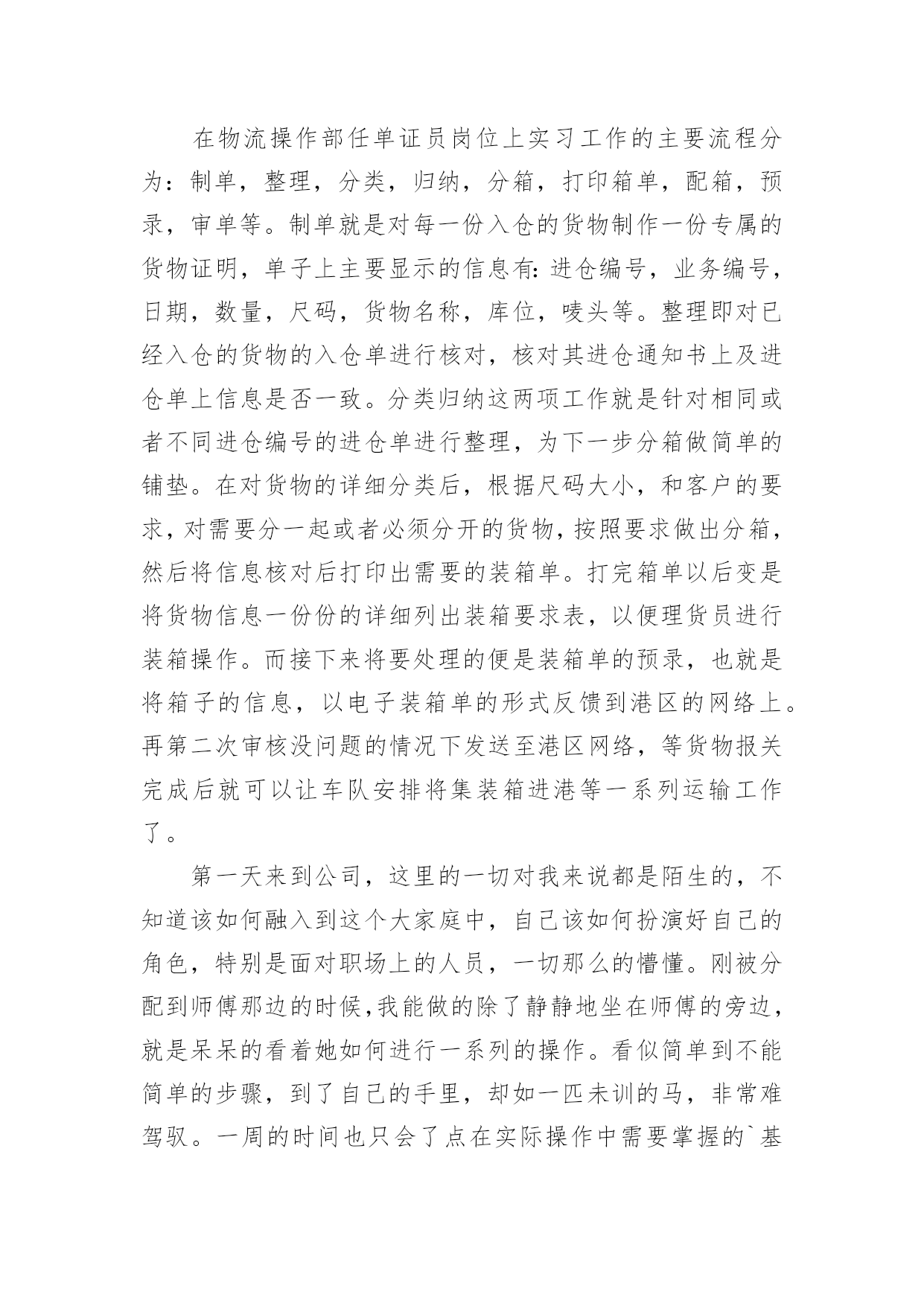 物流专业实习报告物流专业实习报告通用我们眼下的社会,报告的用途越来越大,报告根据用途的不同也有着不同的类型。写起报告来就毫无头绪?下面是小编帮大家整理的物流专业实习报告通用,欢迎阅读与收藏。物流专业实习报告通用1为了以后能更好的适应工作和学习,在连续几天关注的招聘信息里得知了xx有限公司,并且知道该公司正在招聘应届大学生作为物流人才的培养对象,我便自信满满的填上了应聘信息。在经过了初试复试之后,顺利的进入了xx有限公司其下属单位xx有限公司进行实习。1.实习内容1.1实习单位简介xx有限公司,该公司成立于xx年xx月xx日,是船舶代理行业协会会员单位,专业委员会委员单位,同时也是xx市国际货运代理行业协会的理事单位。我从xx年x月21日开始在该单位实习。实习期间,我在xx有限公司物流操作部任单证员一职。1.2实习岗位和培训我实习的岗位是物流操作部任单证员一职。主要从事的工作是对仓储部的进仓单进行整理归纳,以及对装箱单的打印及预录和审单。对这个环节有所了解后,我被调到了外仓库,进行了实地的收发货。主要是收货时对供应商送来的货物进行清点,核对收货单数量,入库,按客户的要求请将货物分批出货,配送时点安排做到准确,准时。之后又深入了zp11项目开发组工程师一职,和上汽公司参与了zp11项目前期试装的工作。主要收货,做报表,准确准时,清楚无误的将货物信息发给我们的客户。由于我们是第三方物流所以主要的还是收发货的事宜。岗前培训看似简单枯燥,却让我得到了很大大的收获,我的带教师傅个个都是资深人士,因此在与人交流方面具有很丰富的经验,在培训期间老师教会了我许多,不仅仅是理论知识,实践知识,收发货,调配人员,配送等一系列的知识,还有怎样与人相处的方法,做人的道理等等。1.3实习工作内容培训结束之后,便是正式的实习工作。现在我主要从事zp11项目前期试装的工作。首先,在收货环节上我们严格把关,按收货标准对供应商进行货物清点验收。其次,在货物入库时将零件归类,堆放秩序,最后基于前期工作的充分准备,做到顺利进行发货,使得配送做到准确,准时。2.实习的收获和体会2.1了解工作流程通过这次实习,我学会了许多书本上学不到的知识,也对自己所学的关于物流方面的专业知识有了更深一步的了解。在物流操作部任单证员岗位上实习工作的主要流程分为:制单,整理,分类,归纳,分箱,打印箱单,配箱,预录,审单等。制单就是对每一份入仓的货物制作一份专属的货物证明,单子上主要显示的信息有:进仓编号,业务编号,日期,数量,尺码,货物名称,库位,唛头等。整理即对已经入仓的货物的入仓单进行核对,核对其进仓通知书上及进仓单上信息是否一致。分类归纳这两项工作就是针对相同或者不同进仓编号的进仓单进行整理,为下一步分箱做简单的铺垫。在对货物的详细分类后,根据尺码大小,和客户的要求,对需要分一起或者必须分开的货物,按照要求做出分箱,然后将信息核对后打印出需要的装箱单。打完箱单以后变是将货物信息一份份的详细列出装箱要求表,以便理货员进行装箱操作。而接下来将要处理的便是装箱单的预录,也就是将箱子的信息,以电子装箱单的形式反馈到港区的网络上。再第二次审核没问题的情况下发送至港区网络,等货物报关完成后就可以让车队安排将集装箱进港等一系列运输工作了。第一天来到公司,这里的一切对我来说都是陌生的,不知道该如何融入到这个大家庭中,自己该如何扮演好自己的角色,特别是面对职场上的人员,一切那么的懵懂。刚被分配到师傅那边的时候,我能做的除了静静地坐在师傅的旁边,就是呆呆的看着她如何进行一系列的操作。看似简单到不能简单的步骤,到了自己的手里,却如一匹未训的马,非常难驾驭。一周的时间也只会了点在实际操作中需要掌握的`基本理论知识,看似都只是些英文字母与数字,确是这些小小的符号掌握了全部的重要信息,的确是一门值得深入学习的“课程”。随着对实际工作的了解、熟悉,我们开始逐步深入实践操作中让我们更有体系的认识到了整个流程。2.2仓库收发货仓库实地的收发货,接货并且负责发货配送,所谓发货配送,对于我来说由于配送的是汽车零件,零件的诸多,对于最后的发货造成了相当大的困难,所以每当接到订单的时候,提前根据客户要求,对货物进行拣选、加工、包装、分割、组配等作业,并按时送达指定地点的物流活动。所以仓库是要保证零库存的,不然会导致生产线停线,所谓零库存就是以仓库储存形式的某种或某些种物品的储存数量很低的一个概念完成每一阶段的生产,甚至可以为“零”,即不保持库存。发货的工作是相当辛苦的,首先是接收货物,因为所有的零件来自不同供应商,对于货物接收的要求也有所不同,对于零件的体积,件数,归类便于进行分拣,对于忙了一天、累了一天的我来说,考验了一个人意志力,每天做到精神饱满的开始每一天的工作,当然在实习中最值得骄傲的也就是这点,每天对工作充满