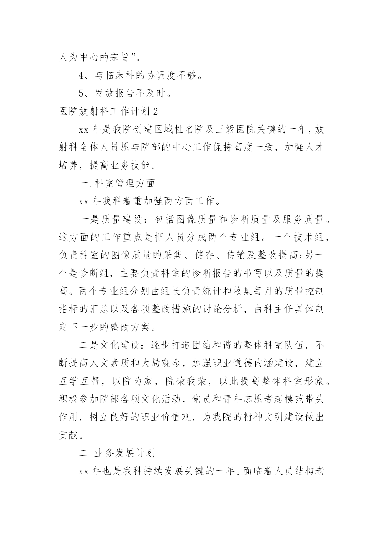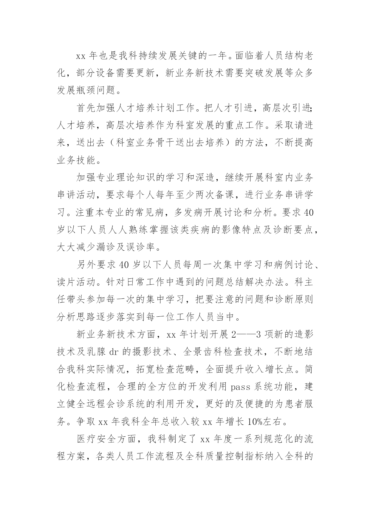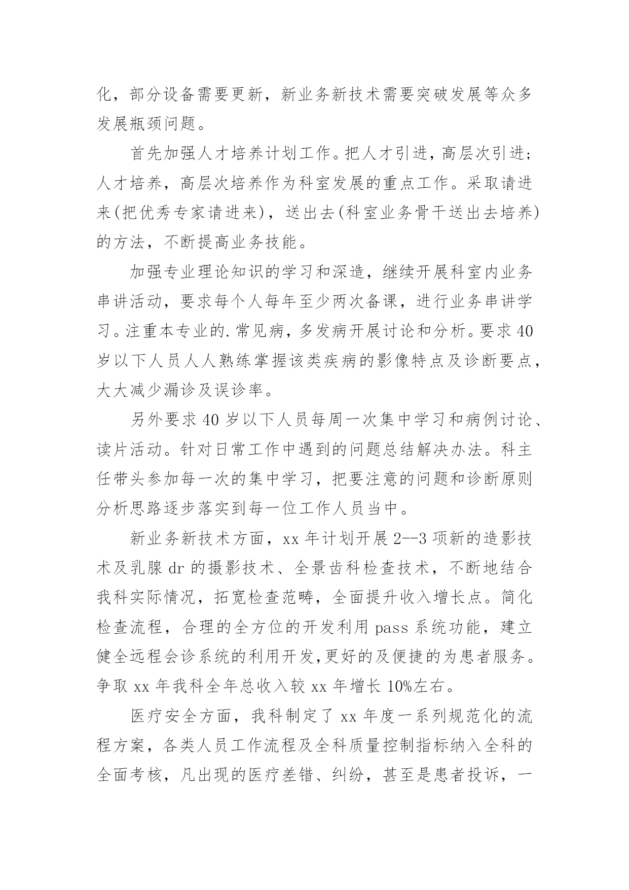 医院放射科工作计划医院放射科工作计划10篇时间过得可真快,从来都不等人,我们的工作又将迎来新的进步,现在就让我们好好地规划一下吧。什么样的计划才是好的计划呢?下面是小编为大家收集的医院放射科工作计划,供大家参考借鉴,希望可以帮助到有需要的朋友。医院放射科工作计划1医院放射科工作计划一年来,在院领导的正确领导下,在医院各科室的大力支持下,我科室同志齐心合力,坚持以病人为中心,提高医疗服务质量为主题,树立高度的事业心和责任心,努力学习、钻研业务,围绕本科室的工作性质,求真务实、踏实苦干,较好地完成医院下达的各项工作任务,现将本年度的'工作总结和科室开展情况作一系统回顾:一、基本情况放射科分为CT室和普放两个科室,现有医务人员5人,其中1人为聘用人员,CT室2人,普放3人。获资格证书3人,放射上岗证5人具有。医疗设备方面:CT室、西门子CT机一台、柯机激光相机一台、洗片机1台、空调3台,为了报告单的规范整洁,并配置了电脑及打印报告工作部。普放方面:现有上海500mA及北京万东300mAX光机各一台,洗片机2台,空调1台,除湿机1台,为了报告的规范性也配置了电脑以及打印机。二、工作开展情况科室全体人员积极参加院内外的业务学习,努力提高自己的业务素质和业务水平,不断更新、知识、提高技术水平,加上我院积极开展“树行业新风,创一流服务活动,就医人员不断增加,截止到12月31日”1、普放摄片人数达到4520张,其中合医1080张,医保720张,门诊和住院病人检查2720人次,检查人次比20xx年增加880人次。甲片率张数3616,其符合率达到80%,乙片张数452,其符合率小于15%。诊断符合率达到70%。2、透视方面:干部职工健康体检1102人次,学生1328人次,征兵体检60余人次。特殊造影:48例。其总收入为144390元。CT室:由(10月7日至12月30日)共接待病人338人次,总收入74360元。月收入突破2万元以上。三、存在的问题1、书写报告不规范,详简不一,没有统一认可的标准,漏诊率较高,导致临床不信任放射科报告。2、提高质量不高,许多体位不够标准,有责任心因素,技术因素,暗房及胶片因素。3、部份医生态度差,话语不够温馨,显示不出“以病人为中心的宗旨”。4、与临床科的协调度不够。5、发放报告不及时。医院放射科工作计划2xx年是我院创建区域性名院及三级医院关键的一年,放射科全体人员愿与院部的中心工作保持高度一致,加强人才培养,提高业务技能。一.科室管理方面xx年我科着重加强两方面工作。一是质量建设:包括图像质量和诊断质量及服务质量。这方面的工作重点是把人员分成两个专业组。一个技术组,负责科室的图像质量的采集、储存、传输及整改提高;另一个是诊断组,主要负责科室的诊断报告的书写以及质量的提高。两个专业组分别由组长负责统计和收集每月的质量控制指标的汇总以及各项整改措施的讨论分析,由科主任具体制定下一步的整改方案。二是文化建设:逐步打造团结和谐的整体科室队伍,不断提高人文素质和大局观念,加强职业道德内涵建设,建立互学互帮,以院为家,院荣我荣,以此提高整体科室形象。积极参加院部各项文化活动,党员和青年志愿者起模范带头作用,树立良好的职业价值观,为我院的精神文明建设做出贡献。二.业务发展计划xx年也是我科持续发展关键的一年。面临着人员结构老化,部分设备需要更新,新业务新技术需要突破发展等众多发展瓶颈问题。首先加强人才培养计划工作。把人才引进,高层次引进;人才培养,高层次培养作为科室发展的重点工作。采取请进来(把优秀专家请进来),送出去(科室业务骨干送出去培养)的方法,不断提高业务技能。加强专业理论知识的学习和深造,继续开展科室内业务串讲活动,要求每个人每年至少两次备课,进行业务串讲学习。注重本专业的.常见病,多发病开展讨论和分析。要求40岁以下人员人人熟练掌握该类疾病的影像特点及诊断要点,大大减少漏诊及误诊率。另外要求40岁以下人员每周一次集中学习和病例讨论、读片活动。针对日常工作中遇到的问题总结解决办法。科主任带头参加每一次的集中学习,把要注意的问题和诊断原则分析思路逐步落实到每一位工作人员当中。新业务新技术方面,xx年计划开展2--3项新的造影技术及乳腺dr的摄影技术、全景齿科检查技术,不断地结合我科实际情况,拓宽检查范畴,全面提升收入增长点。简化检查流程,合理的全方位的开发利用pass系统功能,建立健全远程会诊系统的利用开发,更好的及便捷的为患者服务。争取xx年我科全年总收入较xx年增长10%左右。医疗安全方面,我科制定了xx年度一系列规范化的流程方案,各类人员工作流程及全科质量控制指标纳入全科的全面考核,凡出现的医疗差错、纠纷,甚至是患者投诉,一律召开全科人员讨论会,查找原因,制定整改措施,避免事件重复发生。xx年全年全科争取不