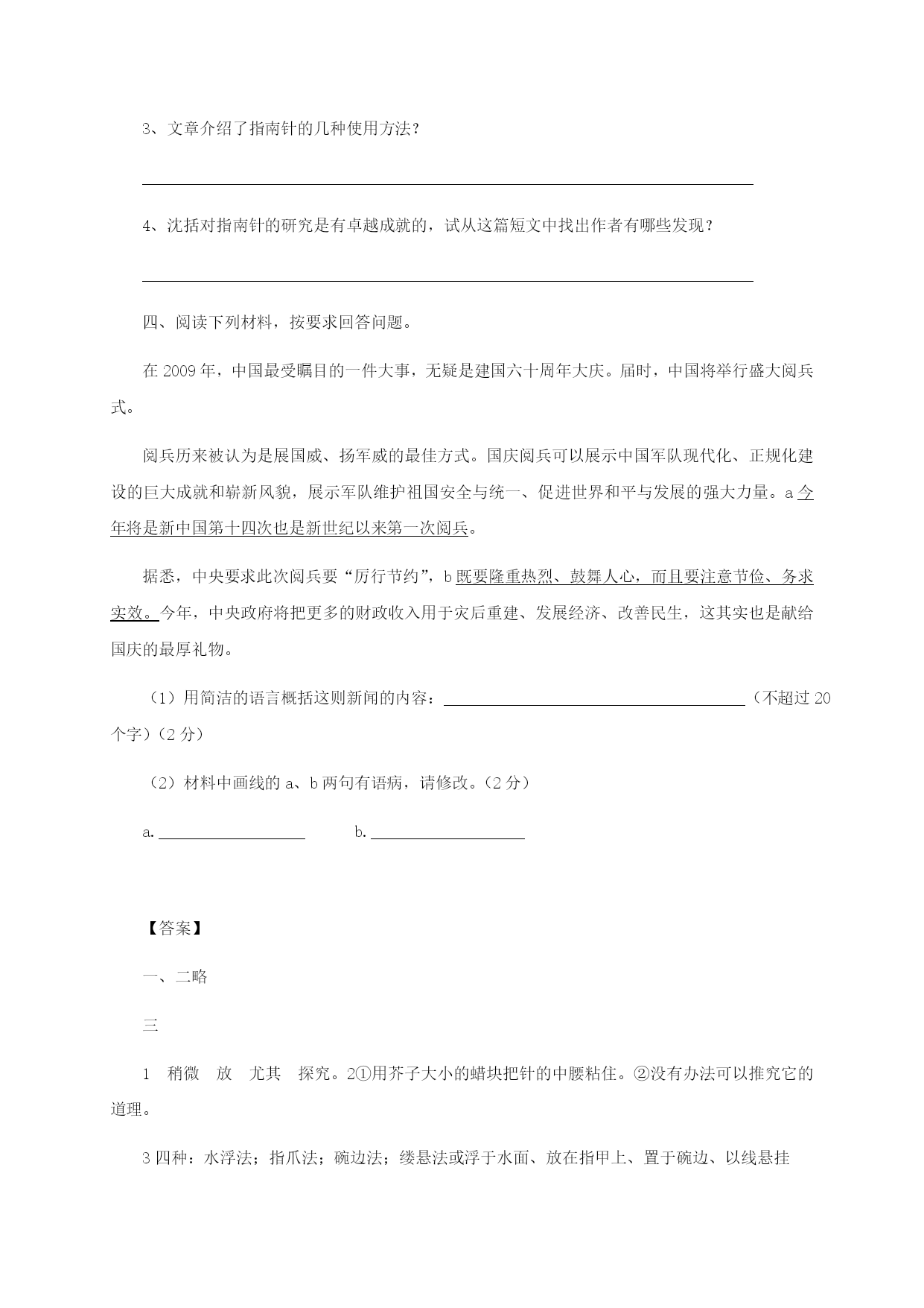 2016年中考语文限时集训(十八)一、给拼音写汉字,给汉字注音。陶冶()蓬蒿()恐吓()吮吸()咀嚼()奄奄一息()骸骨()纤夫()咳sòu()无精打cǎi()蹂lìn()憔cuì()疲bèi()蜿yán()灰jìn()端xiáng()二、课文默写(1)无丝竹之乱耳,。(2)夕阳西下,。(3)予谓菊,。(4)《山坡羊》中揭示全文主旨的的句子:三、文言文阅读方家(2)以磁石磨针锋,则能指南;然常微偏东,不全南也。水浮多荡摇,指爪及碗唇(3)上皆可为之,运转尤速,但坚滑易坠,不若缕悬(4)为最善。其法:取新纩(5)中独茧缕(6),以芥子许腊缀于针腰(7),无风处悬之,则针常指南。其中有磨而指北者(8)。予家指南、北者皆有之。磁石之指南,犹柏之指西,莫可原其理。注释:选自《梦溪笔谈》。(2)碗边。(4)用丝线悬挂。(5)单根的蚕丝。(7)(有的针)用磁石磨后指北。1、解释加点的字然常微偏东()上皆可为之()运转尤速()莫可原其理()2、翻译句子①以芥子许腊缀于针腰②莫可原其理3、文章介绍了指南针的几种使用方法?___________________________________________________________________________4、沈括对指南针的研究是有卓越成就的,试从这篇短文中找出作者有哪些发现?___________________________________________________________________________四、阅读下列材料,按要求回答问题。在2009年,中国最受瞩目的一件大事,无疑是建国六十周年大庆。届时,中国将举行盛大阅兵式。阅兵历来被认为是展国威、扬军威的最佳方式。国庆阅兵可以展示中国军队现代化、正规化建设的巨大成就和崭新风貌,展示军队维护祖国安全与统一、促进世界和平与发展的强大力量。a今年将是新中国第十四次也是新世纪以来第一次阅兵。据悉,中央要求此次阅兵要“厉行节约”,b既要隆重热烈、鼓舞人心,而且要注意节俭、务求实效。今年,中央政府将把更多的财政收入用于灾后重建、发展经济、改善民生,这其实也是献给国庆的最厚礼物。(1)用简洁的语言概括这则新闻的内容:(不超过20个字)(2分)(2)材料中画线的a、b两句有语病,请修改。(2分)a.b.【答案】一、二略三1稍微放尤其探究。2①用芥子大小的蜡块把针的中腰粘住。②没有办法可以推究它的道理。3四种:水浮法;指爪法;碗边法;缕悬法或浮于水面、放在指甲上、置于碗边、以线悬挂4(1)磁针指向不是正南方,而是略偏东(2)磁针有四种装置方法,缕悬法最好(3)磁针有指南、指北之分译文方家(只的是当时的方士,就是道士的前身术士)用磁石磨针的针尖,针尖就能指向南方,但是常常稍微向东偏,不完全指南,放在水面上经常摇摆。在手指甲以及碗沿上都能放指南针,针转的速度尤其快,但是针坚硬光滑容易掉下,不如用细绳悬挂起来最好。这个方法是取新贡献来的棉框里的单根茧丝,用芥末大小的蜡,粘在针腰上,在没有风的地方悬起来,则针尖大多都指向南方。其中也有磨完后指向北方的。我家的针指南、指北的都有。磁石指南,就像柏数指西,没有人能推究出它们的原理。四(1)六十年大阅兵“厉行节约”,务求实效。(2)a、在“今年”后加上“的阅兵”或将“是”该为“举行”b、将“而且”该为“又”或“也”,也可将“既”该为“不仅”。