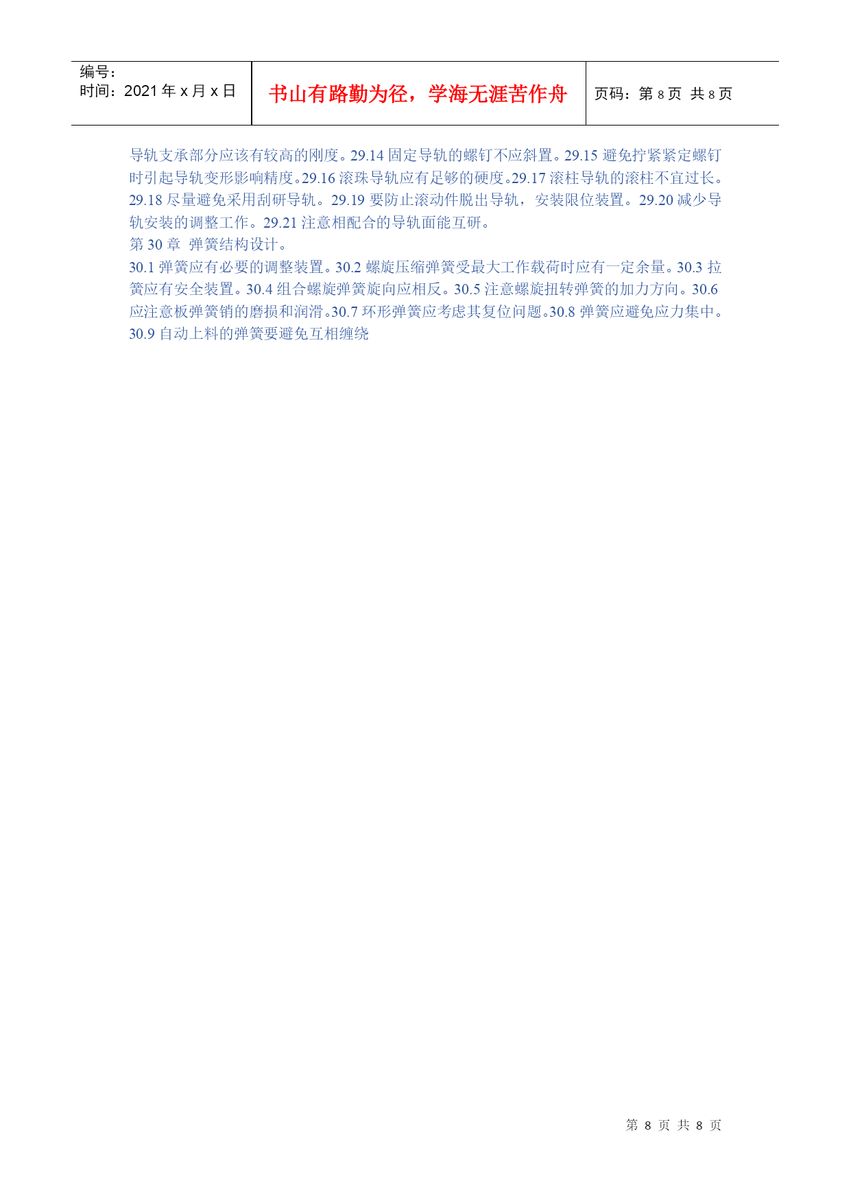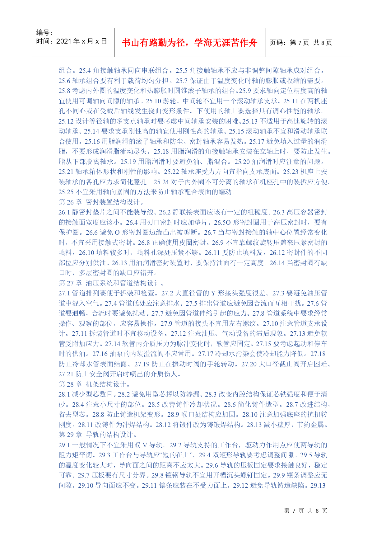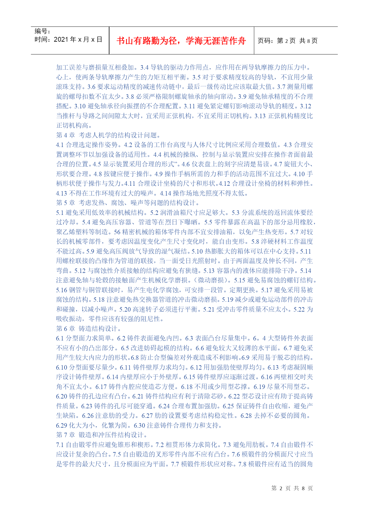 编号:时间:2021年x月x日书山有路勤为径,学海无涯苦作舟页码:第PAGE8页共NUMPAGES8页第PAGE\*MERGEFORMAT8页共NUMPAGES\*MERGEFORMAT8页HYPERLINK""机械设计禁忌500例第1章提高强度和刚度的结构设计。1.1避免受力点与支持点距离太远。1.2避免悬臂结构或减小悬臂长度。1.3勿忽略工作载荷可以产生的有利作用。1.4受振动载荷的零件避免用摩擦传力。1.5避免机构中的不平衡力。1.6避免只考虑单一的传力途径。1.7不应忽略在工作时零件变形对于受力分布的影响。1.8避免铸铁件受大的拉伸应力。1.9避免细杆受弯曲应力。1.10受冲击载荷零件避免刚度过大。1.11受变应力零件避免表面过于粗糙或有划痕。1.12受变应力零件表面应避免有残余拉应力。1.13受变载荷零件应避免或减小应力集中。1.14避免影响强度的局部结构相距太近。1.15避免预变形与工作负载产生的变形方向相同。1.16钢丝绳的滑轮与卷筒直径不能太小。1.17避免钢丝绳弯曲次数太多,特别注意避免反复弯曲。1.18起重时钢丝绳与卷筒联接处要留有余量。1.19可以不传力的中间零件应尽量避免受力。1.20尽量避免安装时轴线不对中产生的附加力。1.21尽量减小作用在地基上的力。第2章提高耐磨性的结构设计。2.1避免相同材料配成滑动摩擦副。2.2避免白合金耐磨层厚度太大。2.3避免为提高零件表面耐磨性能而提高对整个零件的要求。2.4避免大零件局部磨损而导致整个零件报废。2.5用白合金作轴承衬时,应注意轴瓦材料的选择和轴瓦结构设计。2.6润滑剂供应充分,布满工作面。2.7润滑油箱不能太小。2.8勿使过滤器滤掉润滑剂中的添加剂。2.9滑动轴承的油沟尺寸、位置、形状应合理。2.10滚动轴承中加入润滑脂量不宜过多。2.11对于零件的易磨损表面增加一定的磨损裕量。2.12注意零件磨损后的调整。2.13同一接触面上各点之间的速度、压力差应该小。2.14采用防尘装置防止磨粒磨损。2.15避免形成阶梯磨损。2.16滑动轴承不能用接触式油封。2.17对易磨损部分应予以保护。2.18对易磨损件可以采用自动补偿磨损的结构。第3章提高精度的结构设计。3.1尽量不采用不符合阿贝原则的结构方案。3.2避免磨损量产生误差的互相叠加。3.3避免加工误差与磨损量互相叠加。3.4导轨的驱动力作用点,应作用在两导轨摩擦力的压力中。心上,使两条导轨摩擦力产生的力矩互相平衡。3.5对于要求精度较高的导轨,不宜用少量滚珠支持。3.6要求运动精度的减速传动链中,最后一级传动比应该取最大值。3.7测量用螺旋的螺母扣数不宜太少。3.8必须严格限制螺旋轴承的轴向窜动。3.9避免轴承精度的不合理搭配。3.10避免轴承径向振摆的不合理配置。3.11避免紧定螺钉影响滚动导轨的精度。3.12当推杆与导路之间间隙太大时,宜采用正弦机构,不宜采用正切机构。3.13正弦机构精度比正切机构高。第4章考虑人机学的结构设计问题。4.1合理选定操作姿势。4.2设备的工作台高度与人体尺寸比例应采用合理数值。4.3合理安置调整环节以加强设备的适用性。4.4机械的操纵、控制与显示装置应安排在操作者面前最合理的位置。4.5显示装置采用合理的形式”。4.6仪表盘上的刻字应清楚易读。4.7旋钮大小、形状要合理。4.8按键应便于操作。4.9操作手柄所需的力和手的活动范围不宜过大。4.10手柄形状便于操作与发力。4.11合理设计坐椅的尺寸和形状。4.12合理设计坐椅的材料和弹性。4.13不得在工作环境有过大的噪声。4.14操作场地光照度不得太低。第5章考虑发热、腐蚀、噪声等问题的结构设计。5.1避免采用低效率的机械结构。5.2润滑油箱尺寸应足够大。5.3分流系统的返回流体要经过冷却。5.4避免高压容器、管道等在烈日下曝晒。5.5零件暴露在高温下的部分忌用橡胶,聚乙烯塑料等制造。56精密机械的箱体零件内部不宜安排油箱,以免产生热变形。5.7对较长的机械零部件,要考虑因温度变化产生尺寸变化时,能自由变形。5.8淬硬材料工作温度不能过高。5.9避免高压阀放气导致的湿气凝结。5.10热膨胀大的箱体可以在中心支持。5.11用螺栓联接的凸缘作为管道的联接,当一面受日光照射时。由于两面温度及伸长不同,产生弯曲。5.12与腐蚀性介质接触的结构应避免有狭缝。5.13容器内的液体应能排除干净。5.14注意避免轴与轮毂的接触面产生机械化学磨损。(微动磨损)。5.15避免易腐蚀的螺钉结构。5.16钢管与铜管联接时,易产生电化学腐蚀,可安排一段管。定期更换。5.17避免采用易被腐蚀的结构。5.18注意避免热交换器管道的冲击微动磨损。5.19减少或避免运动部件的冲