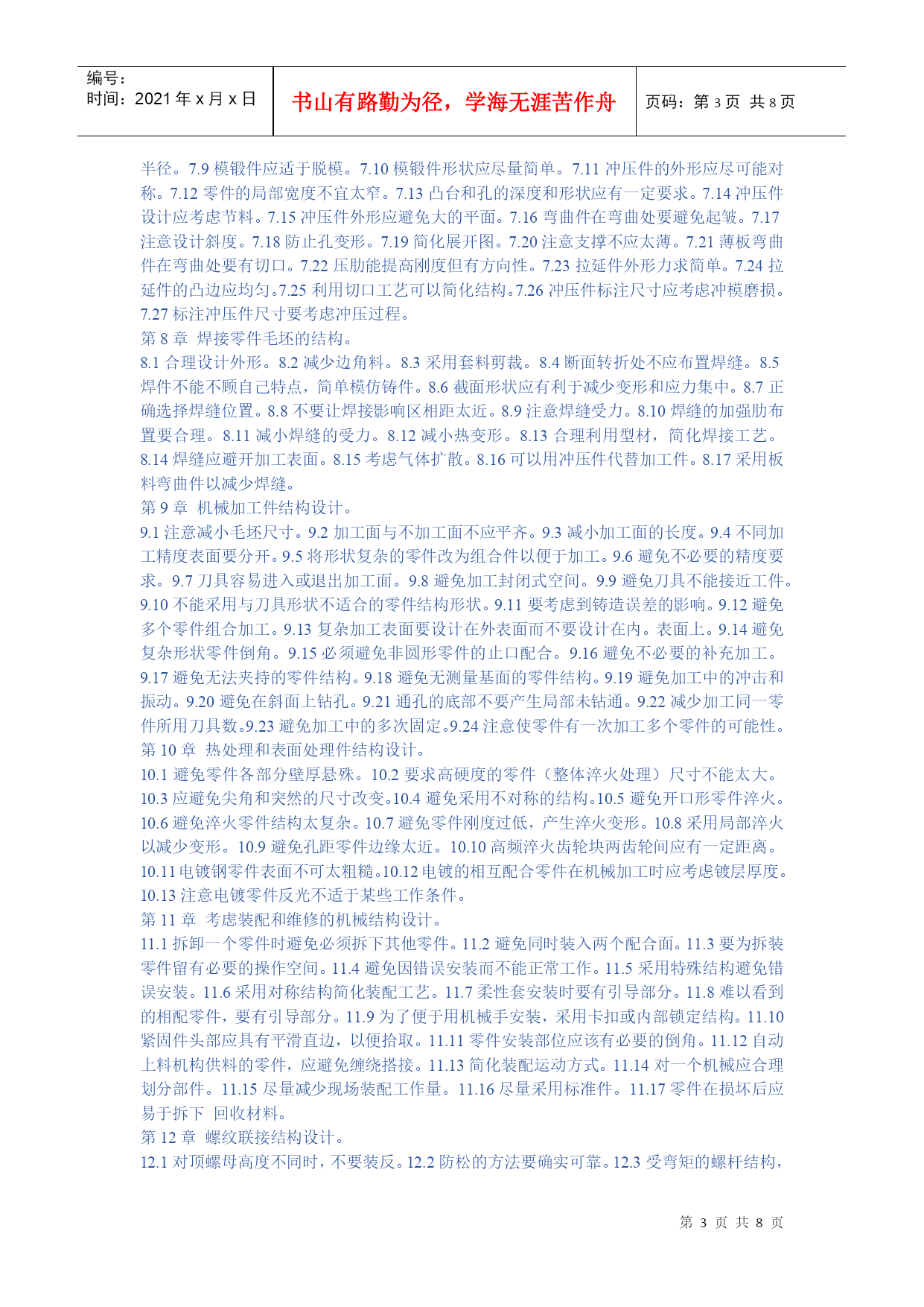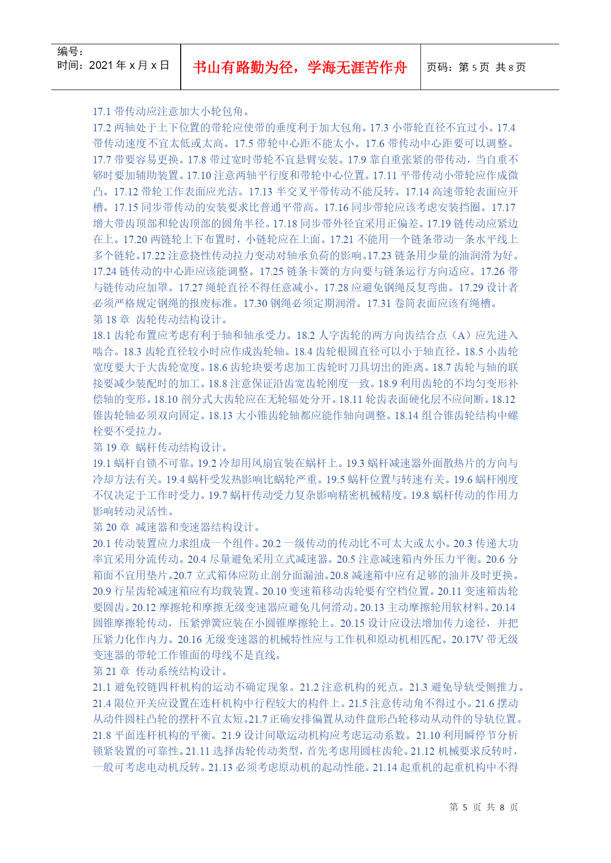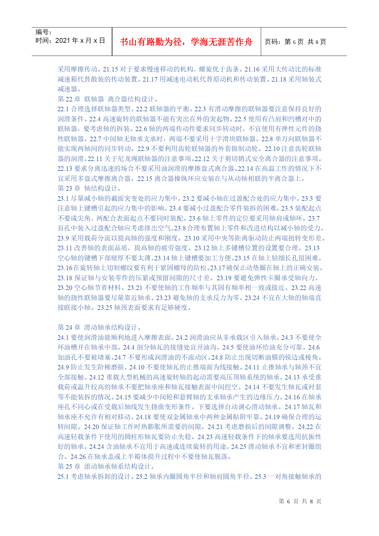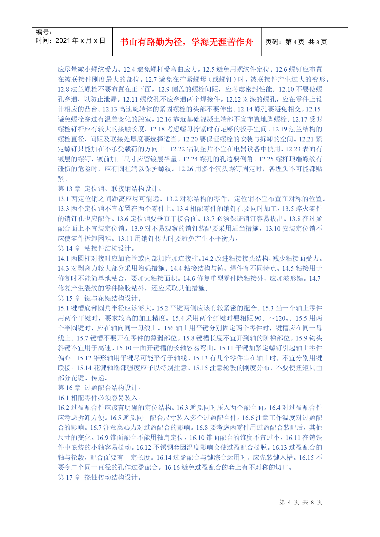 编号:时间:2021年x月x日书山有路勤为径,学海无涯苦作舟页码:第PAGE8页共NUMPAGES8页第PAGE\*MERGEFORMAT8页共NUMPAGES\*MERGEFORMAT8页HYPERLINK""机械设计禁忌500例第1章提高强度和刚度的结构设计。1.1避免受力点与支持点距离太远。1.2避免悬臂结构或减小悬臂长度。1.3勿忽略工作载荷可以产生的有利作用。1.4受振动载荷的零件避免用摩擦传力。1.5避免机构中的不平衡力。1.6避免只考虑单一的传力途径。1.7不应忽略在工作时零件变形对于受力分布的影响。1.8避免铸铁件受大的拉伸应力。1.9避免细杆受弯曲应力。1.10受冲击载荷零件避免刚度过大。1.11受变应力零件避免表面过于粗糙或有划痕。1.12受变应力零件表面应避免有残余拉应力。1.13受变载荷零件应避免或减小应力集中。1.14避免影响强度的局部结构相距太近。1.15避免预变形与工作负载产生的变形方向相同。1.16钢丝绳的滑轮与卷筒直径不能太小。1.17避免钢丝绳弯曲次数太多,特别注意避免反复弯曲。1.18起重时钢丝绳与卷筒联接处要留有余量。1.19可以不传力的中间零件应尽量避免受力。1.20尽量避免安装时轴线不对中产生的附加力。1.21尽量减小作用在地基上的力。第2章提高耐磨性的结构设计。2.1避免相同材料配成滑动摩擦副。2.2避免白合金耐磨层厚度太大。2.3避免为提高零件表面耐磨性能而提高对整个零件的要求。2.4避免大零件局部磨损而导致整个零件报废。2.5用白合金作轴承衬时,应注意轴瓦材料的选择和轴瓦结构设计。2.6润滑剂供应充分,布满工作面。2.7润滑油箱不能太小。2.8勿使过滤器滤掉润滑剂中的添加剂。2.9滑动轴承的油沟尺寸、位置、形状应合理。2.10滚动轴承中加入润滑脂量不宜过多。2.11对于零件的易磨损表面增加一定的磨损裕量。2.12注意零件磨损后的调整。2.13同一接触面上各点之间的速度、压力差应该小。2.14采用防尘装置防止磨粒磨损。2.15避免形成阶梯磨损。2.16滑动轴承不能用接触式油封。2.17对易磨损部分应予以保护。2.18对易磨损件可以采用自动补偿磨损的结构。第3章提高精度的结构设计。3.1尽量不采用不符合阿贝原则的结构方案。3.2避免磨损量产生误差的互相叠加。3.3避免加工误差与磨损量互相叠加。3.4导轨的驱动力作用点,应作用在两导轨摩擦力的压力中。心上,使两条导轨摩擦力产生的力矩互相平衡。3.5对于要求精度较高的导轨,不宜用少量滚珠支持。3.6要求运动精度的减速传动链中,最后一级传动比应该取最大值。3.7测量用螺旋的螺母扣数不宜太少。3.8必须严格限制螺旋轴承的轴向窜动。3.9避免轴承精度的不合理搭配。3.10避免轴承径向振摆的不合理配置。3.11避免紧定螺钉影响滚动导轨的精度。3.12当推杆与导路之间间隙太大时,宜采用正弦机构,不宜采用正切机构。3.13正弦机构精度比正切机构高。第4章考虑人机学的结构设计问题。4.1合理选定操作姿势。4.2设备的工作台高度与人体尺寸比例应采用合理数值。4.3合理安置调整环节以加强设备的适用性。4.4机械的操纵、控制与显示装置应安排在操作者面前最合理的位置。4.5显示装置采用合理的形式”。4.6仪表盘上的刻字应清楚易读。4.7旋钮大小、形状要合理。4.8按键应便于操作。4.9操作手柄所需的力和手的活动范围不宜过大。4.10手柄形状便于操作与发力。4.11合理设计坐椅的尺寸和形状。4.12合理设计坐椅的材料和弹性。4.13不得在工作环境有过大的噪声。4.14操作场地光照度不得太低。第5章考虑发热、腐蚀、噪声等问题的结构设计。5.1避免采用低效率的机械结构。5.2润滑油箱尺寸应足够大。5.3分流系统的返回流体要经过冷却。5.4避免高压容器、管道等在烈日下曝晒。5.5零件暴露在高温下的部分忌用橡胶,聚乙烯塑料等制造。56精密机械的箱体零件内部不宜安排油箱,以免产生热变形。5.7对较长的机械零部件,要考虑因温度变化产生尺寸变化时,能自由变形。5.8淬硬材料工作温度不能过高。5.9避免高压阀放气导致的湿气凝结。5.10热膨胀大的箱体可以在中心支持。5.11用螺栓联接的凸缘作为管道的联接,当一面受日光照射时。由于两面温度及伸长不同,产生弯曲。5.12与腐蚀性介质接触的结构应避免有狭缝。5.13容器内的液体应能排除干净。5.14注意避免轴与轮毂的接触面产生机械化学磨损。(微动磨损)。5.15避免易腐蚀的螺钉结构。5.16钢管与铜管联接时,易产生电化学腐蚀,可安排一段管。定期更换。5.17避免采用易被腐蚀的结构。5.18注意避免热交换器管道的冲击微动磨损。5.19减少或避免运动部件的冲