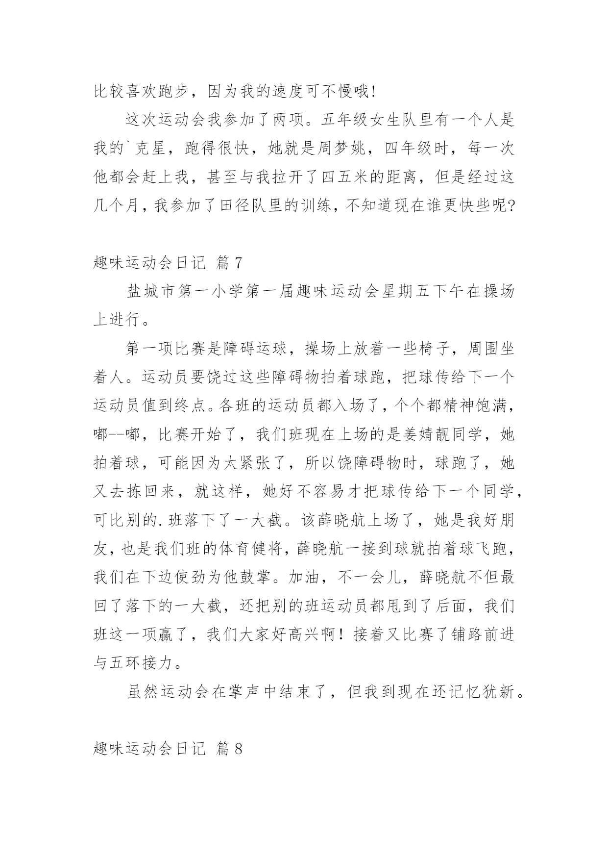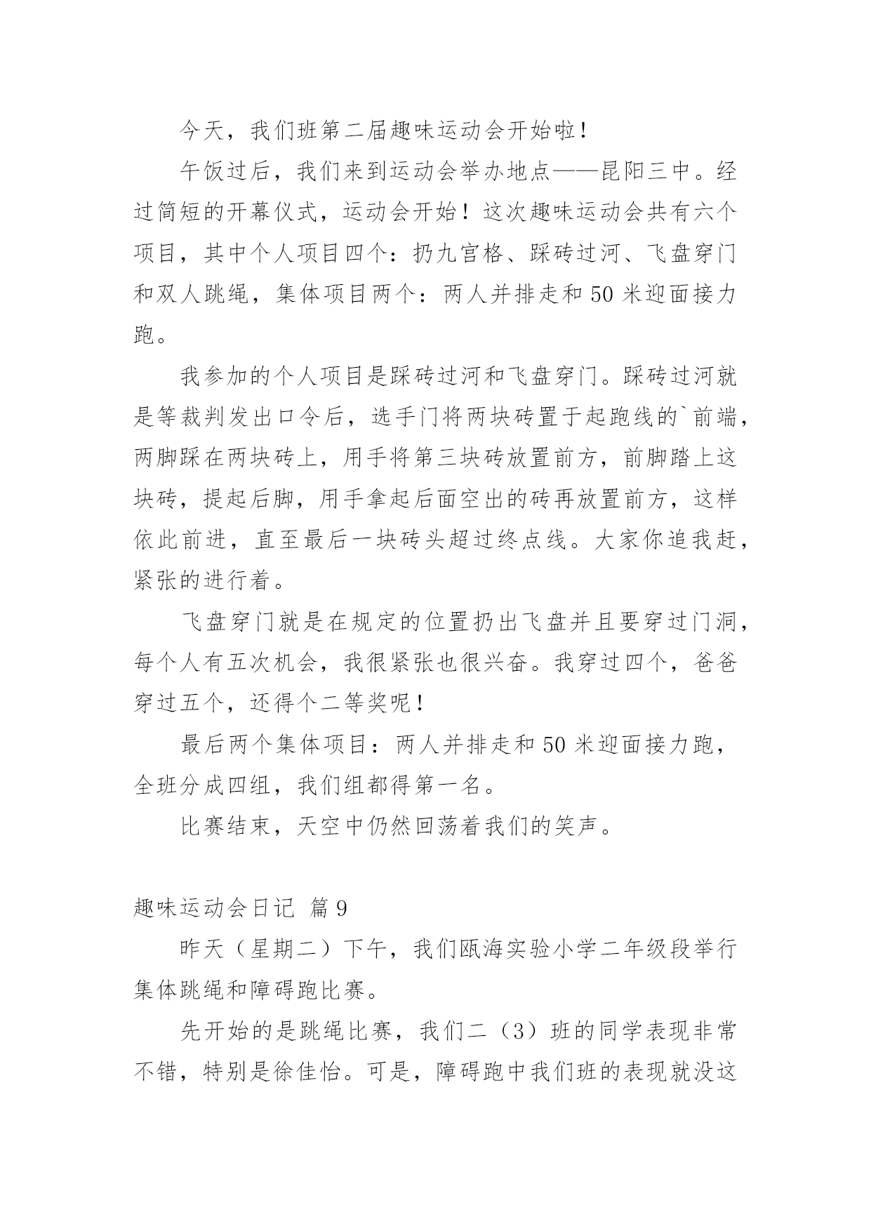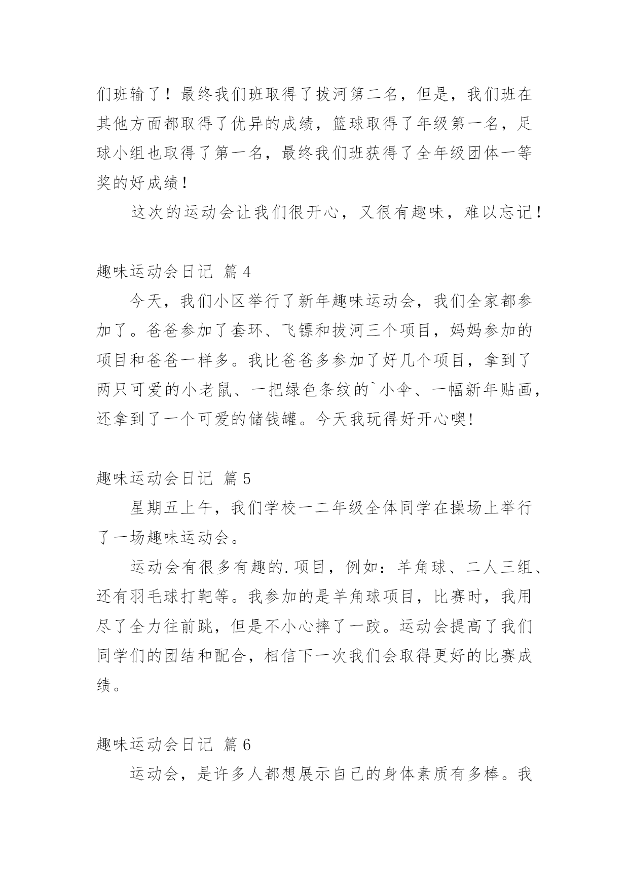 趣味运动会日记【推荐】趣味运动会日记集合九篇转眼一天又过去了,相信大家一定感触颇深吧,想必是时候写一篇日记了。你所见过的日记应该是什么样的?以下是小编为大家收集的趣味运动会日记9篇,希望对大家有所帮助。趣味运动会日记篇1今天下午阳光灿烂,阳光中含着丝丝微风。我们学校举行春季趣味运动会。我参加的项目是绑腿跑,轮到我们班参加比赛了。我和王之燕一组。比赛前我告诉王之燕先迈绑腿的那只脚。枪声打响了,只见四年级一班的同学象发了疯的野狗似的向终点奔去。可是王之燕一下子走了神,迈出了没绑腿的那只脚。我们晃晃乱乱地跑了两三米就摔倒在地。王之燕立刻回过神来,立刻爬了起来,我们有规矩的跑了起来。这时只见那两只“疯狗”早就到了终点。我们还是坚持跑到了终点。一班的'人得意洋洋地说:“你们不如我们吧!怎么样,你们还是数量吧。每次都让你们出风头。现在,也有我们一班的出头之日了。”我们班没有跑出个好成绩。没想到平时周传宇和周冬梅这两只“兔子”也没有为我们班跑出个好成绩,真丢人。运动会结束了,我们有气无力地回到了教室。我们真想找个出气筒发泄一下。虽然我们班没有取得好成绩,但是我们重在参与。因为我们是以友谊第一,比赛第二的心理参加比赛的。我们下一次一定努力,为班级争光。趣味运动会日记篇2天学校的运动会。早上一起床,我就觉得好兴奋。到了学校,我看到校门口立了一座城堡,好漂亮!我慢慢的走向教室的方向,看到到处都张贴的运动会的海报,好热闹喔!八点左右,我听到广播要全校班级到走廊排升旗队伍,准备运动员进场,我看见好多跟小朋友一样兴奋的家长,一大早就跟着小朋友来参加学校的运动会,他们有的拿着相机,有的拿着摄影机,猛对着自己孩子的班级拍摄,我觉得爸爸妈妈们为了记录自己孩子的成长,真是辛苦啊!运动员绕场时,各班使出浑身解数,表现自己班级的`特色,我们班的小朋友都装扮成乌龟的样子,而老师则是兔子,我们要表现的就是龟兔赛跑,乌龟努力的精神哦!我觉得运动员进场的场面很壮观,很好看。另外值得一提的是四年级的趣味竞赛,我们玩投纸球游戏,因为风很大,纸球很不容易投入,大家还是很努力的丢,大家玩的很开心,很有趣!中午休息到下午一点,大家听了广播后陆续又回到操场,参加最精彩的团体接力。我们班上穿黄色的背心,可是黄色的背心似乎被下了魔咒,我们很努力的跑,可是只有第四名,也因此我们班上没有得到精神总锦标,虽然如此,我还是觉得这次运动会很好玩,因为除了运动,还有好多爸爸妈妈请我们喝饮料,总之,我度过了一个难忘又有趣的周末!趣味运动会日记篇3在明媚的春日里,第二届趣味运动会正在校园里如火如荼的进行中,同学们盼望已久,个个都兴奋不已,心情十分激动。同学们穿着校服,在班主任的带领下排着整齐的队伍集合在操场上。我们在国歌中迎来了运动会开幕式,简短又不失隆重开幕式很快就结束了。下面就是激动人心的时候了,比赛正式开始。跑道上,操场上,到处都是活力四射的运动员们。看!跳绳的参赛选手们努力的比赛,努力的跳,我们跳出了开心,跳出了喜悦,我们班谢子涵跳了176下取得年级第一名。可是我只跳了136下,不过我依然很开心,因为我已经拼尽全力,不后悔,享受这个过程比结果更重要。最激动人心的'拔河比赛开始啦!只见我们的班长举起班牌,让大家为班级加油,我们多方拼搏,晋级之后,我们拼进了决赛。最后的冠军争夺战开始了。两边就位,同学们都卯足劲儿,只见绳子上的红线忽左忽右,双方僵持不下,突然,绳子向三二班拉去,我们又咬牙蹬腿拼尽全力往回拉,可绳子还是一点点的向他们班拉去,最后裁判一声哨响,我们班输了!最终我们班取得了拔河第二名,但是,我们班在其他方面都取得了优异的成绩,篮球取得了年级第一名,足球小组也取得了第一名,最终我们班获得了全年级团体一等奖的好成绩!这次的运动会让我们很开心,又很有趣味,难以忘记!趣味运动会日记篇4今天,我们小区举行了新年趣味运动会,我们全家都参加了。爸爸参加了套环、飞镖和拔河三个项目,妈妈参加的项目和爸爸一样多。我比爸爸多参加了好几个项目,拿到了两只可爱的小老鼠、一把绿色条纹的`小伞、一幅新年贴画,还拿到了一个可爱的储钱罐。今天我玩得好开心噢!趣味运动会日记篇5星期五上午,我们学校一二年级全体同学在操场上举行了一场趣味运动会。运动会有很多有趣的.项目,例如:羊角球、二人三组、还有羽毛球打靶等。我参加的是羊角球项目,比赛时,我用尽了全力往前跳,但是不小心摔了一跤。运动会提高了我们同学们的团结和配合,相信下一次我们会取得更好的比赛成绩。趣味运动会日记篇6运动会,是许多人都想展示自己的身体素质有多棒。我比较喜欢跑步,因为我的速度可不慢哦!这次运动会我参加了两项。五年级女生队里有一个人是我的`克星,跑得很快,她就是周梦姚,四年级时,每一次他都会赶上我,甚至与我拉开了四五米的距离,但是经过这几个月,我参加了田径队里