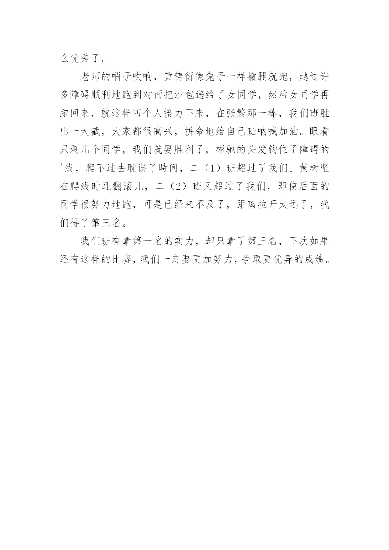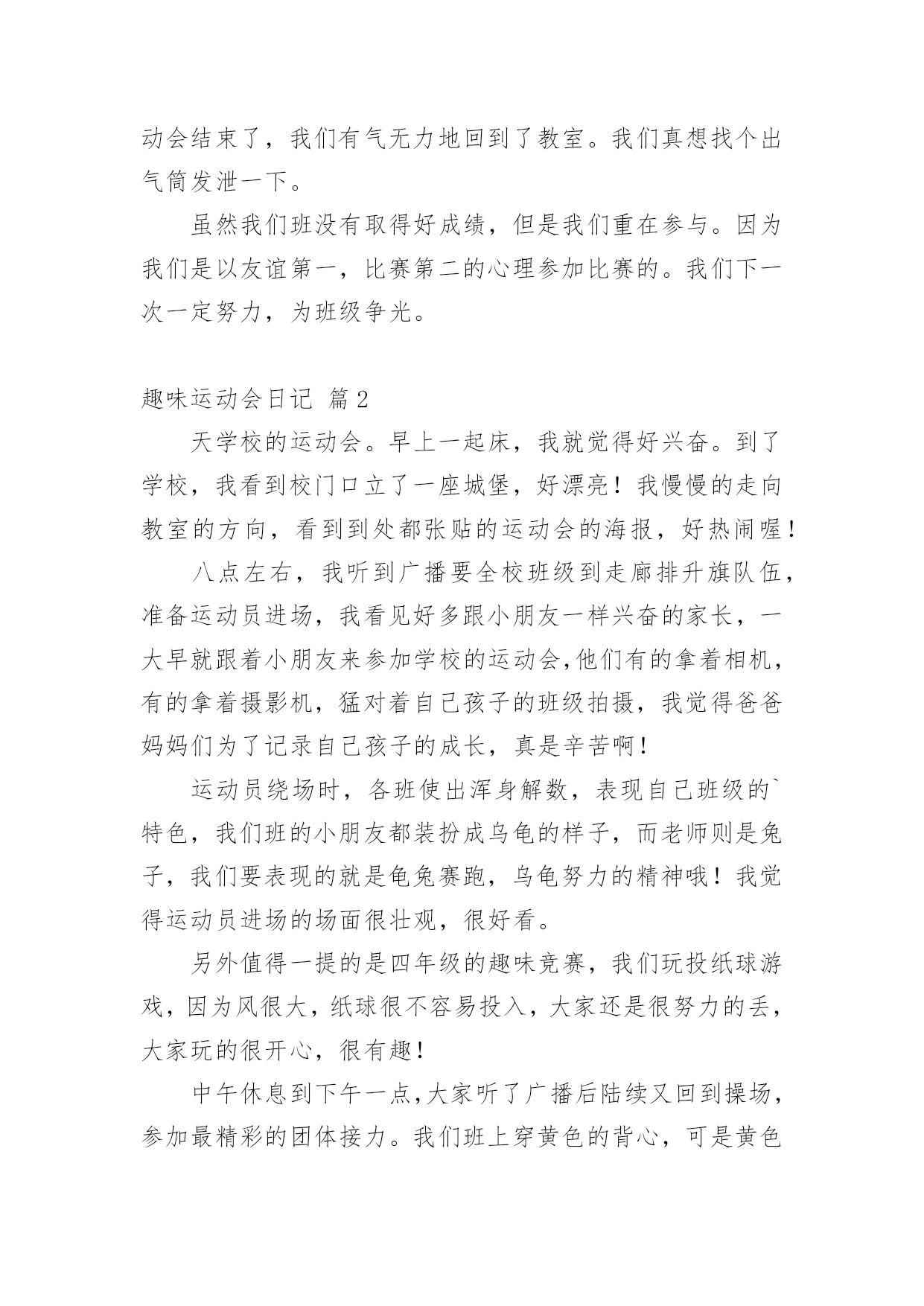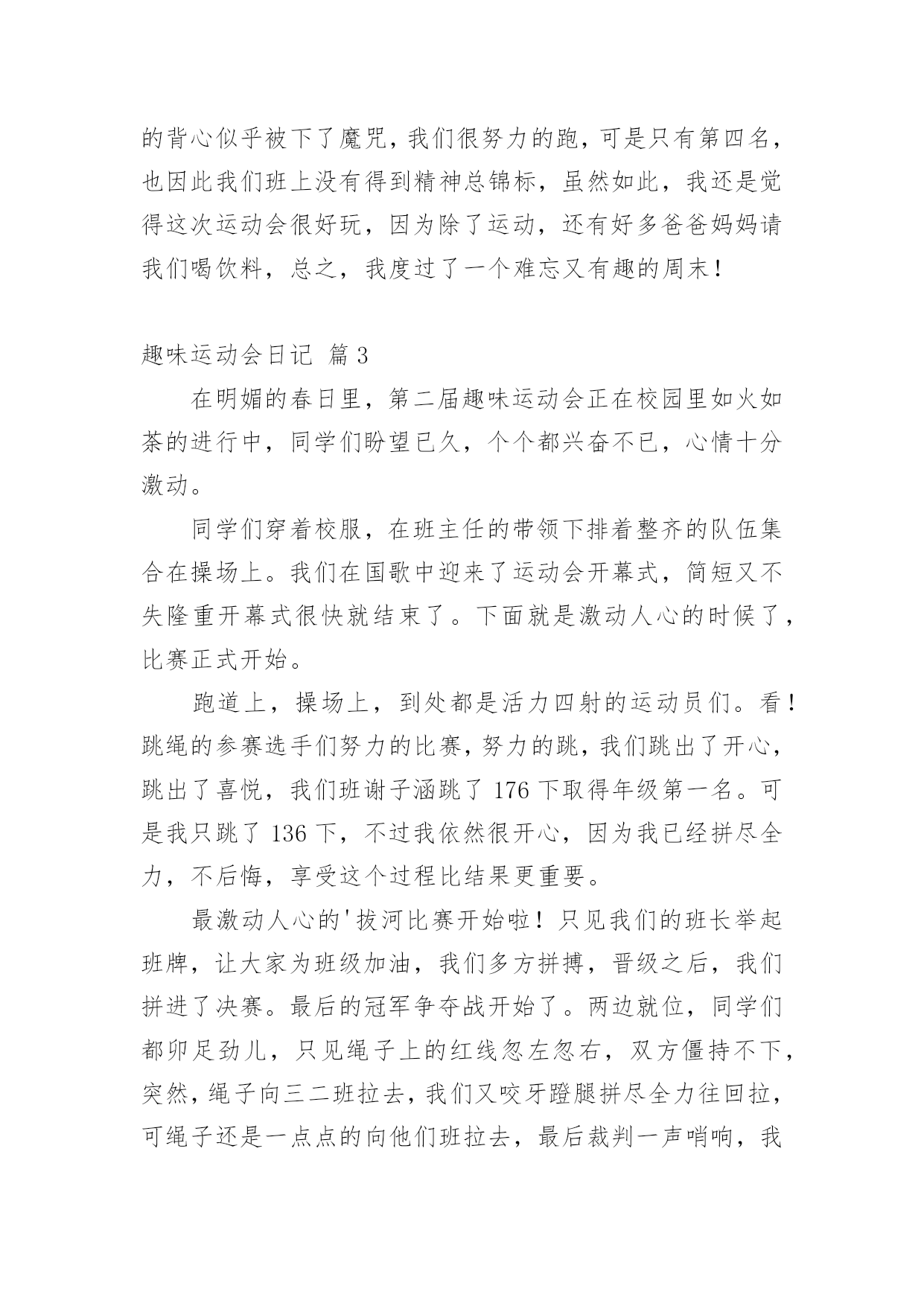趣味运动会日记【推荐】趣味运动会日记集合九篇转眼一天又过去了,相信大家一定感触颇深吧,想必是时候写一篇日记了。你所见过的日记应该是什么样的?以下是小编为大家收集的趣味运动会日记9篇,希望对大家有所帮助。趣味运动会日记篇1今天下午阳光灿烂,阳光中含着丝丝微风。我们学校举行春季趣味运动会。我参加的项目是绑腿跑,轮到我们班参加比赛了。我和王之燕一组。比赛前我告诉王之燕先迈绑腿的那只脚。枪声打响了,只见四年级一班的同学象发了疯的野狗似的向终点奔去。可是王之燕一下子走了神,迈出了没绑腿的那只脚。我们晃晃乱乱地跑了两三米就摔倒在地。王之燕立刻回过神来,立刻爬了起来,我们有规矩的跑了起来。这时只见那两只“疯狗”早就到了终点。我们还是坚持跑到了终点。一班的'人得意洋洋地说:“你们不如我们吧!怎么样,你们还是数量吧。每次都让你们出风头。现在,也有我们一班的出头之日了。”我们班没有跑出个好成绩。没想到平时周传宇和周冬梅这两只“兔子”也没有为我们班跑出个好成绩,真丢人。运动会结束了,我们有气无力地回到了教室。我们真想找个出气筒发泄一下。虽然我们班没有取得好成绩,但是我们重在参与。因为我们是以友谊第一,比赛第二的心理参加比赛的。我们下一次一定努力,为班级争光。趣味运动会日记篇2天学校的运动会。早上一起床,我就觉得好兴奋。到了学校,我看到校门口立了一座城堡,好漂亮!我慢慢的走向教室的方向,看到到处都张贴的运动会的海报,好热闹喔!八点左右,我听到广播要全校班级到走廊排升旗队伍,准备运动员进场,我看见好多跟小朋友一样兴奋的家长,一大早就跟着小朋友来参加学校的运动会,他们有的拿着相机,有的拿着摄影机,猛对着自己孩子的班级拍摄,我觉得爸爸妈妈们为了记录自己孩子的成长,真是辛苦啊!运动员绕场时,各班使出浑身解数,表现自己班级的`特色,我们班的小朋友都装扮成乌龟的样子,而老师则是兔子,我们要表现的就是龟兔赛跑,乌龟努力的精神哦!我觉得运动员进场的场面很壮观,很好看。另外值得一提的是四年级的趣味竞赛,我们玩投纸球游戏,因为风很大,纸球很不容易投入,大家还是很努力的丢,大家玩的很开心,很有趣!中午休息到下午一点,大家听了广播后陆续又回到操场,参加最精彩的团体接力。我们班上穿黄色的背心,可是黄色的背心似乎被下了魔咒,我们很努力的跑,可是只有第四名,也因此我们班上没有得到精神总锦标,虽然如此,我还是觉得这次运动会很好玩,因为除了运动,还有好多爸爸妈妈请我们喝饮料,总之,我度过了一个难忘又有趣的周末!趣味运动会日记篇3在明媚的春日里,第二届趣味运动会正在校园里如火如荼的进行中,同学们盼望已久,个个都兴奋不已,心情十分激动。同学们穿着校服,在班主任的带领下排着整齐的队伍集合在操场上。我们在国歌中迎来了运动会开幕式,简短又不失隆重开幕式很快就结束了。下面就是激动人心的时候了,比赛正式开始。跑道上,操场上,到处都是活力四射的运动员们。看!跳绳的参赛选手们努力的比赛,努力的跳,我们跳出了开心,跳出了喜悦,我们班谢子涵跳了176下取得年级第一名。可是我只跳了136下,不过我依然很开心,因为我已经拼尽全力,不后悔,享受这个过程比结果更重要。最激动人心的'拔河比赛开始啦!只见我们的班长举起班牌,让大家为班级加油,我们多方拼搏,晋级之后,我们拼进了决赛。最后的冠军争夺战开始了。两边就位,同学们都卯足劲儿,只见绳子上的红线忽左忽右,双方僵持不下,突然,绳子向三二班拉去,我们又咬牙蹬腿拼尽全力往回拉,可绳子还是一点点的向他们班拉去,最后裁判一声哨响,我们班输了!最终我们班取得了拔河第二名,但是,我们班在其他方面都取得了优异的成绩,篮球取得了年级第一名,足球小组也取得了第一名,最终我们班获得了全年级团体一等奖的好成绩!这次的运动会让我们很开心,又很有趣味,难以忘记!趣味运动会日记篇4今天,我们小区举行了新年趣味运动会,我们全家都参加了。爸爸参加了套环、飞镖和拔河三个项目,妈妈参加的项目和爸爸一样多。我比爸爸多参加了好几个项目,拿到了两只可爱的小老鼠、一把绿色条纹的`小伞、一幅新年贴画,还拿到了一个可爱的储钱罐。今天我玩得好开心噢!趣味运动会日记篇5星期五上午,我们学校一二年级全体同学在操场上举行了一场趣味运动会。运动会有很多有趣的.项目,例如:羊角球、二人三组、还有羽毛球打靶等。我参加的是羊角球项目,比赛时,我用尽了全力往前跳,但是不小心摔了一跤。运动会提高了我们同学们的团结和配合,相信下一次我们会取得更好的比赛成绩。趣味运动会日记篇6运动会,是许多人都想展示自己的身体素质有多棒。我比较喜欢跑步,因为我的速度可不慢哦!这次运动会我参加了两项。五年级女生队里有一个人是我的`克星,跑得很快,她就是周梦姚,四年级时,每一次他都会赶上我,甚至与我拉开了四五米的距离,但是经过这几个月,我参加了田径队里