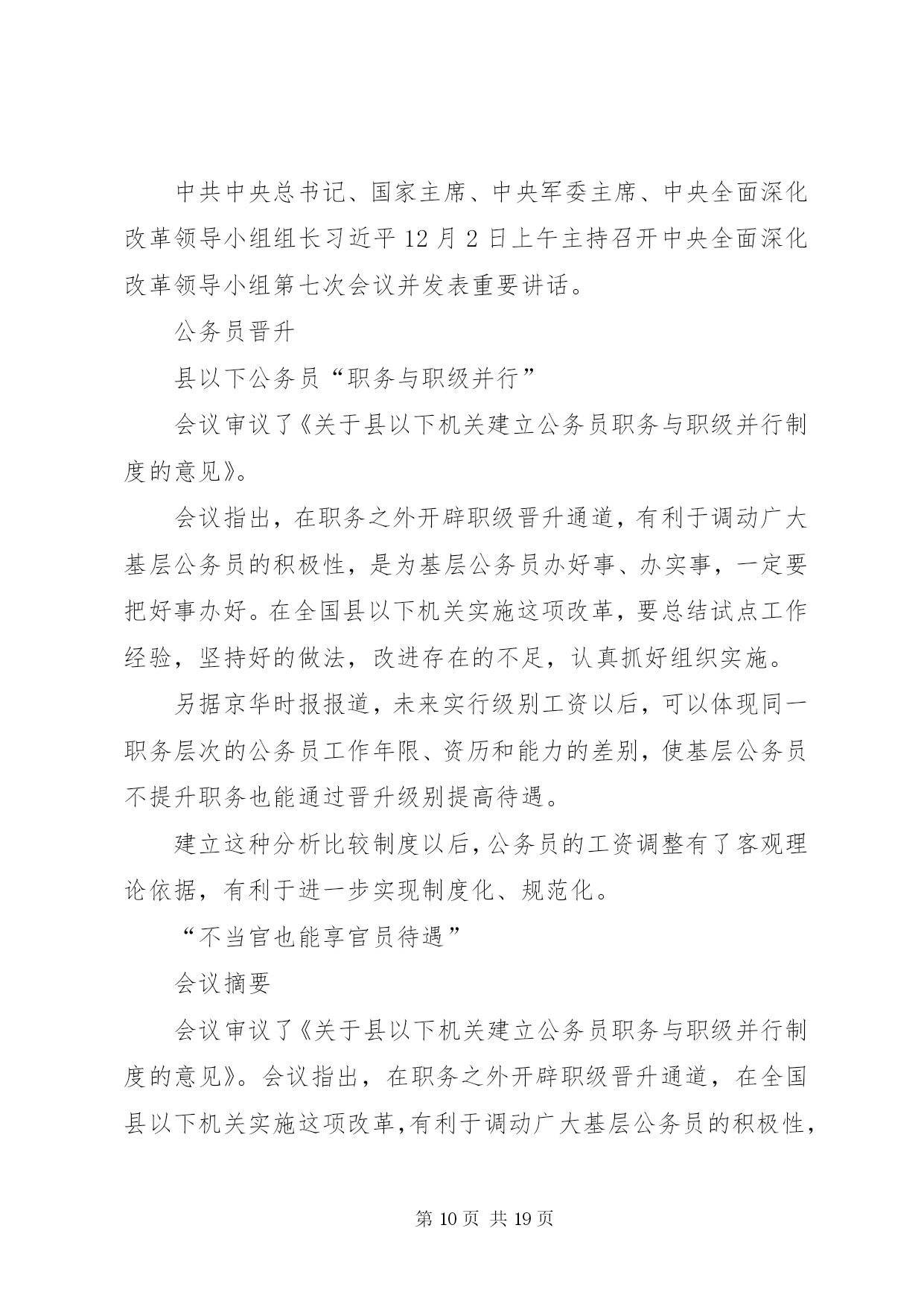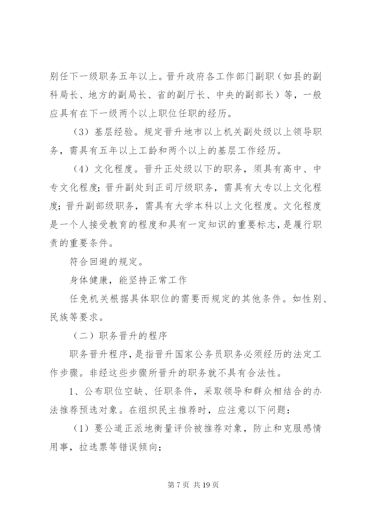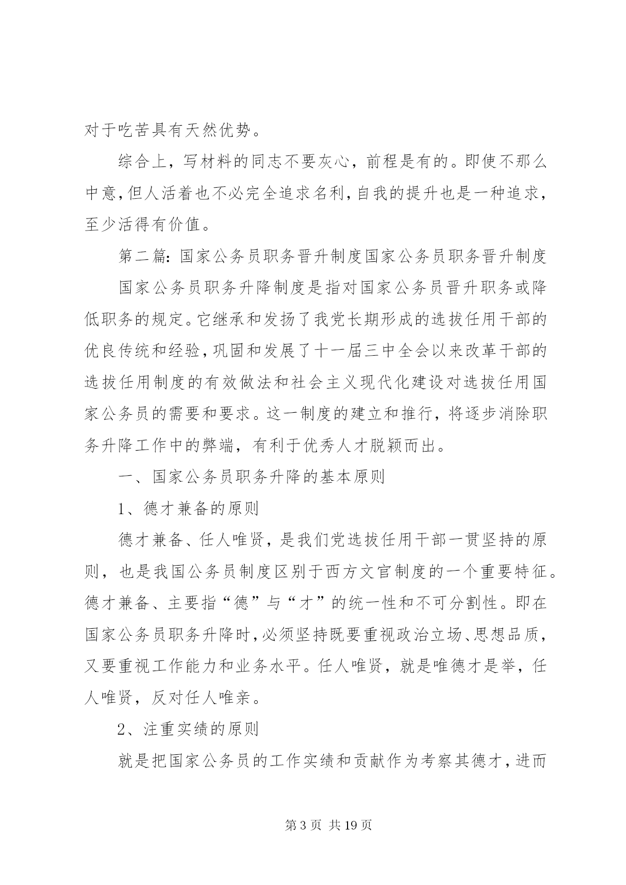 第PAGE\*Arabic\*MERGEFORMAT19页共NUMPAGES\*MERGEFORMAT19页写材料是公务员职务晋升的捷径吗?第一篇。写材料是公务员职务晋升的捷径吗。写材料是职务晋升的捷径吗。写材料的提拔快是党政机关、国企老同志的普遍看法。尽管实际上未必如此,但从面上看也有一定道理。职务晋升有多种因素,领导对你熟悉、有情分,领导对你工作勤奋表示认可,或是对你的能力表示认可,等等。写材料,主要是服务于领导,多少会沾点人情分。但切勿认为领导喜欢你,就能在事业上取得快速进步。我觉得,写材料的同志在工作中得到的锻炼更多。首先,了解领导艺术。一个单位,少则几十余人,多则几百人。当这个家,没有高超的领导方法,往往工作就推不动、内部就不合谐。写材料的同志,每一份材料,实际上都是一项具体的工作,都涉及到方方面面的人,也会涉及到各部门、各人的利益。在沟通、汇报中,写材料的同志学习领导的处事方法的机会更多。日长月久,也会了解领导的工作方法,这对于以后走上领导岗位是非常重要的。这也是许多事务秘书能胜任各种领导岗位的原因。其次,了解全局工作。在一个单位,要想立住足、受人尊重,首先得有“文化”。这个“文化”就是对业务的掌握。很多老同志工作几十年,对办文程序、拟文要求都不甚了解。写材料的同志,每年会接触到各类材料,有面上的、有党务的、有业务的,甚至有诸如看望慰问、晚宴致辞等偏冷门的材料。写过千千万万,让你在无形中掌握了工作要求、了解了工作脉络,收获了丰富的业务知识。第三,提升逻辑思维能力。逻辑思维是非常重要的。我们可以看看习大大在之江新语中的短评。简短的三百字的小文,围绕一个主题,有意义、有问题、有后果、有分析、有要求,这就是以逻辑这条线串起来的。讲话做事都要讲逻辑。写材料,更需要严谨缜密的逻辑思维,不然就是一地芝麻,看也看不明白,抓也抓不起来。通过多材料的写作,能够锤炼出严谨的思维能力。这样,即使以后放你到领导岗位,自然能出口成章、下笔有神。第四,练就了吃苦的品质。很多人认为领导很舒服,领导很自由,实则不然。大家看到的只是表面。很多领导干部,尤其是位高的实权派领导,其工作的繁忙度不是一般人能吃得消的。每天既要处理大量的文件,还要接待各类客人、群众、甚至*访人员,可谓马不停蹄。对于一些重要的材料,领导一般都是先看过的。领导水平高,很多情况也是逼迫出来的。他每天看的文件、讲话稿、书面材料,比很多下属都要多。有些材料,还要大篇幅的改。那种认为领导只是划几个错别字的看法是不全面的,像“三严*实”党课讲话、像政府工作报告,领导都要认真细研,字字看过的。有些稿子在写作班子起草的基础上,领导还要亲自反复修改。所以说,做领导要吃得了品。写材料的同志,点灯熬蜡,对于吃苦具有天然优势。综合上,写材料的同志不要灰心,前程是有的。即使不那么中意,但人活着也不必完全追求名利,自我的提升也是一种追求,至少活得有价值。第二篇:国家公务员职务晋升制度国家公务员职务晋升制度国家公务员职务升降制度是指对国家公务员晋升职务或降低职务的规定。它继承和发扬了我党长期形成的选拔任用干部的优良传统和经验,巩固和发展了十一届三中全会以来改革干部的选拔任用制度的有效做法和社会主义现代化建设对选拔任用国家公务员的需要和要求。这一制度的建立和推行,将逐步消除职务升降工作中的弊端,有利于优秀人才脱颖而出。一、国家公务员职务升降的基本原则1、德才兼备的原则德才兼备、任人唯贤,是我们党选拔任用干部一贯坚持的原则,也是我国公务员制度区别于西方文官制度的一个重要特征。德才兼备、主要指“德”与“才”的统一性和不可分割性。即在国家公务员职务升降时,必须坚持既要重视政治立场、思想品质,又要重视工作能力和业务水平。任人唯贤,就是唯德才是举,任人唯贤,反对任人唯亲。2、注重实绩的原则就是把国家公务员的工作实绩和贡献作为考察其德才,进而决定其升降的重要依据。邓小平同志早在1978年中央工作会议上就指出:“要根据工作成绩大小好坏、有赏有罚,有升有降”。贯彻这一原则,首先要正确理解新的历史时期实绩的含义。在新的历史时期,工作实绩必须是在贯彻执行党的基本路线中的实绩,必须是在经济建设和改革开放中所做出的贡献和所取得的成果。其次是客观公正地考核1评价国家公务员的实绩,处理好实绩的各种关系。如主观努力与外部环境的关系;个人成绩与集体贡献的关系;物质成果与精神成果的关系;眼前效果与长远效果的关系;局部效益与全局效益的关系;数量与质量的关系等。三是正确对待实绩与德才及升降的关系。既要以实绩作为考察其德才的重要依据,又要防止把二者简单划等号,更要避免简单地把晋升当成论功行赏,把实绩作为升降的唯一标准。3、公平、平等、竞争、择优的原则所谓公开,主要指职务升降的标准条件和过程等要公开,增加透明度,让群众知晓