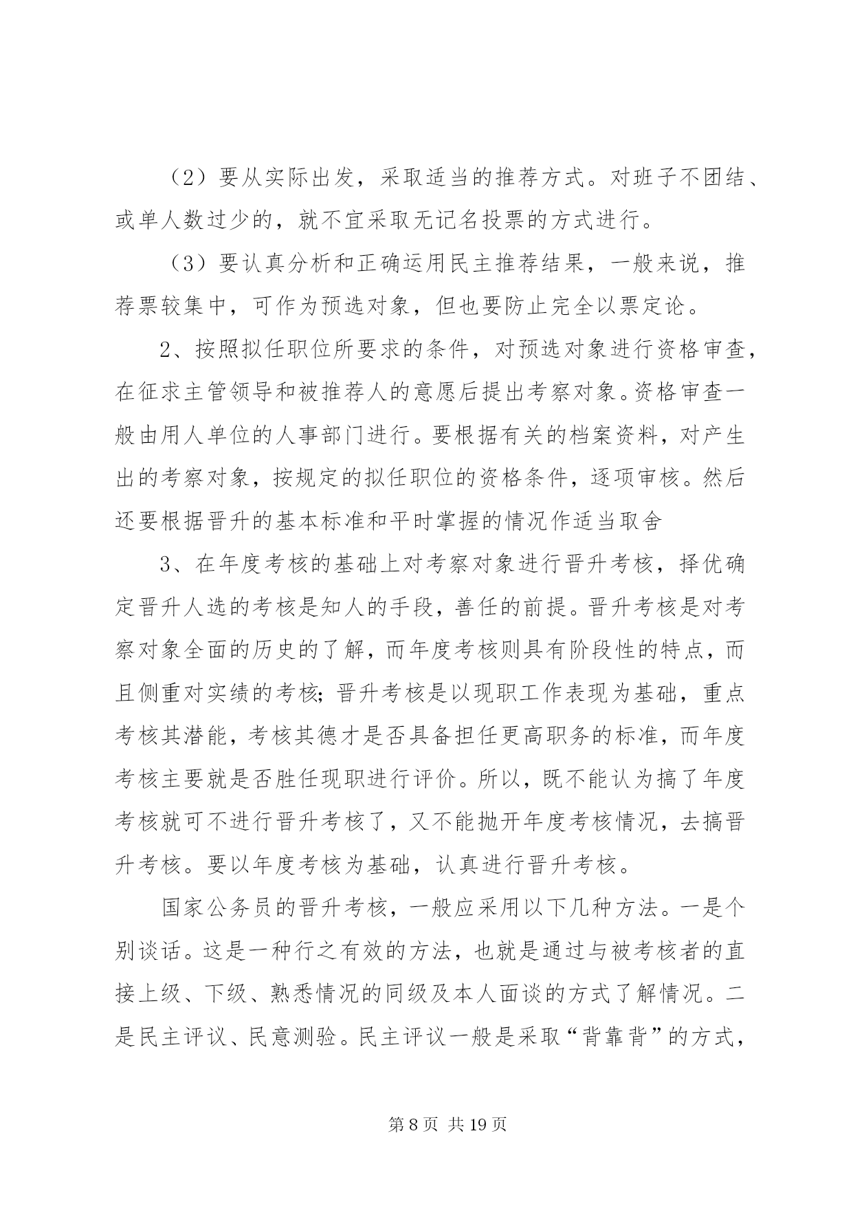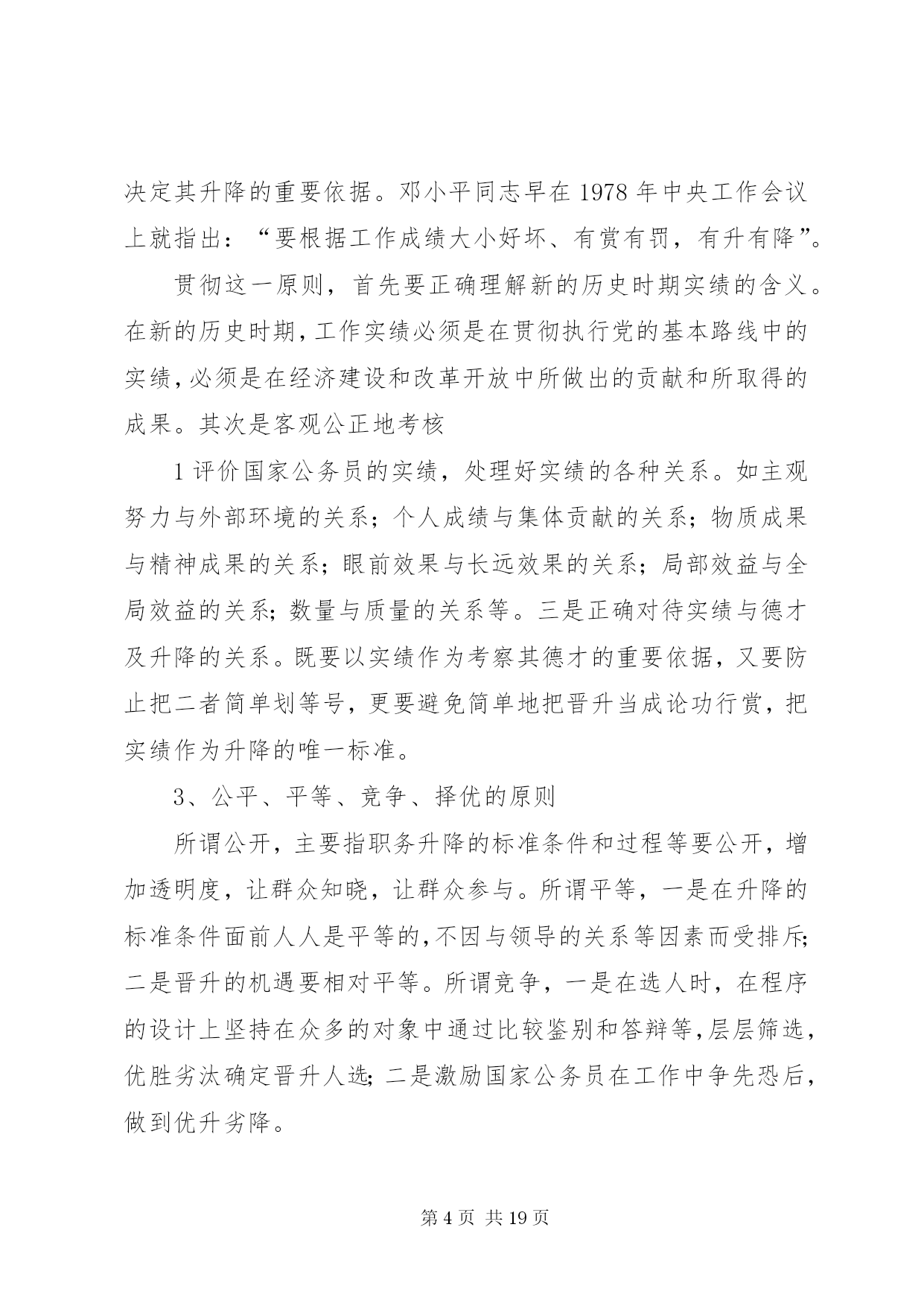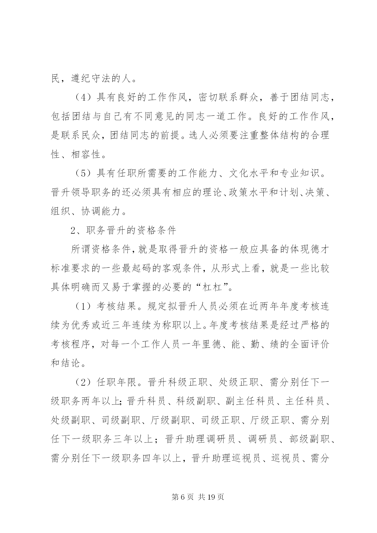 第PAGE\*Arabic\*MERGEFORMAT19页共NUMPAGES\*MERGEFORMAT19页写材料是公务员职务晋升的捷径吗?第一篇。写材料是公务员职务晋升的捷径吗。写材料是职务晋升的捷径吗。写材料的提拔快是党政机关、国企老同志的普遍看法。尽管实际上未必如此,但从面上看也有一定道理。职务晋升有多种因素,领导对你熟悉、有情分,领导对你工作勤奋表示认可,或是对你的能力表示认可,等等。写材料,主要是服务于领导,多少会沾点人情分。但切勿认为领导喜欢你,就能在事业上取得快速进步。我觉得,写材料的同志在工作中得到的锻炼更多。首先,了解领导艺术。一个单位,少则几十余人,多则几百人。当这个家,没有高超的领导方法,往往工作就推不动、内部就不合谐。写材料的同志,每一份材料,实际上都是一项具体的工作,都涉及到方方面面的人,也会涉及到各部门、各人的利益。在沟通、汇报中,写材料的同志学习领导的处事方法的机会更多。日长月久,也会了解领导的工作方法,这对于以后走上领导岗位是非常重要的。这也是许多事务秘书能胜任各种领导岗位的原因。其次,了解全局工作。在一个单位,要想立住足、受人尊重,首先得有“文化”。这个“文化”就是对业务的掌握。很多老同志工作几十年,对办文程序、拟文要求都不甚了解。写材料的同志,每年会接触到各类材料,有面上的、有党务的、有业务的,甚至有诸如看望慰问、晚宴致辞等偏冷门的材料。写过千千万万,让你在无形中掌握了工作要求、了解了工作脉络,收获了丰富的业务知识。第三,提升逻辑思维能力。逻辑思维是非常重要的。我们可以看看习大大在之江新语中的短评。简短的三百字的小文,围绕一个主题,有意义、有问题、有后果、有分析、有要求,这就是以逻辑这条线串起来的。讲话做事都要讲逻辑。写材料,更需要严谨缜密的逻辑思维,不然就是一地芝麻,看也看不明白,抓也抓不起来。通过多材料的写作,能够锤炼出严谨的思维能力。这样,即使以后放你到领导岗位,自然能出口成章、下笔有神。第四,练就了吃苦的品质。很多人认为领导很舒服,领导很自由,实则不然。大家看到的只是表面。很多领导干部,尤其是位高的实权派领导,其工作的繁忙度不是一般人能吃得消的。每天既要处理大量的文件,还要接待各类客人、群众、甚至*访人员,可谓马不停蹄。对于一些重要的材料,领导一般都是先看过的。领导水平高,很多情况也是逼迫出来的。他每天看的文件、讲话稿、书面材料,比很多下属都要多。有些材料,还要大篇幅的改。那种认为领导只是划几个错别字的看法是不全面的,像“三严*实”党课讲话、像政府工作报告,领导都要认真细研,字字看过的。有些稿子在写作班子起草的基础上,领导还要亲自反复修改。所以说,做领导要吃得了品。写材料的同志,点灯熬蜡,对于吃苦具有天然优势。综合上,写材料的同志不要灰心,前程是有的。即使不那么中意,但人活着也不必完全追求名利,自我的提升也是一种追求,至少活得有价值。第二篇:国家公务员职务晋升制度国家公务员职务晋升制度国家公务员职务升降制度是指对国家公务员晋升职务或降低职务的规定。它继承和发扬了我党长期形成的选拔任用干部的优良传统和经验,巩固和发展了十一届三中全会以来改革干部的选拔任用制度的有效做法和社会主义现代化建设对选拔任用国家公务员的需要和要求。这一制度的建立和推行,将逐步消除职务升降工作中的弊端,有利于优秀人才脱颖而出。一、国家公务员职务升降的基本原则1、德才兼备的原则德才兼备、任人唯贤,是我们党选拔任用干部一贯坚持的原则,也是我国公务员制度区别于西方文官制度的一个重要特征。德才兼备、主要指“德”与“才”的统一性和不可分割性。即在国家公务员职务升降时,必须坚持既要重视政治立场、思想品质,又要重视工作能力和业务水平。任人唯贤,就是唯德才是举,任人唯贤,反对任人唯亲。2、注重实绩的原则就是把国家公务员的工作实绩和贡献作为考察其德才,进而决定其升降的重要依据。邓小平同志早在1978年中央工作会议上就指出:“要根据工作成绩大小好坏、有赏有罚,有升有降”。贯彻这一原则,首先要正确理解新的历史时期实绩的含义。在新的历史时期,工作实绩必须是在贯彻执行党的基本路线中的实绩,必须是在经济建设和改革开放中所做出的贡献和所取得的成果。其次是客观公正地考核1评价国家公务员的实绩,处理好实绩的各种关系。如主观努力与外部环境的关系;个人成绩与集体贡献的关系;物质成果与精神成果的关系;眼前效果与长远效果的关系;局部效益与全局效益的关系;数量与质量的关系等。三是正确对待实绩与德才及升降的关系。既要以实绩作为考察其德才的重要依据,又要防止把二者简单划等号,更要避免简单地把晋升当成论功行赏,把实绩作为升降的唯一标准。3、公平、平等、竞争、择优的原则所谓公开,主要指职务升降的标准条件和过程等要公开,增加透明度,让群众知晓