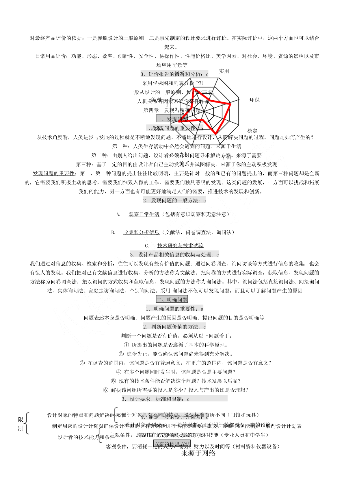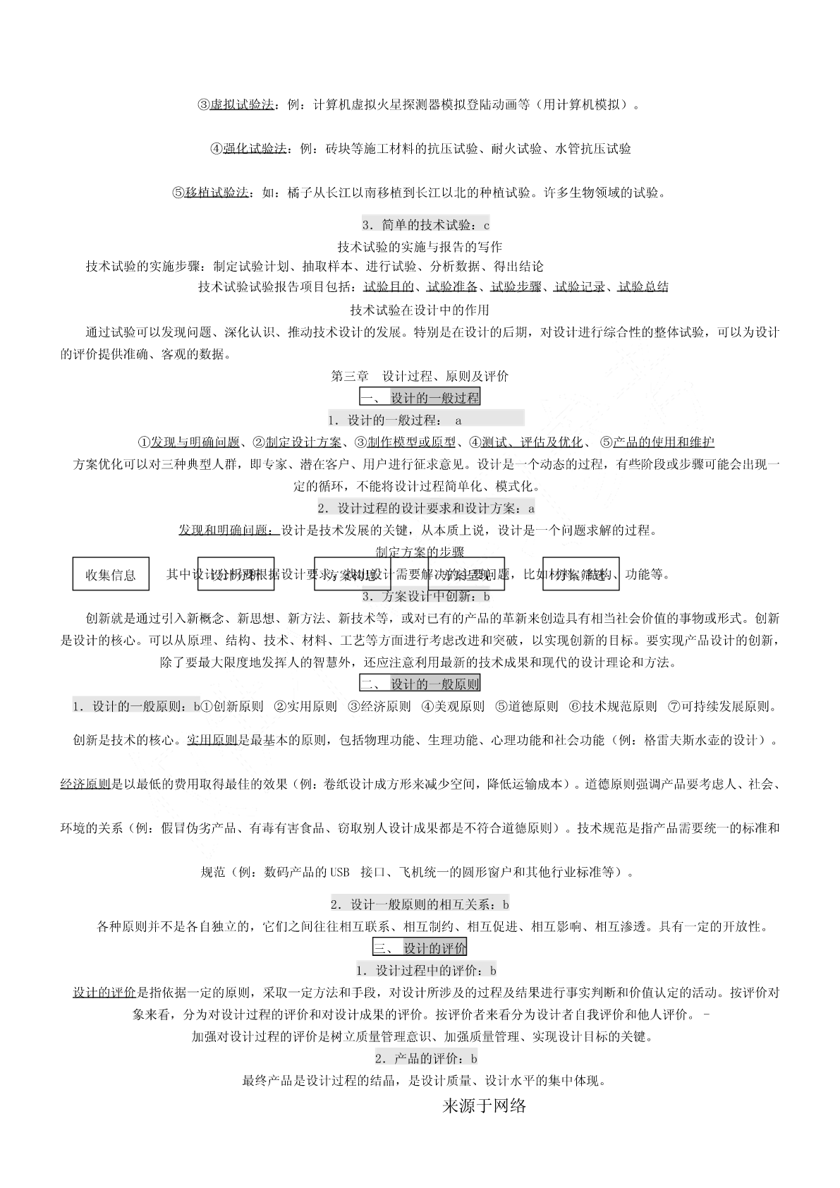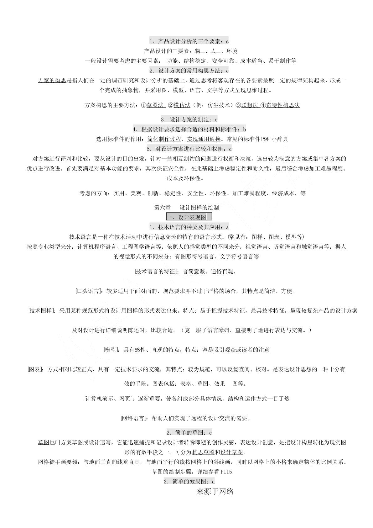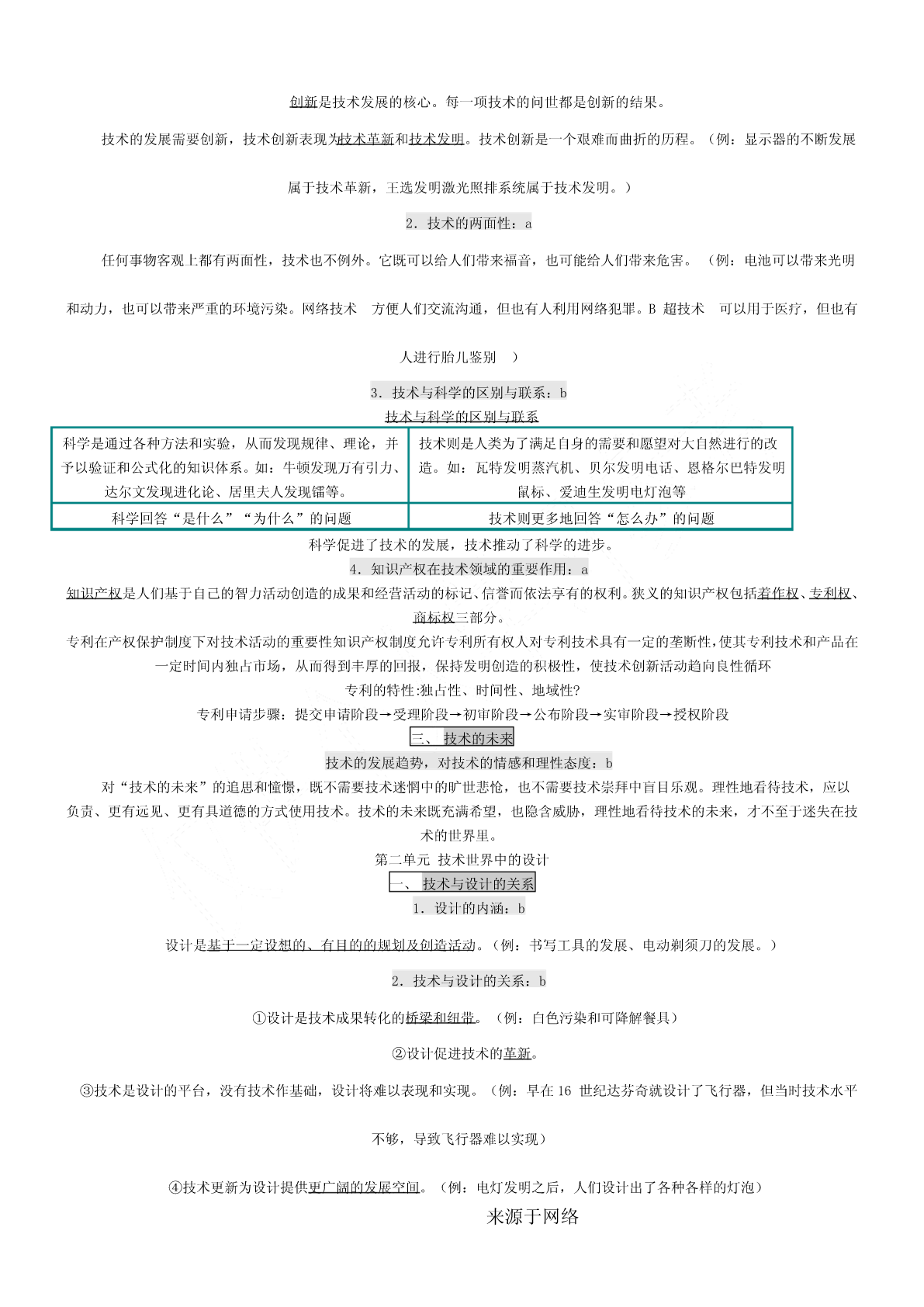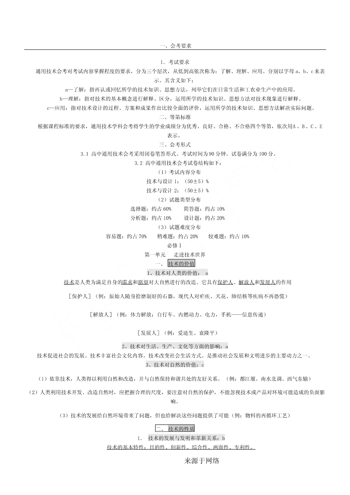 一、会考要求1.考试要求通用技术会考对考试内容掌握程度的要求,分为三个层次,从低到高依次称为:了解、理解、应用。分别以字母a、b、c来表示。其含义如下:a—了解:指再认或回忆所学的技术知识、思想方法,列举它们在日常生活和工农业生产中的应用。b—理解:指对技术的基本概念进行解释、区分,运用所学的技术知识、思想方法对技术现象进行解释。c—应用:指对技术设计的过程、方案和成果作出比较全面的评价,运用所学的技术知识、思想方法解决实际问题。二、等第标准根据课程标准的要求,通用技术学科会考将学生的学业成绩分为优秀、良好、合格、不合格四个等第,依次用A、B、C、E表示。三、会考形式3.1高中通用技术会考采用闭卷笔答形式。考试时间为90分钟。试卷满分为100分。3.2高中通用技术会考试卷结构如下:(1)考试内容分布技术与设计1:(50±5)%技术与设计2:(50±5)%(2)试题类型分布选择题:约占60%简答题:约占10%分析题:约占10%设计题:约占20%(3)试题难度分布容易题:约占70%稍难题:约占20%较难题:约占10%必修Ⅰ第一单元走进技术世界一、技术的价值1、技术对人类的价值:a技术是人类为满足自身的需求和愿望对大自然进行的改造。它具有保护人、解放人和发展人的作用[保护人](例:原始人随身拾磨制好的石器,现代人对疟疾、天花、肺结核等疾病不再恐慌)[解放人](例:体力解放:自行车、内燃动力、电力,手机——信息传递)[发展人](例:爱迪生、袁隆平)2、技术对生活、生产、文化等方面的影响:a技术促进社会的发展。技术丰富社会文化内容。技术改变社会生活方式。是推动社会发展和文明进步的主要动力之一。3、技术对自然的价值:c(1)依靠技术,人类得以利用自然和改造,并与自然保持和谐共处的友好关系。(例:都江堰、南水北调、西气东输)(2)人类利用技术开发、改造自然时,应把握合理的尺度,要注意对自然的保护,不能忽视技术或产品对环境可能造成的负面影响。(3)技术的发展给自然环境带来了问题,但也给解决这些问题提供了可能(例:物料的再循环工艺)二、技术的性质1.技术的发展与发明和革新关系:b技术的基本特性:目的性、创新性、综合性、两面性、专利性。来源于网络创新是技术发展的核心。每一项技术的问世都是创新的结果。技术的发展需要创新,技术创新表现为技术革新和技术发明。技术创新是一个艰难而曲折的历程。(例:显示器的不断发展属于技术革新,王选发明激光照排系统属于技术发明。)2.技术的两面性:a任何事物客观上都有两面性,技术也不例外。它既可以给人们带来福音,也可能给人们带来危害。(例:电池可以带来光明和动力,也可以带来严重的环境污染。网络技术方便人们交流沟通,但也有人利用网络犯罪。B超技术可以用于医疗,但也有人进行胎儿鉴别)3.技术与科学的区别与联系:b技术与科学的区别与联系科学是通过各种方法和实验,从而发现规律、理论,并技术则是人类为了满足自身的需要和愿望对大自然进行的改予以验证和公式化的知识体系。如:牛顿发现万有引力、造。如:瓦特发明蒸汽机、贝尔发明电话、恩格尔巴特发明达尔文发现进化论、居里夫人发现镭等。鼠标、爱迪生发明电灯泡等科学回答“是什么”“为什么”的问题技术则更多地回答“怎么办”的问题科学促进了技术的发展,技术推动了科学的进步。4.知识产权在技术领域的重要作用:a知识产权是人们基于自己的智力活动创造的成果和经营活动的标记、信誉而依法享有的权利。狭义的知识产权包括着作权、专利权、商标权三部分。专利在产权保护制度下对技术活动的重要性知识产权制度允许专利所有权人对专利技术具有一定的垄断性,使其专利技术和产品在一定时间内独占市场,从而得到丰厚的回报,保持发明创造的积极性,使技术创新活动趋向良性循环专利的特性:独占性、时间性、地域性?专利申请步骤:提交申请阶段→受理阶段→初审阶段→公布阶段→实审阶段→授权阶段三、技术的未来技术的发展趋势,对技术的情感和理性态度:b对“技术的未来”的追思和憧憬,既不需要技术迷惘中的旷世悲怆,也不需要技术崇拜中盲目乐观。理性地看待技术,应以负责、更有远见、更有具道德的方式使用技术。技术的未来既充满希望,也隐含威胁,理性地看待技术的未来,才不至于迷失在技术的世界里。第二单元技术世界中的设计一、技术与设计的关系1.设计的内涵:b设计是基于一定设想的、有目的的规划及创造活动。(例:书写工具的发展、电动剃须刀的发展。)2.技术与设计的关系:b①设计是技术成果转化的桥梁和纽带。(例:白色污染和可降解餐具)②设计促进技术的革新。③技术是设计的平台,没有技
