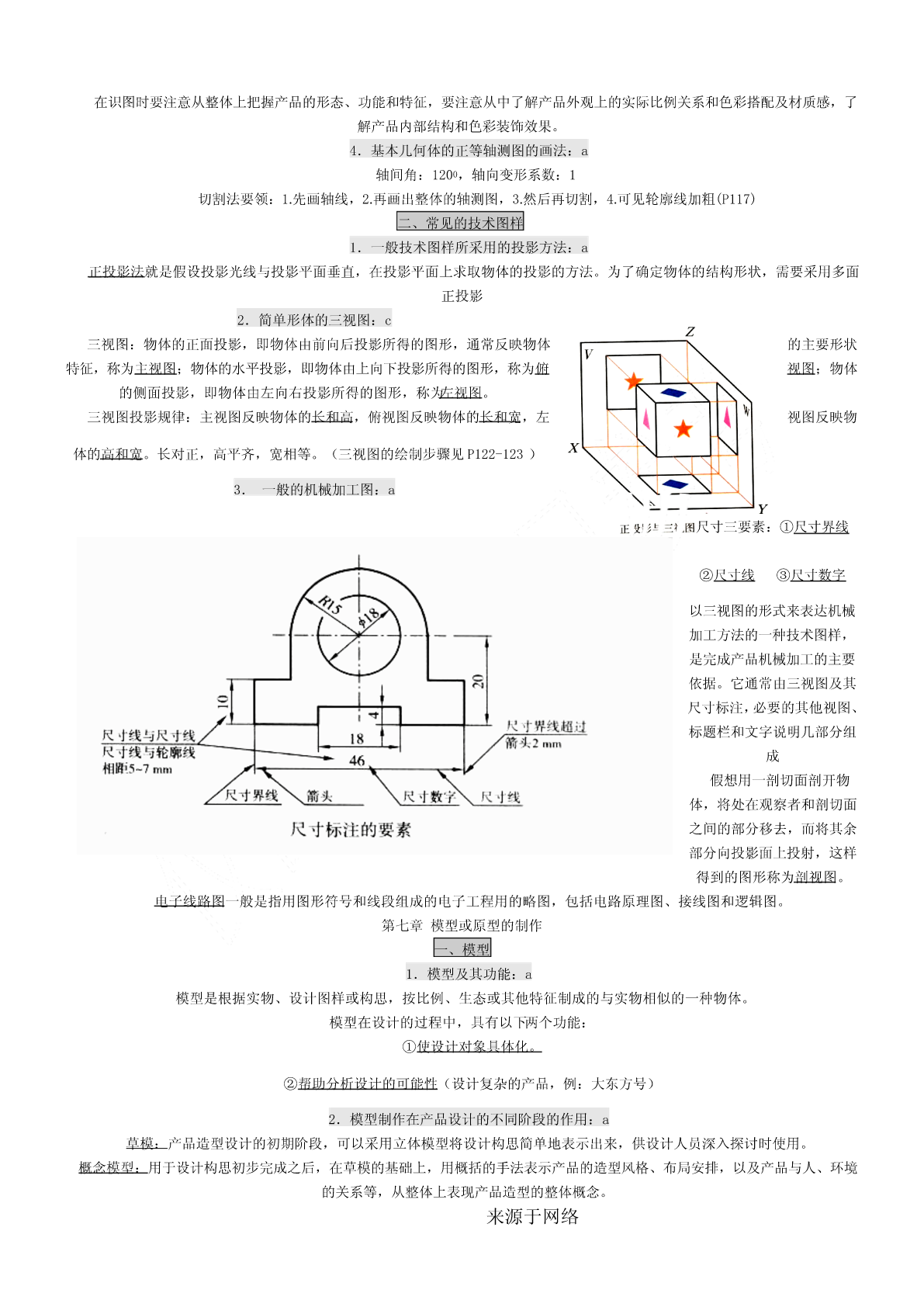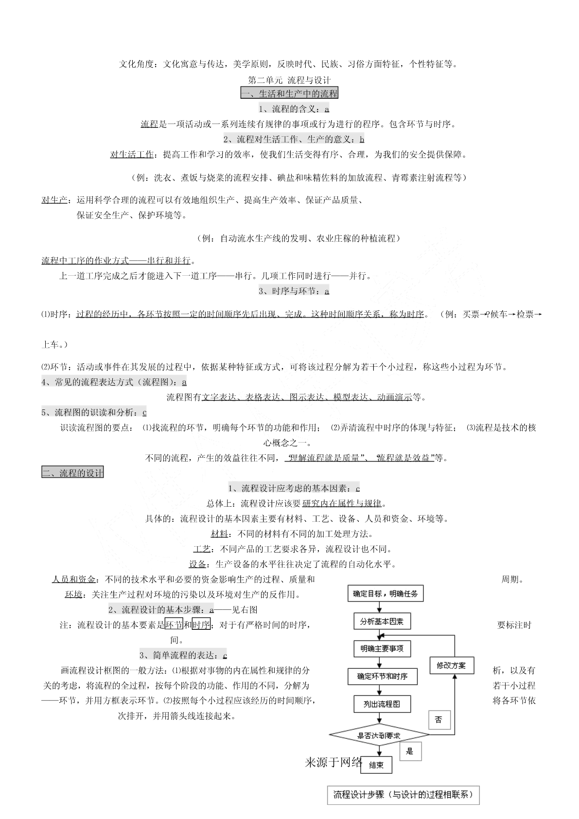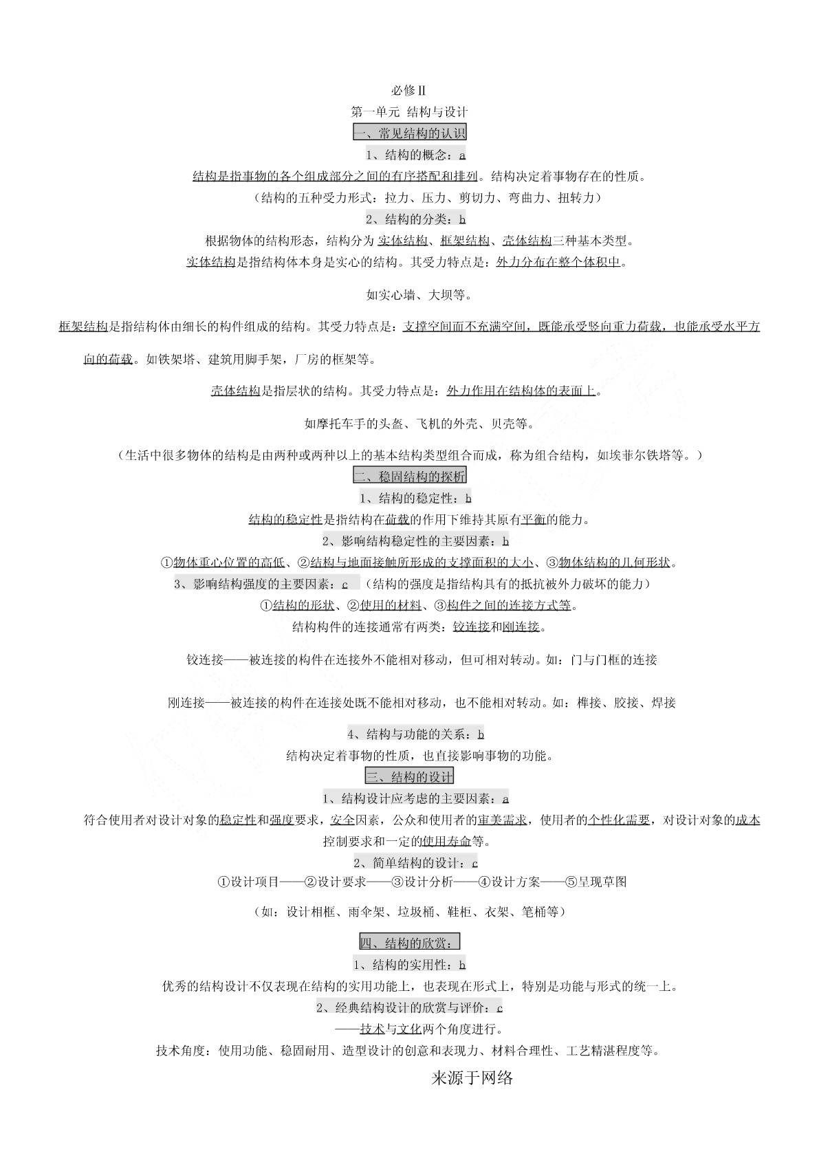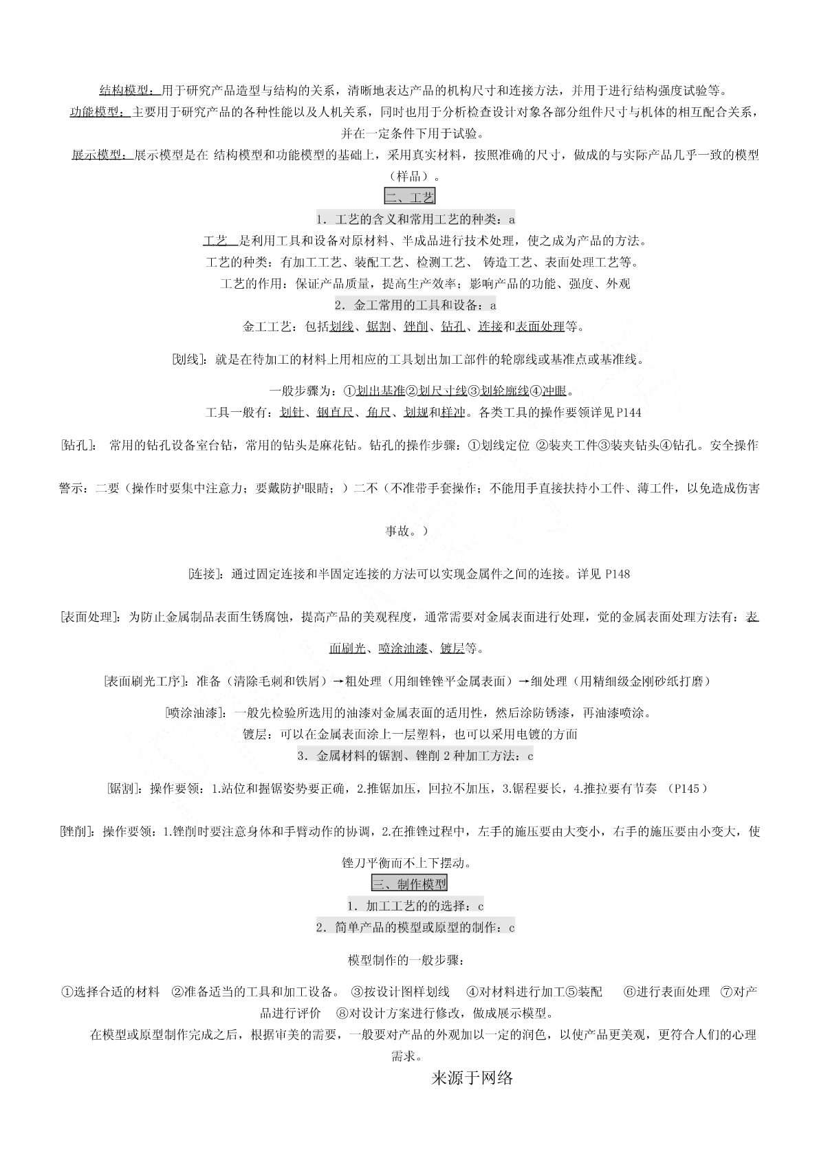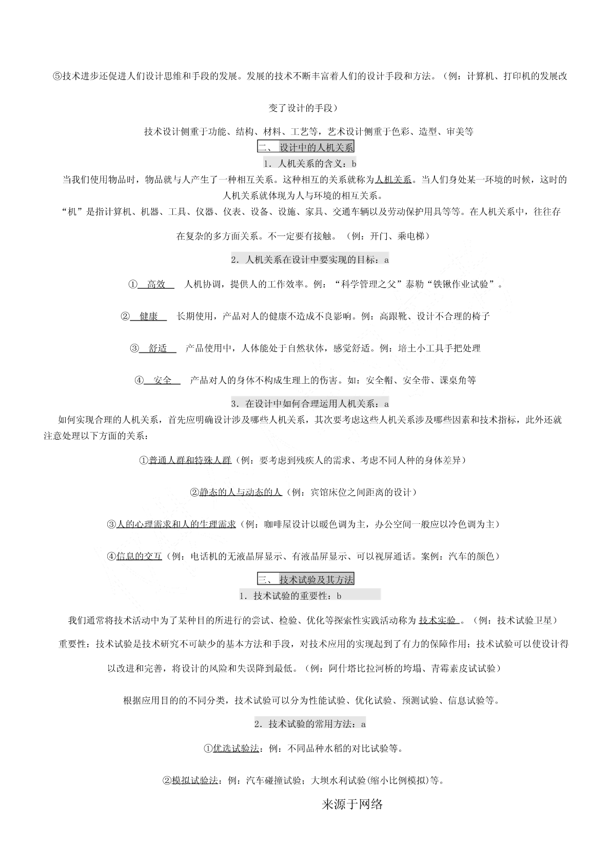 一、会考要求1.考试要求通用技术会考对考试内容掌握程度的要求,分为三个层次,从低到高依次称为:了解、理解、应用。分别以字母a、b、c来表示。其含义如下:a—了解:指再认或回忆所学的技术知识、思想方法,列举它们在日常生活和工农业生产中的应用。b—理解:指对技术的基本概念进行解释、区分,运用所学的技术知识、思想方法对技术现象进行解释。c—应用:指对技术设计的过程、方案和成果作出比较全面的评价,运用所学的技术知识、思想方法解决实际问题。二、等第标准根据课程标准的要求,通用技术学科会考将学生的学业成绩分为优秀、良好、合格、不合格四个等第,依次用A、B、C、E表示。三、会考形式3.1高中通用技术会考采用闭卷笔答形式。考试时间为90分钟。试卷满分为100分。3.2高中通用技术会考试卷结构如下:(1)考试内容分布技术与设计1:(50±5)%技术与设计2:(50±5)%(2)试题类型分布选择题:约占60%简答题:约占10%分析题:约占10%设计题:约占20%(3)试题难度分布容易题:约占70%稍难题:约占20%较难题:约占10%必修Ⅰ第一单元走进技术世界一、技术的价值1、技术对人类的价值:a技术是人类为满足自身的需求和愿望对大自然进行的改造。它具有保护人、解放人和发展人的作用[保护人](例:原始人随身拾磨制好的石器,现代人对疟疾、天花、肺结核等疾病不再恐慌)[解放人](例:体力解放:自行车、内燃动力、电力,手机——信息传递)[发展人](例:爱迪生、袁隆平)2、技术对生活、生产、文化等方面的影响:a技术促进社会的发展。技术丰富社会文化内容。技术改变社会生活方式。是推动社会发展和文明进步的主要动力之一。3、技术对自然的价值:c(1)依靠技术,人类得以利用自然和改造,并与自然保持和谐共处的友好关系。(例:都江堰、南水北调、西气东输)(2)人类利用技术开发、改造自然时,应把握合理的尺度,要注意对自然的保护,不能忽视技术或产品对环境可能造成的负面影响。(3)技术的发展给自然环境带来了问题,但也给解决这些问题提供了可能(例:物料的再循环工艺)二、技术的性质1.技术的发展与发明和革新关系:b技术的基本特性:目的性、创新性、综合性、两面性、专利性。来源于网络创新是技术发展的核心。每一项技术的问世都是创新的结果。技术的发展需要创新,技术创新表现为技术革新和技术发明。技术创新是一个艰难而曲折的历程。(例:显示器的不断发展属于技术革新,王选发明激光照排系统属于技术发明。)2.技术的两面性:a任何事物客观上都有两面性,技术也不例外。它既可以给人们带来福音,也可能给人们带来危害。(例:电池可以带来光明和动力,也可以带来严重的环境污染。网络技术方便人们交流沟通,但也有人利用网络犯罪。B超技术可以用于医疗,但也有人进行胎儿鉴别)3.技术与科学的区别与联系:b技术与科学的区别与联系科学是通过各种方法和实验,从而发现规律、理论,并技术则是人类为了满足自身的需要和愿望对大自然进行的改予以验证和公式化的知识体系。如:牛顿发现万有引力、造。如:瓦特发明蒸汽机、贝尔发明电话、恩格尔巴特发明达尔文发现进化论、居里夫人发现镭等。鼠标、爱迪生发明电灯泡等科学回答“是什么”“为什么”的问题技术则更多地回答“怎么办”的问题科学促进了技术的发展,技术推动了科学的进步。4.知识产权在技术领域的重要作用:a知识产权是人们基于自己的智力活动创造的成果和经营活动的标记、信誉而依法享有的权利。狭义的知识产权包括着作权、专利权、商标权三部分。专利在产权保护制度下对技术活动的重要性知识产权制度允许专利所有权人对专利技术具有一定的垄断性,使其专利技术和产品在一定时间内独占市场,从而得到丰厚的回报,保持发明创造的积极性,使技术创新活动趋向良性循环专利的特性:独占性、时间性、地域性?专利申请步骤:提交申请阶段→受理阶段→初审阶段→公布阶段→实审阶段→授权阶段三、技术的未来技术的发展趋势,对技术的情感和理性态度:b对“技术的未来”的追思和憧憬,既不需要技术迷惘中的旷世悲怆,也不需要技术崇拜中盲目乐观。理性地看待技术,应以负责、更有远见、更有具道德的方式使用技术。技术的未来既充满希望,也隐含威胁,理性地看待技术的未来,才不至于迷失在技术的世界里。第二单元技术世界中的设计一、技术与设计的关系1.设计的内涵:b设计是基于一定设想的、有目的的规划及创造活动。(例:书写工具的发展、电动剃须刀的发展。)2.技术与设计的关系:b①设计是技术成果转化的桥梁和纽带。(例:白色污染和可降解餐具)②设计促进技术的革新。③技术是设计的平台,没有技