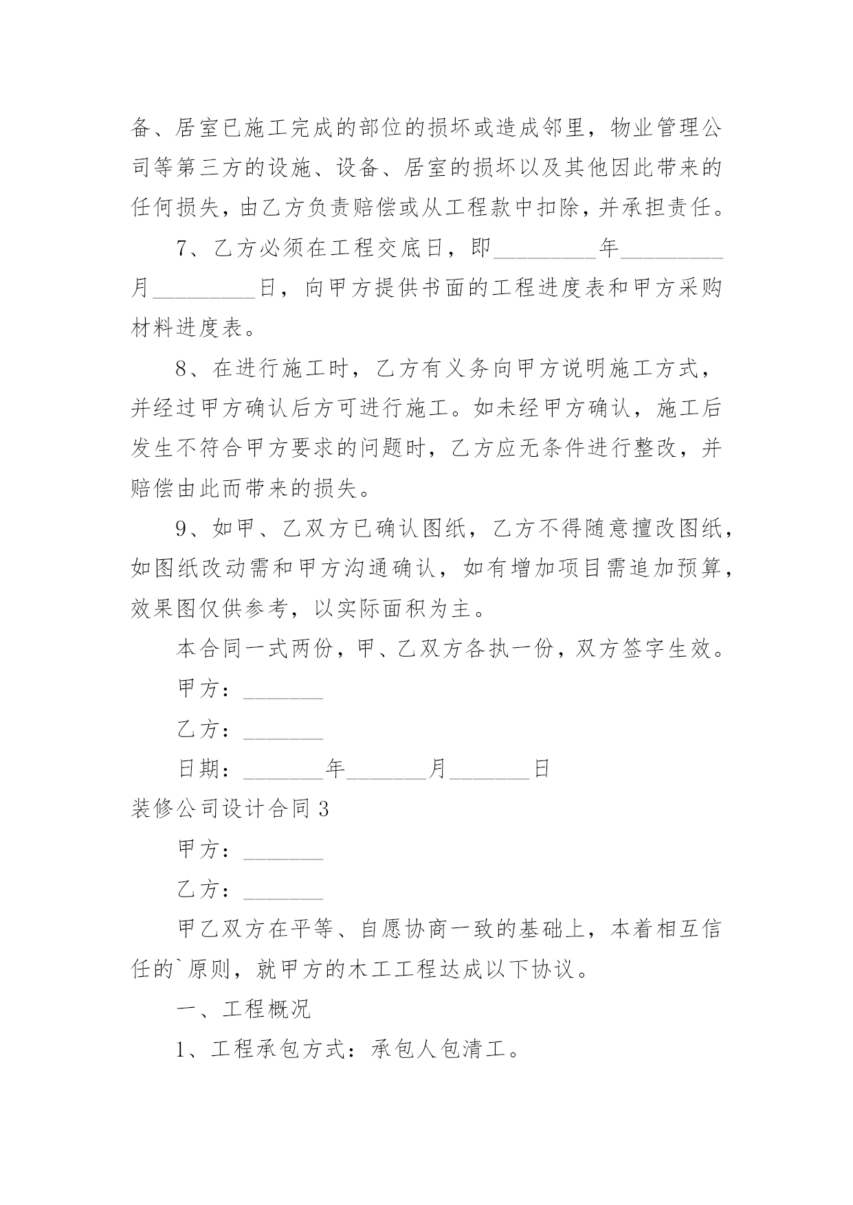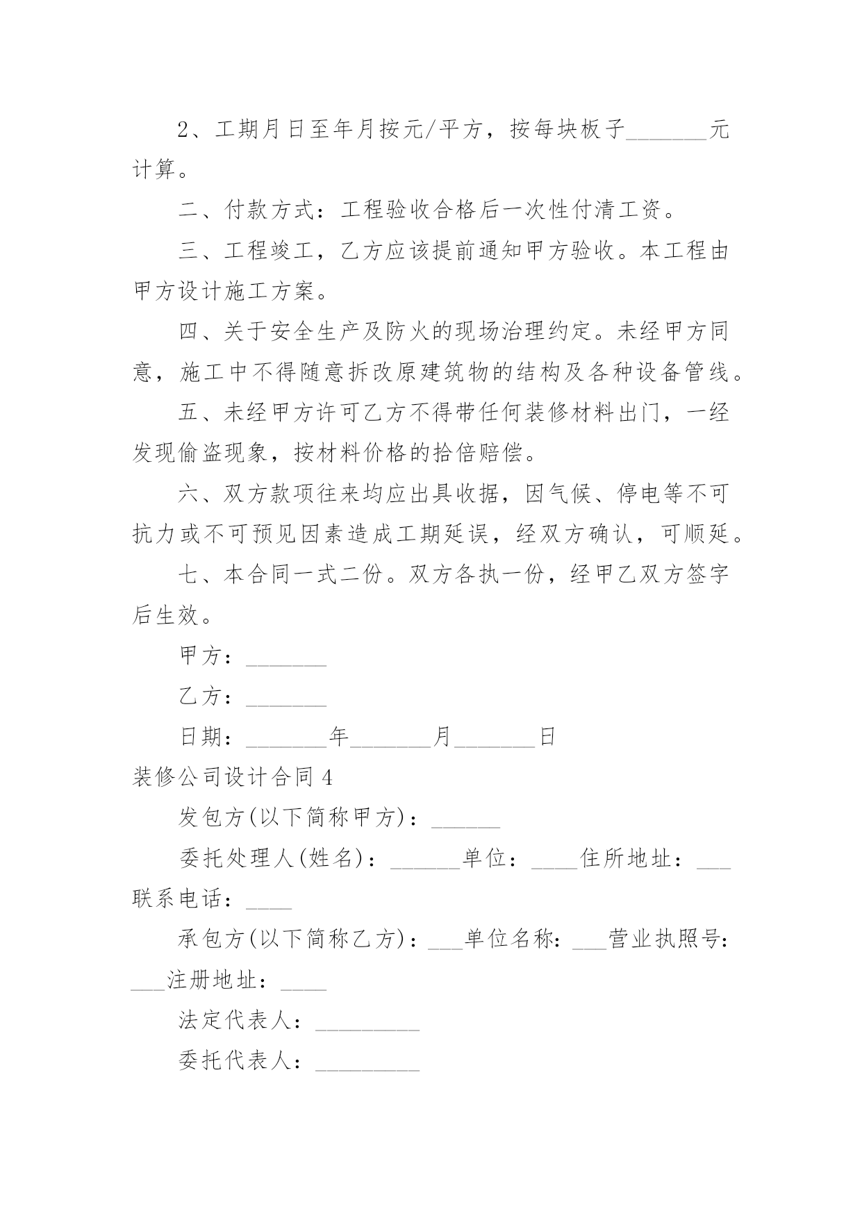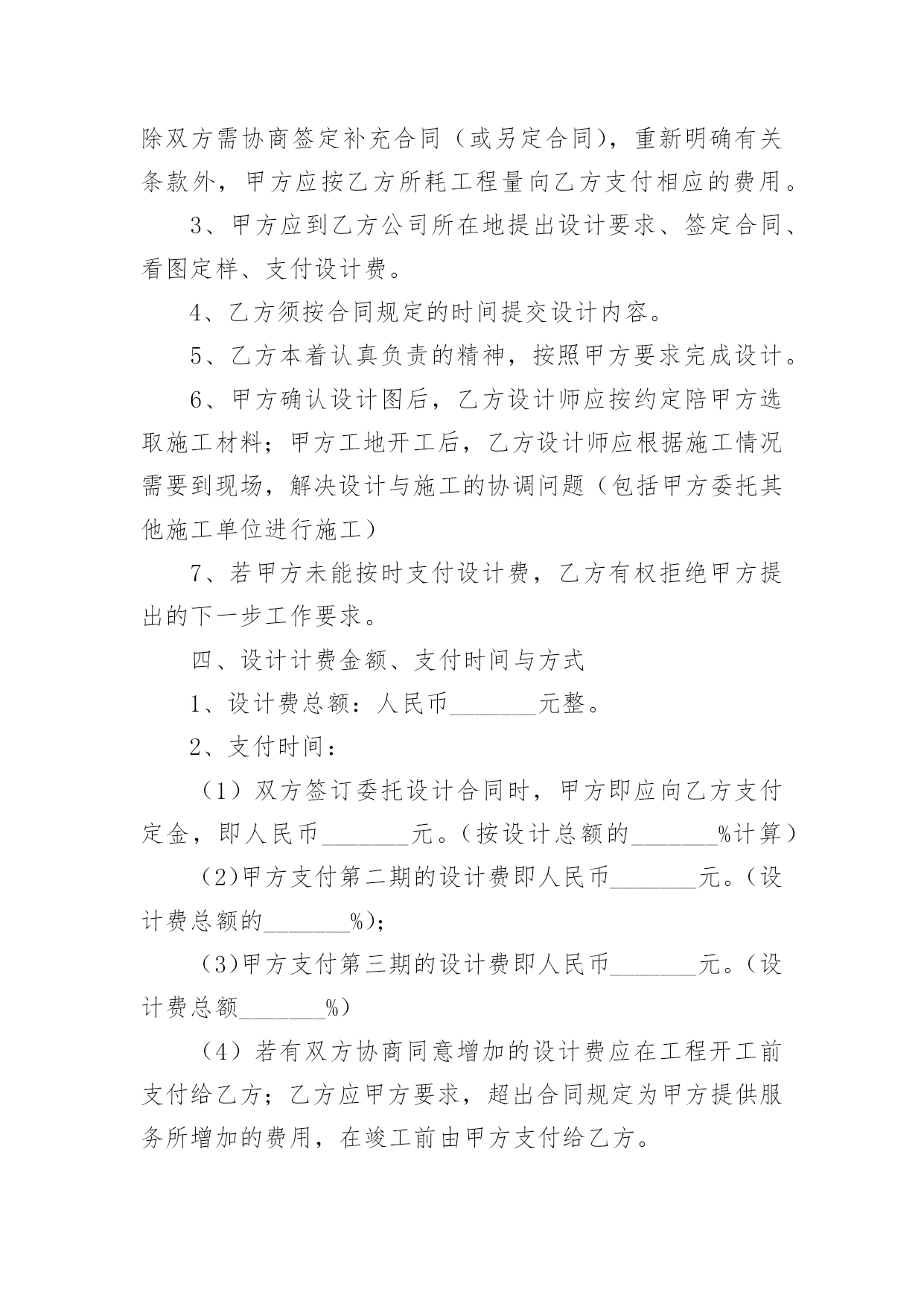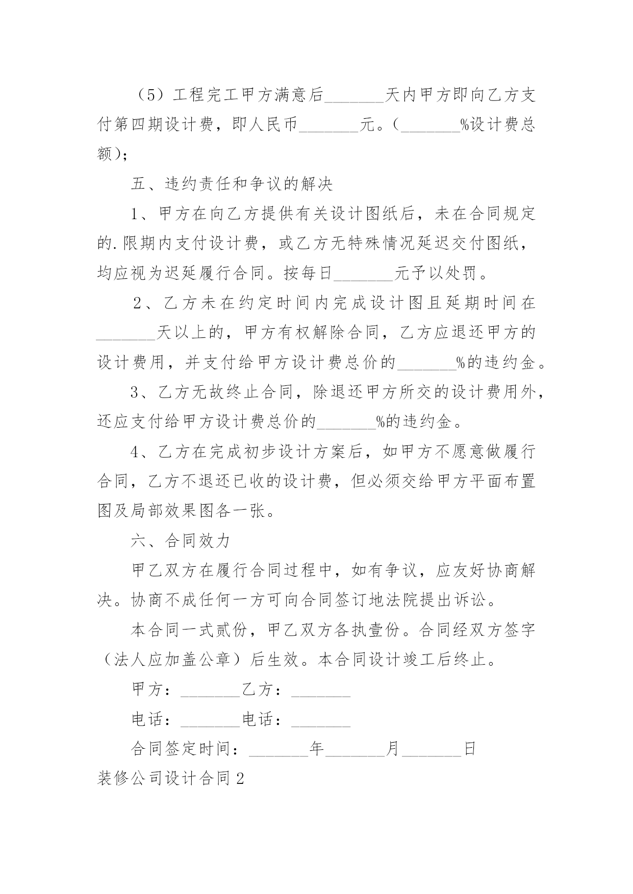 装修公司设计合同装修公司设计合同在人们越来越相信法律的社会中,关于合同的利益纠纷越来越多,签订合同能促使双方规范地承诺和履行合作。那么一份详细的合同要怎么写呢?下面是小编收集整理的装修公司设计合同,供大家参考借鉴,希望可以帮助到有需要的朋友。装修公司设计合同1委托方:_______(以下简称甲方)受托方:_______(以下简称乙方)甲方因装修工程的需要,委托乙方进行室内装修设计工作,经双方协商一致,签定本合同。一、设计工程概况1设计工程名称:_______2设计工程地点:_______3设计工程面积:_______4设计工程范围:室内装修设计(不含结构设计)。二、设计时间1设计限期:设计限期为_______天,从乙方收到甲方支付的定金后开始计算,到乙方交付全套图纸之日为止。因甲方变更设计要求或对乙方意见未及时答复,其耽误的时间应从合同约定的设计期限中相应扣除。2设计交图步骤及时间:(1)甲、乙双方当面协商满意后确定设计详细内容及金额,签定本合同,同时支付首期设计费定金,总设计费的30%。乙方收到定金后天内,向甲方提交装修设计方案图构思(包括平面功能定位图,及一些设计概念图思想)(2)甲、乙双方初步确定平面方案及初步确定设计概念后,同时支付第二期设计费用,总设计费的_______%。乙方收到设计费后_______天内,向甲方提交较详细装修设计方案:“四维空间动态浏览、体验”(详细装修设计方案是在笔记本电脑中讨论,修改确认)(3)甲方确认四维空间立体设计方案后即支付第三期设计费用,总设计费的_______%。乙方收到设计费后_______天内开始制作_______张左右效果图,一部验收设计效果MTV电影,施工用的总体设计尺寸图。(4)工地开工后设计师配合施工队现场指导并对业主提供材料造价及工程质量咨询服务,完工后甲方满意十天内支付第四期设计费,总设计费_______%的设计费。三、双方责任1、甲方应按合同规定及时支付设计费。2、甲方应将设计要求准确、简明扼要的告之乙方设计人员,并不得随意更变。甲方更变设计委托事项或提交的资料错误,或对所提供资料作较大修改,造成乙方设计返工,除双方需协商签定补充合同(或另定合同),重新明确有关条款外,甲方应按乙方所耗工程量向乙方支付相应的费用。3、甲方应到乙方公司所在地提出设计要求、签定合同、看图定样、支付设计费。4、乙方须按合同规定的时间提交设计内容。5、乙方本着认真负责的精神,按照甲方要求完成设计。6、甲方确认设计图后,乙方设计师应按约定陪甲方选取施工材料;甲方工地开工后,乙方设计师应根据施工情况需要到现场,解决设计与施工的协调问题(包括甲方委托其他施工单位进行施工)7、若甲方未能按时支付设计费,乙方有权拒绝甲方提出的下一步工作要求。四、设计计费金额、支付时间与方式1、设计费总额:人民币_______元整。2、支付时间:(1)双方签订委托设计合同时,甲方即应向乙方支付定金,即人民币_______元。(按设计总额的_______%计算)(2)甲方支付第二期的设计费即人民币_______元。(设计费总额的_______%);(3)甲方支付第三期的设计费即人民币_______元。(设计费总额_______%)(4)若有双方协商同意增加的设计费应在工程开工前支付给乙方;乙方应甲方要求,超出合同规定为甲方提供服务所增加的费用,在竣工前由甲方支付给乙方。(5)工程完工甲方满意后_______天内甲方即向乙方支付第四期设计费,即人民币_______元。(_______%设计费总额);五、违约责任和争议的解决1、甲方在向乙方提供有关设计图纸后,未在合同规定的.限期内支付设计费,或乙方无特殊情况延迟交付图纸,均应视为迟延履行合同。按每日_______元予以处罚。2、乙方未在约定时间内完成设计图且延期时间在_______天以上的,甲方有权解除合同,乙方应退还甲方的设计费用,并支付给甲方设计费总价的_______%的违约金。3、乙方无故终止合同,除退还甲方所交的设计费用外,还应支付给甲方设计费总价的_______%的违约金。4、乙方在完成初步设计方案后,如甲方不愿意做履行合同,乙方不退还已收的设计费,但必须交给甲方平面布置图及局部效果图各一张。六、合同效力甲乙双方在履行合同过程中,如有争议,应友好协商解决。协商不成任何一方可向合同签订地法院提出诉讼。本合同一式贰份,甲乙双方各执壹份。合同经双方签字(法人应加盖公章)后生效。本合同设计竣工后终止。甲方:_______乙方:_______电话:_______电话:_______合同签定时间:_______年_______月_______日装修公司设计合同2甲方:_______乙方:_______经双方友好协商,就甲乙双方针对标的居室所签定的《家庭居室装饰装修工程施工