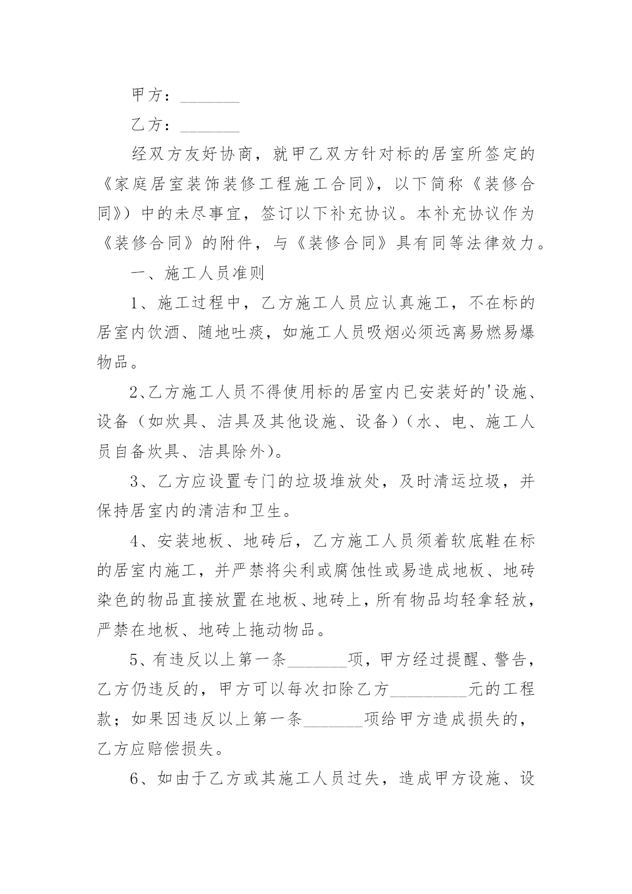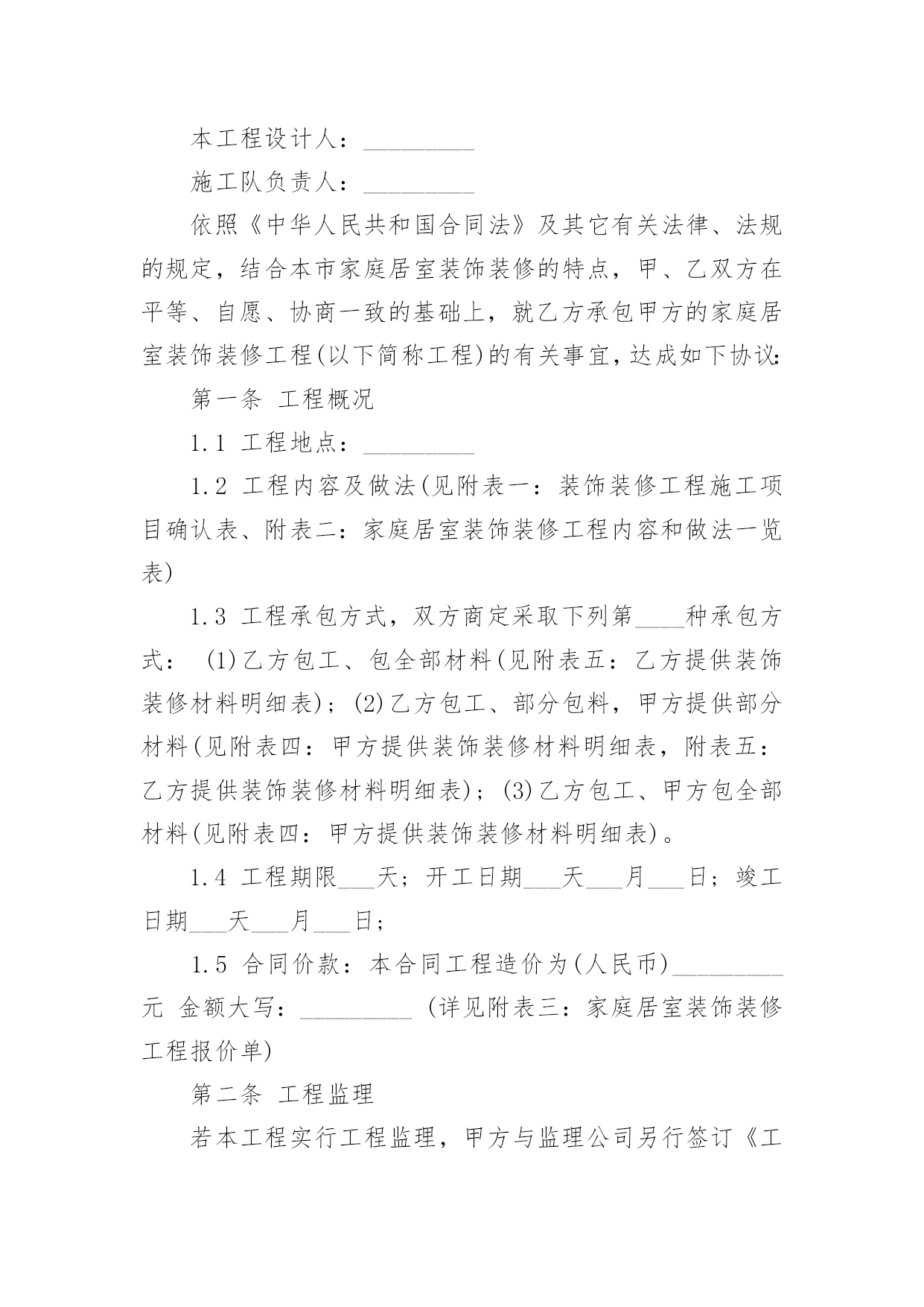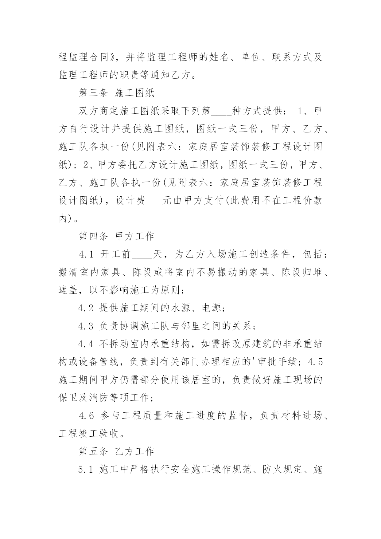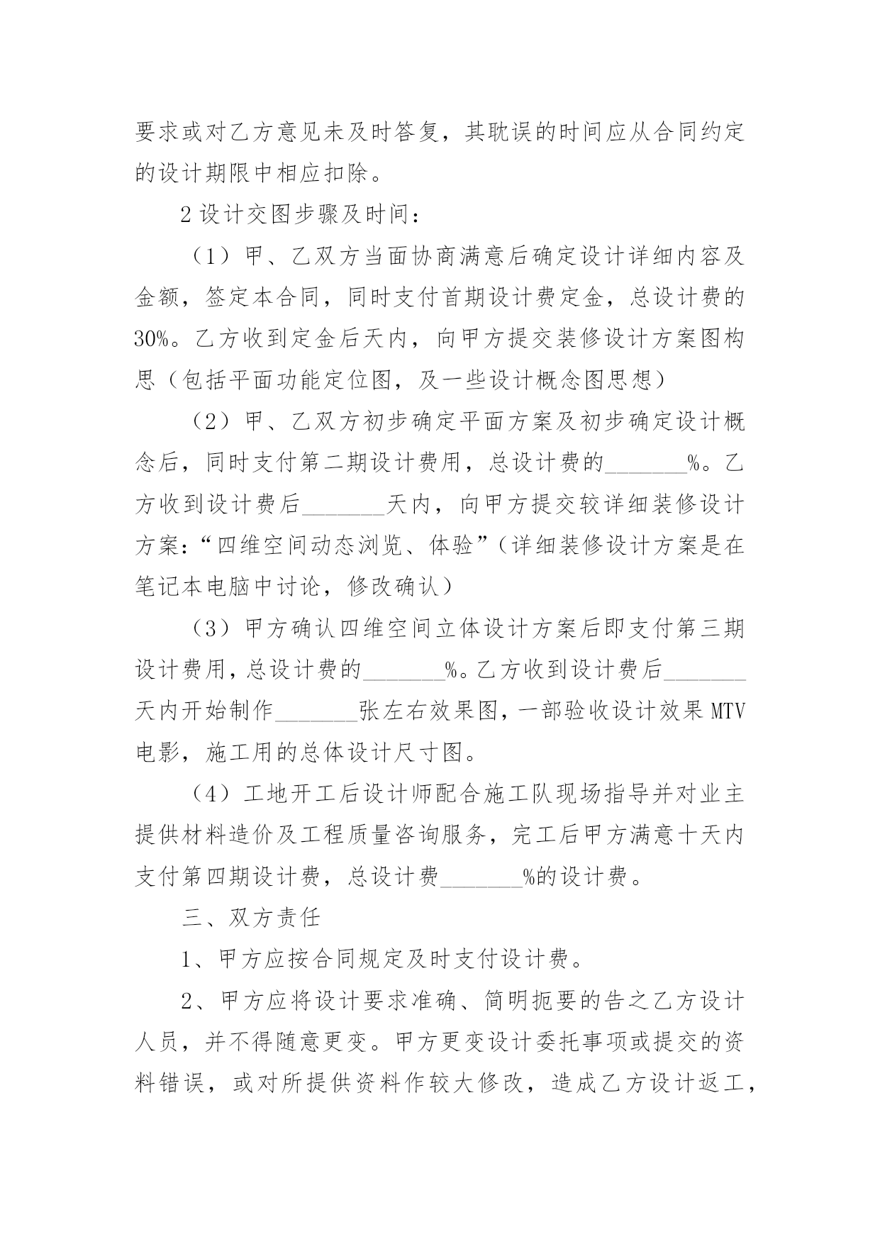 装修公司设计合同装修公司设计合同在人们越来越相信法律的社会中,关于合同的利益纠纷越来越多,签订合同能促使双方规范地承诺和履行合作。那么一份详细的合同要怎么写呢?下面是小编收集整理的装修公司设计合同,供大家参考借鉴,希望可以帮助到有需要的朋友。装修公司设计合同1委托方:_______(以下简称甲方)受托方:_______(以下简称乙方)甲方因装修工程的需要,委托乙方进行室内装修设计工作,经双方协商一致,签定本合同。一、设计工程概况1设计工程名称:_______2设计工程地点:_______3设计工程面积:_______4设计工程范围:室内装修设计(不含结构设计)。二、设计时间1设计限期:设计限期为_______天,从乙方收到甲方支付的定金后开始计算,到乙方交付全套图纸之日为止。因甲方变更设计要求或对乙方意见未及时答复,其耽误的时间应从合同约定的设计期限中相应扣除。2设计交图步骤及时间:(1)甲、乙双方当面协商满意后确定设计详细内容及金额,签定本合同,同时支付首期设计费定金,总设计费的30%。乙方收到定金后天内,向甲方提交装修设计方案图构思(包括平面功能定位图,及一些设计概念图思想)(2)甲、乙双方初步确定平面方案及初步确定设计概念后,同时支付第二期设计费用,总设计费的_______%。乙方收到设计费后_______天内,向甲方提交较详细装修设计方案:“四维空间动态浏览、体验”(详细装修设计方案是在笔记本电脑中讨论,修改确认)(3)甲方确认四维空间立体设计方案后即支付第三期设计费用,总设计费的_______%。乙方收到设计费后_______天内开始制作_______张左右效果图,一部验收设计效果MTV电影,施工用的总体设计尺寸图。(4)工地开工后设计师配合施工队现场指导并对业主提供材料造价及工程质量咨询服务,完工后甲方满意十天内支付第四期设计费,总设计费_______%的设计费。三、双方责任1、甲方应按合同规定及时支付设计费。2、甲方应将设计要求准确、简明扼要的告之乙方设计人员,并不得随意更变。甲方更变设计委托事项或提交的资料错误,或对所提供资料作较大修改,造成乙方设计返工,除双方需协商签定补充合同(或另定合同),重新明确有关条款外,甲方应按乙方所耗工程量向乙方支付相应的费用。3、甲方应到乙方公司所在地提出设计要求、签定合同、看图定样、支付设计费。4、乙方须按合同规定的时间提交设计内容。5、乙方本着认真负责的精神,按照甲方要求完成设计。6、甲方确认设计图后,乙方设计师应按约定陪甲方选取施工材料;甲方工地开工后,乙方设计师应根据施工情况需要到现场,解决设计与施工的协调问题(包括甲方委托其他施工单位进行施工)7、若甲方未能按时支付设计费,乙方有权拒绝甲方提出的下一步工作要求。四、设计计费金额、支付时间与方式1、设计费总额:人民币_______元整。2、支付时间:(1)双方签订委托设计合同时,甲方即应向乙方支付定金,即人民币_______元。(按设计总额的_______%计算)(2)甲方支付第二期的设计费即人民币_______元。(设计费总额的_______%);(3)甲方支付第三期的设计费即人民币_______元。(设计费总额_______%)(4)若有双方协商同意增加的设计费应在工程开工前支付给乙方;乙方应甲方要求,超出合同规定为甲方提供服务所增加的费用,在竣工前由甲方支付给乙方。(5)工程完工甲方满意后_______天内甲方即向乙方支付第四期设计费,即人民币_______元。(_______%设计费总额);五、违约责任和争议的解决1、甲方在向乙方提供有关设计图纸后,未在合同规定的.限期内支付设计费,或乙方无特殊情况延迟交付图纸,均应视为迟延履行合同。按每日_______元予以处罚。2、乙方未在约定时间内完成设计图且延期时间在_______天以上的,甲方有权解除合同,乙方应退还甲方的设计费用,并支付给甲方设计费总价的_______%的违约金。3、乙方无故终止合同,除退还甲方所交的设计费用外,还应支付给甲方设计费总价的_______%的违约金。4、乙方在完成初步设计方案后,如甲方不愿意做履行合同,乙方不退还已收的设计费,但必须交给甲方平面布置图及局部效果图各一张。六、合同效力甲乙双方在履行合同过程中,如有争议,应友好协商解决。协商不成任何一方可向合同签订地法院提出诉讼。本合同一式贰份,甲乙双方各执壹份。合同经双方签字(法人应加盖公章)后生效。本合同设计竣工后终止。甲方:_______乙方:_______电话:_______电话:_______合同签定时间:_______年_______月_______日装修公司设计合同2甲方:_______乙方:_______经双方友好协商,就甲乙双方针对标的居室所签定的《家庭居室装饰装修工程施工